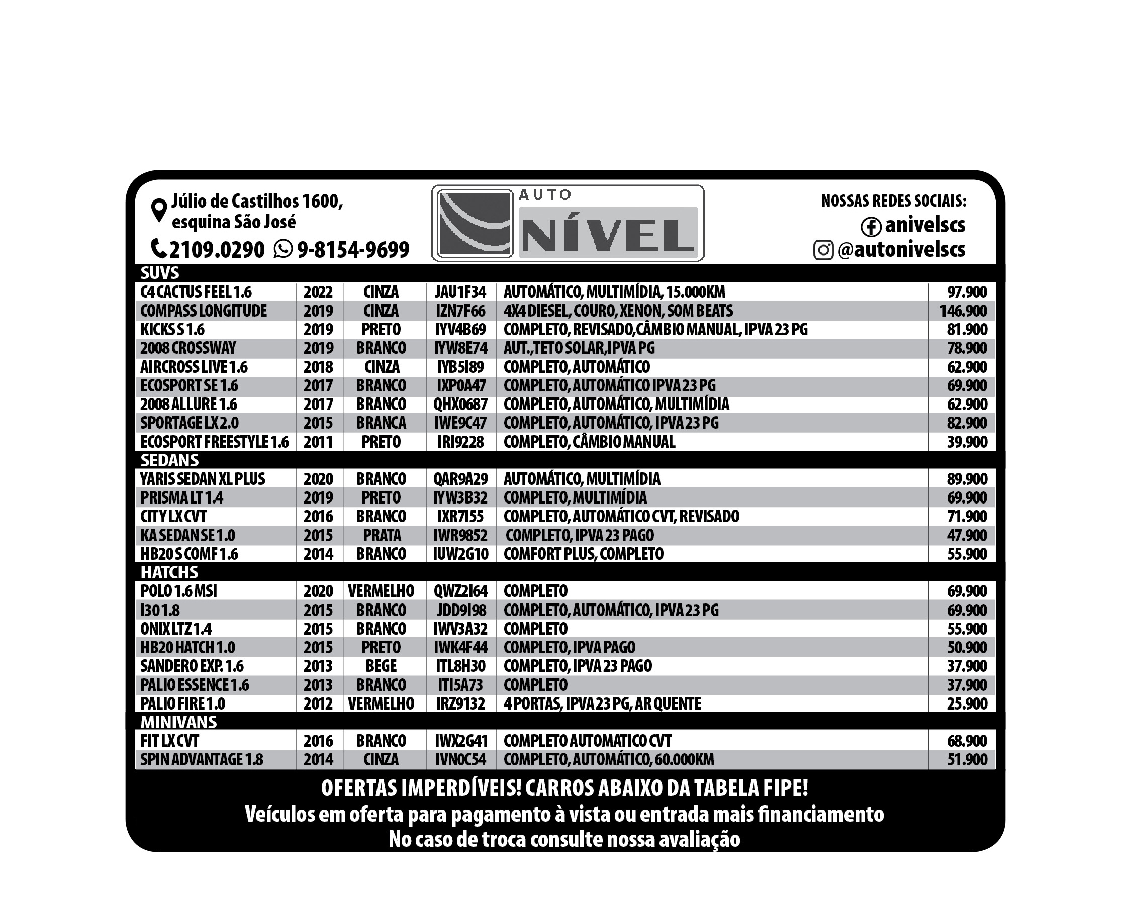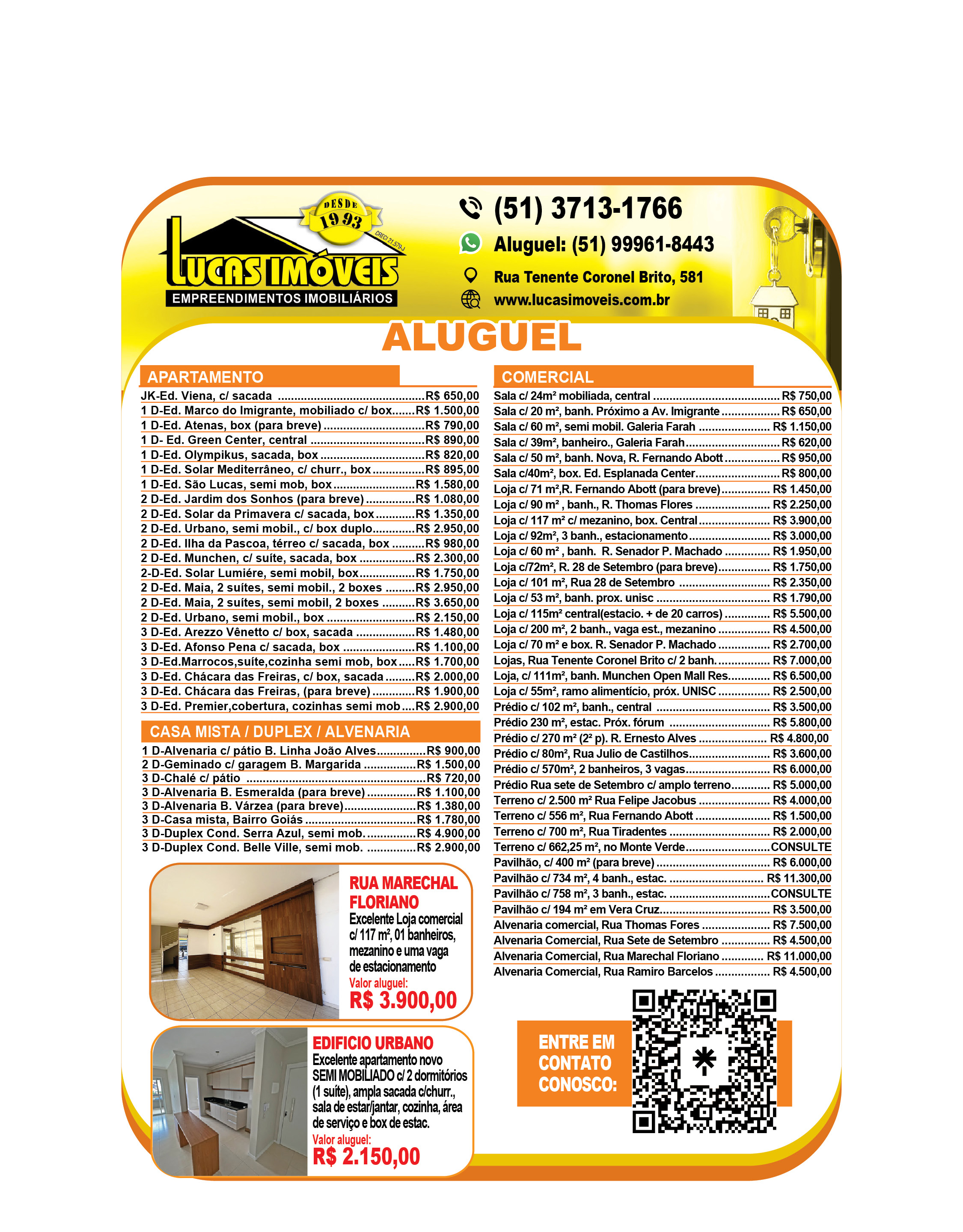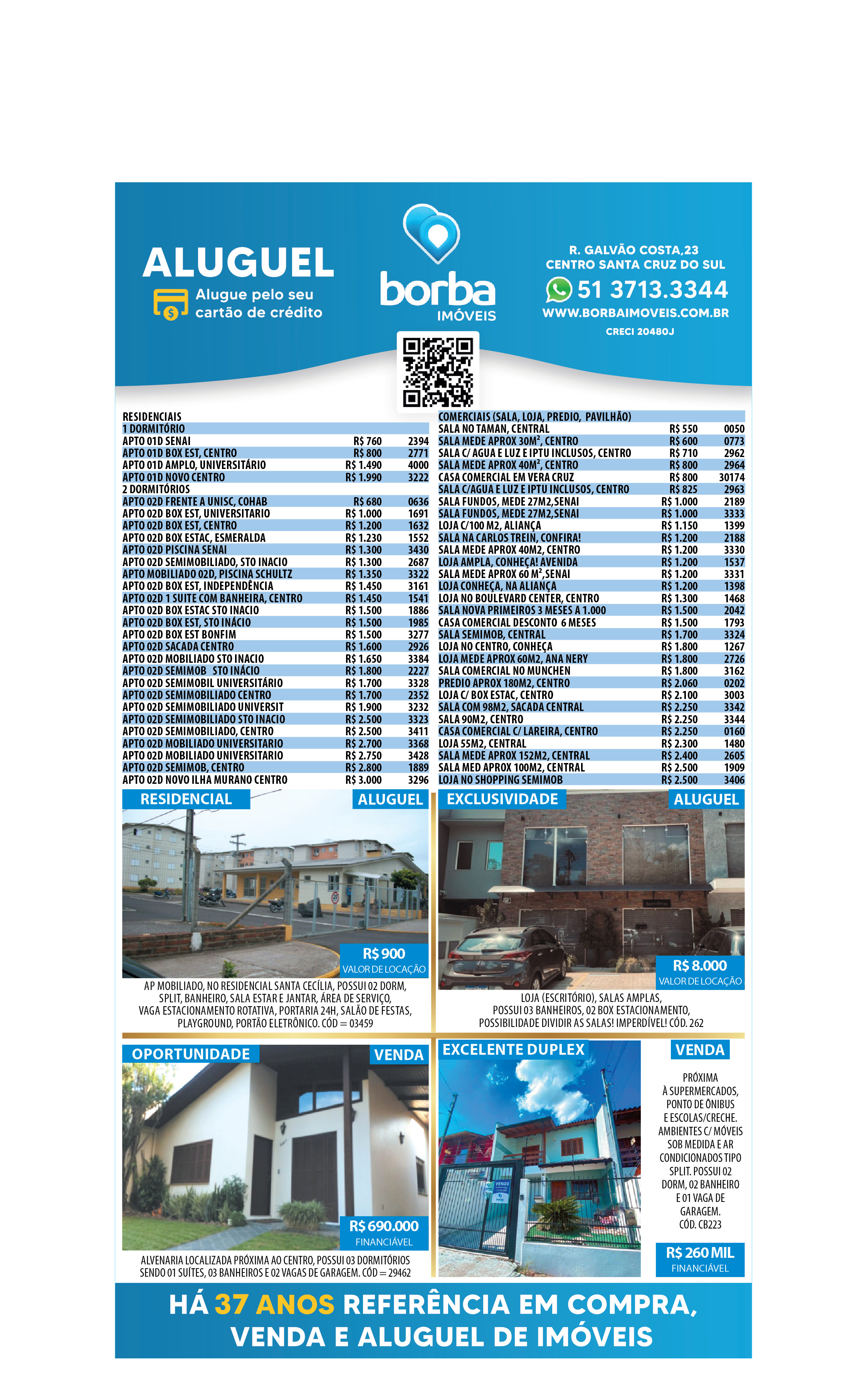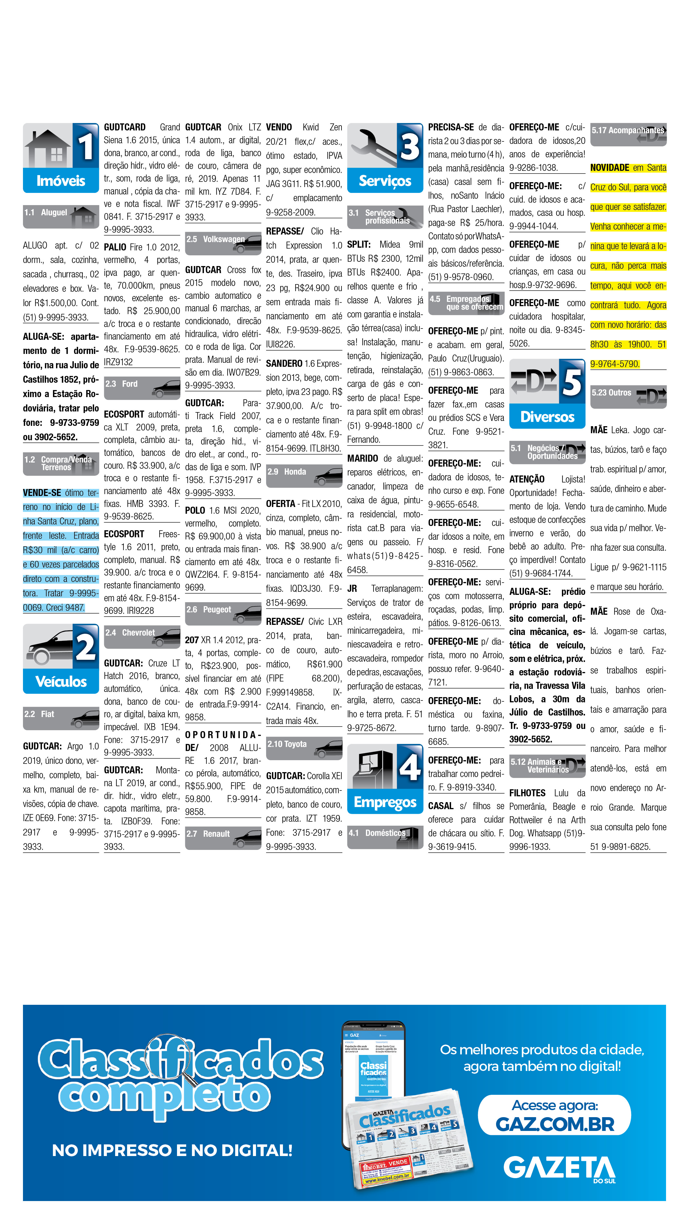 O suplemento de Classificados, que circula nas edições de terças, quintas e sábados, é um dos mais tradicionais da Gazeta do Sul, como vitrine e canal de negócios, de oferta, compra e venda em toda a região central do Rio Grande do Sul. E, para enriquecer pesquisas de produtos e serviços e possibilitar resultado ainda melhor a usuários e parceiros, nos anúncios de clientes cadastrados, o leitor tem acesso direto com link ao site do anunciante, onde poderá verificar mais detalhes sobre os itens. Confira as ofertas: