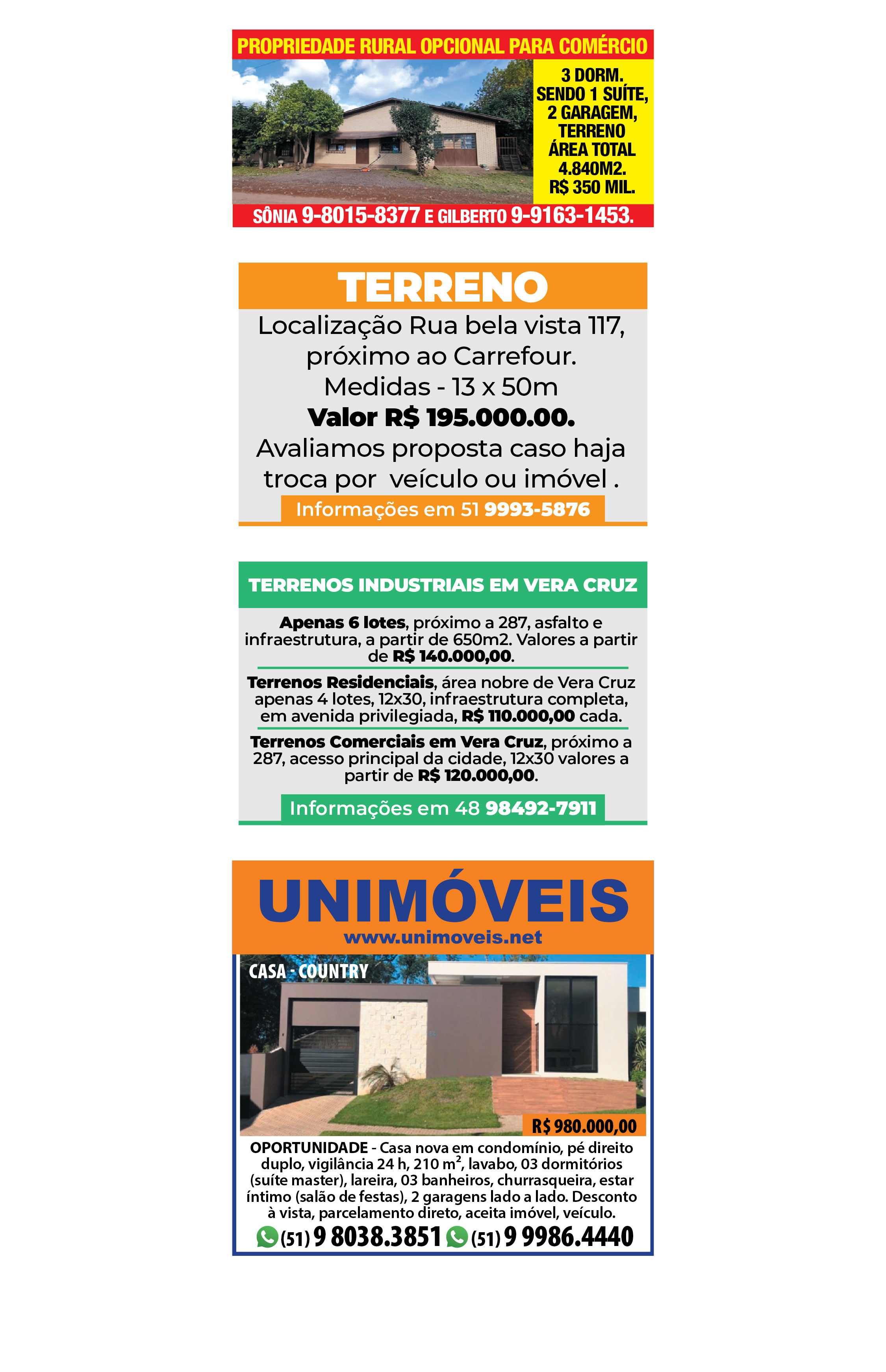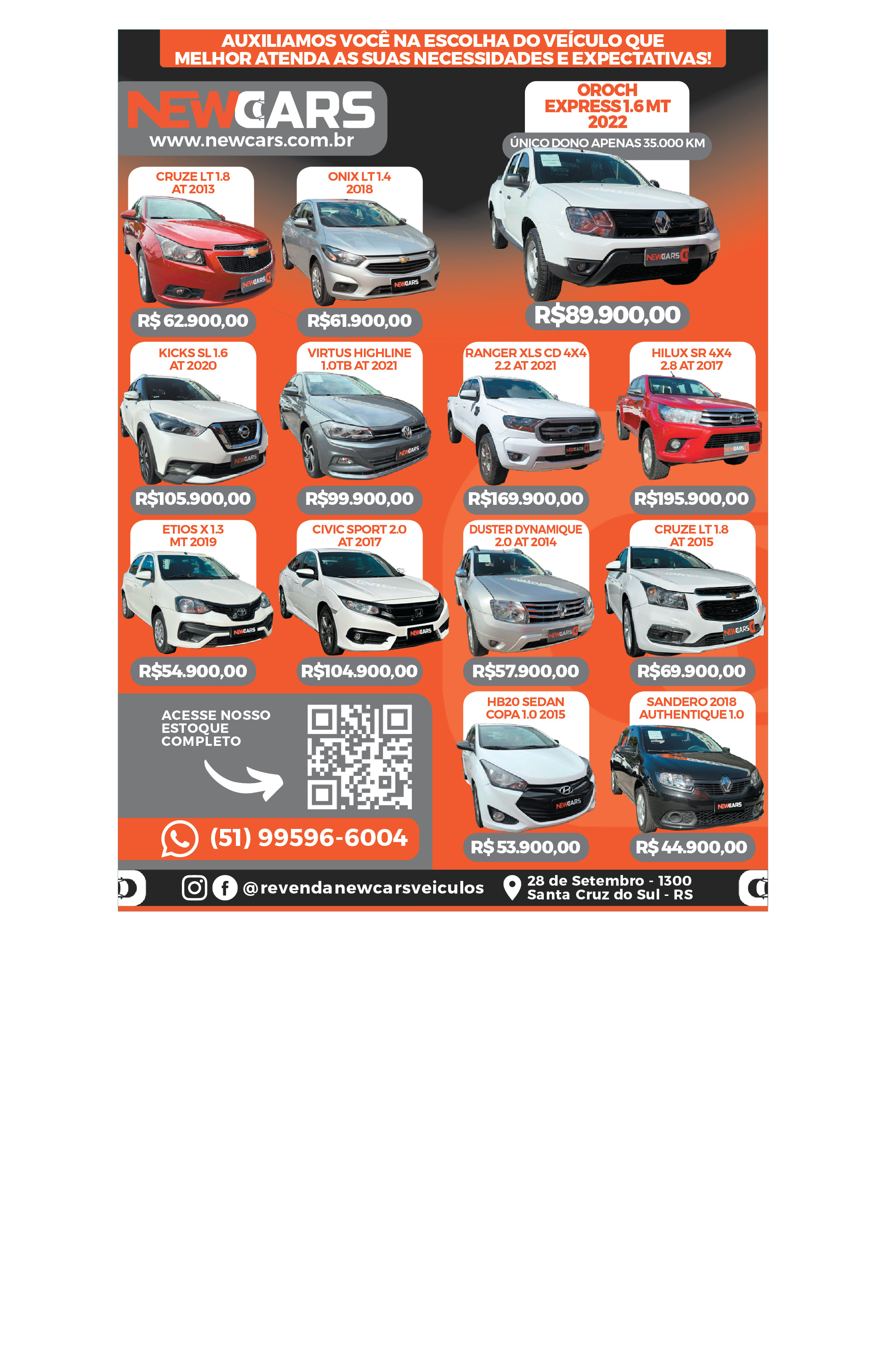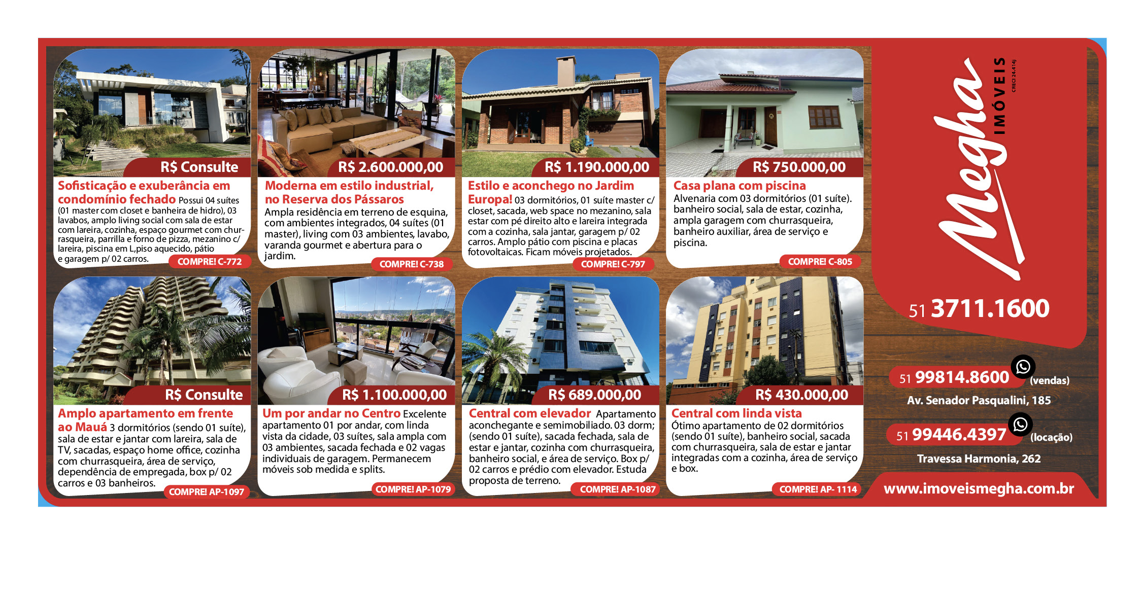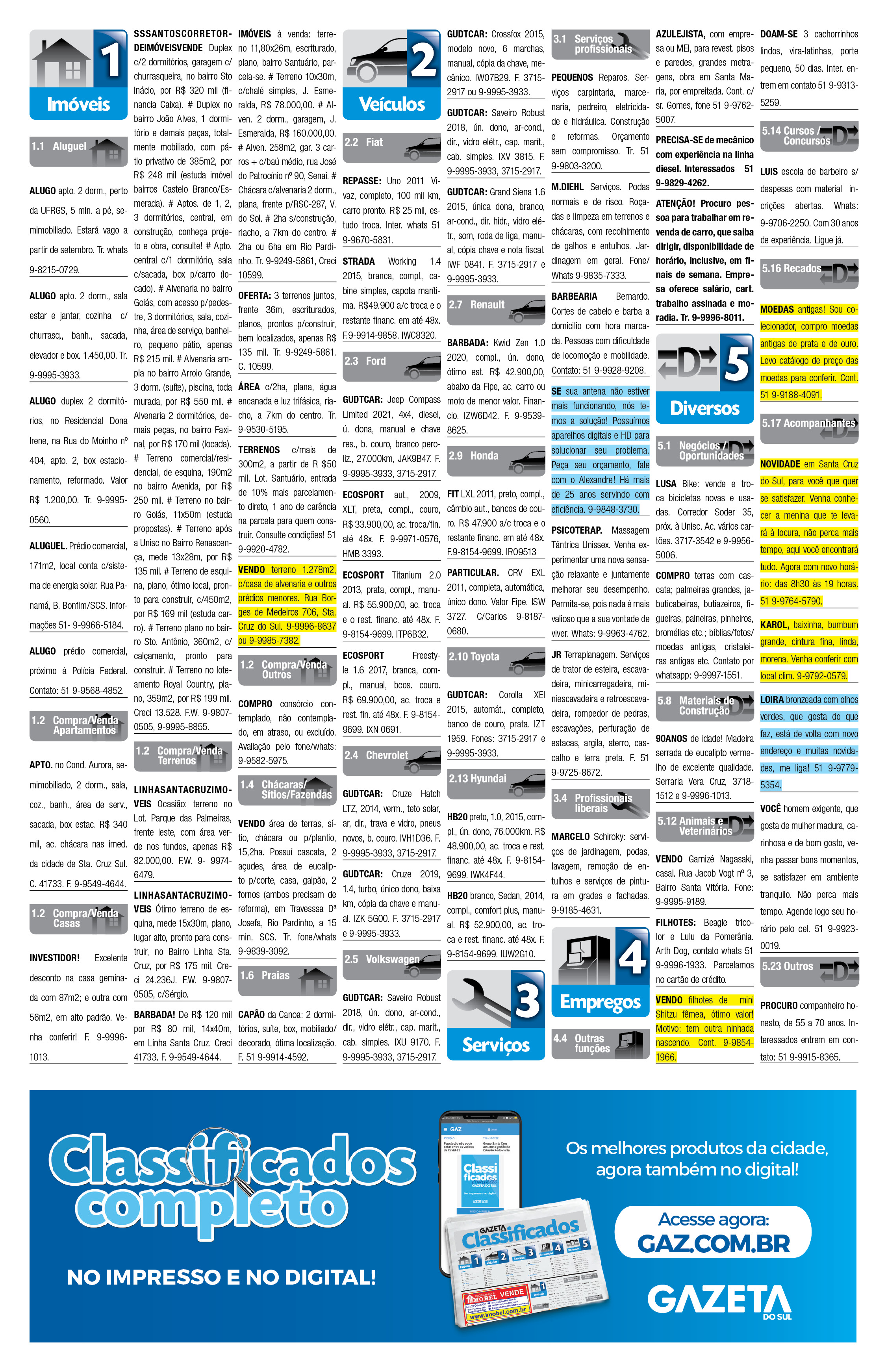 O suplemento de Classificados, que circula nas edições de terças, quintas e sábados, é um dos mais tradicionais da Gazeta do Sul, como vitrine e canal de negócios, de oferta, compra e venda em toda a região central do Rio Grande do Sul. E, para enriquecer pesquisas de produtos e serviços e possibilitar resultado ainda melhor a usuários e parceiros, nos anúncios de clientes cadastrados, o leitor tem acesso direto com link ao site do anunciante, onde poderá verificar mais detalhes sobre os itens. Confira as ofertas: