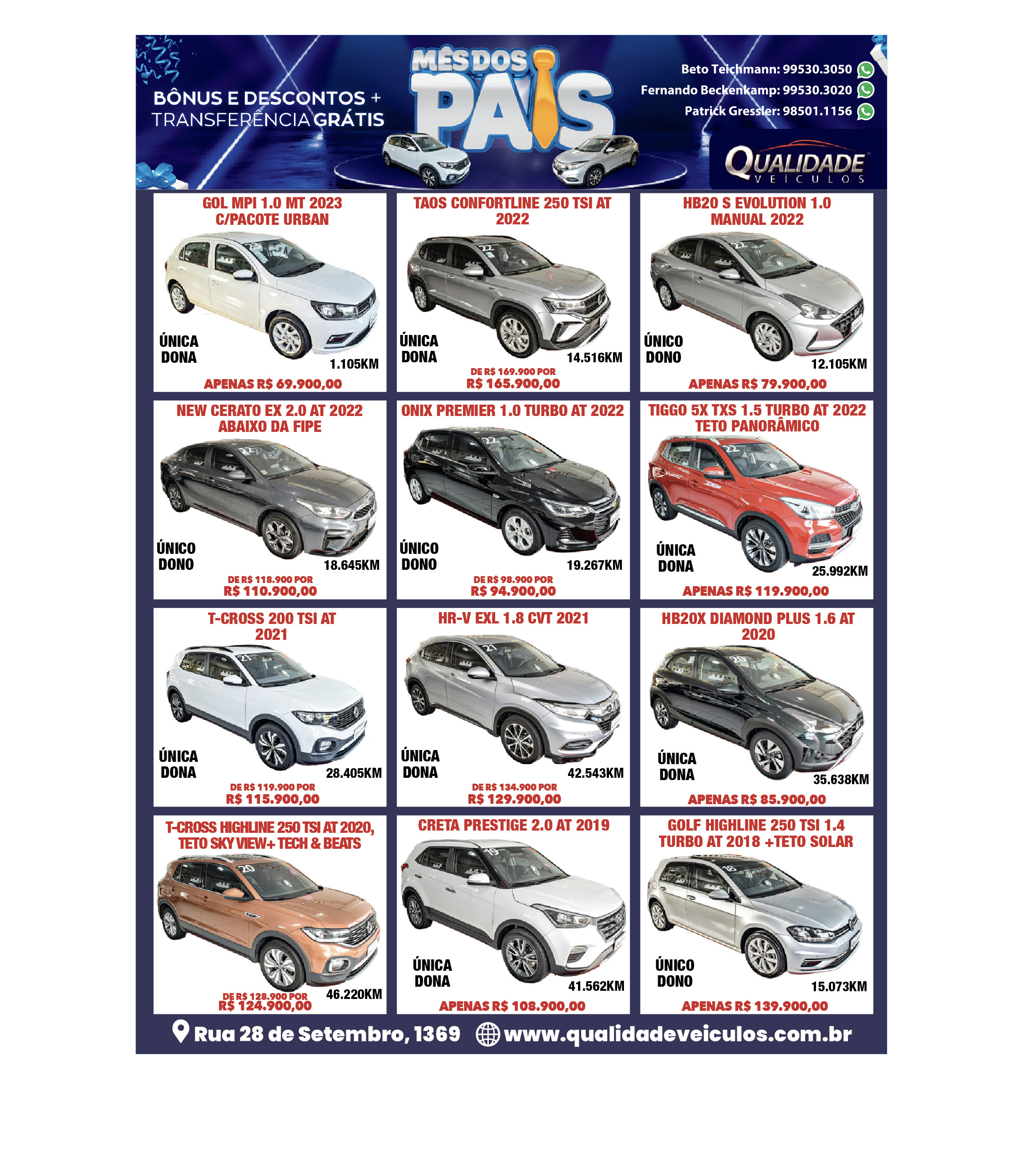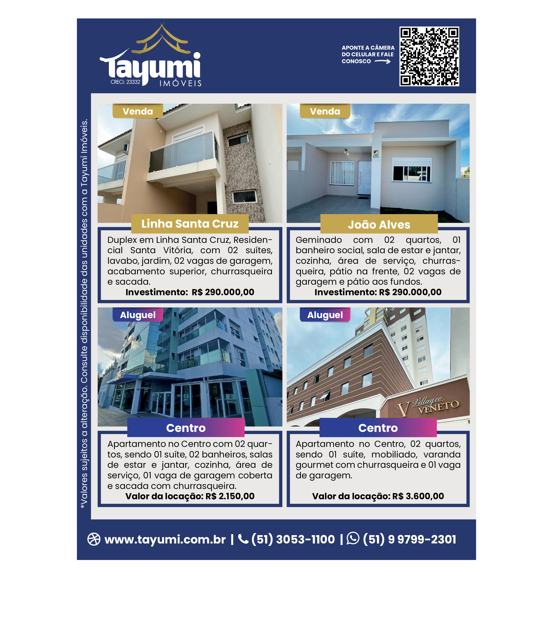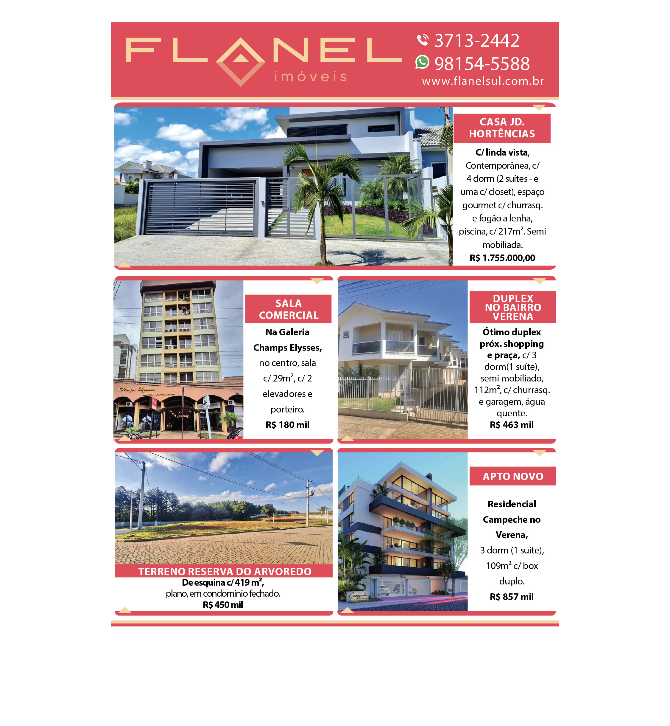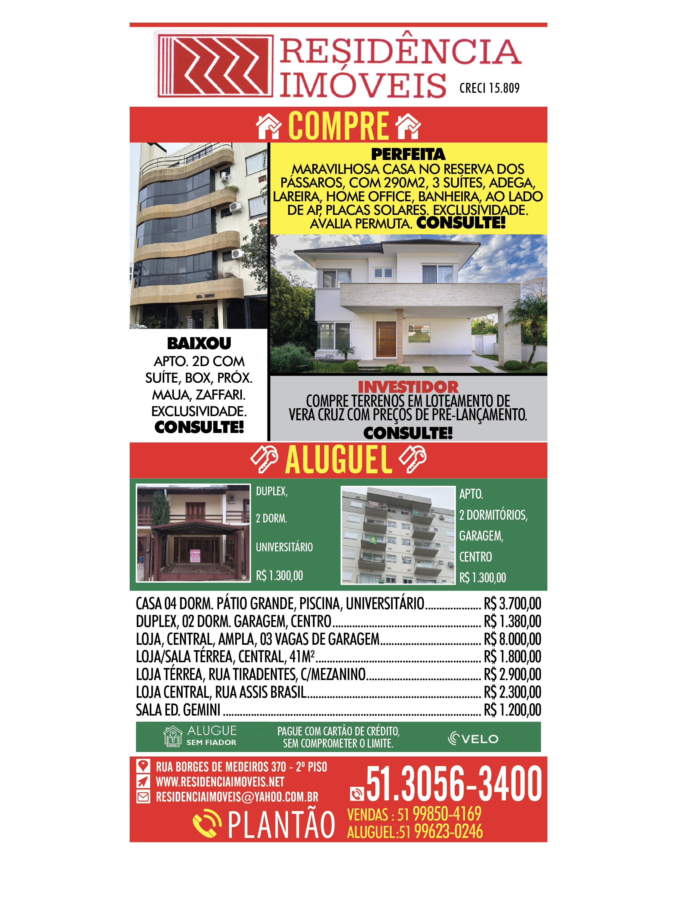 O suplemento de Classificados, que circula nas edições de terças, quintas e sábados, é um dos mais tradicionais da Gazeta do Sul, como vitrine e canal de negócios, de oferta, compra e venda em toda a região central do Rio Grande do Sul. E, para enriquecer pesquisas de produtos e serviços e possibilitar resultado ainda melhor a usuários e parceiros, nos anúncios de clientes cadastrados, o leitor tem acesso direto com link ao site do anunciante, onde poderá verificar mais detalhes sobre os itens. Confira as ofertas: