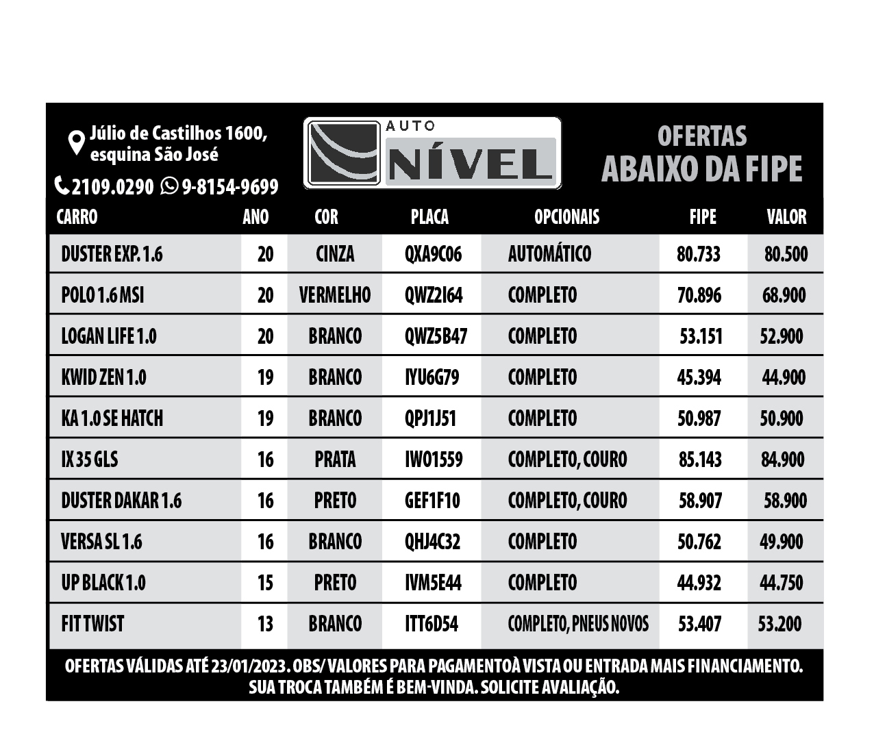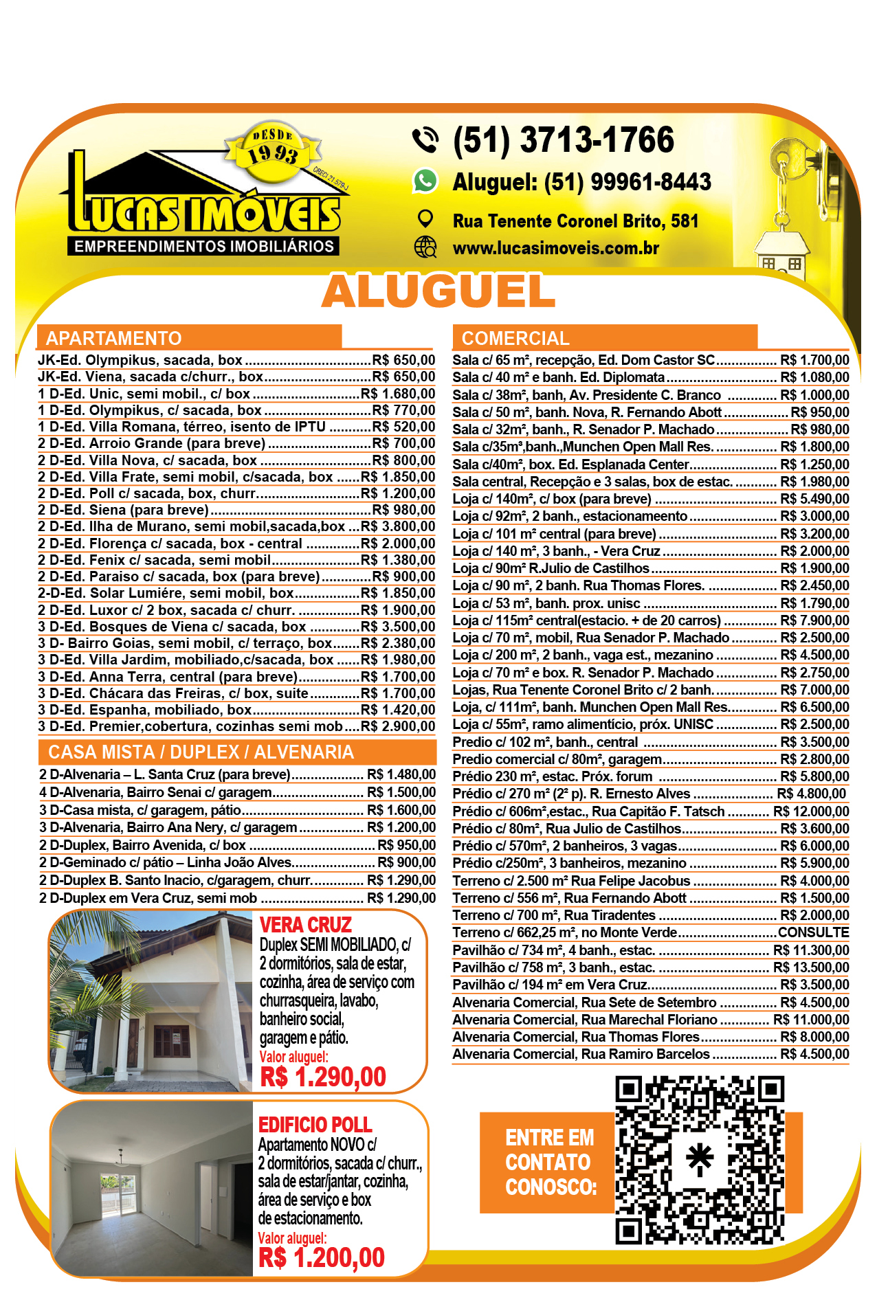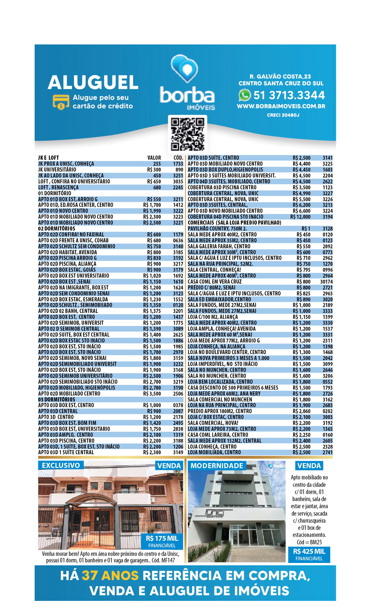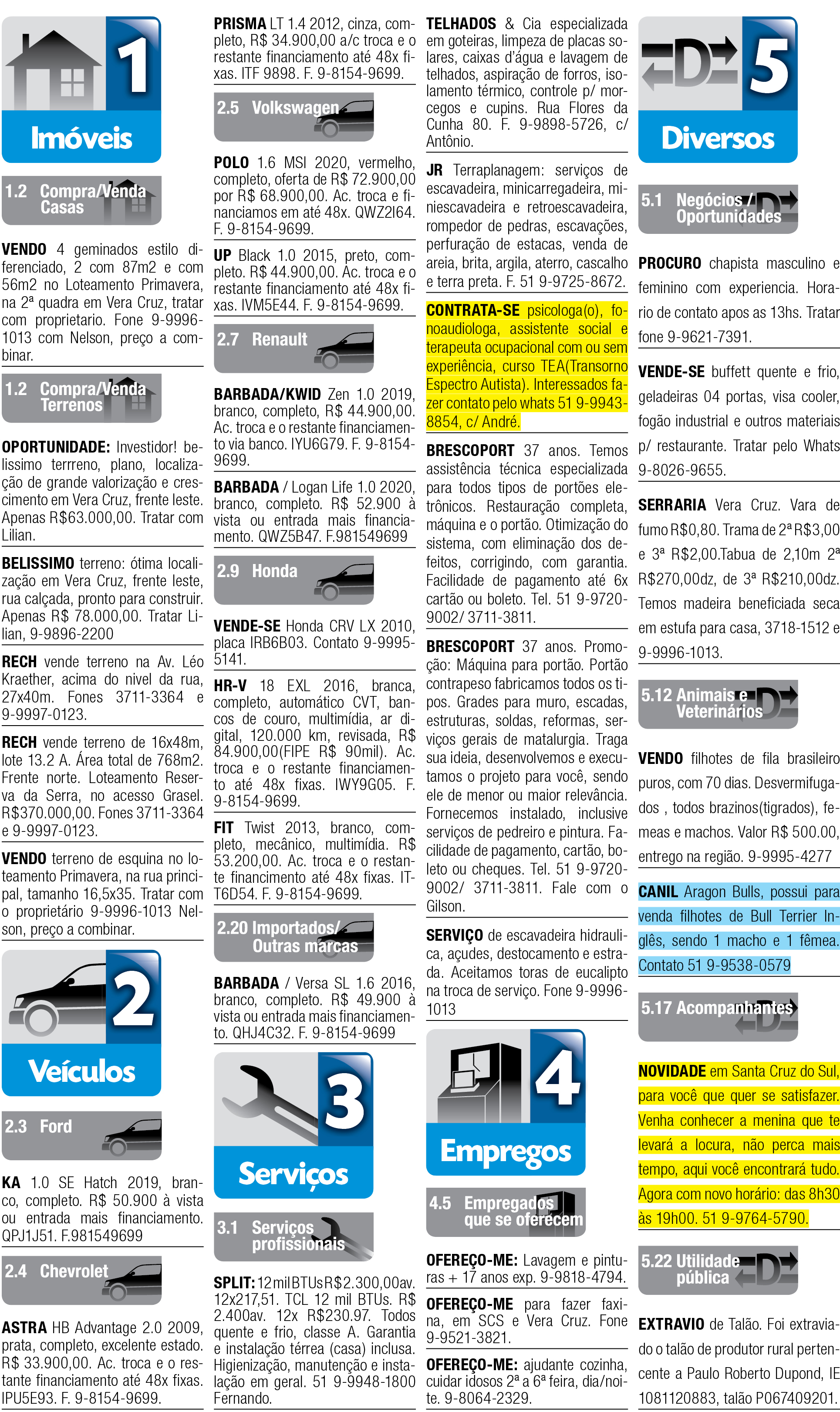 O suplemento de Classificados, que circula nas edições de terças, quintas e sábados, é um dos mais tradicionais da Gazeta do Sul, como vitrine e canal de negócios, de oferta, compra e venda em toda a região central do Rio Grande do Sul. E, para enriquecer pesquisas de produtos e serviços e possibilitar resultado ainda melhor a usuários e parceiros, nos anúncios de clientes cadastrados, o leitor tem acesso direto com link ao site do anunciante, onde poderá verificar mais detalhes sobre os itens. Confira as ofertas: