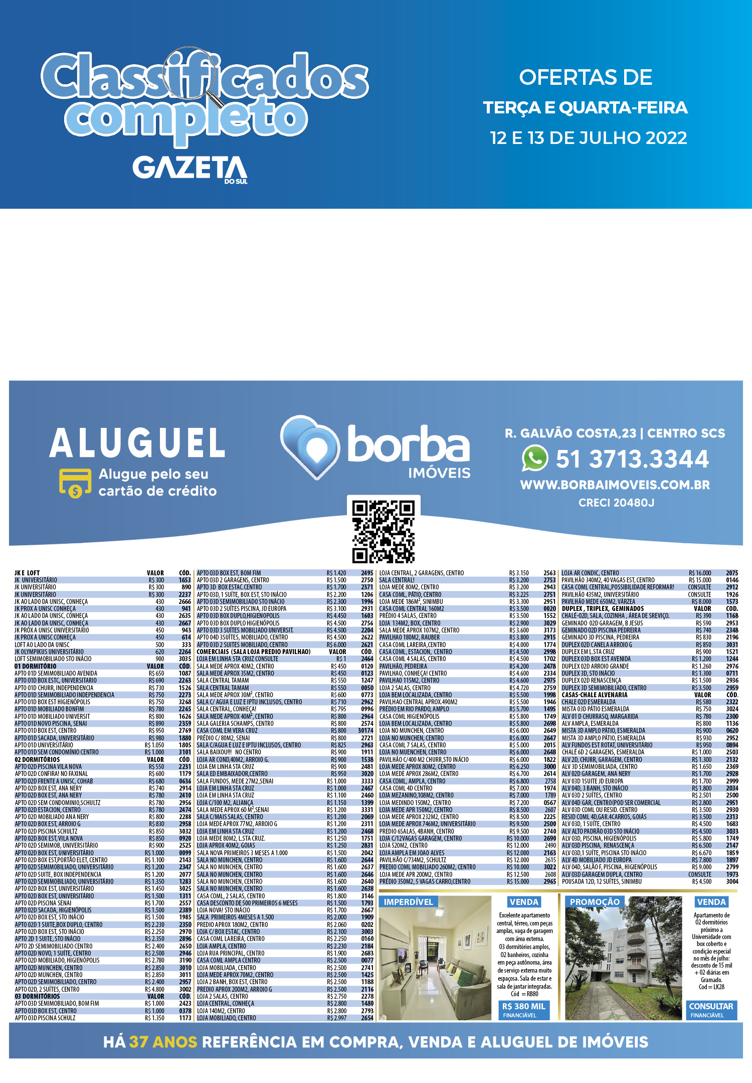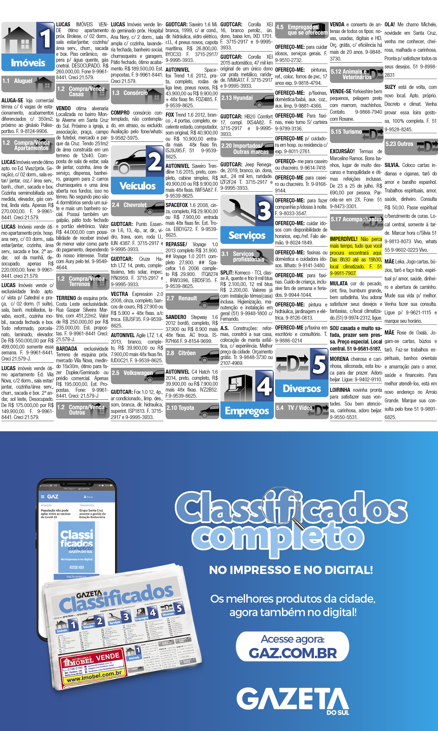 O suplemento de Classificados, que circula nas edições de terças, quintas e sábados, é um dos mais tradicionais da Gazeta do Sul, como vitrine e canal de negócios, de oferta, compra e venda em toda a região central do Rio Grande do Sul. E, para enriquecer pesquisas de produtos e serviços e possibilitar resultado ainda melhor a usuários e parceiros, nos anúncios de clientes cadastrados, o leitor tem acesso direto com link ao site do anunciante, onde poderá verificar mais detalhes sobre os itens. Confira as ofertas:
