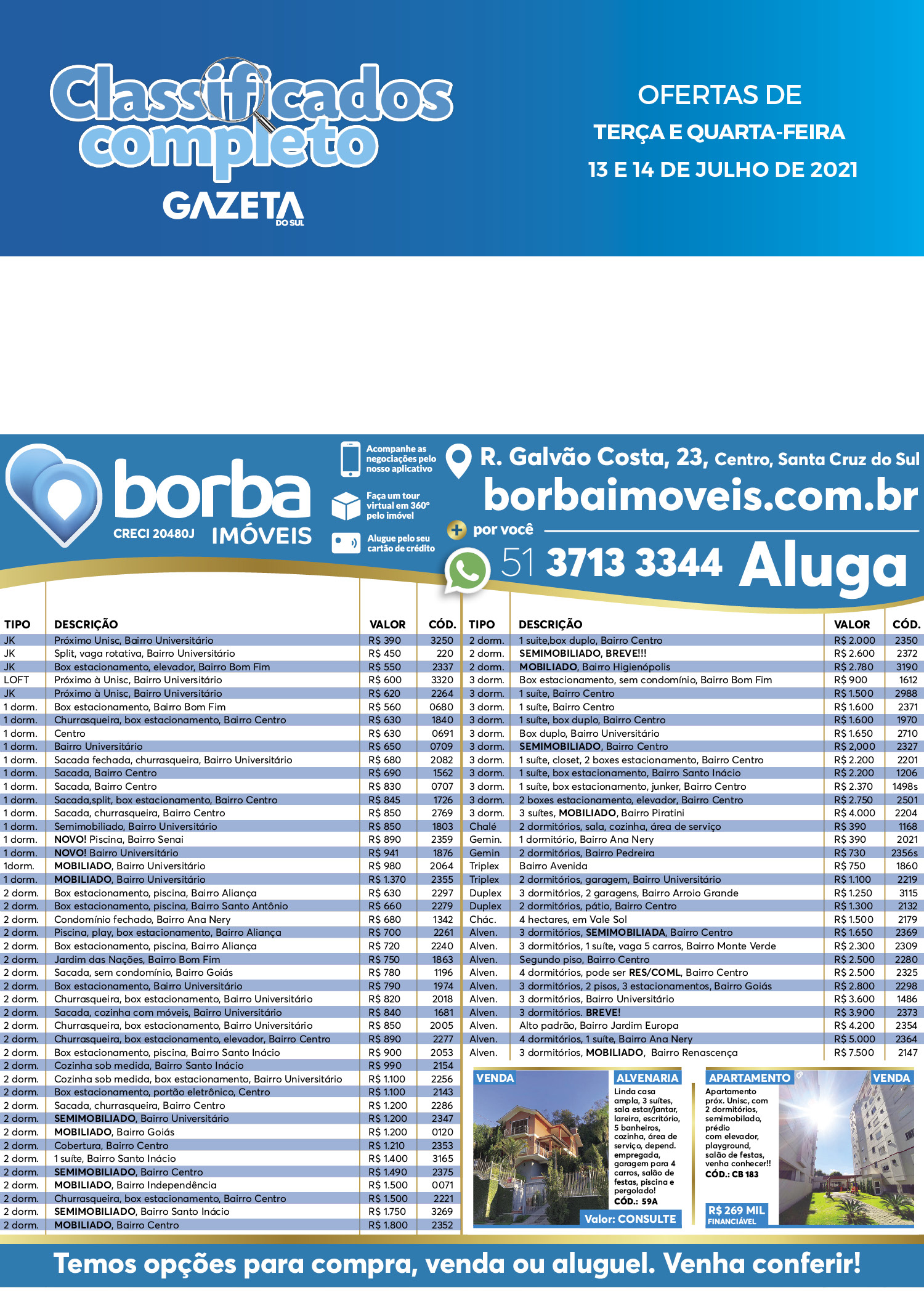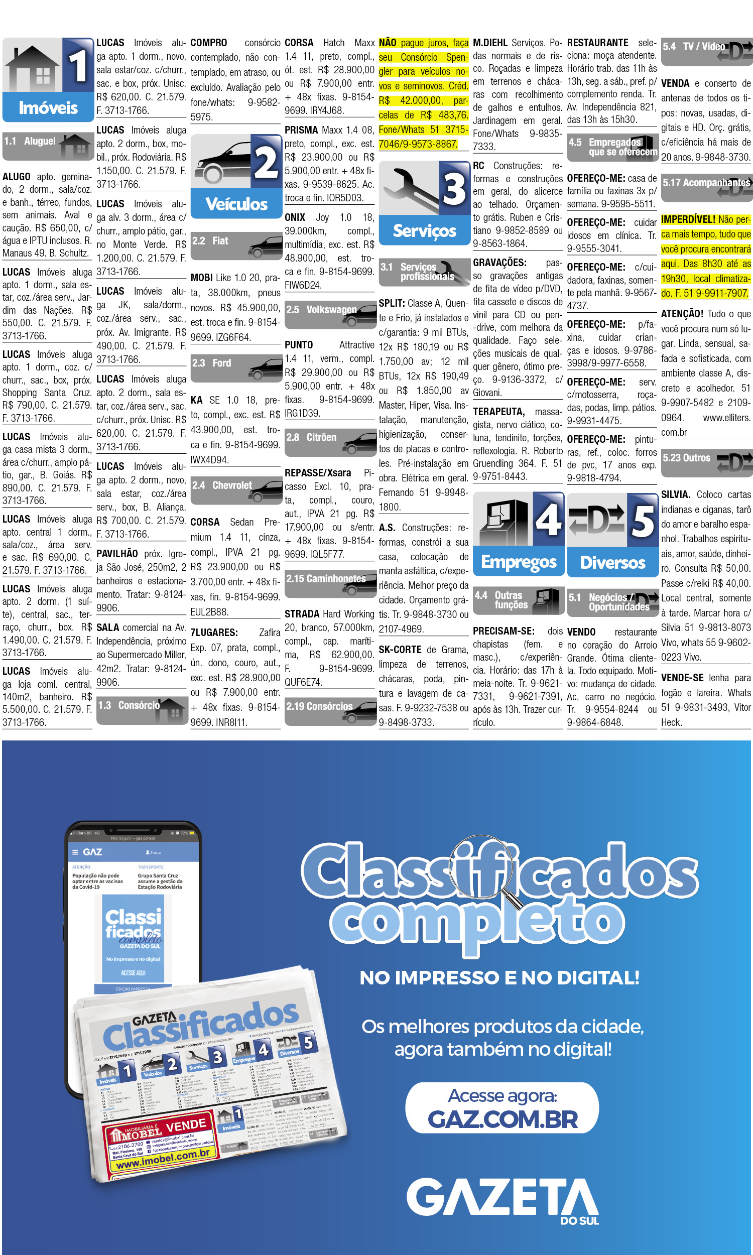 O suplemento de Classificados, que circula nas edições de terças, quintas e sábados, é um dos mais tradicionais da Gazeta do Sul, como vitrine e canal de negócios, de oferta, compra e venda em toda a região central do Rio Grande do Sul. E, para enriquecer pesquisas de produtos e serviços e possibilitar resultado ainda melhor a usuários e parceiros, nos anúncios de clientes cadastrados, o leitor tem acesso direto com link ao site do anunciante, onde poderá verificar mais detalhes sobre os itens. Confira:
