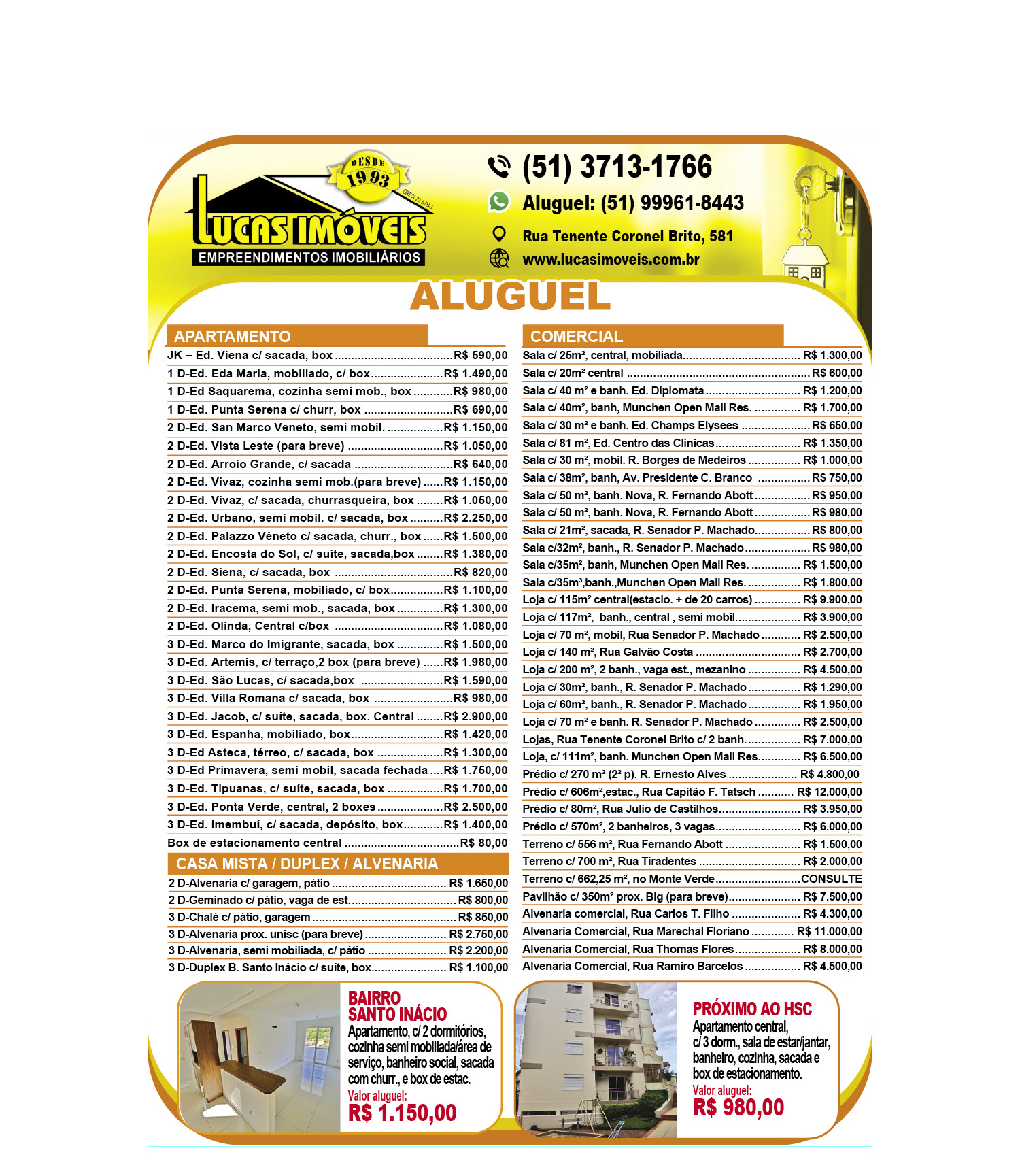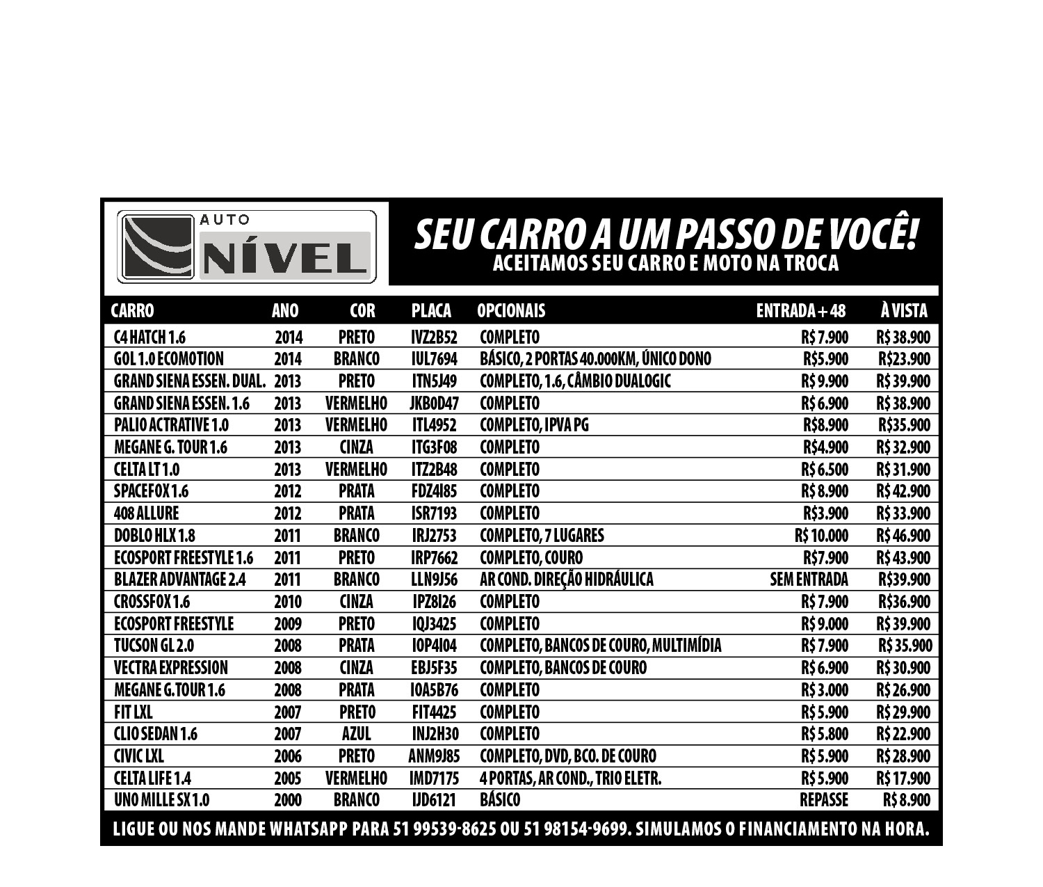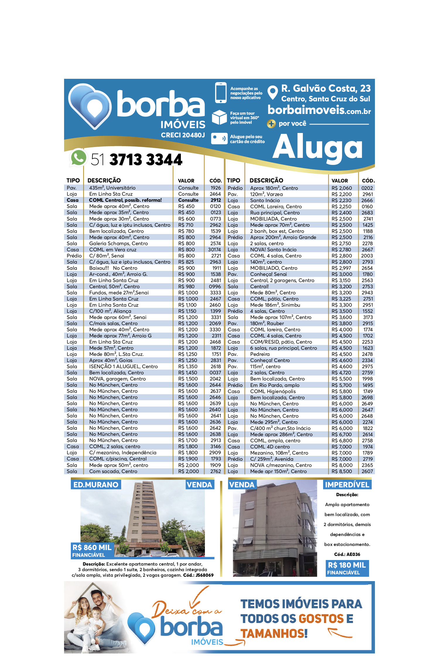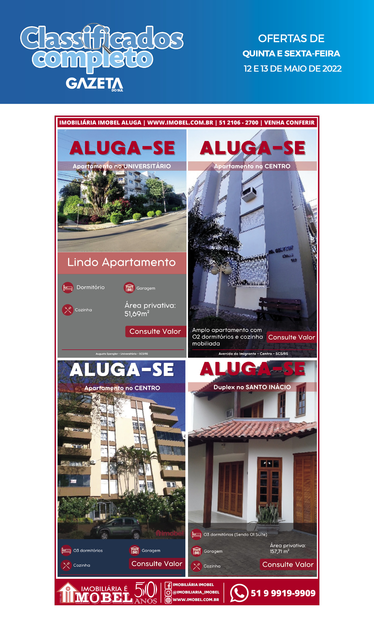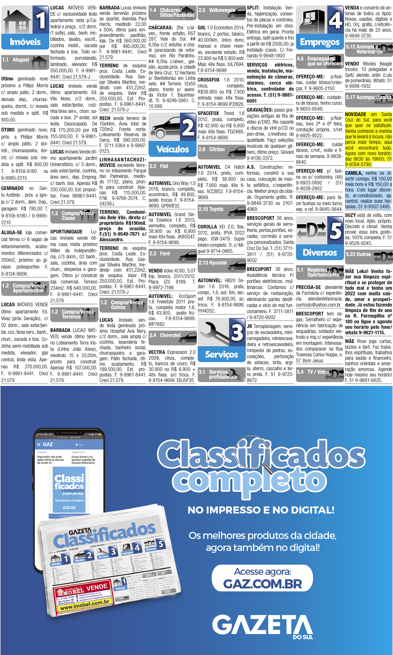 O suplemento de Classificados, que circula nas edições de terças, quintas e sábados, é um dos mais tradicionais da Gazeta do Sul, como vitrine e canal de negócios, de oferta, compra e venda em toda a região central do Rio Grande do Sul. E, para enriquecer pesquisas de produtos e serviços e possibilitar resultado ainda melhor a usuários e parceiros, nos anúncios de clientes cadastrados, o leitor tem acesso direto com link ao site do anunciante, onde poderá verificar mais detalhes sobre os itens. Confira as ofertas: