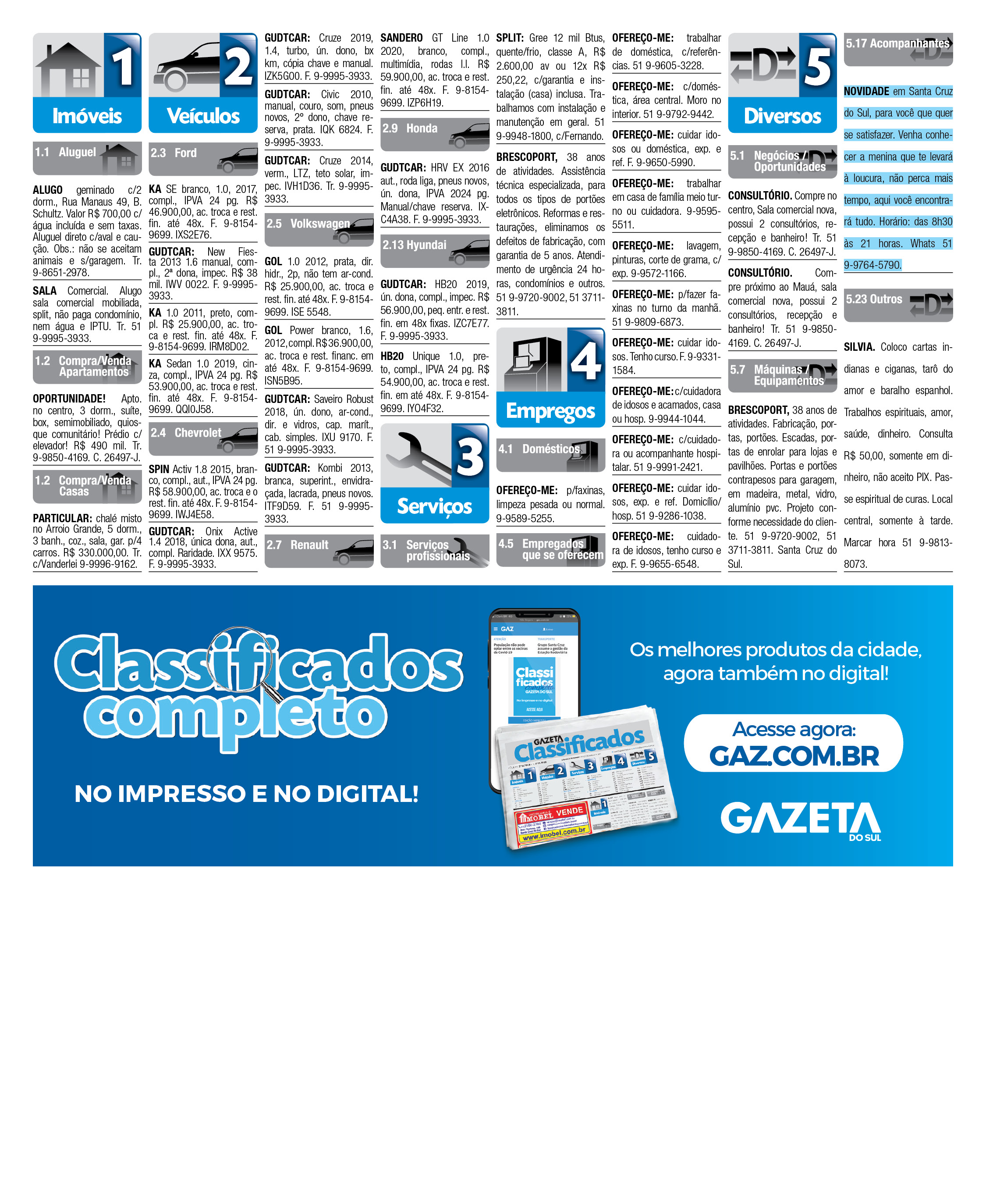 O suplemento de Classificados, que circula nas edições de terças, quintas e sábados, é um dos mais tradicionais da Gazeta do Sul, como vitrine e canal de negócios, de oferta, compra e venda em toda a região central do Rio Grande do Sul. E, para enriquecer pesquisas de produtos e serviços e possibilitar resultado ainda melhor a usuários e parceiros, nos anúncios de clientes cadastrados, o leitor tem acesso direto com link ao site do anunciante, onde poderá verificar mais detalhes sobre os itens. Confira as ofertas:
