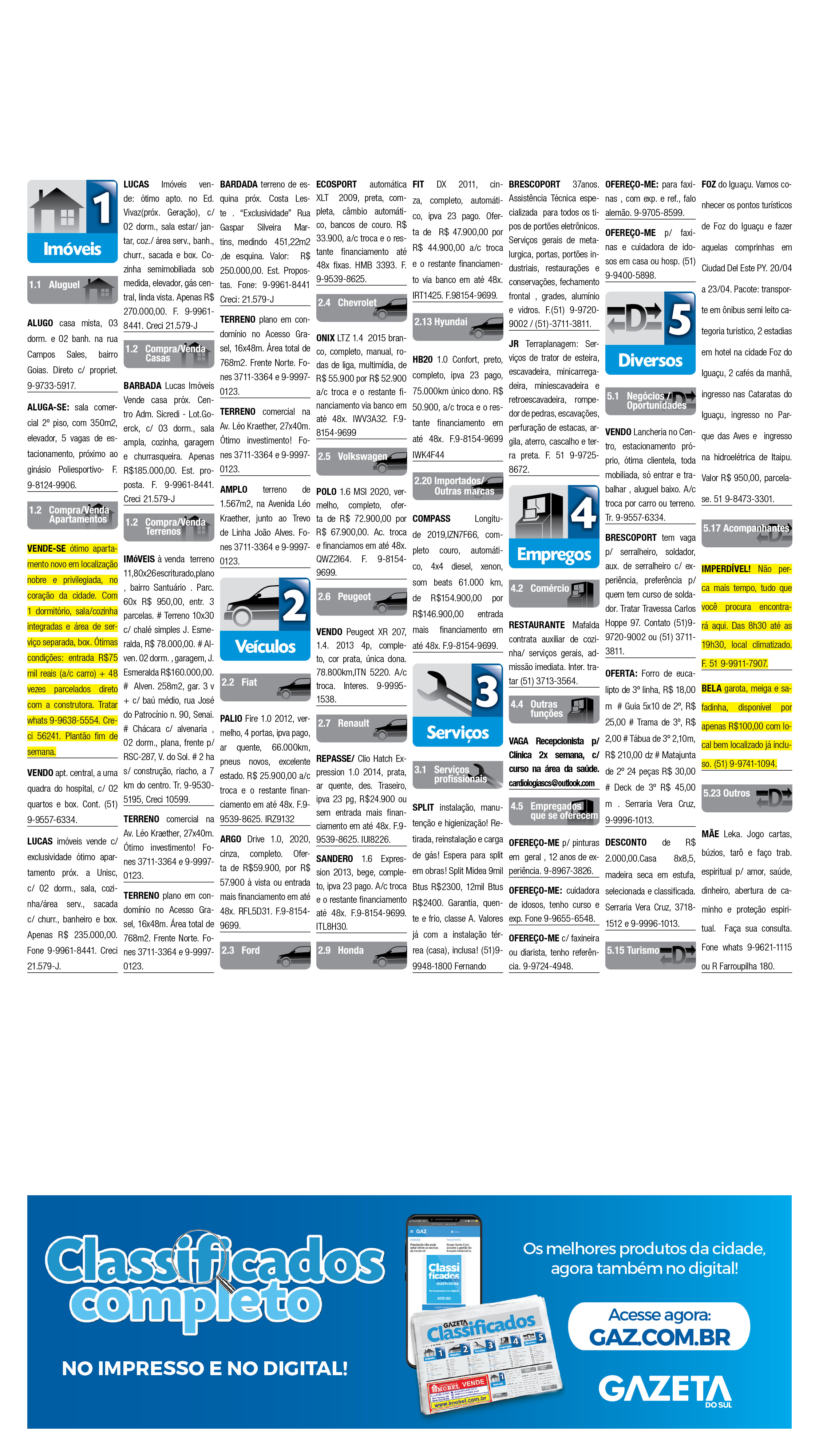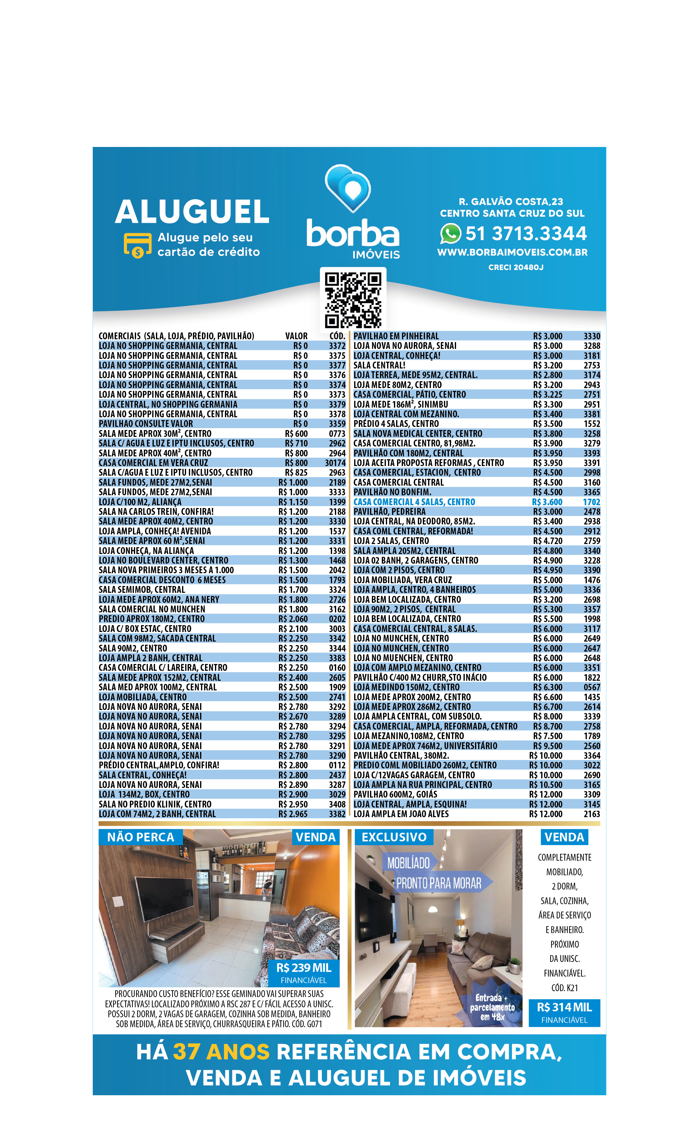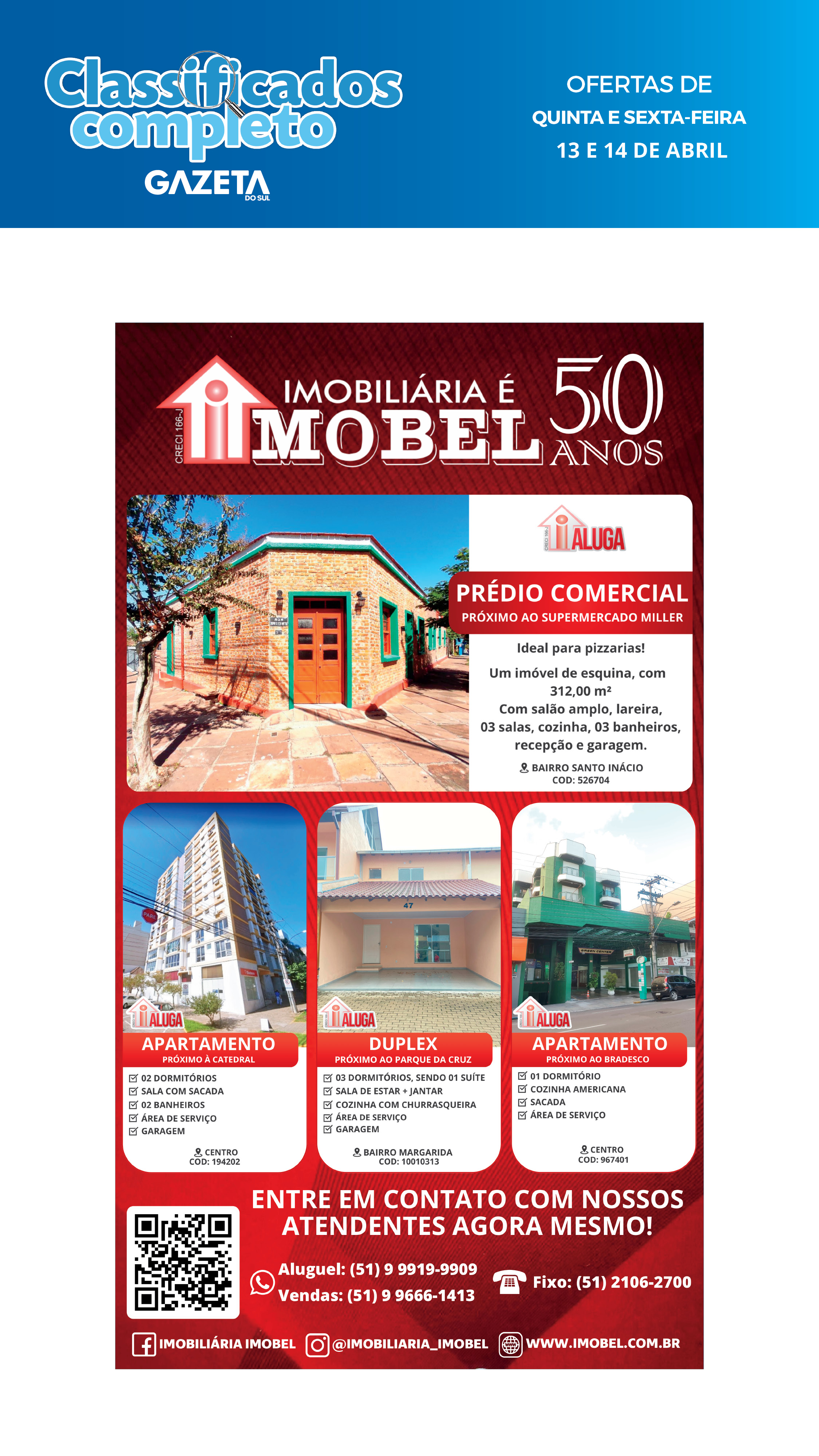 O suplemento de Classificados, que circula nas edições de terças, quintas e sábados, é um dos mais tradicionais da Gazeta do Sul, como vitrine e canal de negócios, de oferta, compra e venda em toda a região central do Rio Grande do Sul. E, para enriquecer pesquisas de produtos e serviços e possibilitar resultado ainda melhor a usuários e parceiros, nos anúncios de clientes cadastrados, o leitor tem acesso direto com link ao site do anunciante, onde poderá verificar mais detalhes sobre os itens. Confira as ofertas: