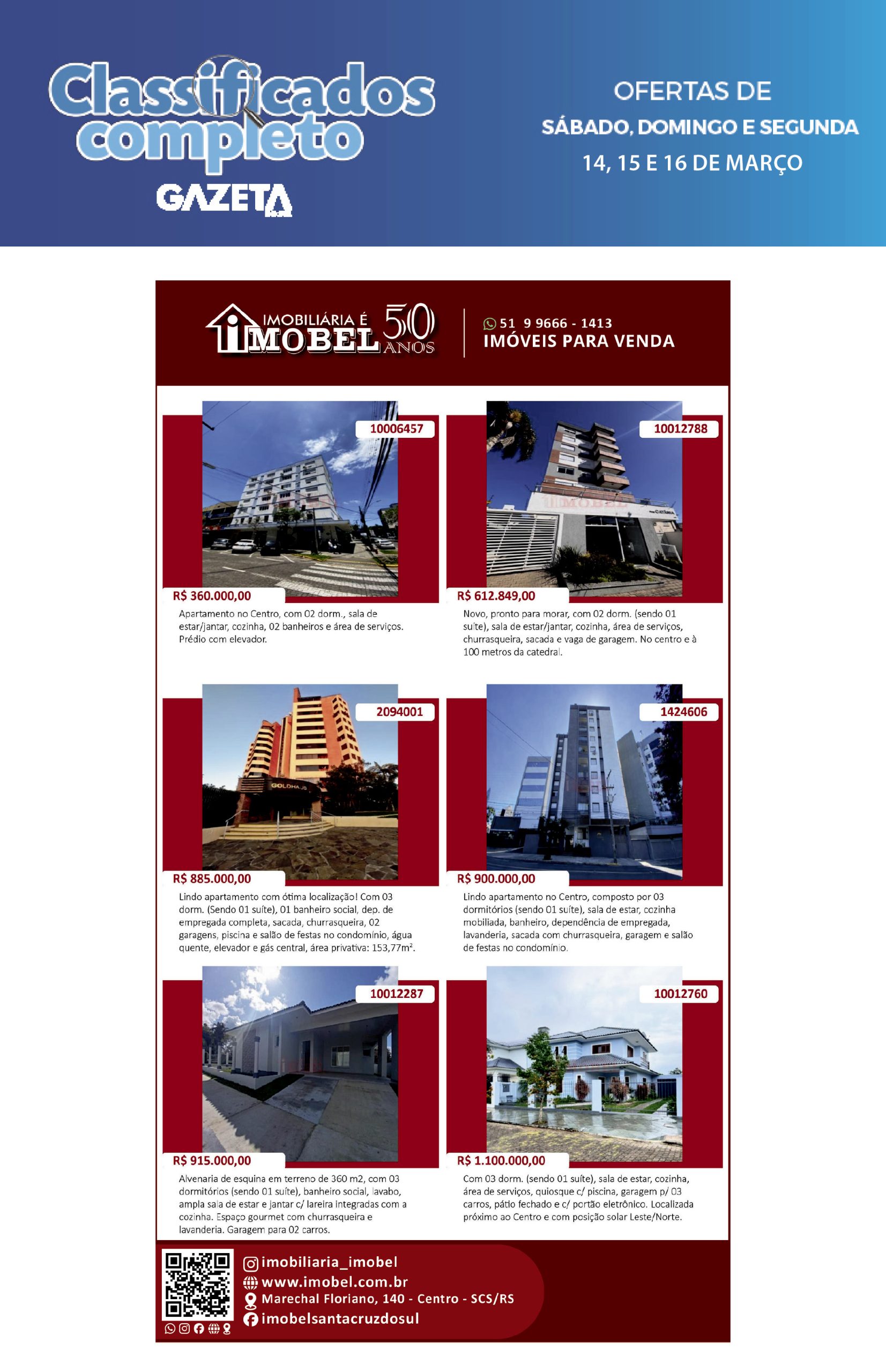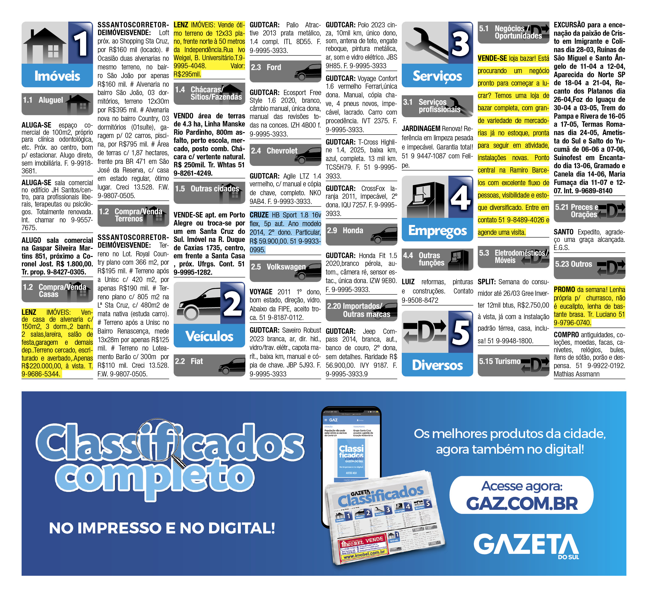 O suplemento de Classificados, que circula nas edições de terças, quintas e sábados, é um dos mais tradicionais da Gazeta do Sul, como vitrine e canal de negócios, de oferta, compra e venda em toda a região central do Rio Grande do Sul. E, para enriquecer pesquisas de produtos e serviços e possibilitar resultado ainda melhor a usuários e parceiros, nos anúncios de clientes cadastrados, o leitor tem acesso direto com link ao site do anunciante, onde poderá verificar mais detalhes sobre os itens. Confira as ofertas: