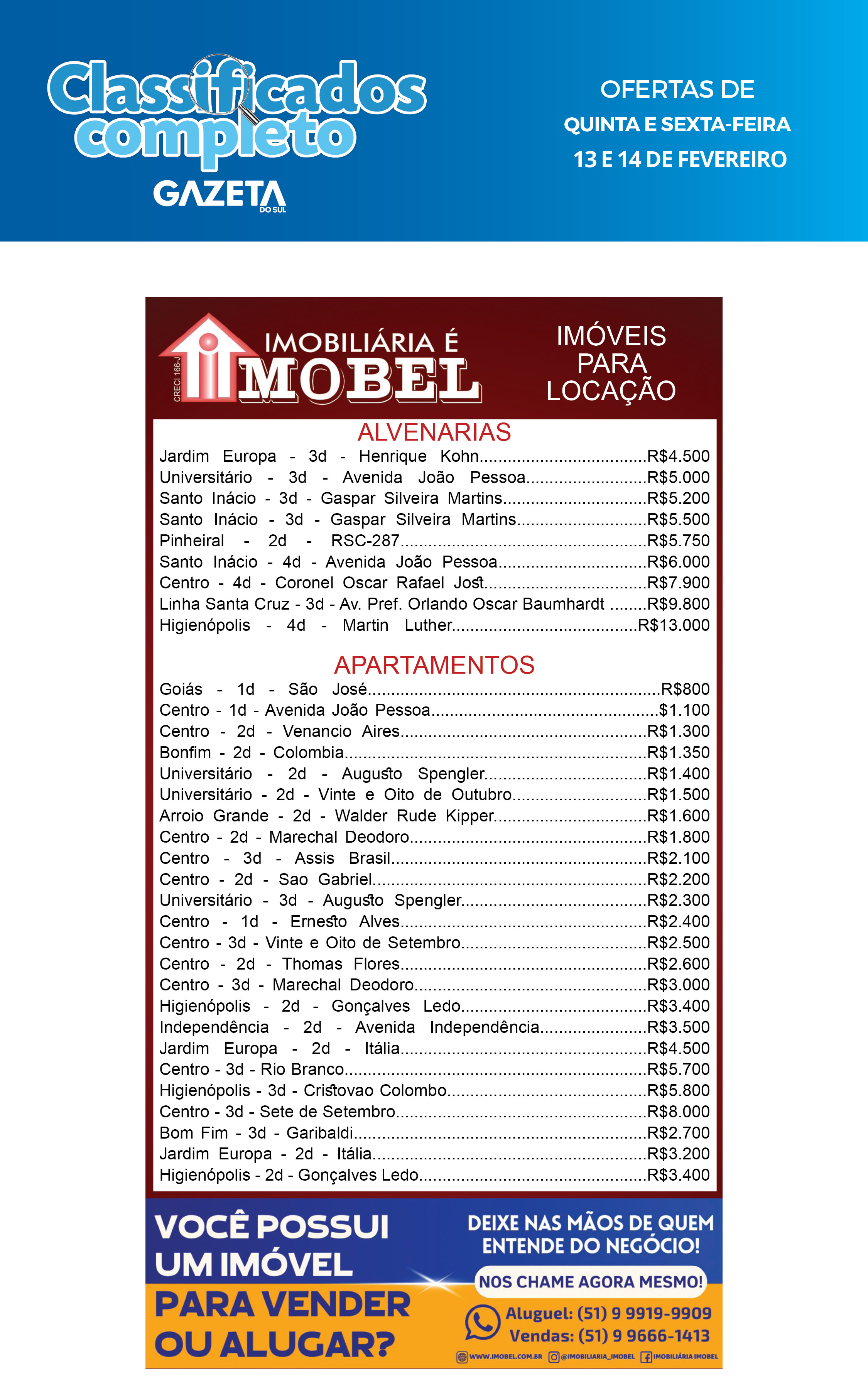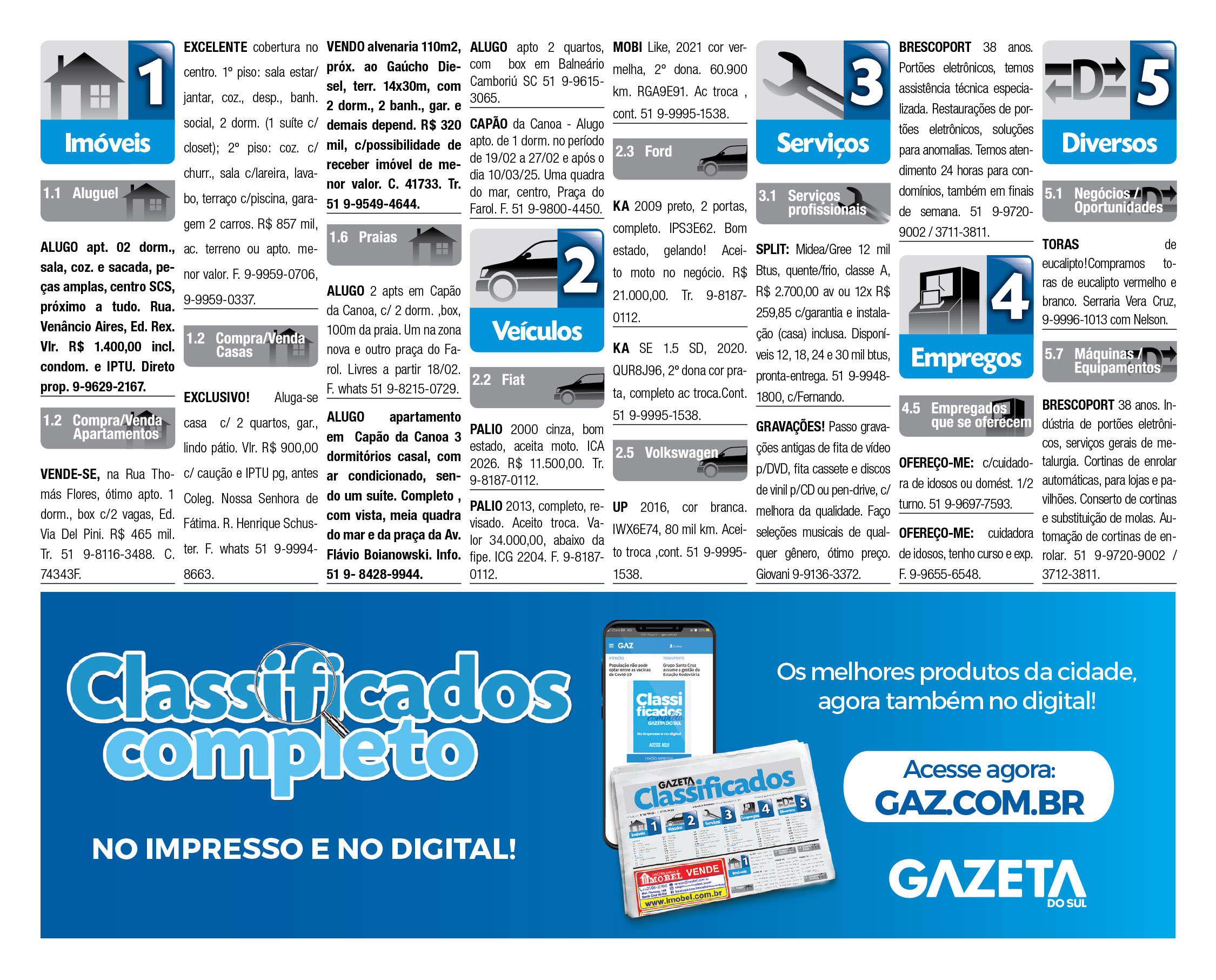 O suplemento de Classificados, que circula nas edições de terças, quintas e sábados, é um dos mais tradicionais da Gazeta do Sul, como vitrine e canal de negócios, de oferta, compra e venda em toda a região central do Rio Grande do Sul. E, para enriquecer pesquisas de produtos e serviços e possibilitar resultado ainda melhor a usuários e parceiros, nos anúncios de clientes cadastrados, o leitor tem acesso direto com link ao site do anunciante, onde poderá verificar mais detalhes sobre os itens. Confira as ofertas: