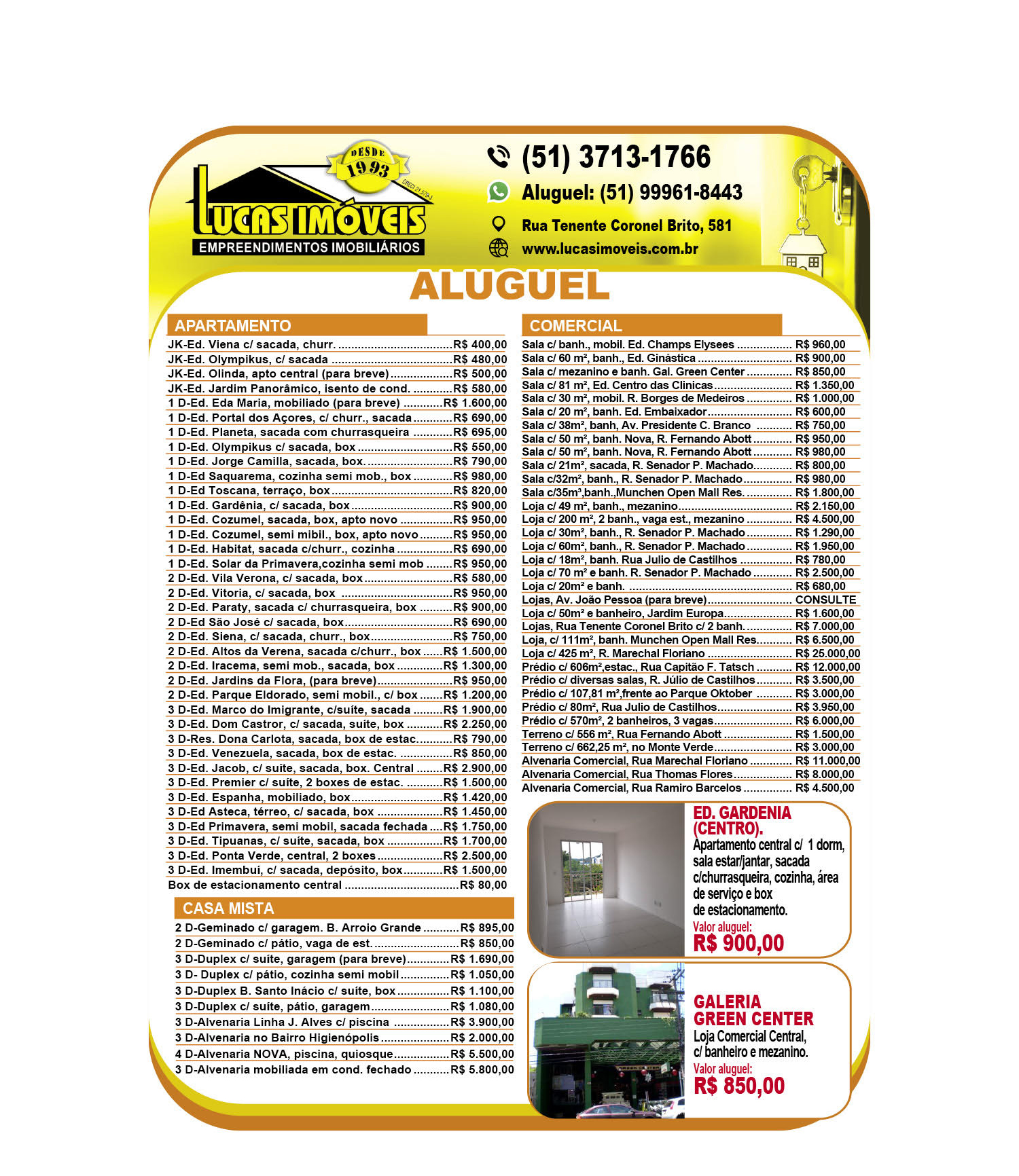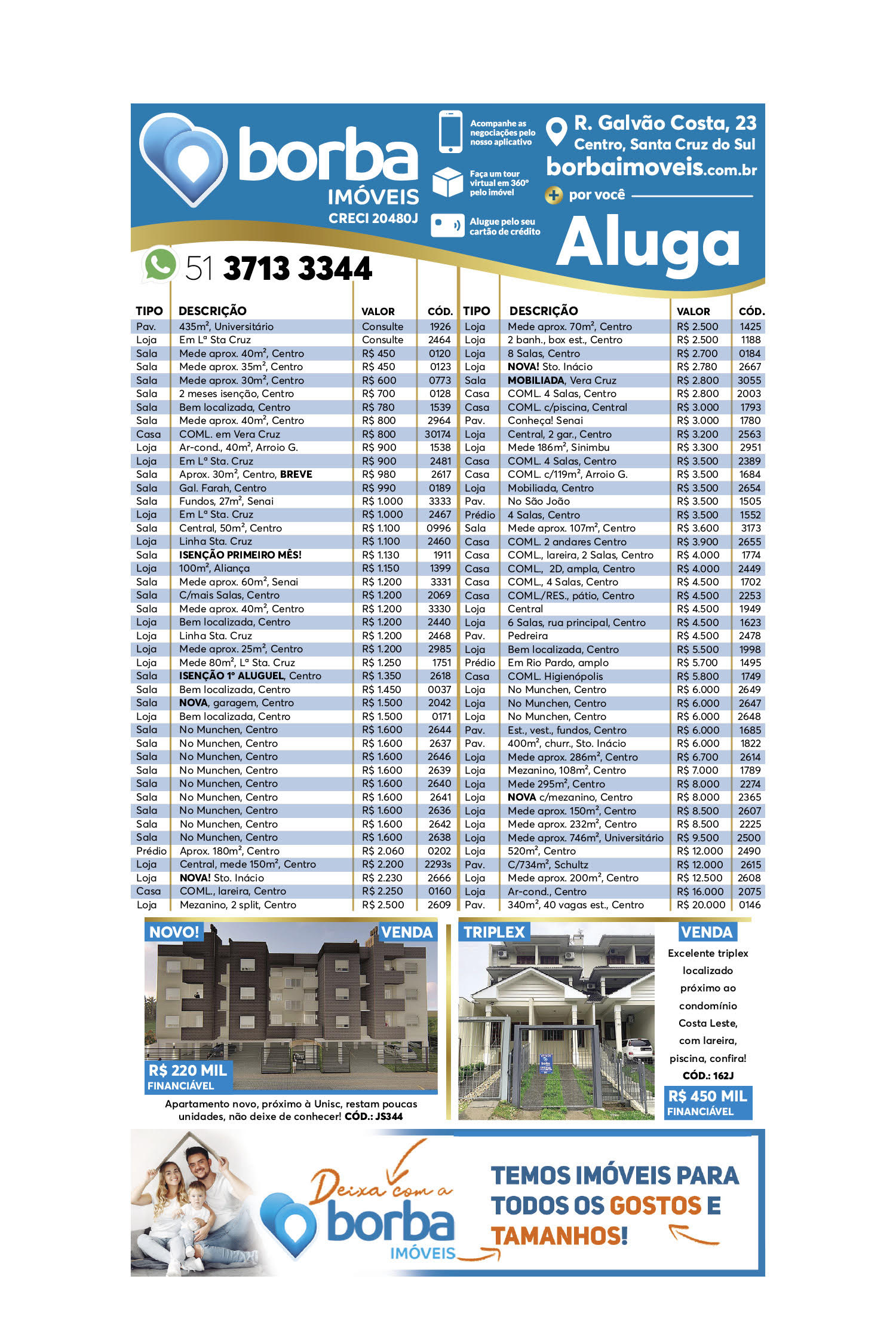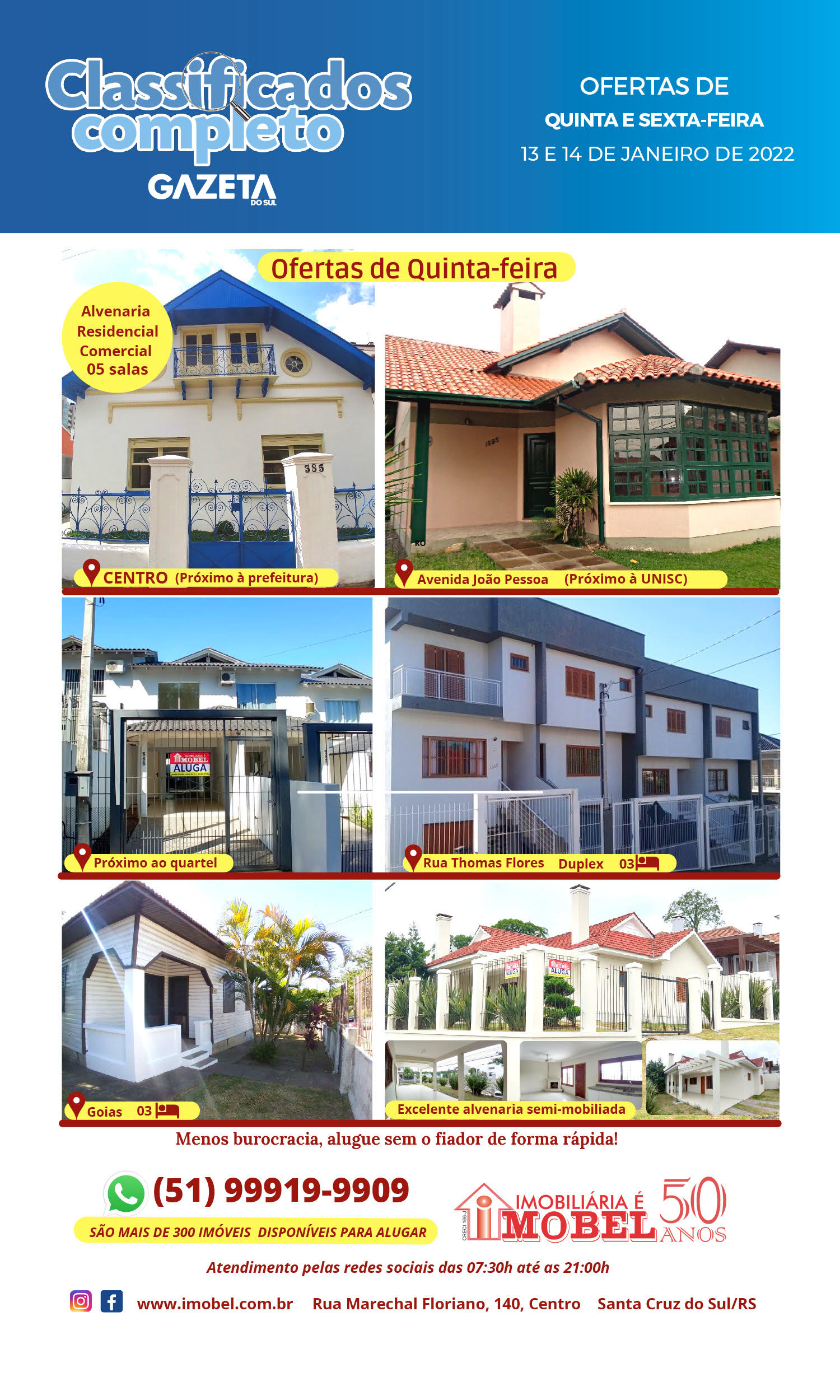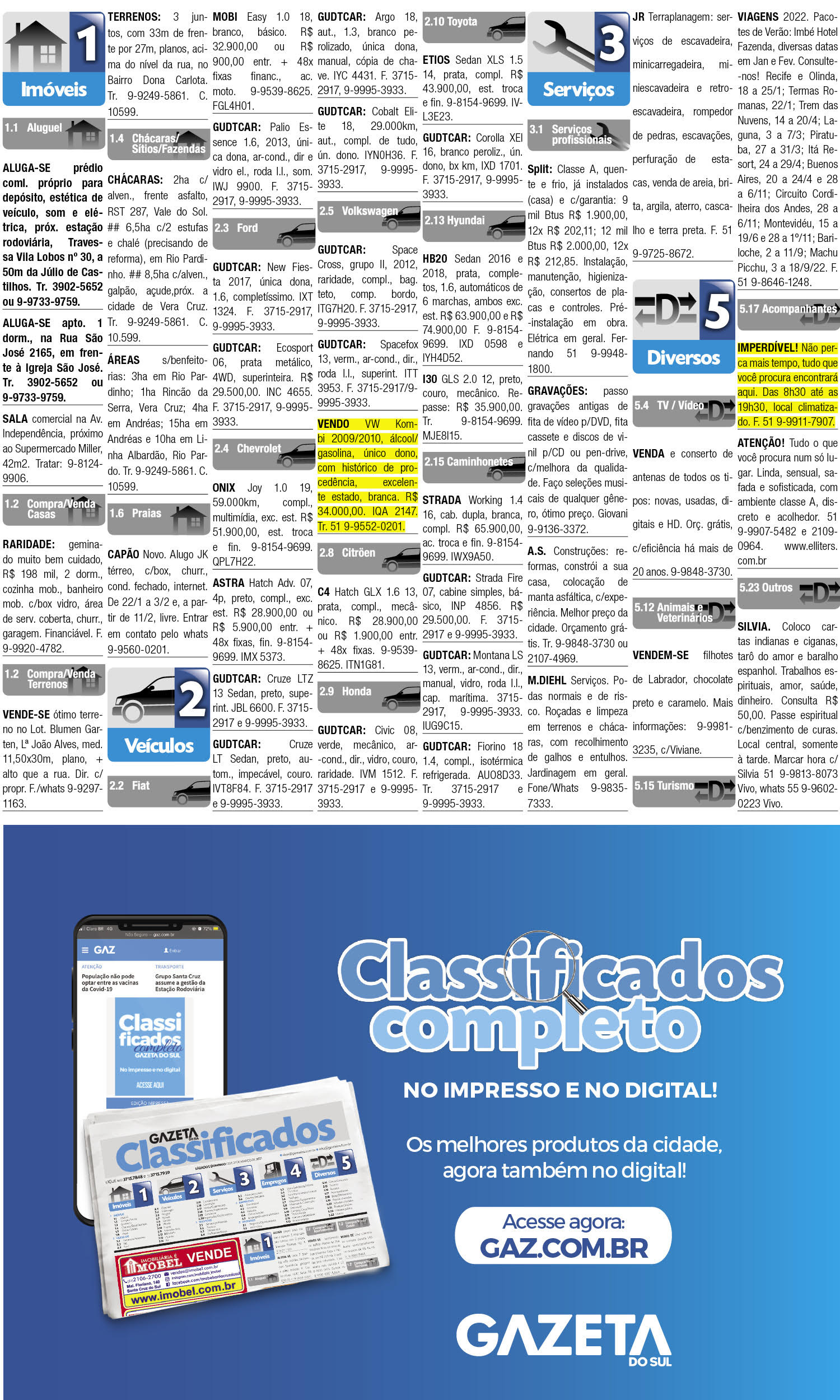O suplemento de Classificados, que circula nas edições de terças, quintas e sábados, é um dos mais tradicionais da Gazeta do Sul, como vitrine e canal de negócios, de oferta, compra e venda em toda a região central do Rio Grande do Sul. E, para enriquecer pesquisas de produtos e serviços e possibilitar resultado ainda melhor a usuários e parceiros, nos anúncios de clientes cadastrados, o leitor tem acesso direto com link ao site do anunciante, onde poderá verificar mais detalhes sobre os itens. Confira as ofertas: