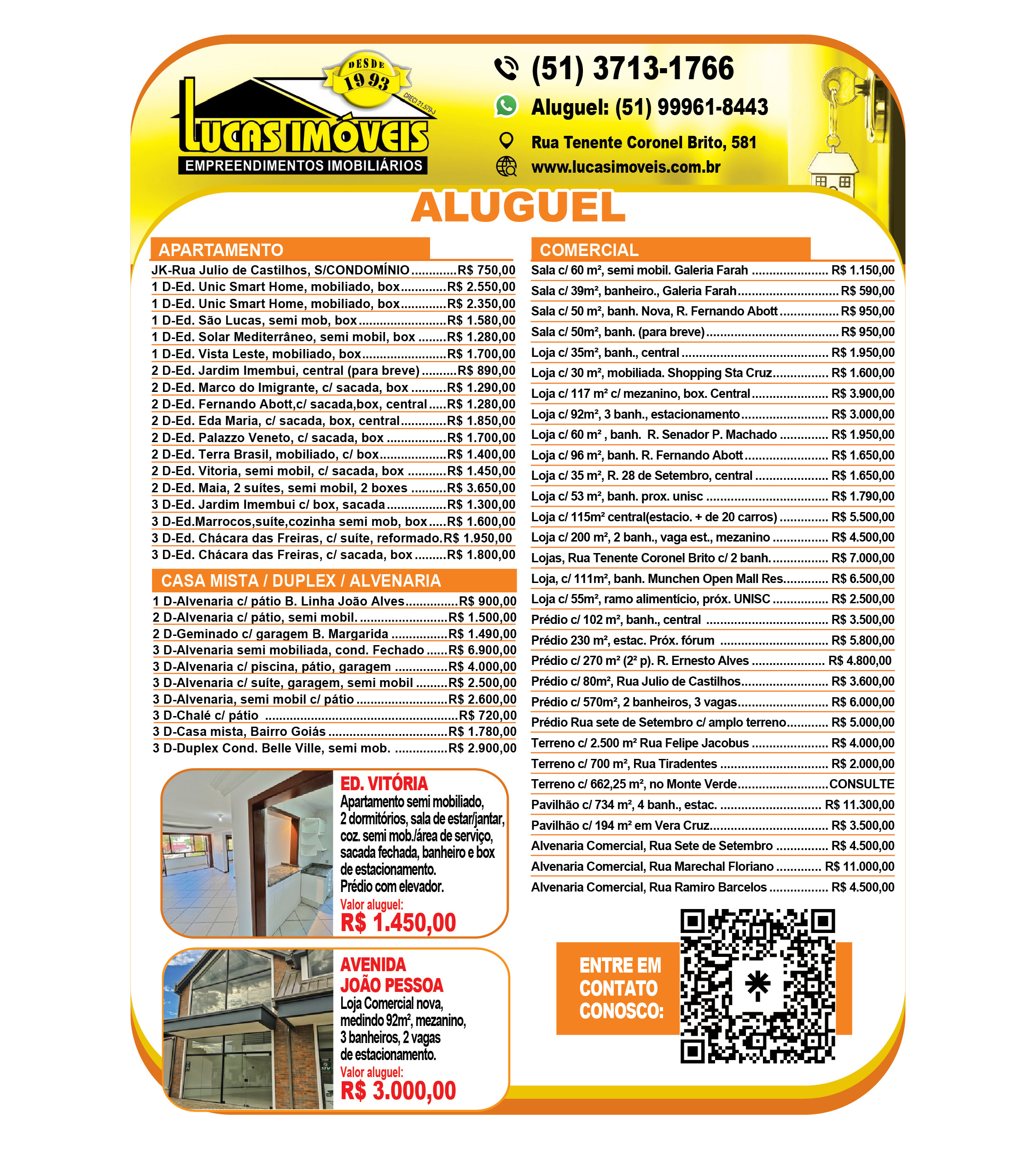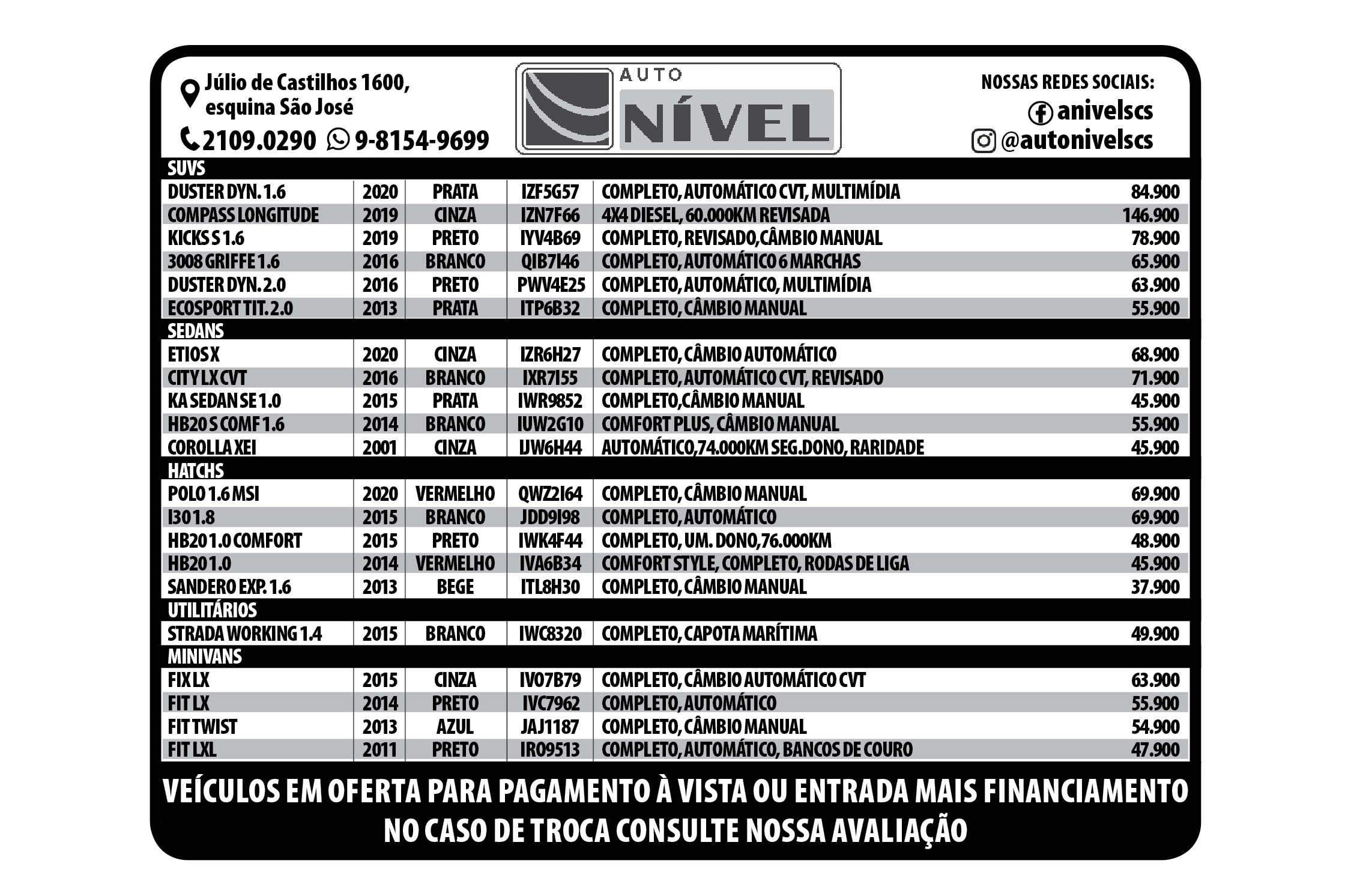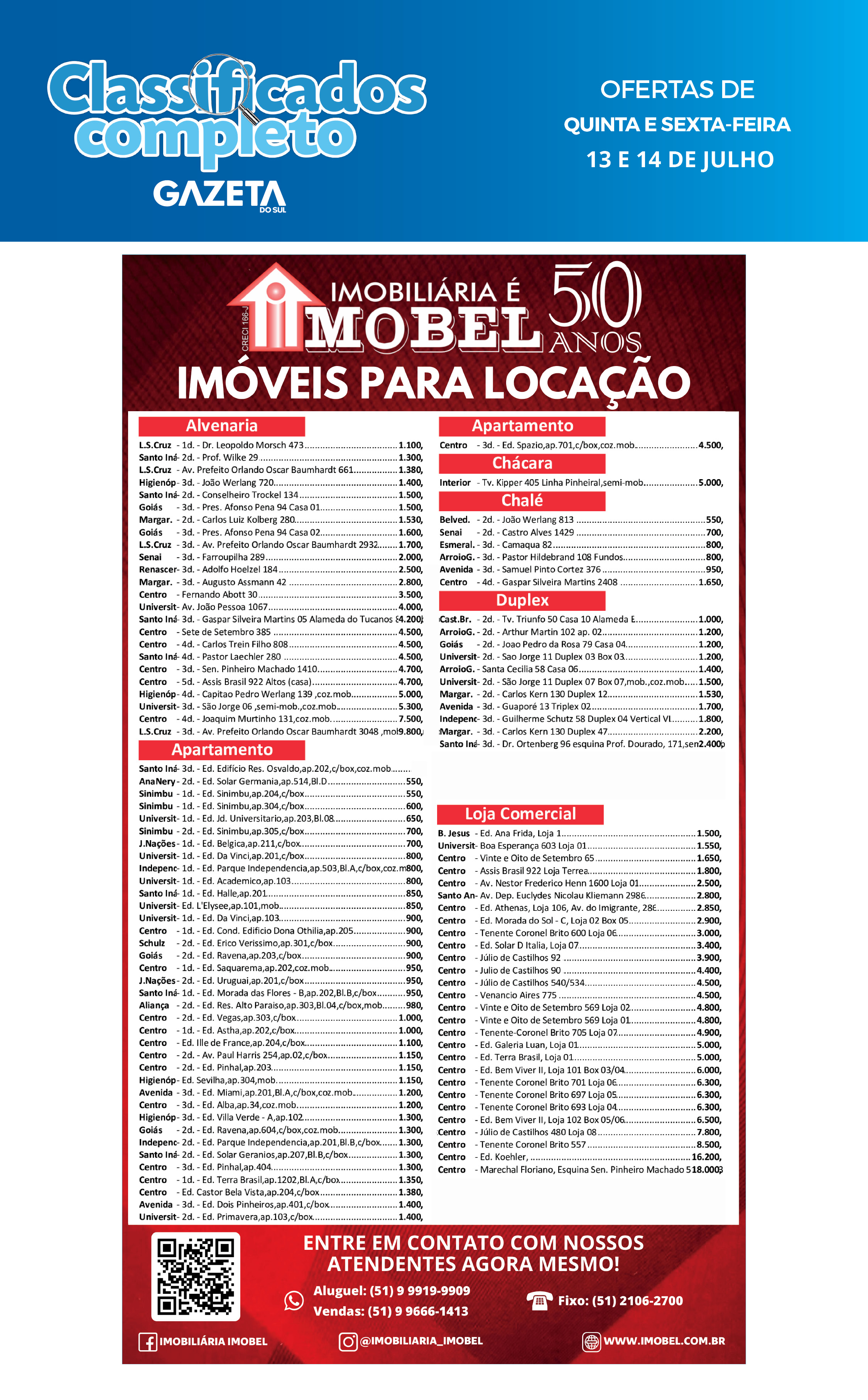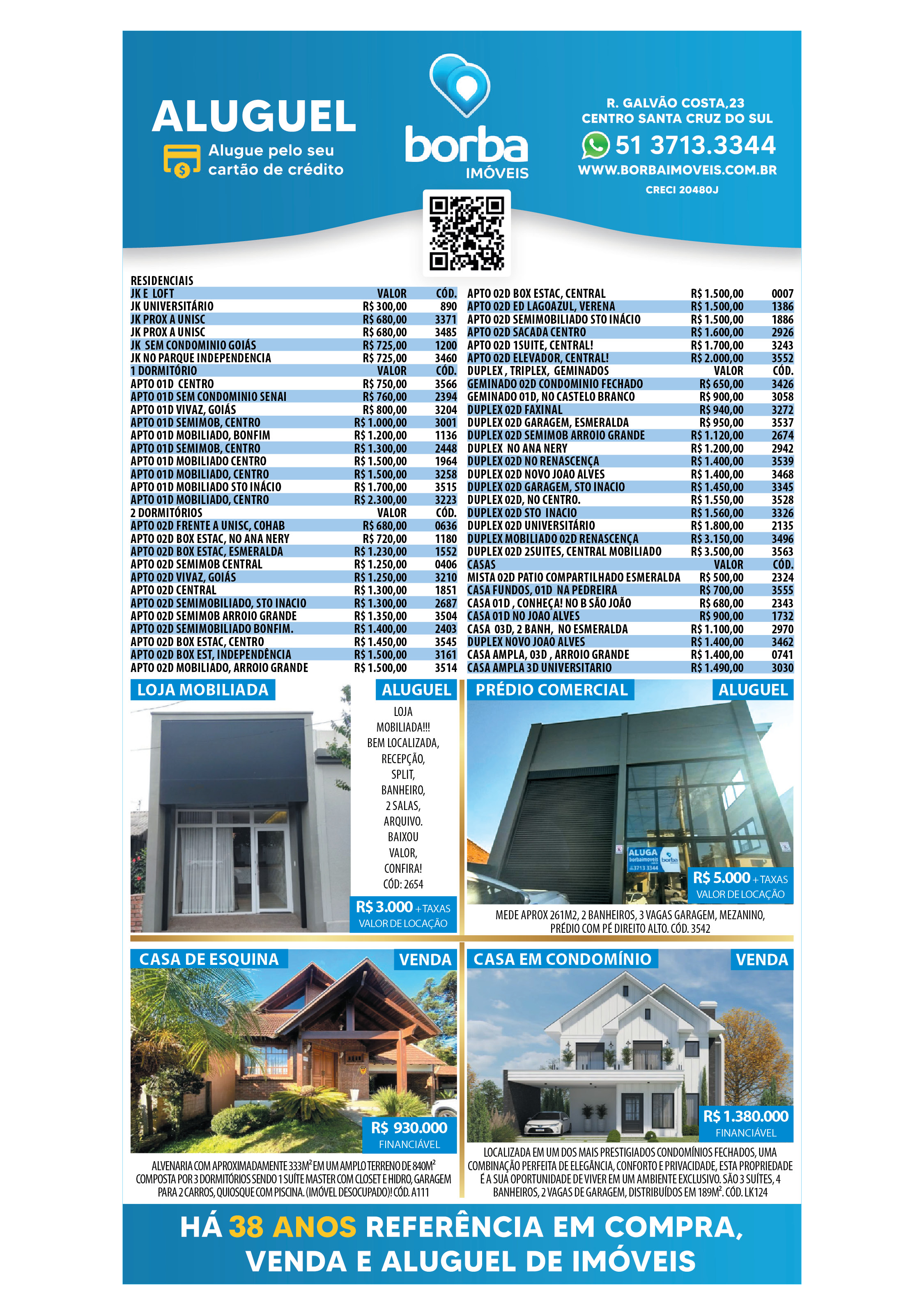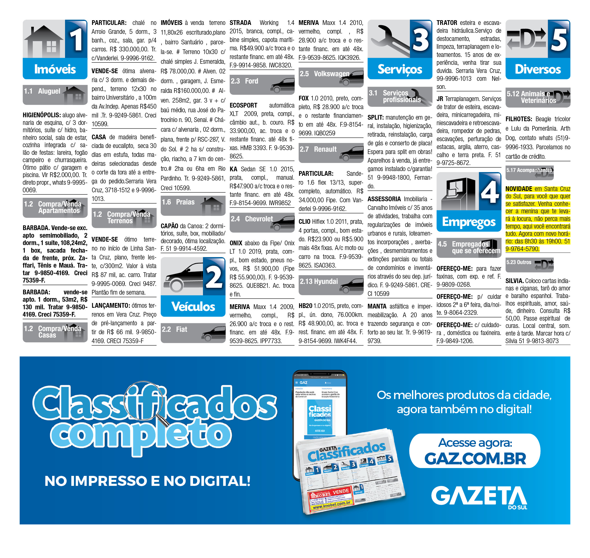 O suplemento de Classificados, que circula nas edições de terças, quintas e sábados, é um dos mais tradicionais da Gazeta do Sul, como vitrine e canal de negócios, de oferta, compra e venda em toda a região central do Rio Grande do Sul. E, para enriquecer pesquisas de produtos e serviços e possibilitar resultado ainda melhor a usuários e parceiros, nos anúncios de clientes cadastrados, o leitor tem acesso direto com link ao site do anunciante, onde poderá verificar mais detalhes sobre os itens. Confira as ofertas: