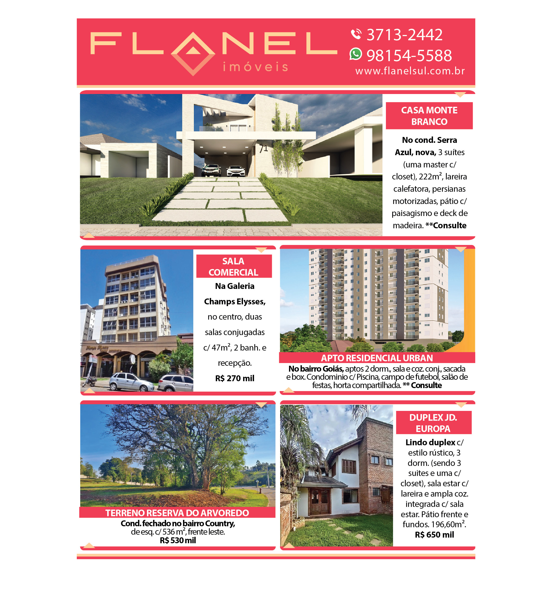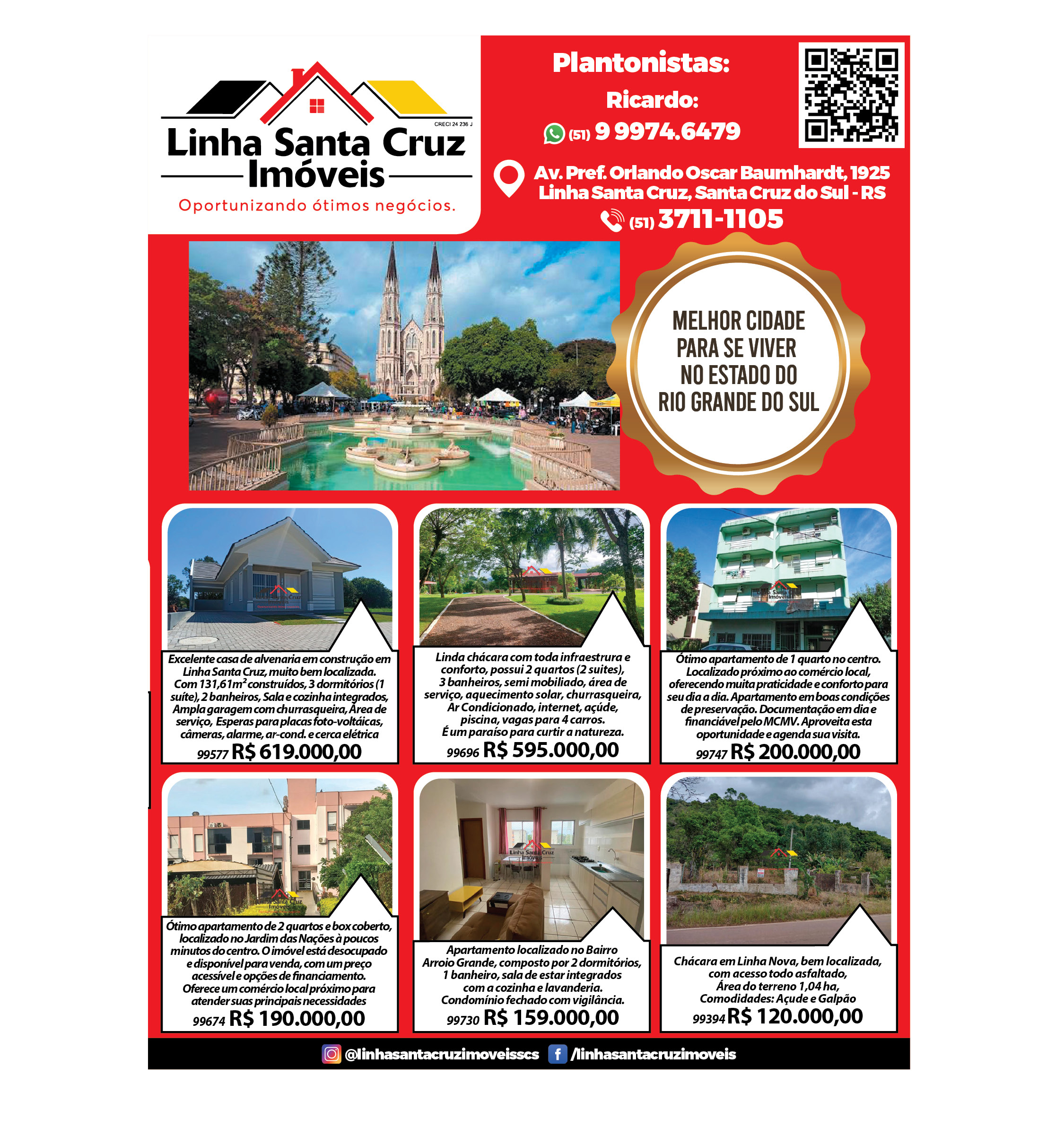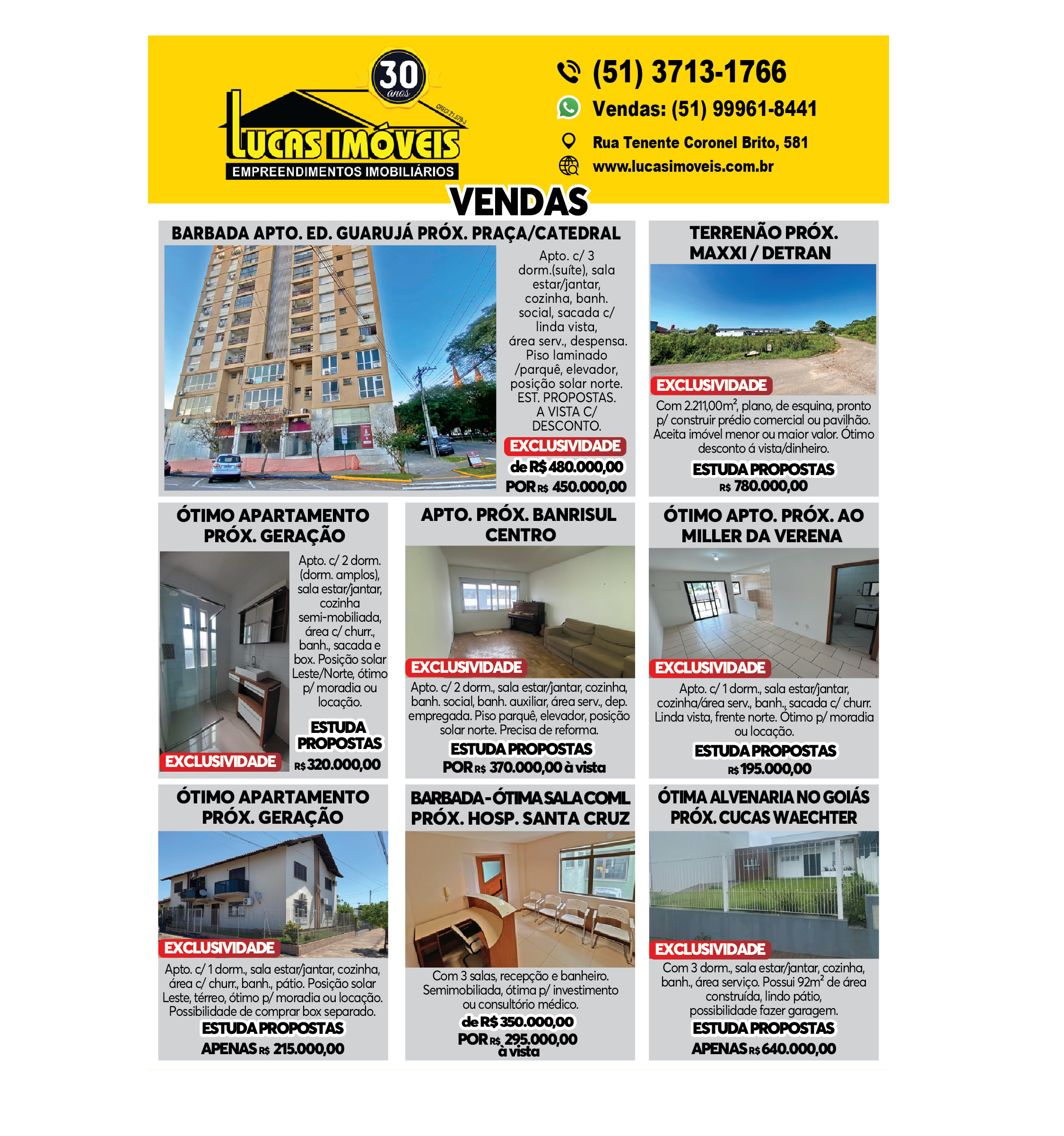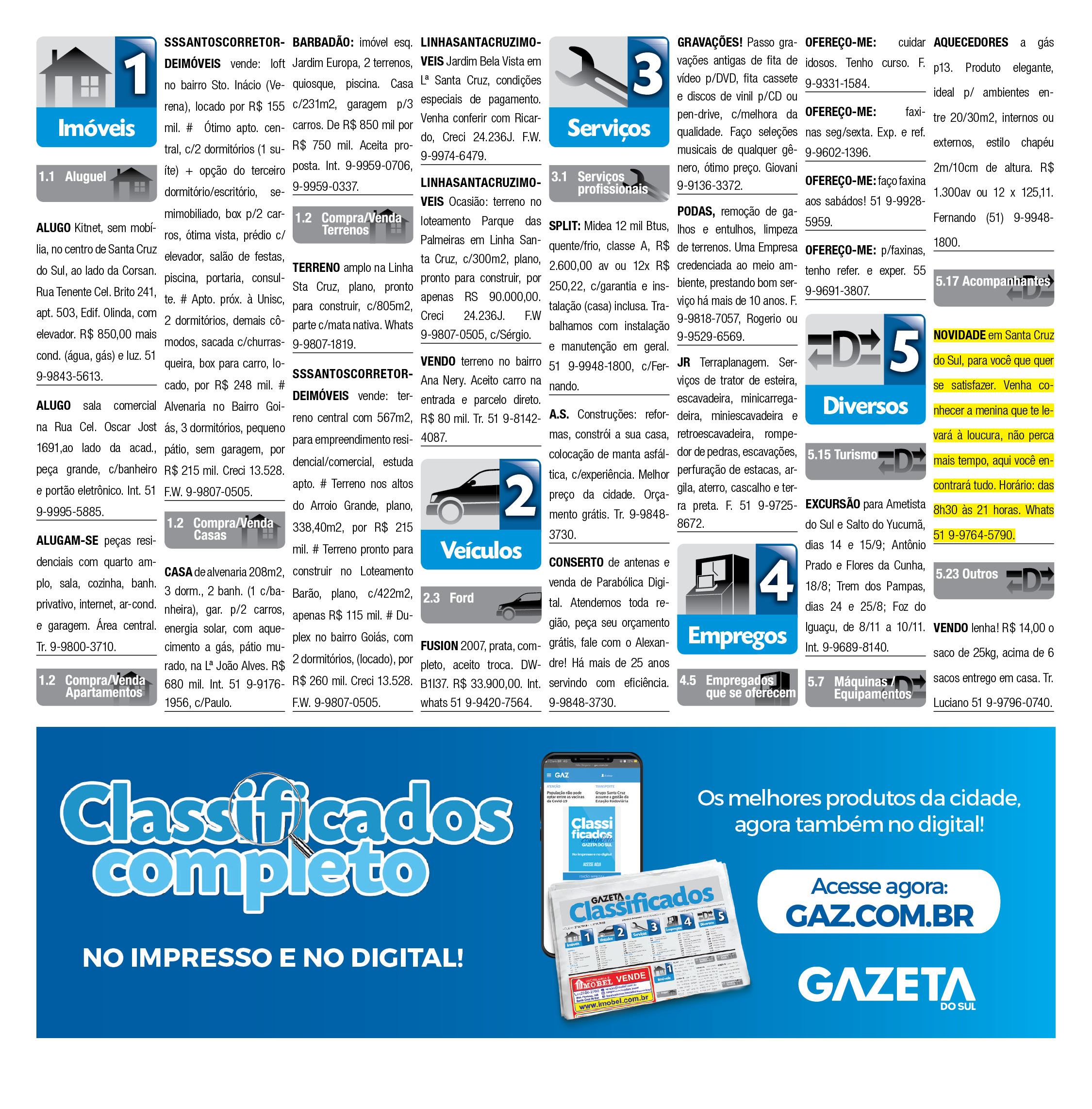O suplemento de Classificados, que circula nas edições de terças, quintas e sábados, é um dos mais tradicionais da Gazeta do Sul, como vitrine e canal de negócios, de oferta, compra e venda em toda a região central do Rio Grande do Sul. E, para enriquecer pesquisas de produtos e serviços e possibilitar resultado ainda melhor a usuários e parceiros, nos anúncios de clientes cadastrados, o leitor tem acesso direto com link ao site do anunciante, onde poderá verificar mais detalhes sobre os itens. Confira as ofertas: