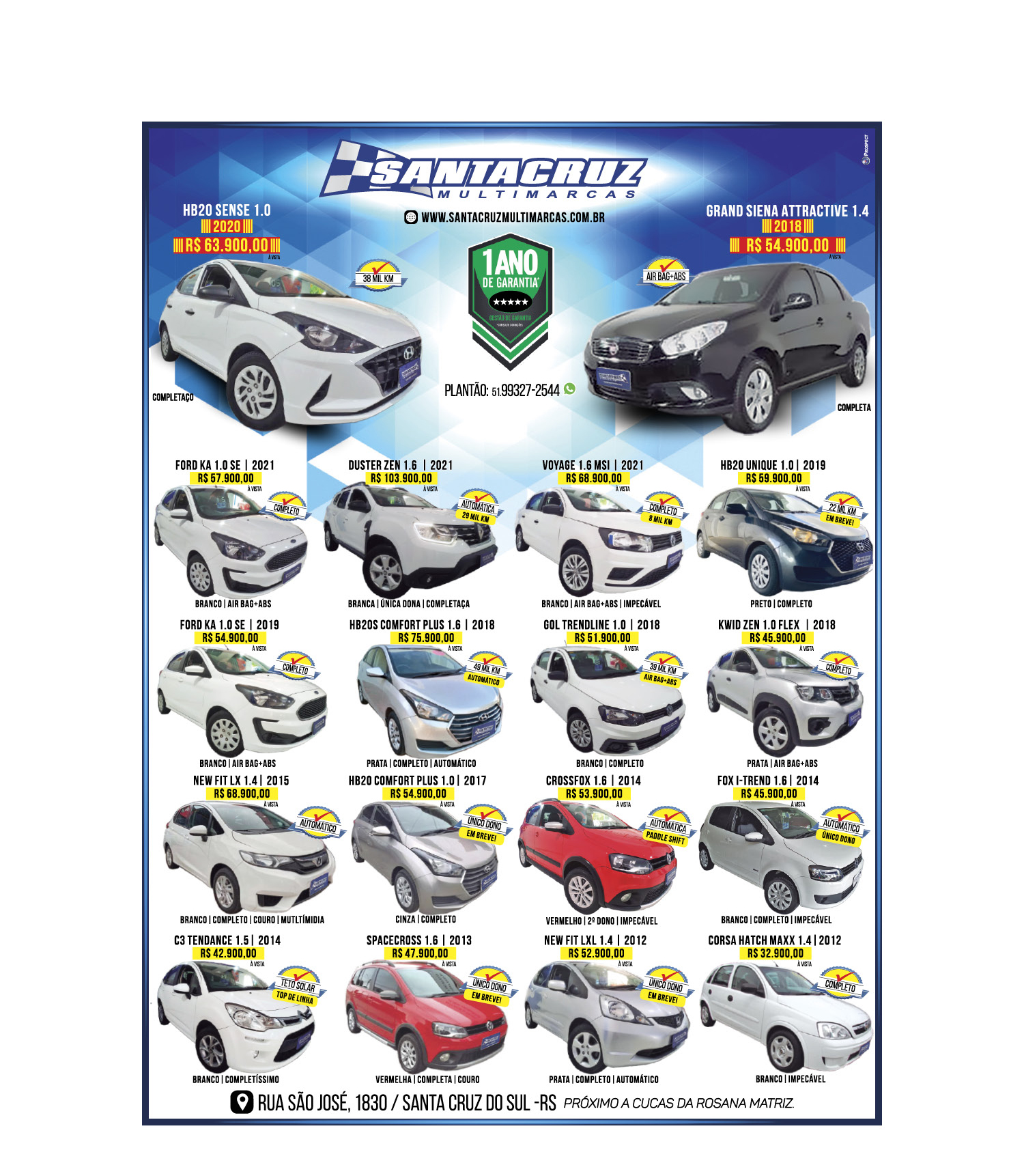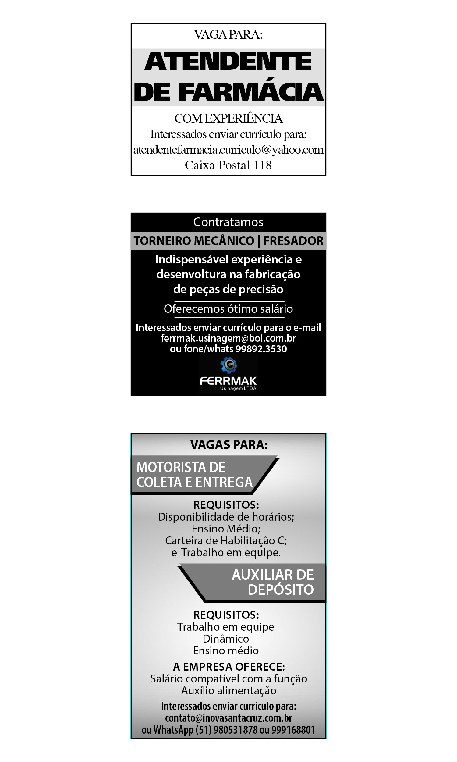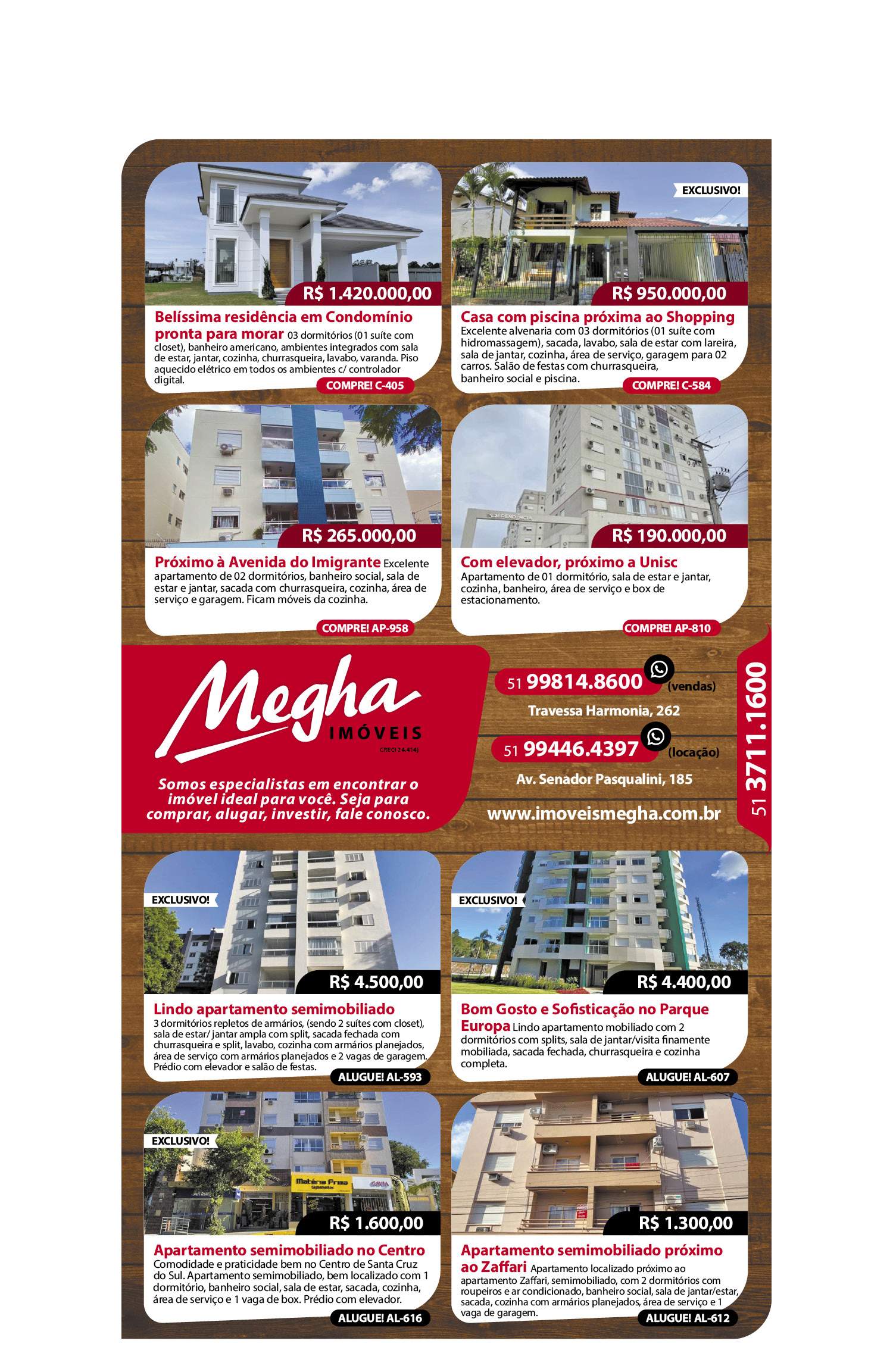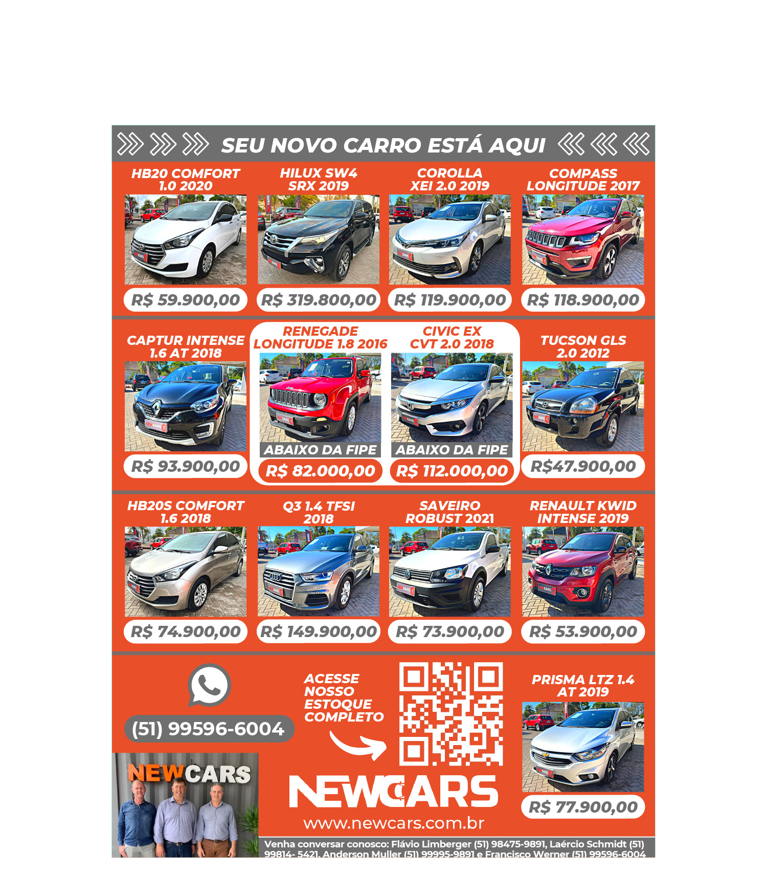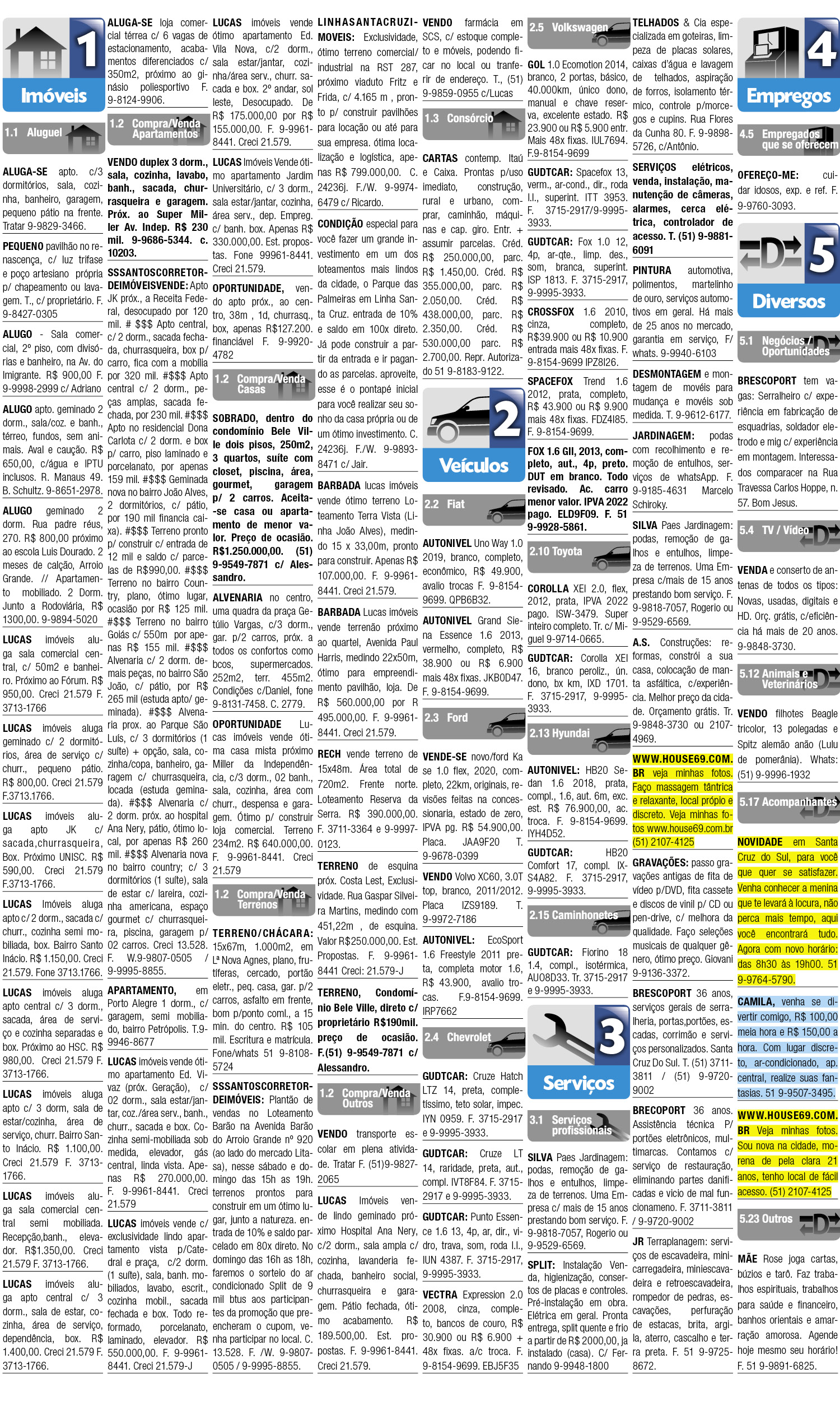 O suplemento de Classificados, que circula nas edições de terças, quintas e sábados, é um dos mais tradicionais da Gazeta do Sul, como vitrine e canal de negócios, de oferta, compra e venda em toda a região central do Rio Grande do Sul. E, para enriquecer pesquisas de produtos e serviços e possibilitar resultado ainda melhor a usuários e parceiros, nos anúncios de clientes cadastrados, o leitor tem acesso direto com link ao site do anunciante, onde poderá verificar mais detalhes sobre os itens. Confira as ofertas: