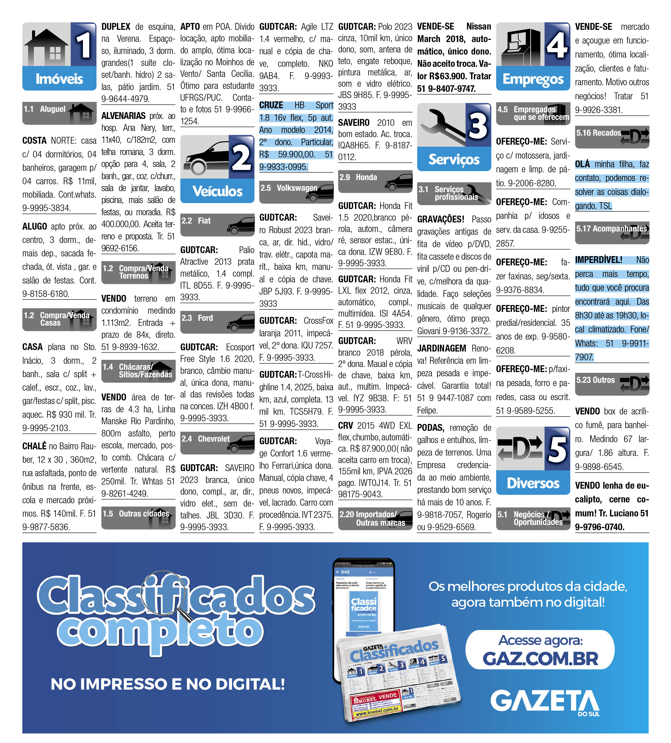 O suplemento de Classificados, que circula nas edições de terças, quintas e sábados, é um dos mais tradicionais da Gazeta do Sul, como vitrine e canal de negócios, de oferta, compra e venda em toda a região central do Rio Grande do Sul. E, para enriquecer pesquisas de produtos e serviços e possibilitar resultado ainda melhor a usuários e parceiros, nos anúncios de clientes cadastrados, o leitor tem acesso direto com link ao site do anunciante, onde poderá verificar mais detalhes sobre os itens. Confira as ofertas: