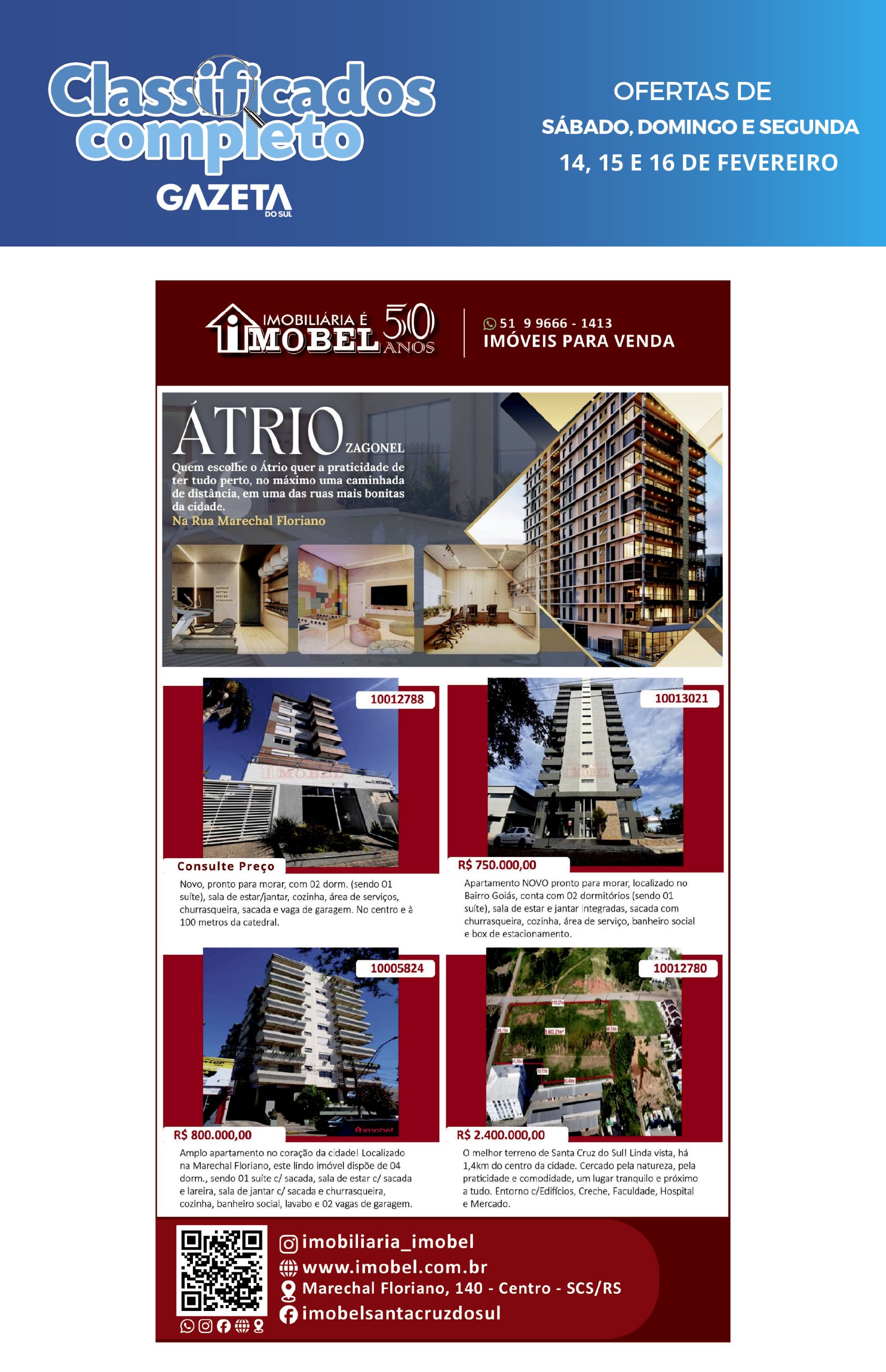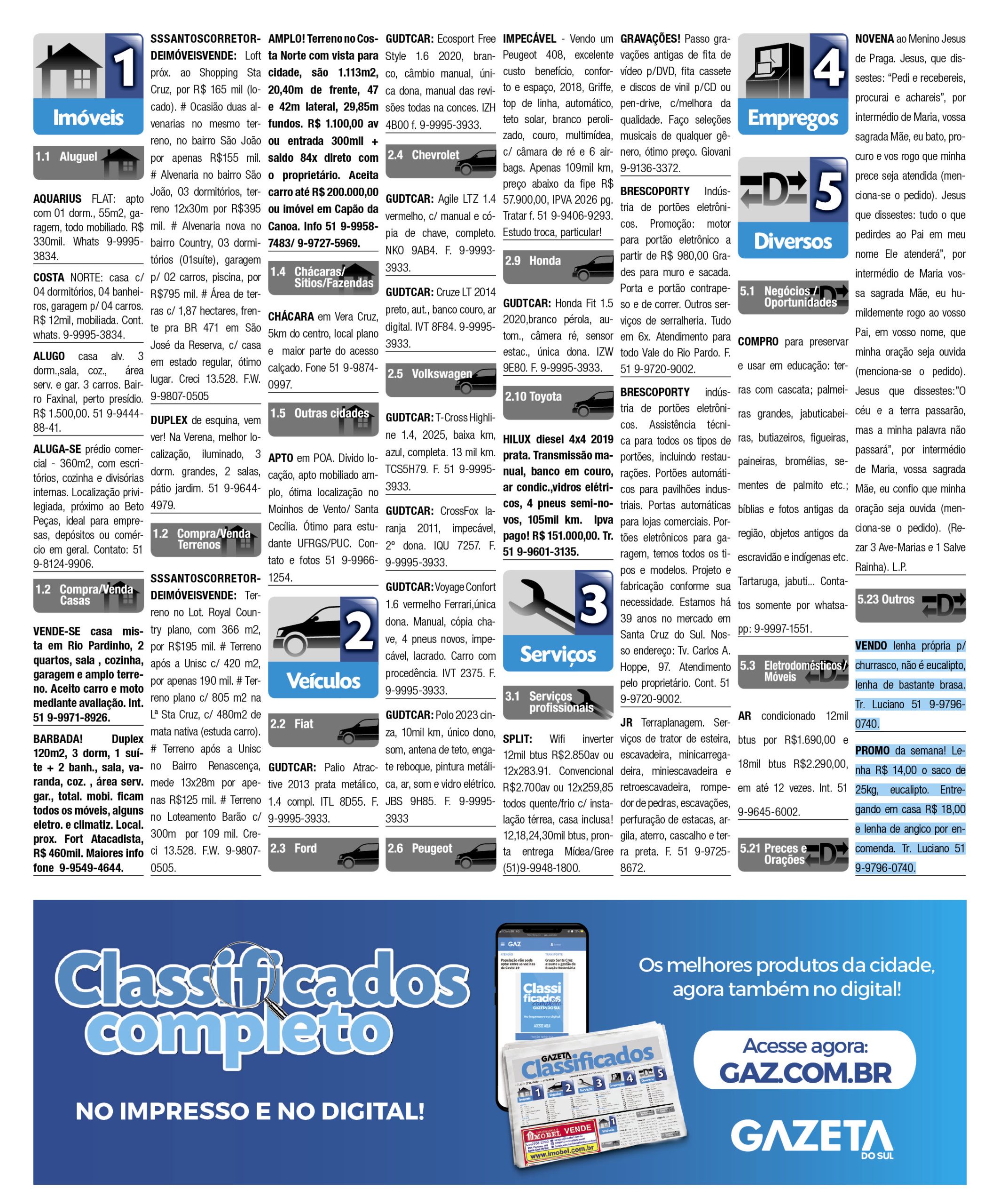 O suplemento de Classificados, que circula nas edições de terças, quintas e sábados, é um dos mais tradicionais da Gazeta do Sul, como vitrine e canal de negócios, de oferta, compra e venda em toda a região central do Rio Grande do Sul. E, para enriquecer pesquisas de produtos e serviços e possibilitar resultado ainda melhor a usuários e parceiros, nos anúncios de clientes cadastrados, o leitor tem acesso direto com link ao site do anunciante, onde poderá verificar mais detalhes sobre os itens. Confira as ofertas: