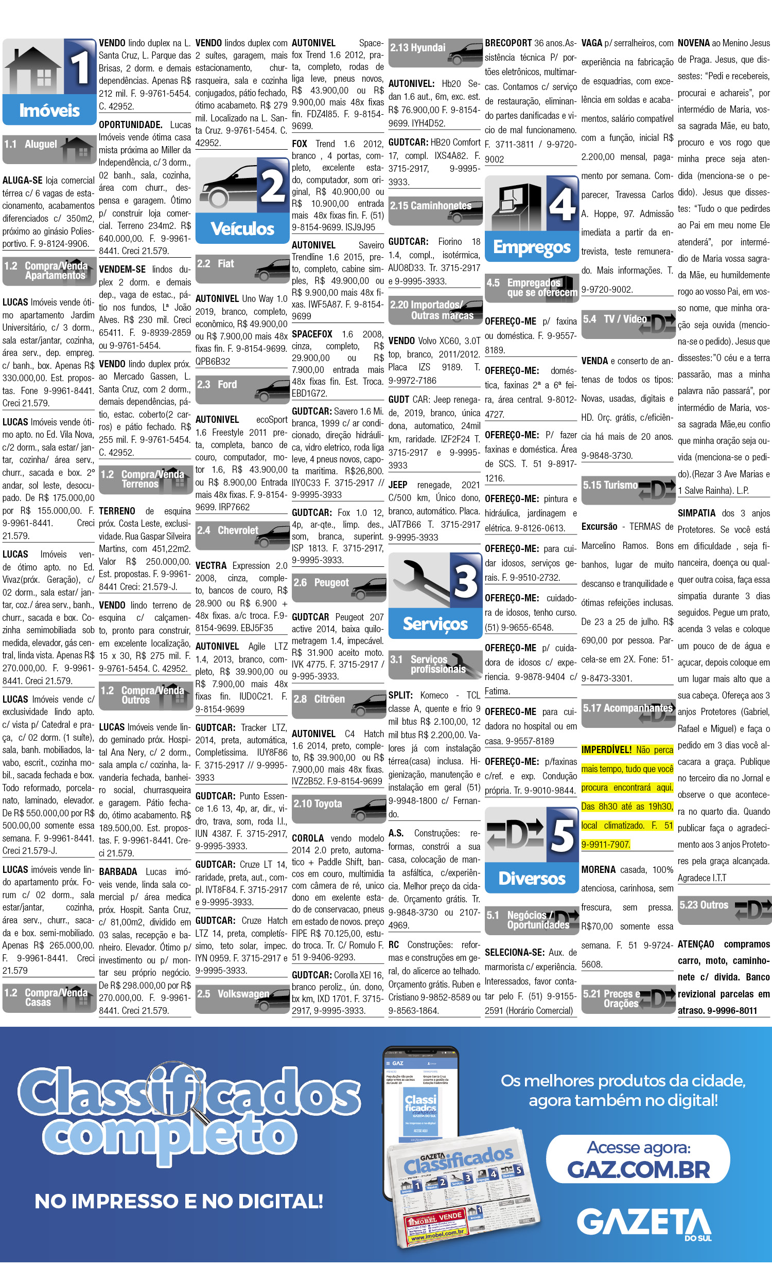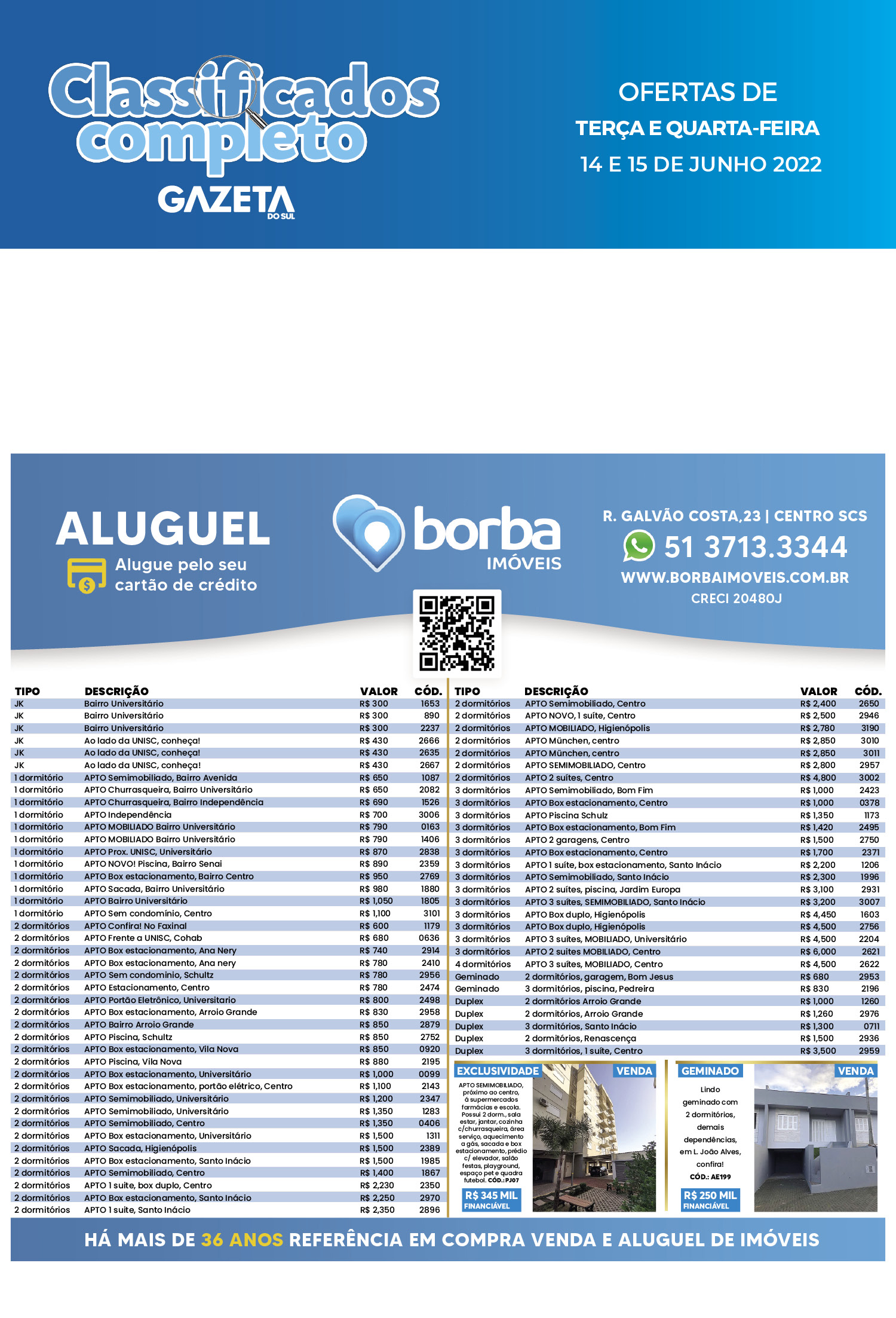 O suplemento de Classificados, que circula nas edições de terças, quintas e sábados, é um dos mais tradicionais da Gazeta do Sul, como vitrine e canal de negócios, de oferta, compra e venda em toda a região central do Rio Grande do Sul. E, para enriquecer pesquisas de produtos e serviços e possibilitar resultado ainda melhor a usuários e parceiros, nos anúncios de clientes cadastrados, o leitor tem acesso direto com link ao site do anunciante, onde poderá verificar mais detalhes sobre os itens. Confira as ofertas:
