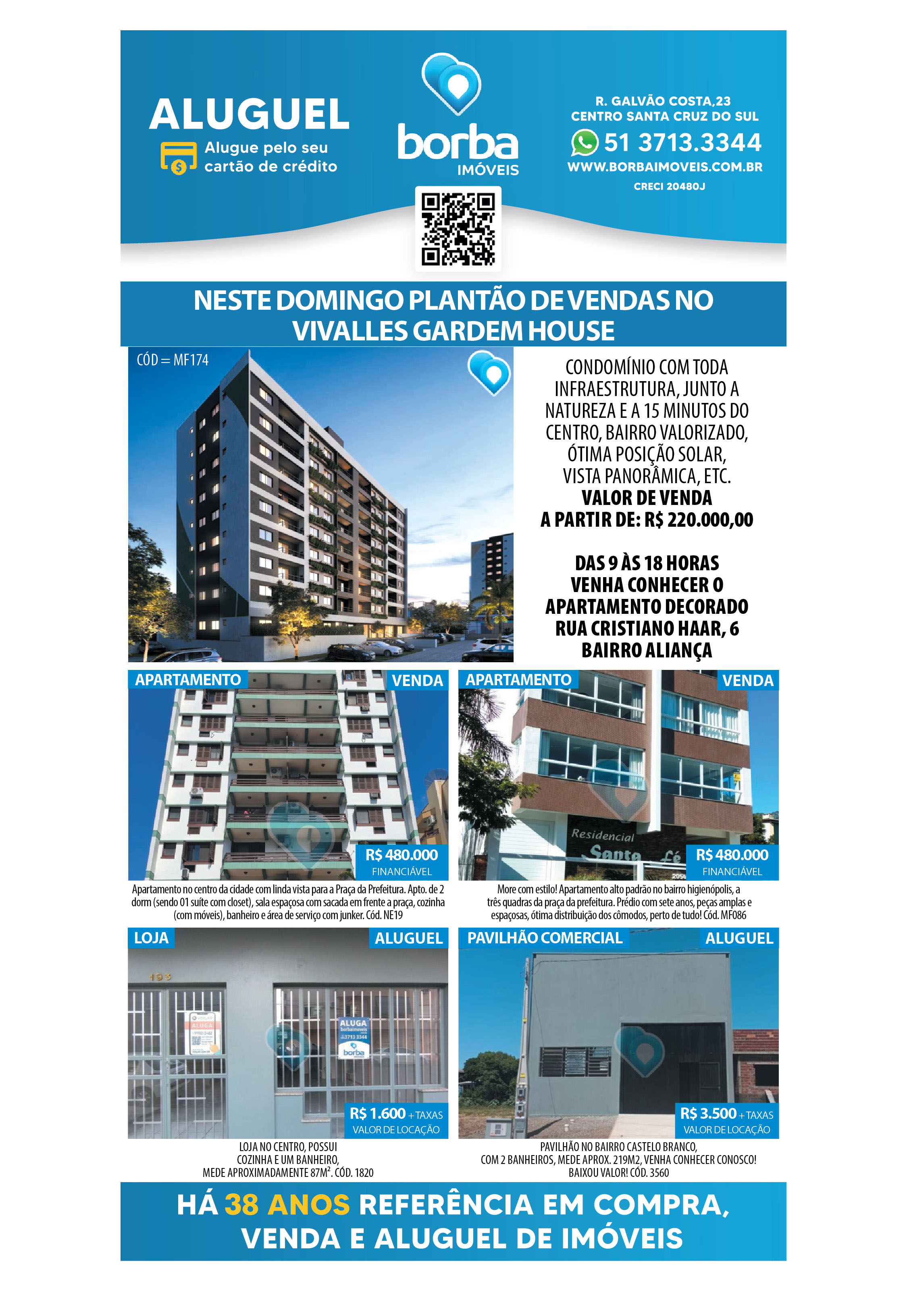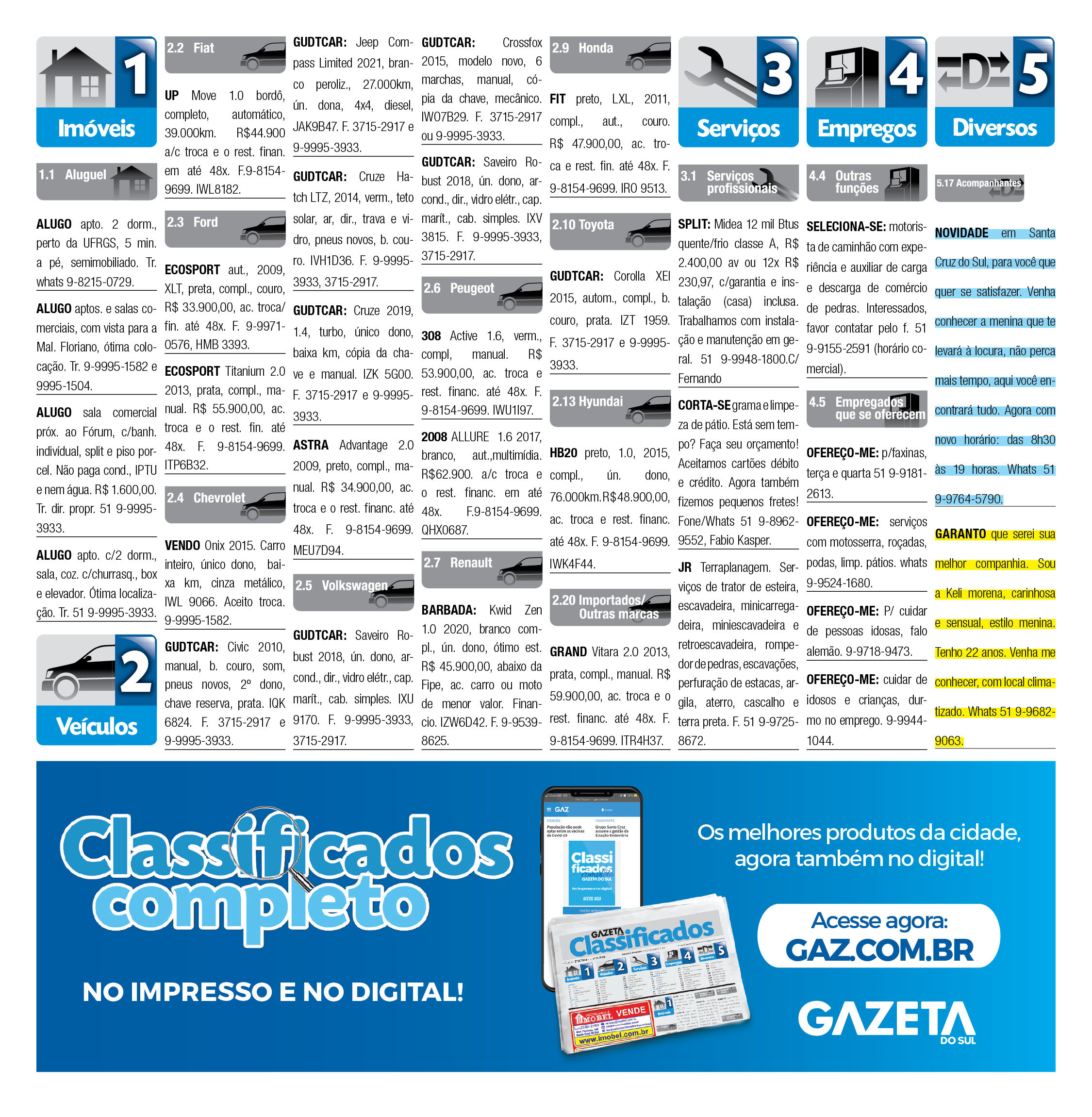 O suplemento de Classificados, que circula nas edições de terças, quintas e sábados, é um dos mais tradicionais da Gazeta do Sul, como vitrine e canal de negócios, de oferta, compra e venda em toda a região central do Rio Grande do Sul. E, para enriquecer pesquisas de produtos e serviços e possibilitar resultado ainda melhor a usuários e parceiros, nos anúncios de clientes cadastrados, o leitor tem acesso direto com link ao site do anunciante, onde poderá verificar mais detalhes sobre os itens. Confira as ofertas: