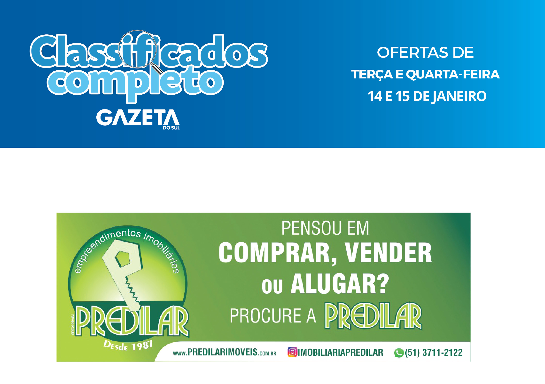 O suplemento de Classificados, que circula nas edições de terças, quintas e sábados, é um dos mais tradicionais da Gazeta do Sul, como vitrine e canal de negócios, de oferta, compra e venda em toda a região central do Rio Grande do Sul. E, para enriquecer pesquisas de produtos e serviços e possibilitar resultado ainda melhor a usuários e parceiros, nos anúncios de clientes cadastrados, o leitor tem acesso direto com link ao site do anunciante, onde poderá verificar mais detalhes sobre os itens. Confira as ofertas: