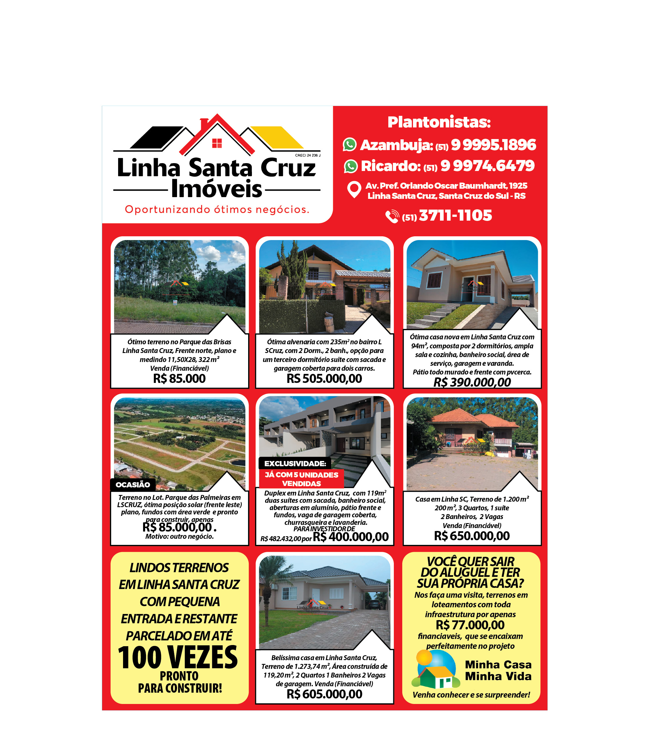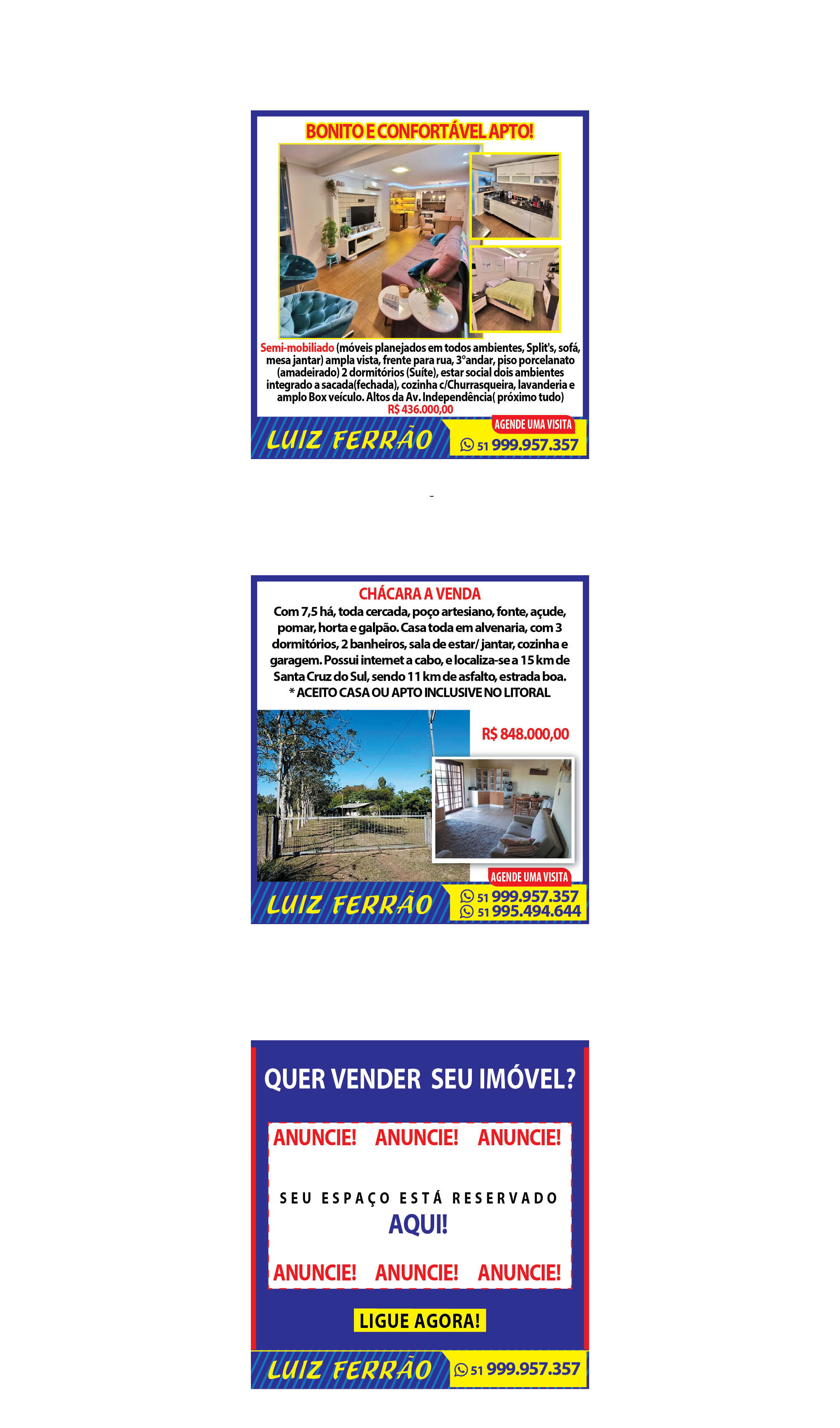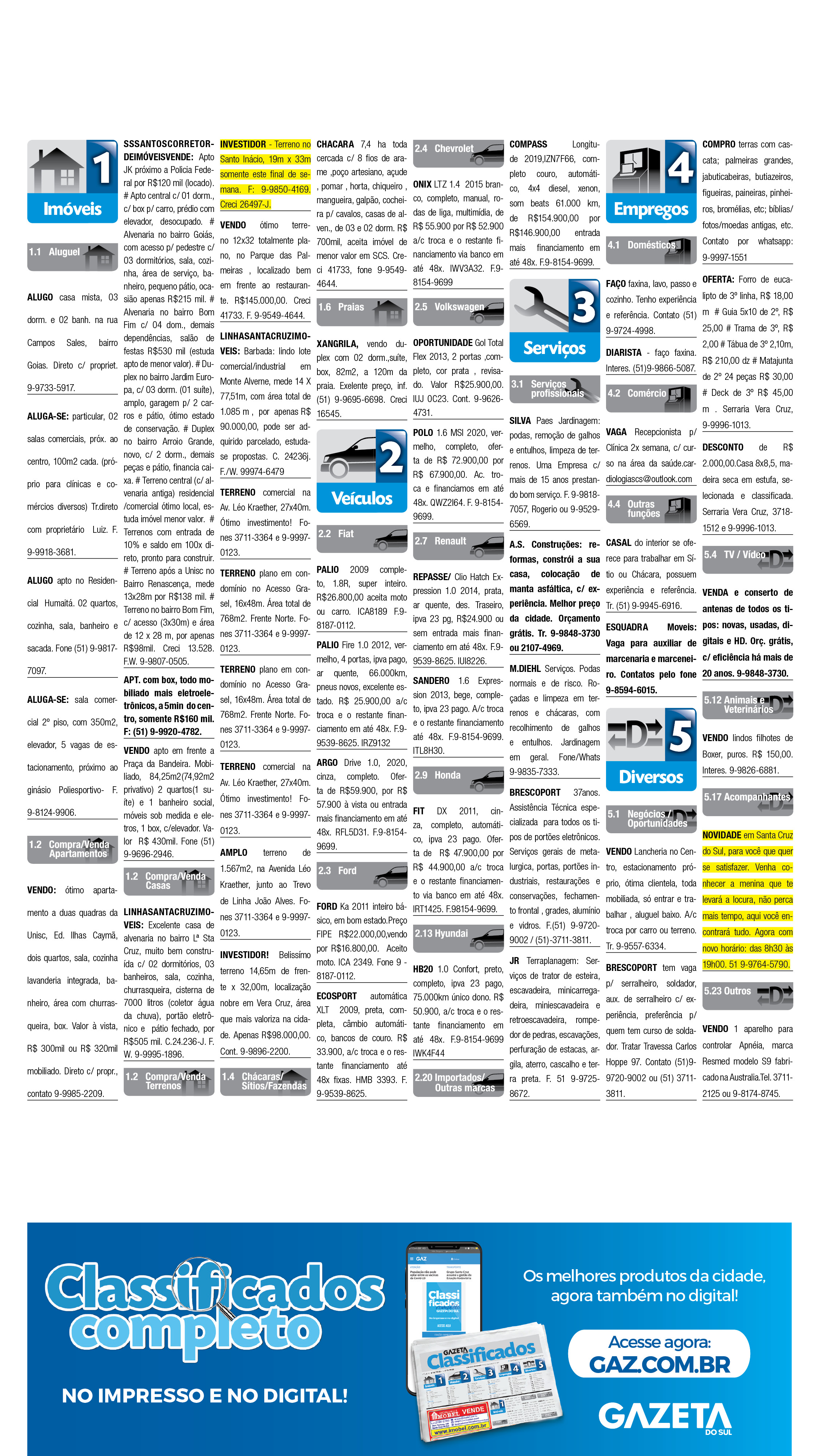 O suplemento de Classificados, que circula nas edições de terças, quintas e sábados, é um dos mais tradicionais da Gazeta do Sul, como vitrine e canal de negócios, de oferta, compra e venda em toda a região central do Rio Grande do Sul. E, para enriquecer pesquisas de produtos e serviços e possibilitar resultado ainda melhor a usuários e parceiros, nos anúncios de clientes cadastrados, o leitor tem acesso direto com link ao site do anunciante, onde poderá verificar mais detalhes sobre os itens. Confira as ofertas: