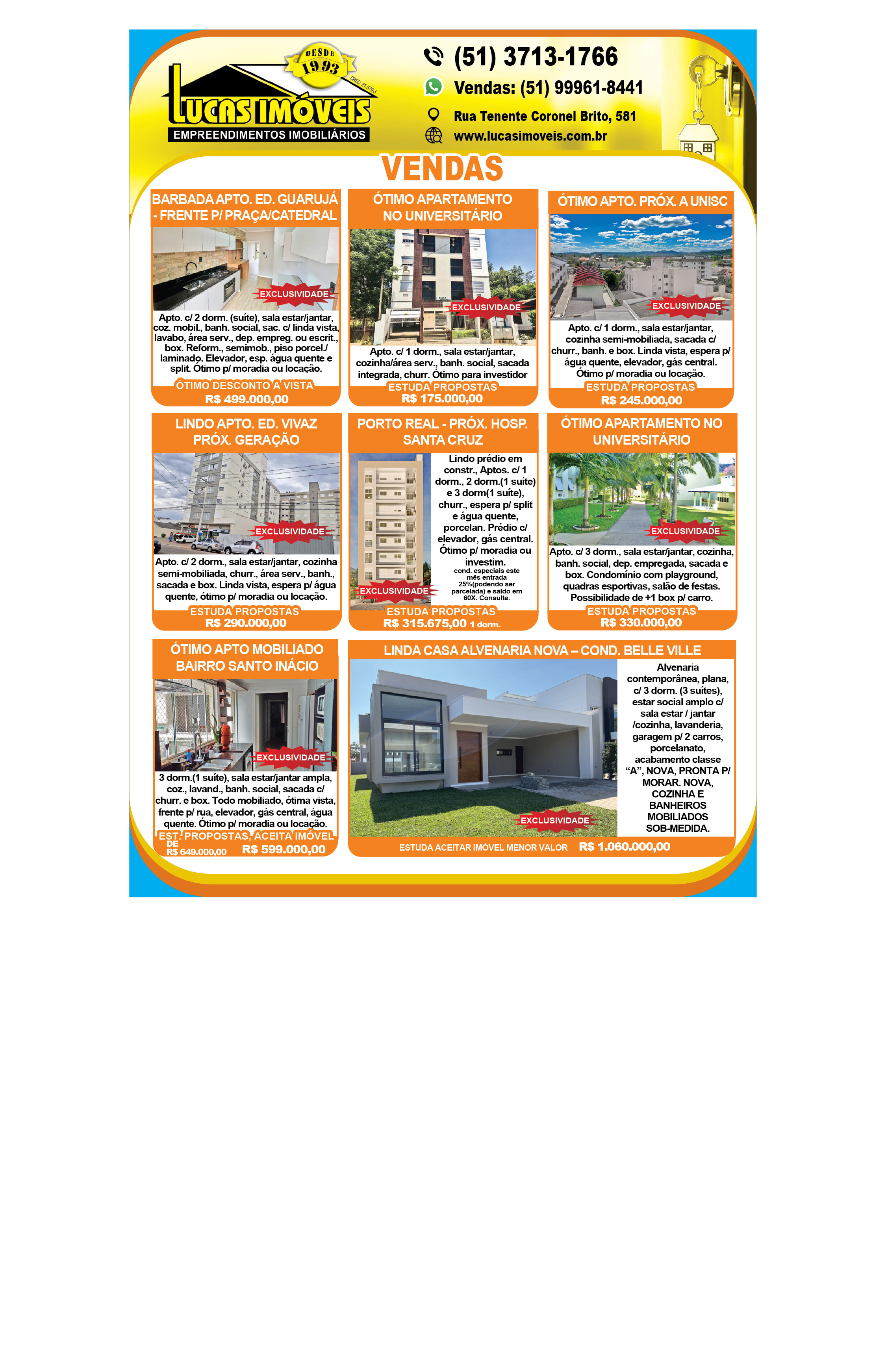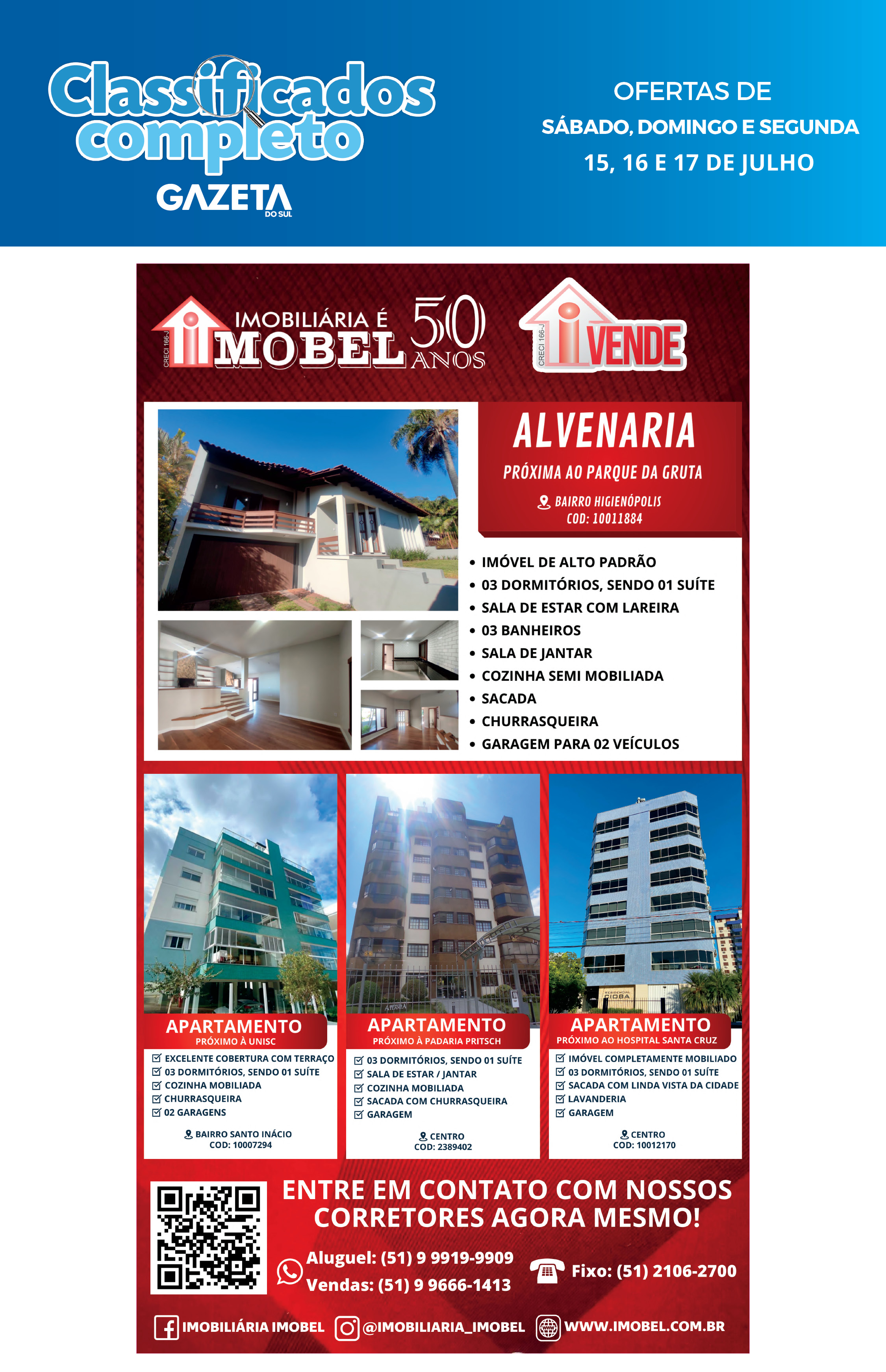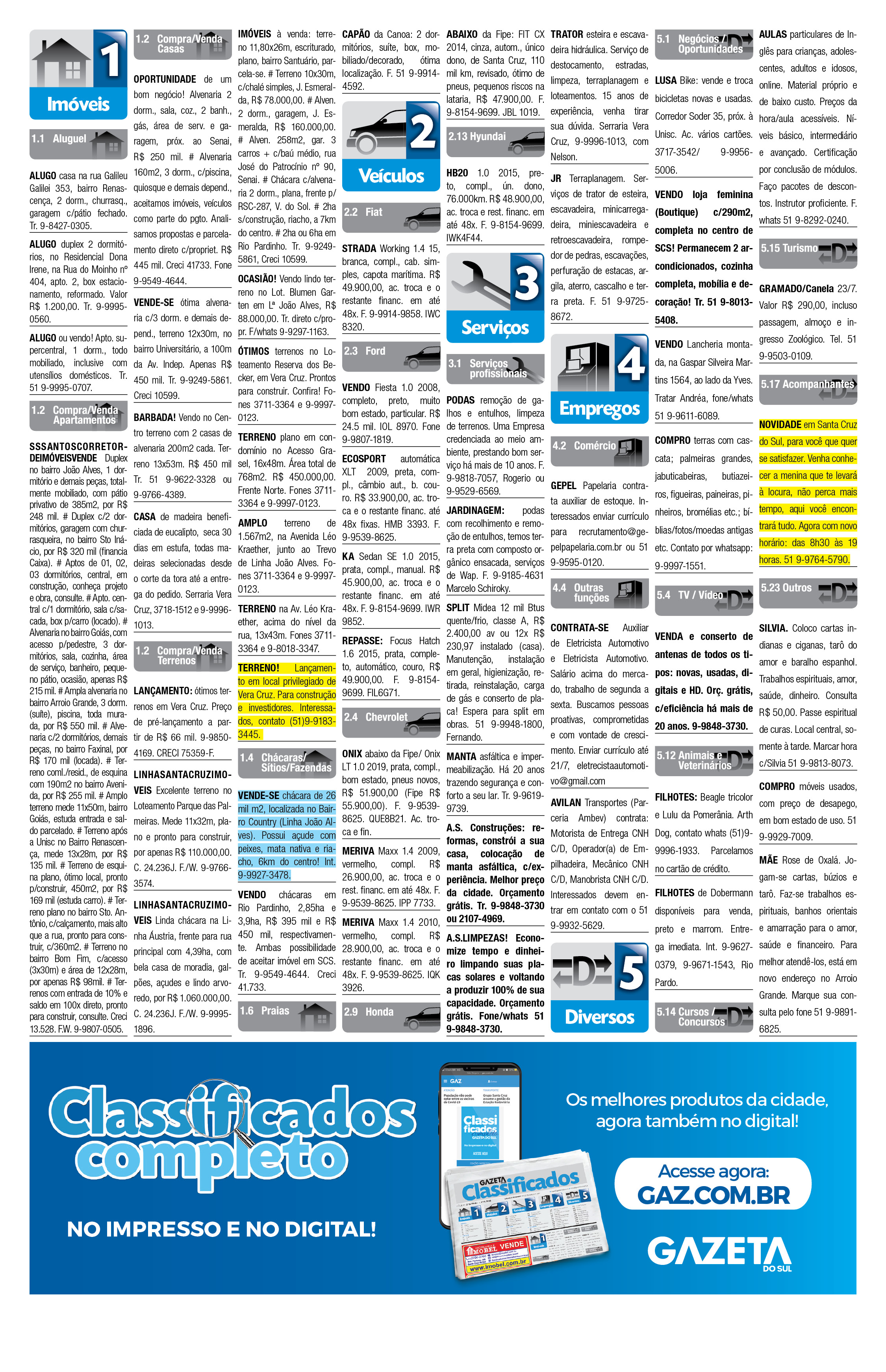 O suplemento de Classificados, que circula nas edições de terças, quintas e sábados, é um dos mais tradicionais da Gazeta do Sul, como vitrine e canal de negócios, de oferta, compra e venda em toda a região central do Rio Grande do Sul. E, para enriquecer pesquisas de produtos e serviços e possibilitar resultado ainda melhor a usuários e parceiros, nos anúncios de clientes cadastrados, o leitor tem acesso direto com link ao site do anunciante, onde poderá verificar mais detalhes sobre os itens. Confira as ofertas: