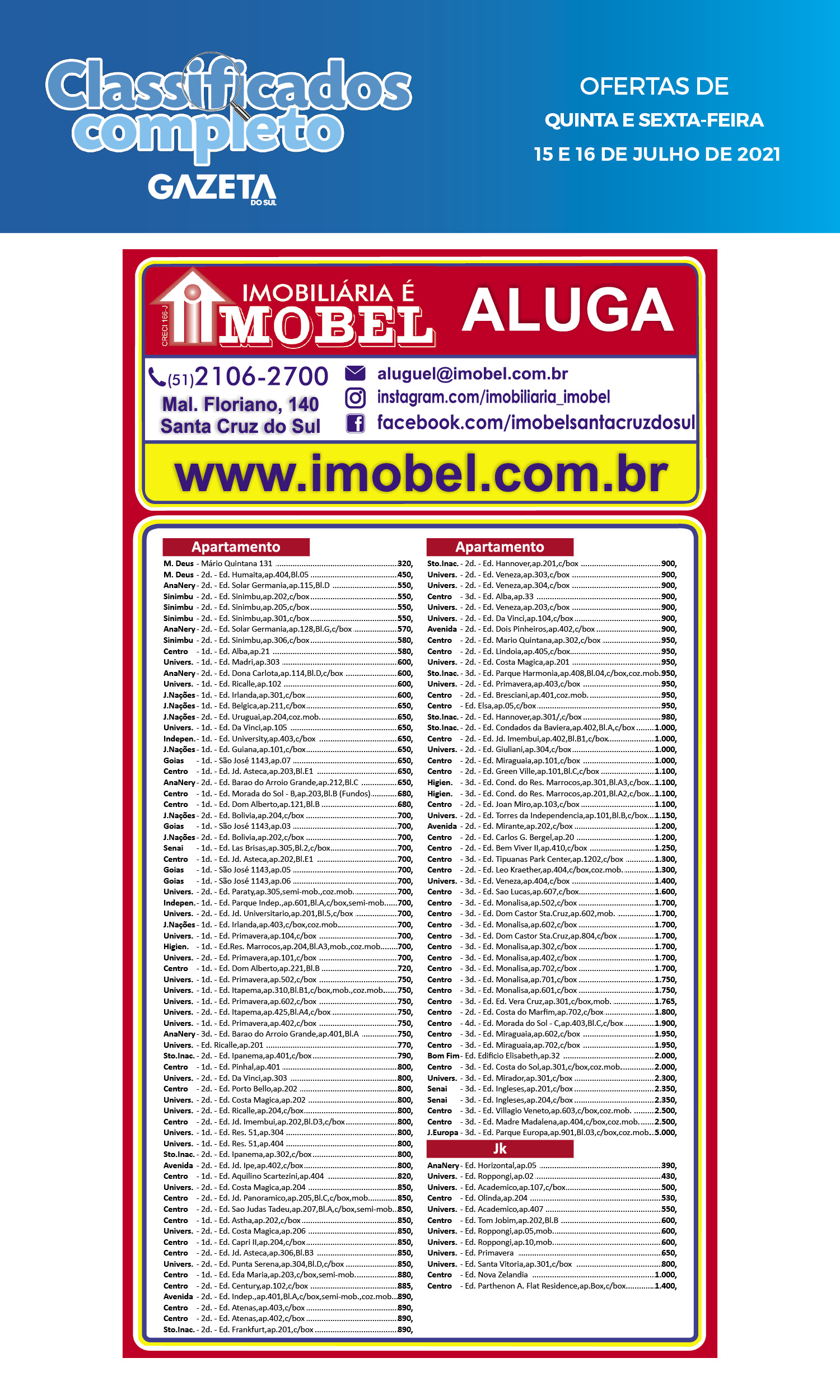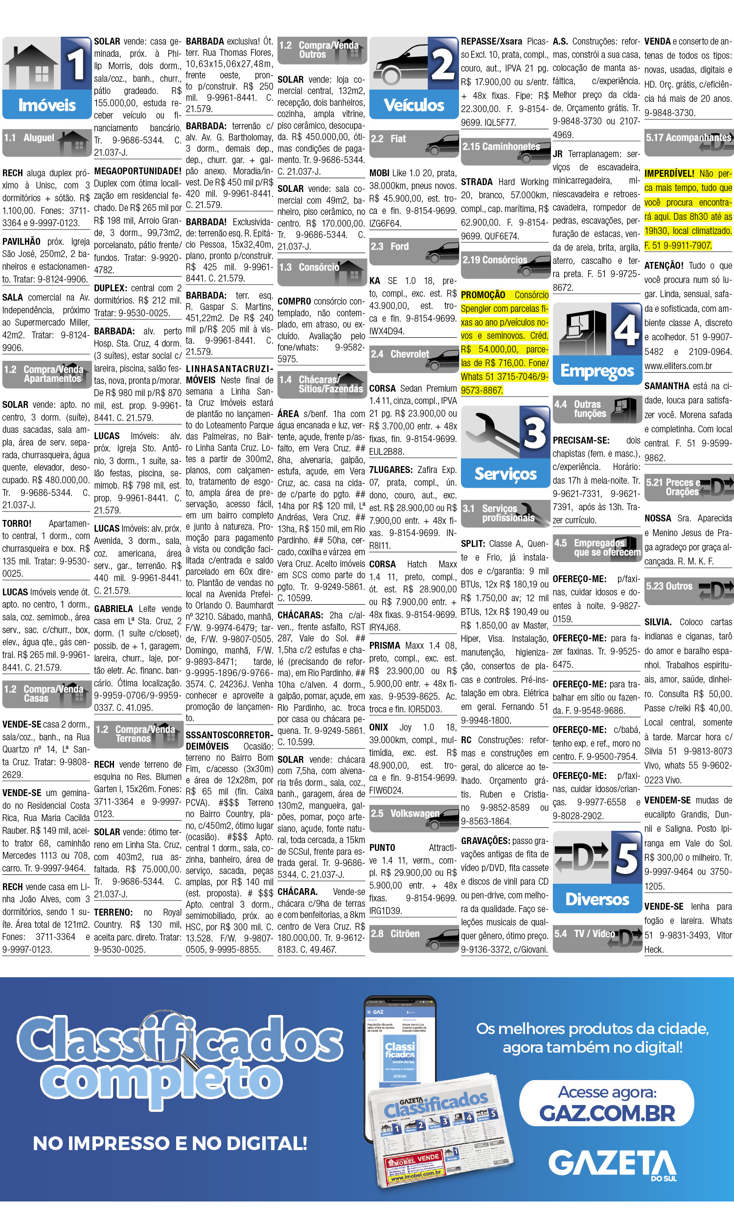 O suplemento de Classificados, que circula nas edições de terças, quintas e sábados, é um dos mais tradicionais da Gazeta do Sul, como vitrine e canal de negócios, de oferta, compra e venda em toda a região central do Rio Grande do Sul. E, para enriquecer pesquisas de produtos e serviços e possibilitar resultado ainda melhor a usuários e parceiros, nos anúncios de clientes cadastrados, o leitor tem acesso direto com link ao site do anunciante, onde poderá verificar mais detalhes sobre os itens. Confira: