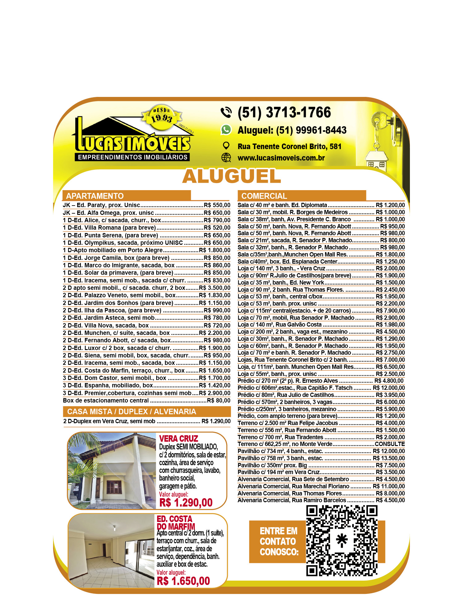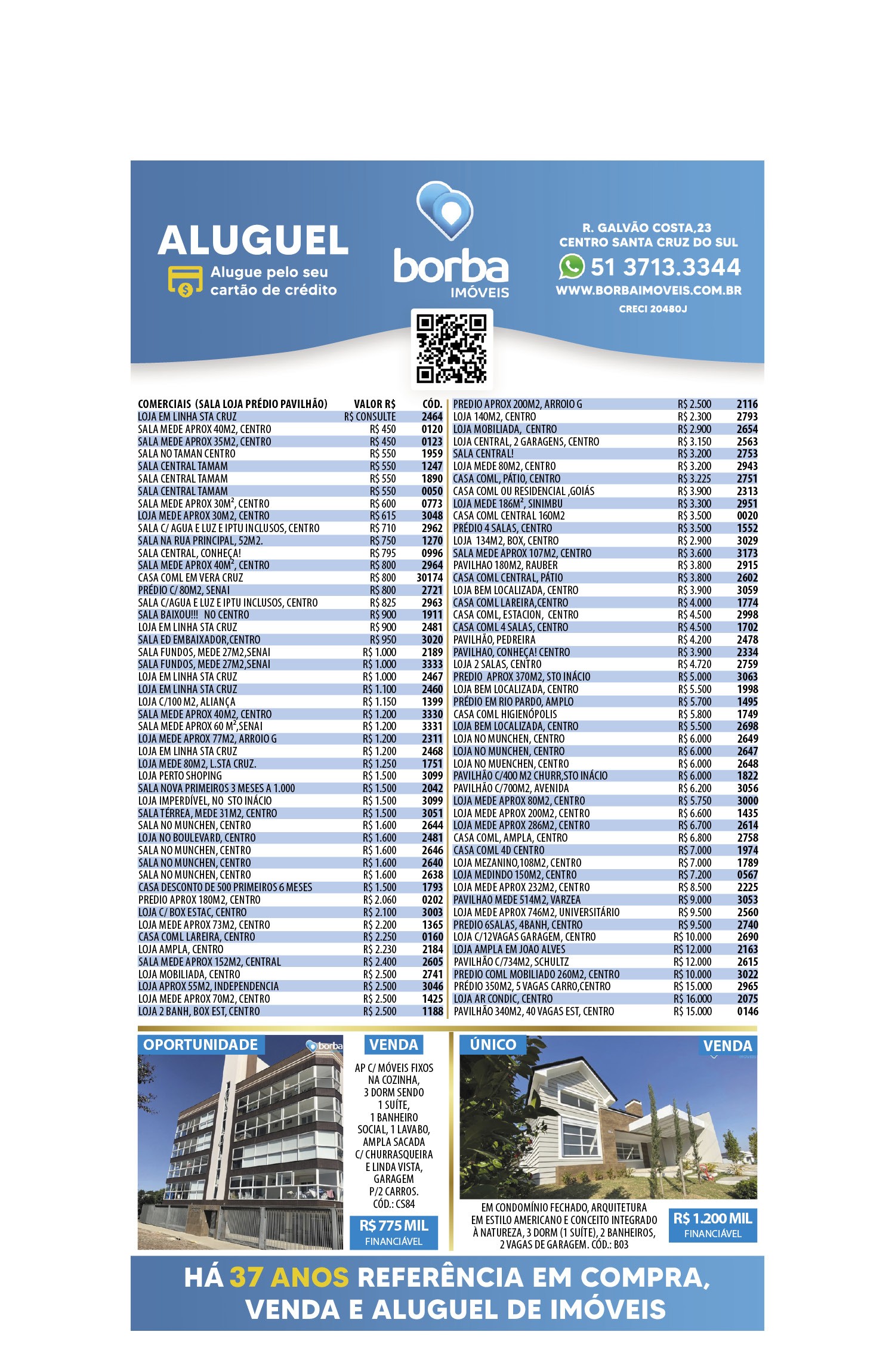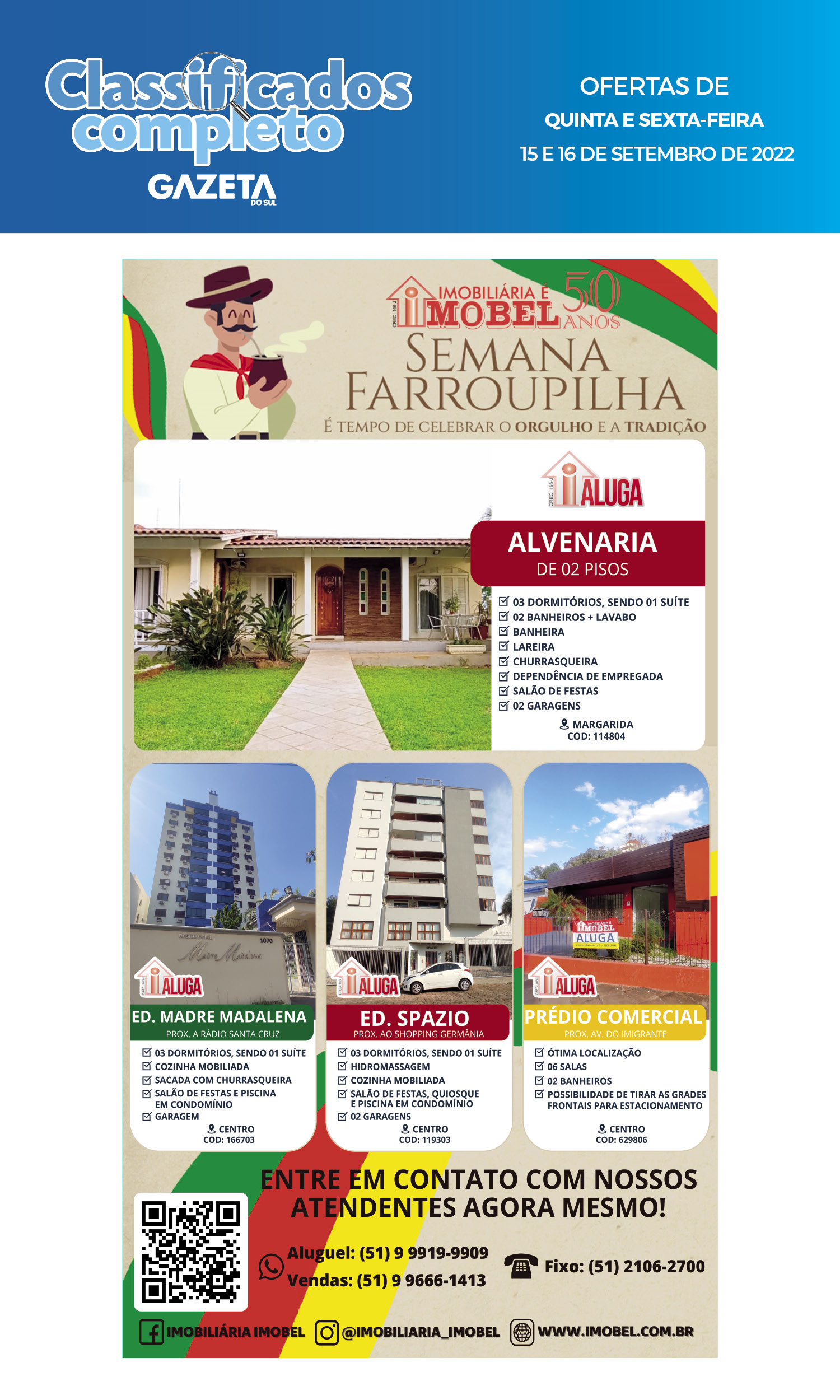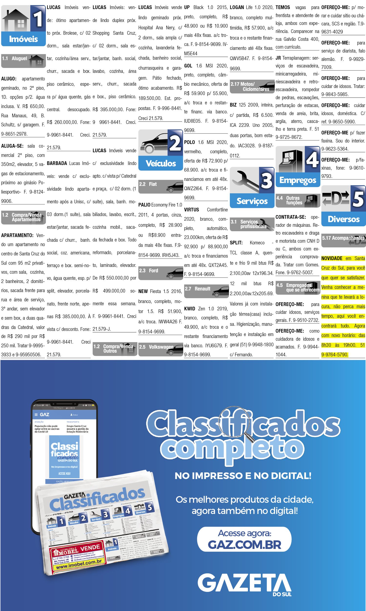 O suplemento de Classificados, que circula nas edições de terças, quintas e sábados, é um dos mais tradicionais da Gazeta do Sul, como vitrine e canal de negócios, de oferta, compra e venda em toda a região central do Rio Grande do Sul. E, para enriquecer pesquisas de produtos e serviços e possibilitar resultado ainda melhor a usuários e parceiros, nos anúncios de clientes cadastrados, o leitor tem acesso direto com link ao site do anunciante, onde poderá verificar mais detalhes sobre os itens. Confira as ofertas:
