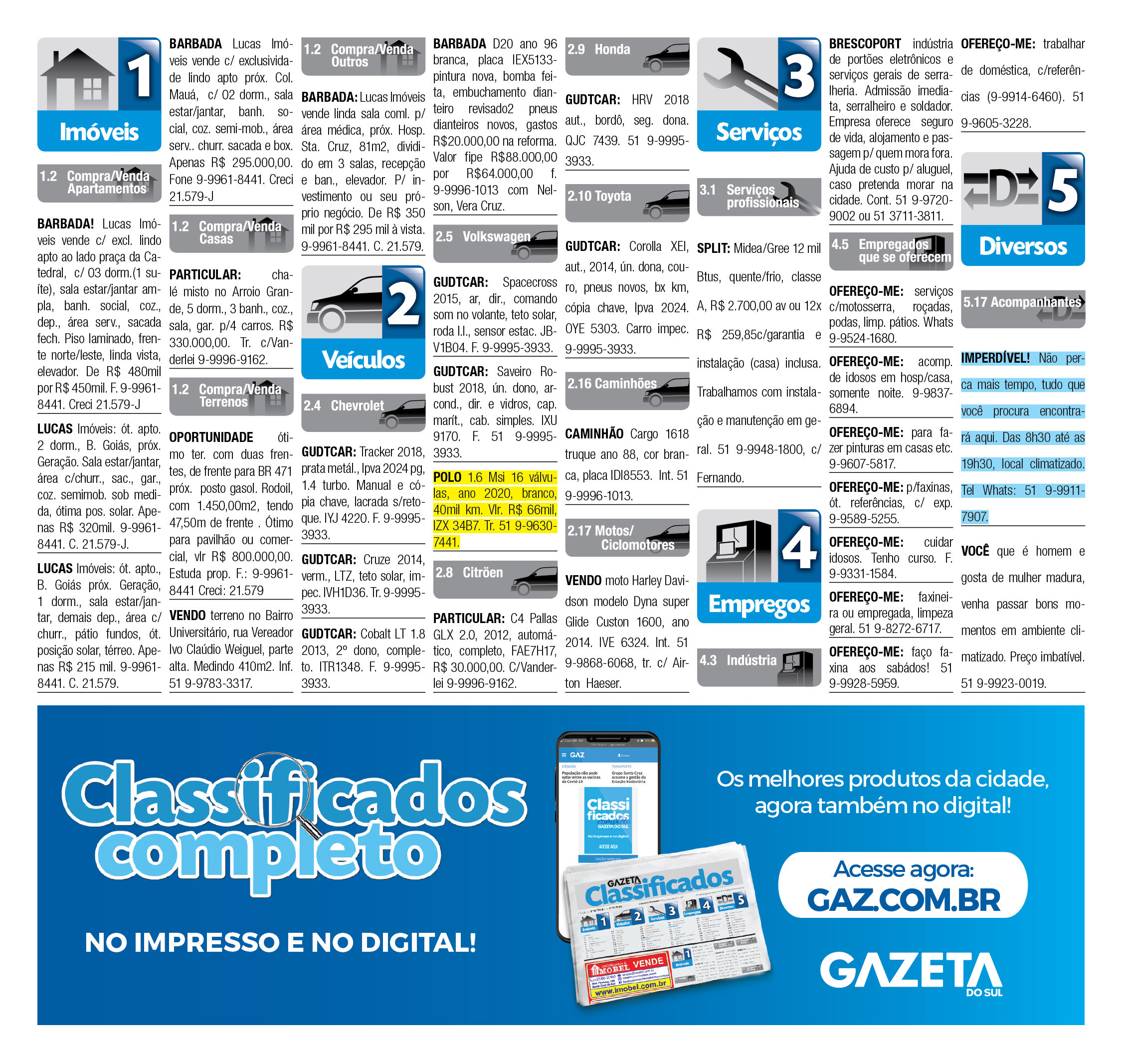 O suplemento de Classificados, que circula nas edições de terças, quintas e sábados, é um dos mais tradicionais da Gazeta do Sul, como vitrine e canal de negócios, de oferta, compra e venda em toda a região central do Rio Grande do Sul. E, para enriquecer pesquisas de produtos e serviços e possibilitar resultado ainda melhor a usuários e parceiros, nos anúncios de clientes cadastrados, o leitor tem acesso direto com link ao site do anunciante, onde poderá verificar mais detalhes sobre os itens. Confira as ofertas: