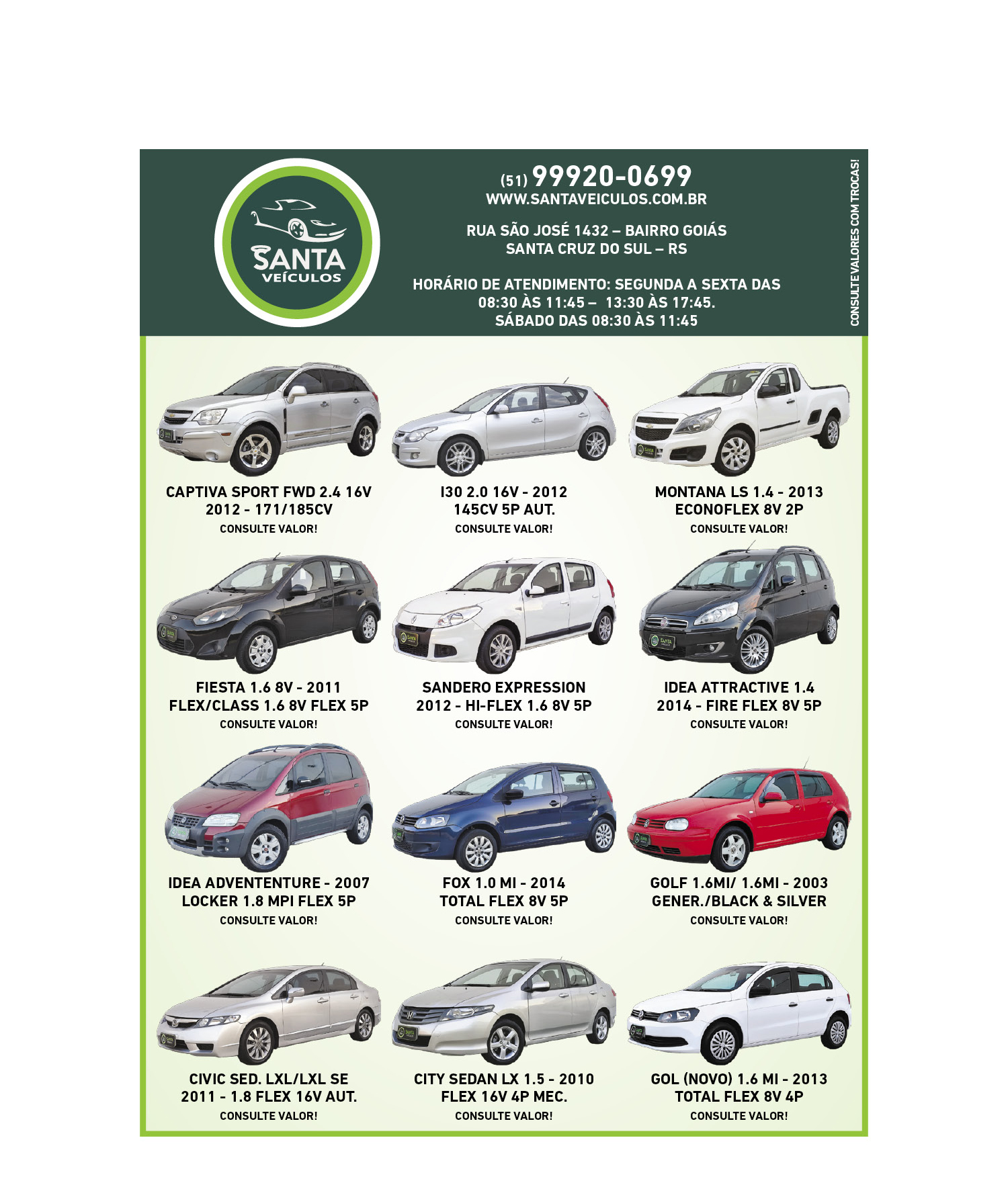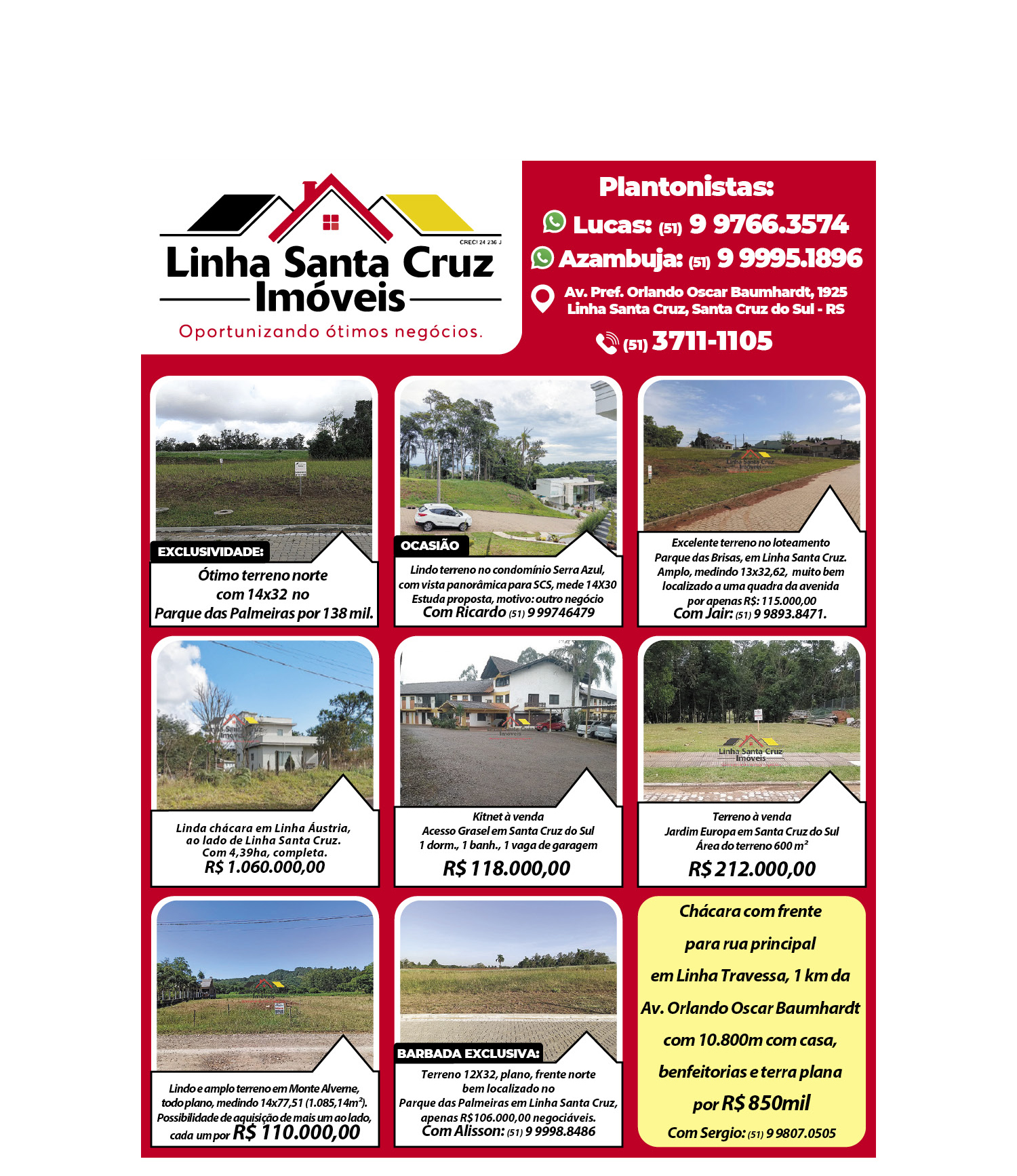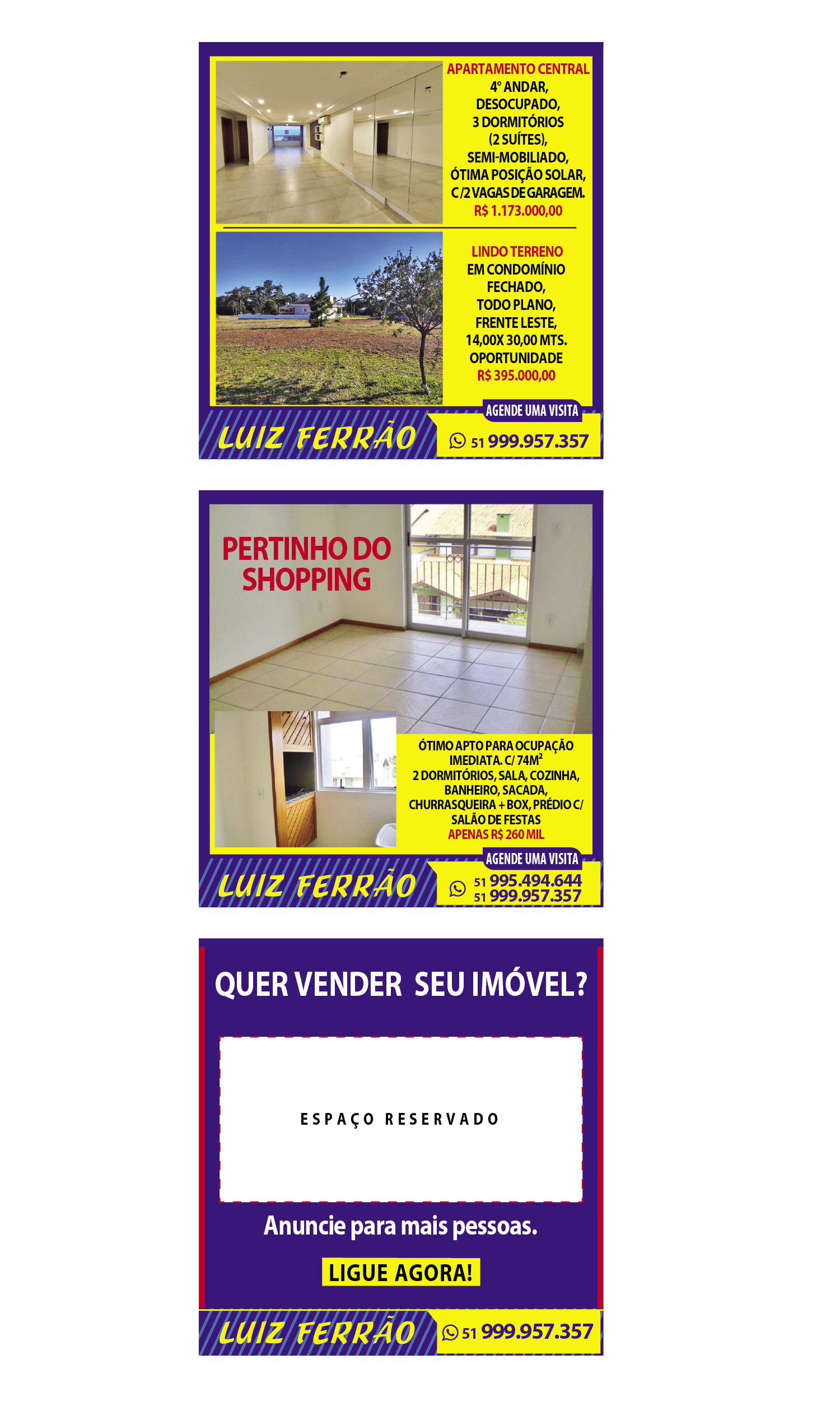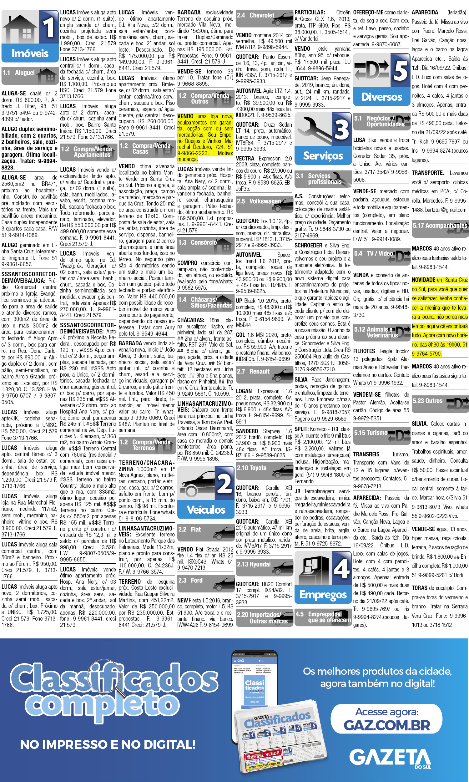 O suplemento de Classificados, que circula nas edições de terças, quintas e sábados, é um dos mais tradicionais da Gazeta do Sul, como vitrine e canal de negócios, de oferta, compra e venda em toda a região central do Rio Grande do Sul. E, para enriquecer pesquisas de produtos e serviços e possibilitar resultado ainda melhor a usuários e parceiros, nos anúncios de clientes cadastrados, o leitor tem acesso direto com link ao site do anunciante, onde poderá verificar mais detalhes sobre os itens. Confira as ofertas: