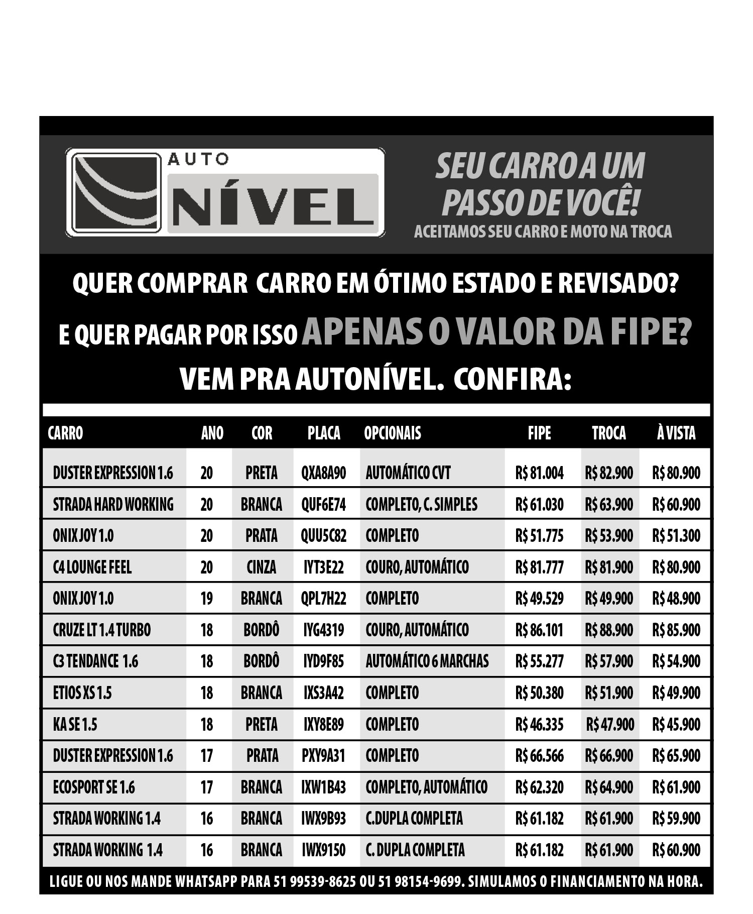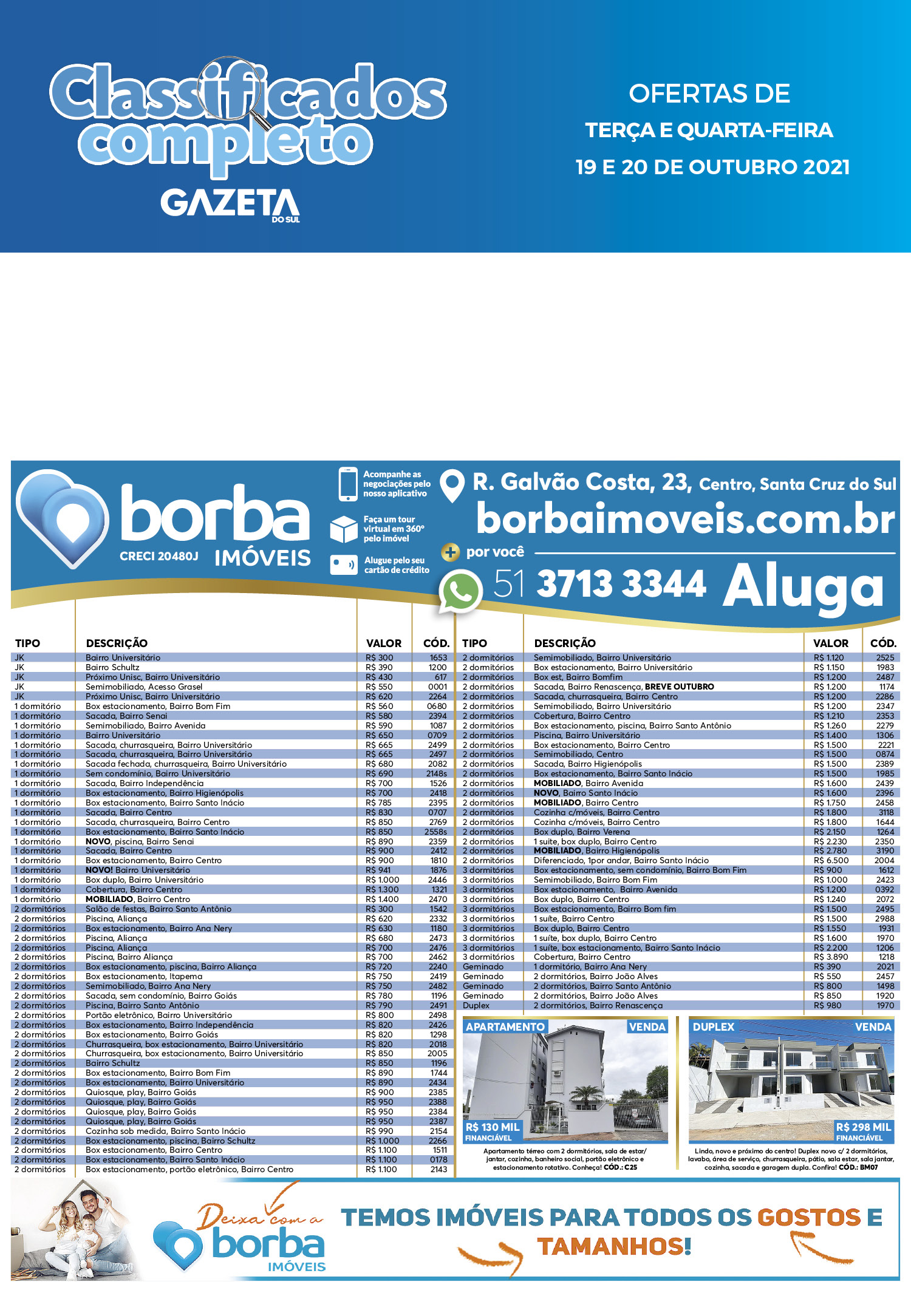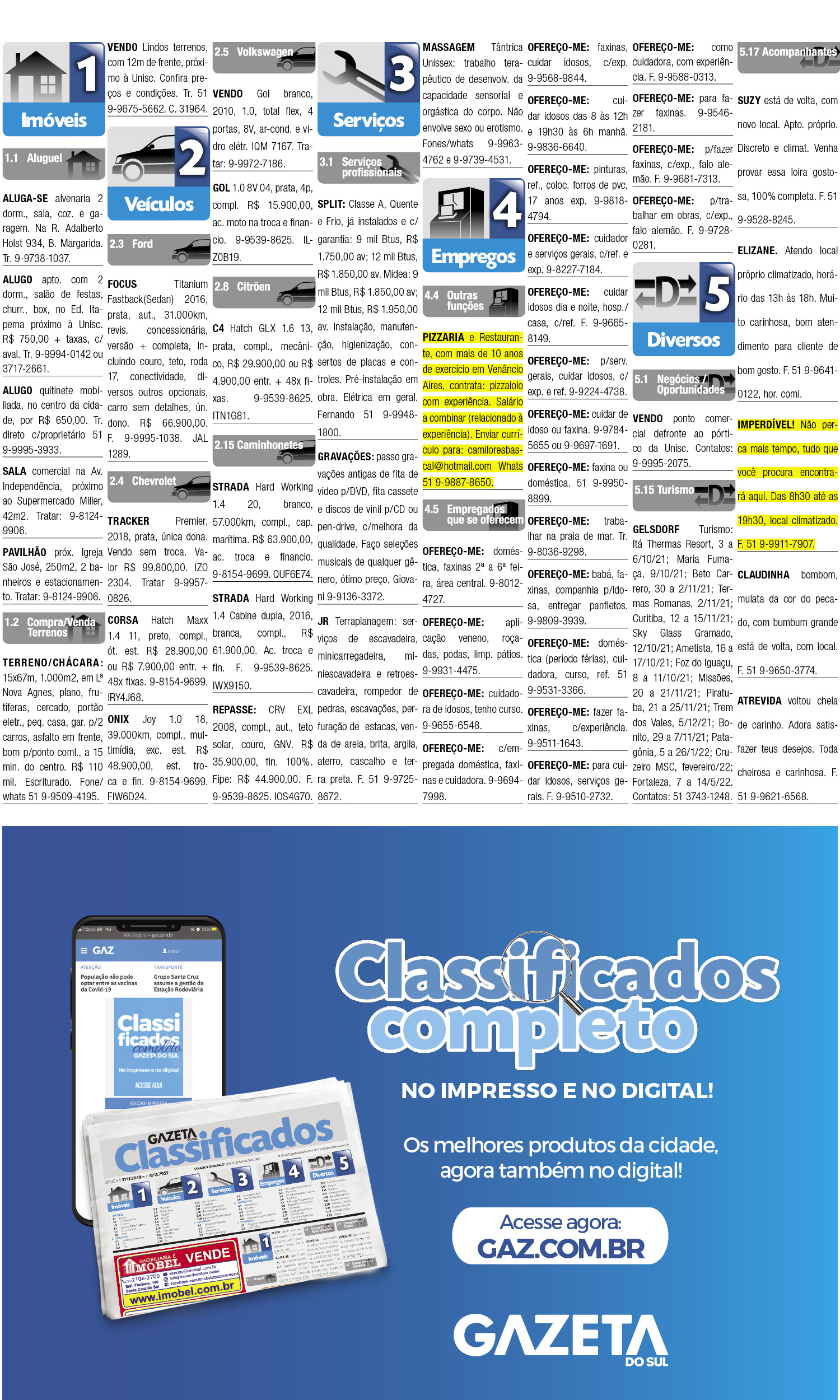 O suplemento de Classificados, que circula nas edições de terças, quintas e sábados, é um dos mais tradicionais da Gazeta do Sul, como vitrine e canal de negócios, de oferta, compra e venda em toda a região central do Rio Grande do Sul. E, para enriquecer pesquisas de produtos e serviços e possibilitar resultado ainda melhor a usuários e parceiros, nos anúncios de clientes cadastrados, o leitor tem acesso direto com link ao site do anunciante, onde poderá verificar mais detalhes sobre os itens. Confira as ofertas: