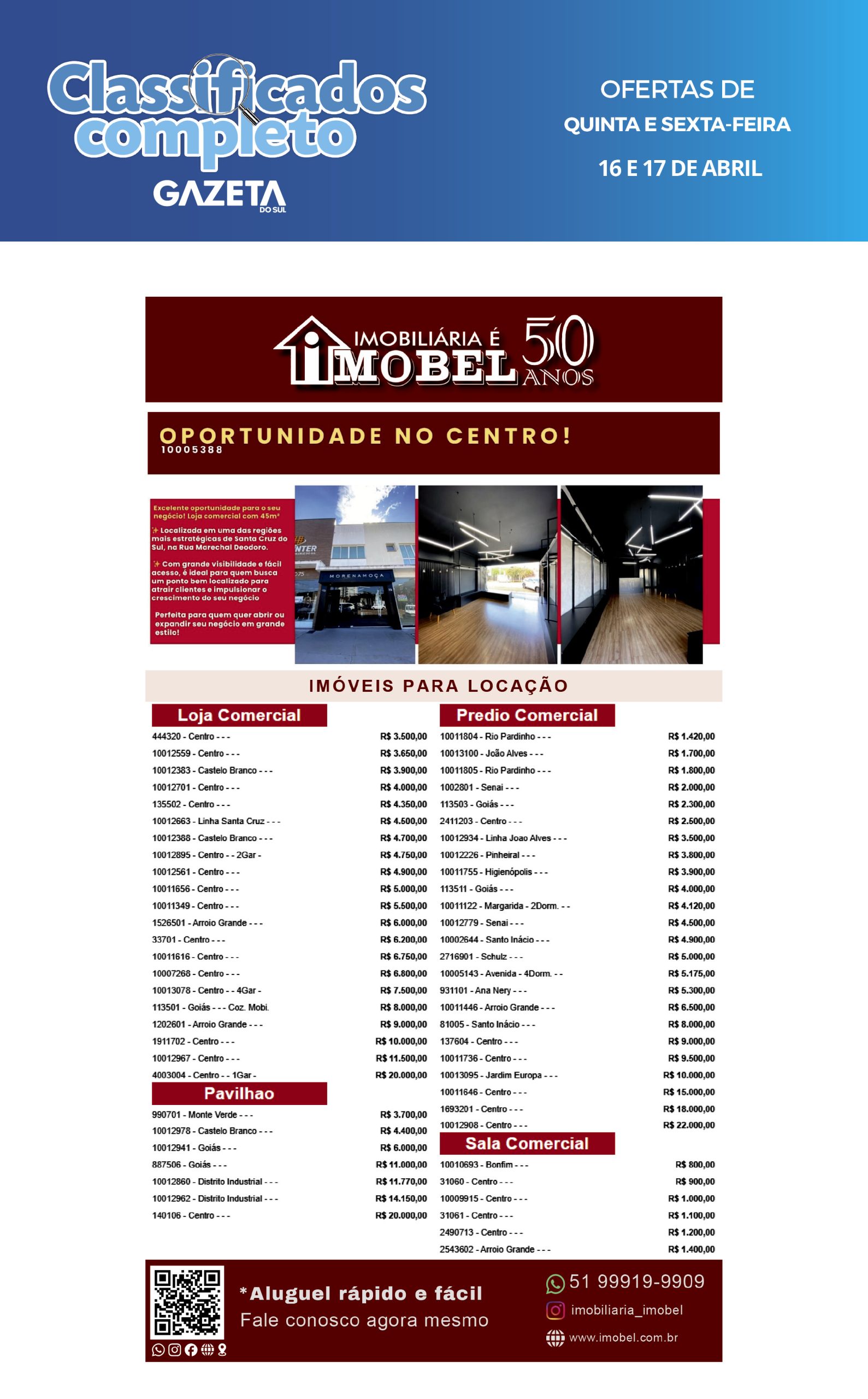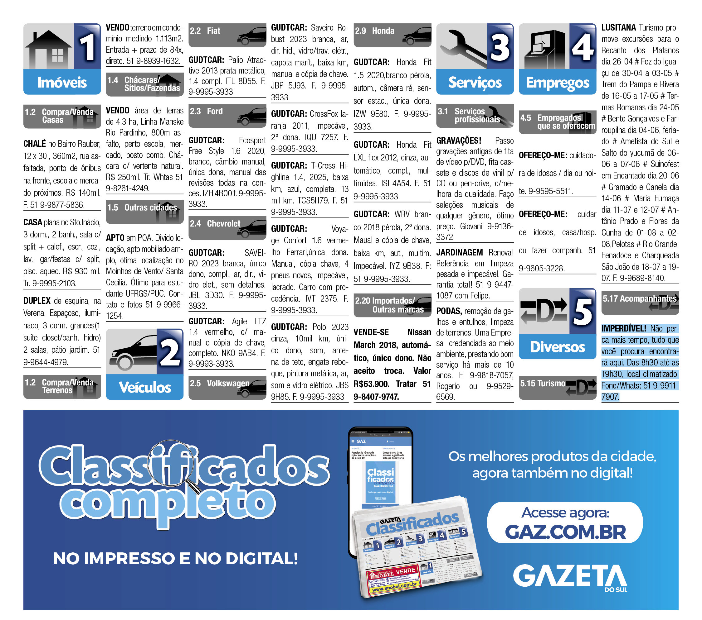 O suplemento de Classificados, que circula nas edições de terças, quintas e sábados, é um dos mais tradicionais da Gazeta do Sul, como vitrine e canal de negócios, de oferta, compra e venda em toda a região central do Rio Grande do Sul. E, para enriquecer pesquisas de produtos e serviços e possibilitar resultado ainda melhor a usuários e parceiros, nos anúncios de clientes cadastrados, o leitor tem acesso direto com link ao site do anunciante, onde poderá verificar mais detalhes sobre os itens. Confira as ofertas: