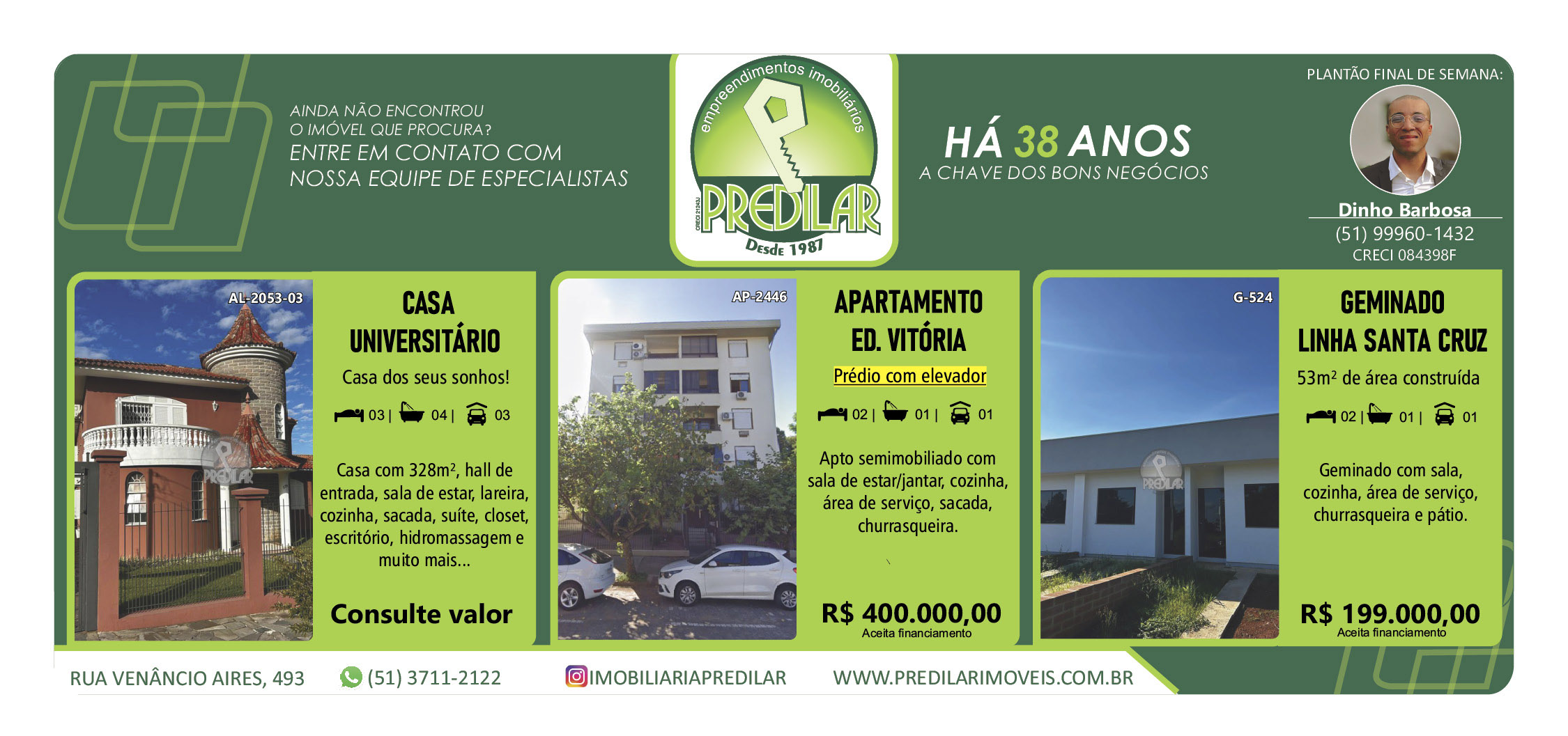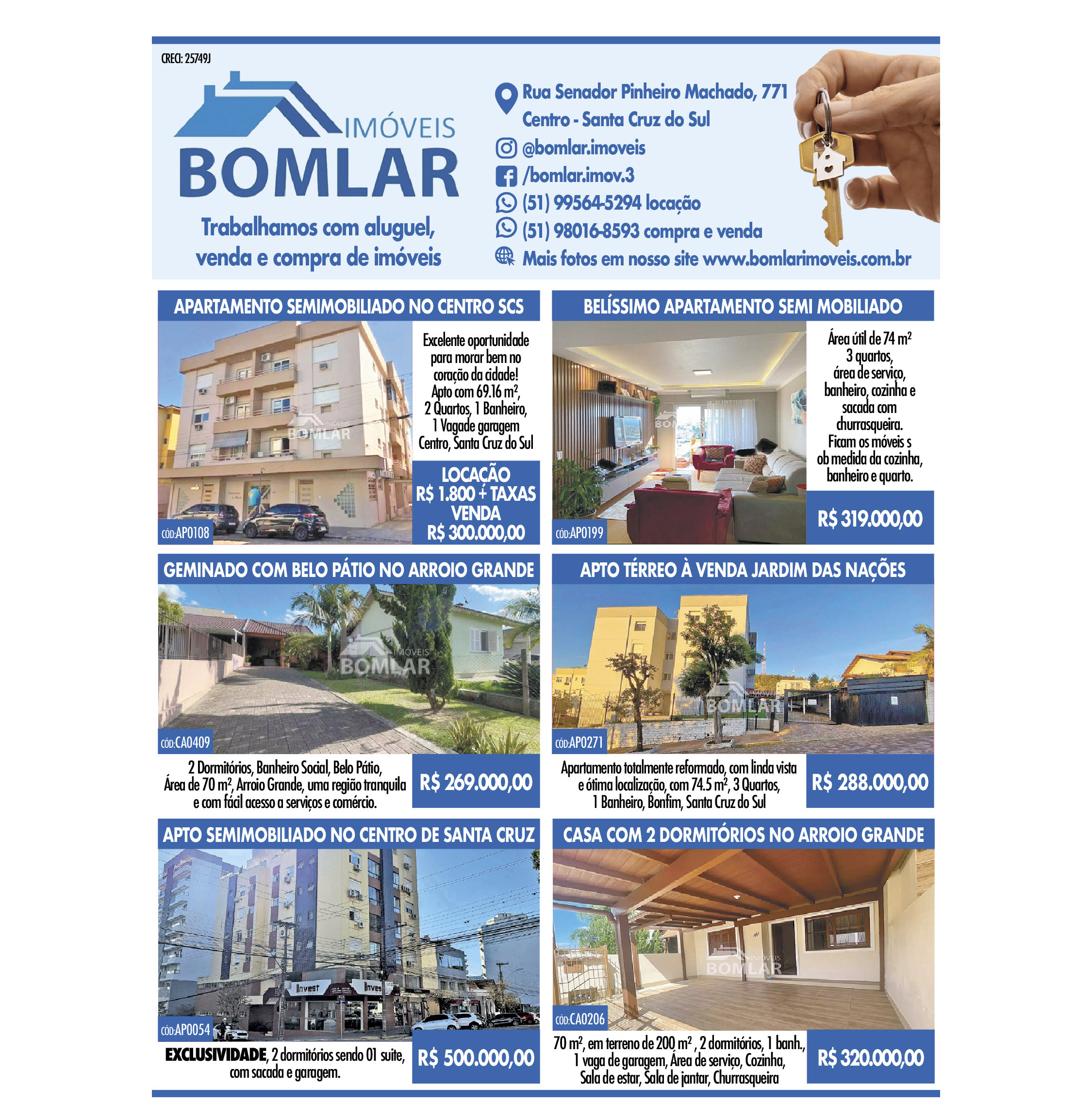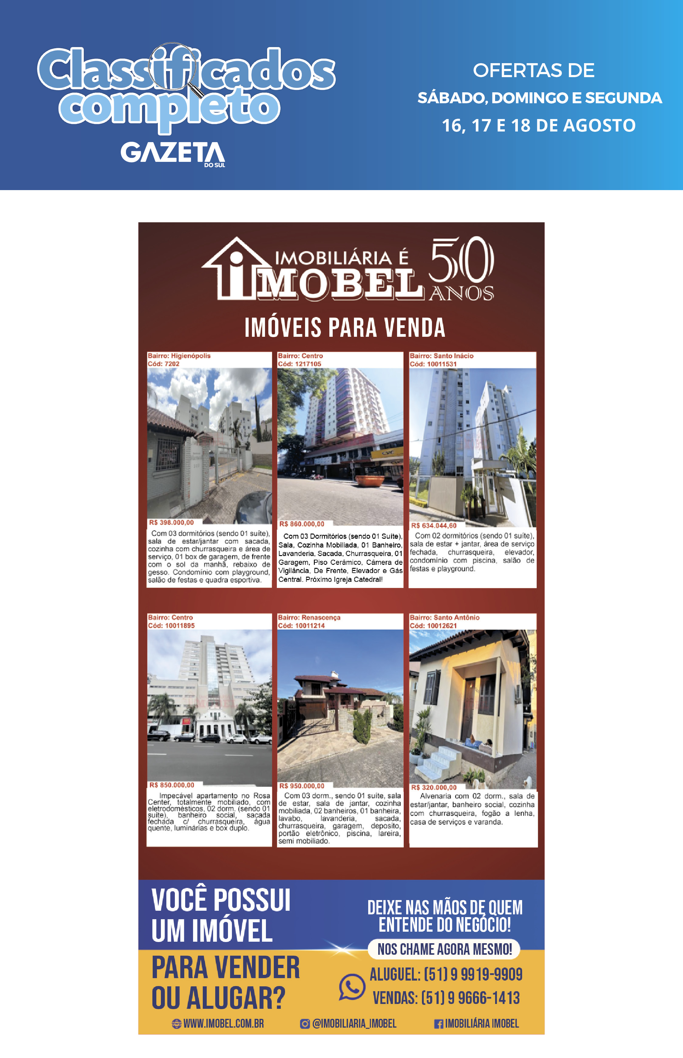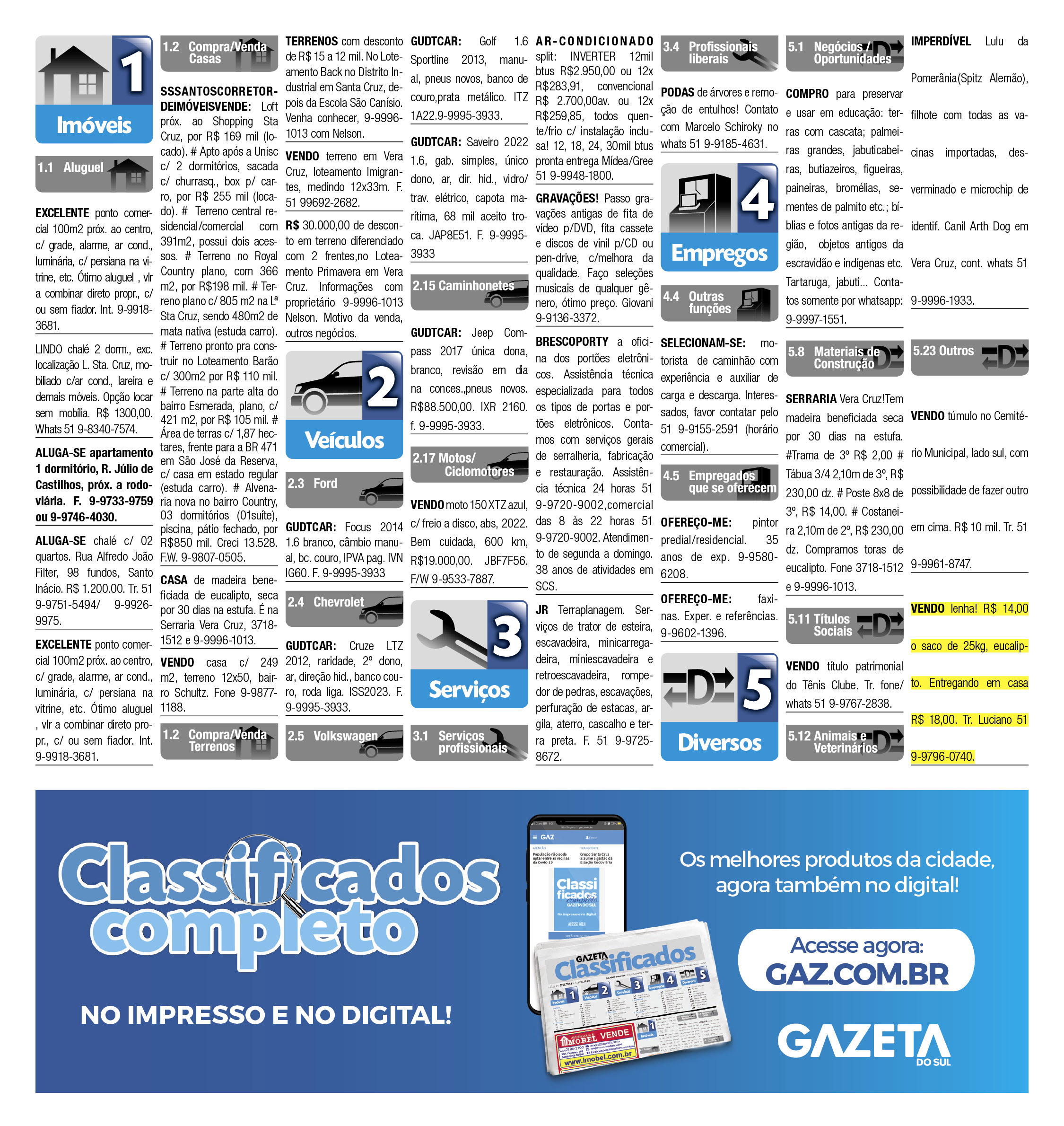 O suplemento de Classificados, que circula nas edições de terças, quintas e sábados, é um dos mais tradicionais da Gazeta do Sul, como vitrine e canal de negócios, de oferta, compra e venda em toda a região central do Rio Grande do Sul. E, para enriquecer pesquisas de produtos e serviços e possibilitar resultado ainda melhor a usuários e parceiros, nos anúncios de clientes cadastrados, o leitor tem acesso direto com link ao site do anunciante, onde poderá verificar mais detalhes sobre os itens. Confira as ofertas: