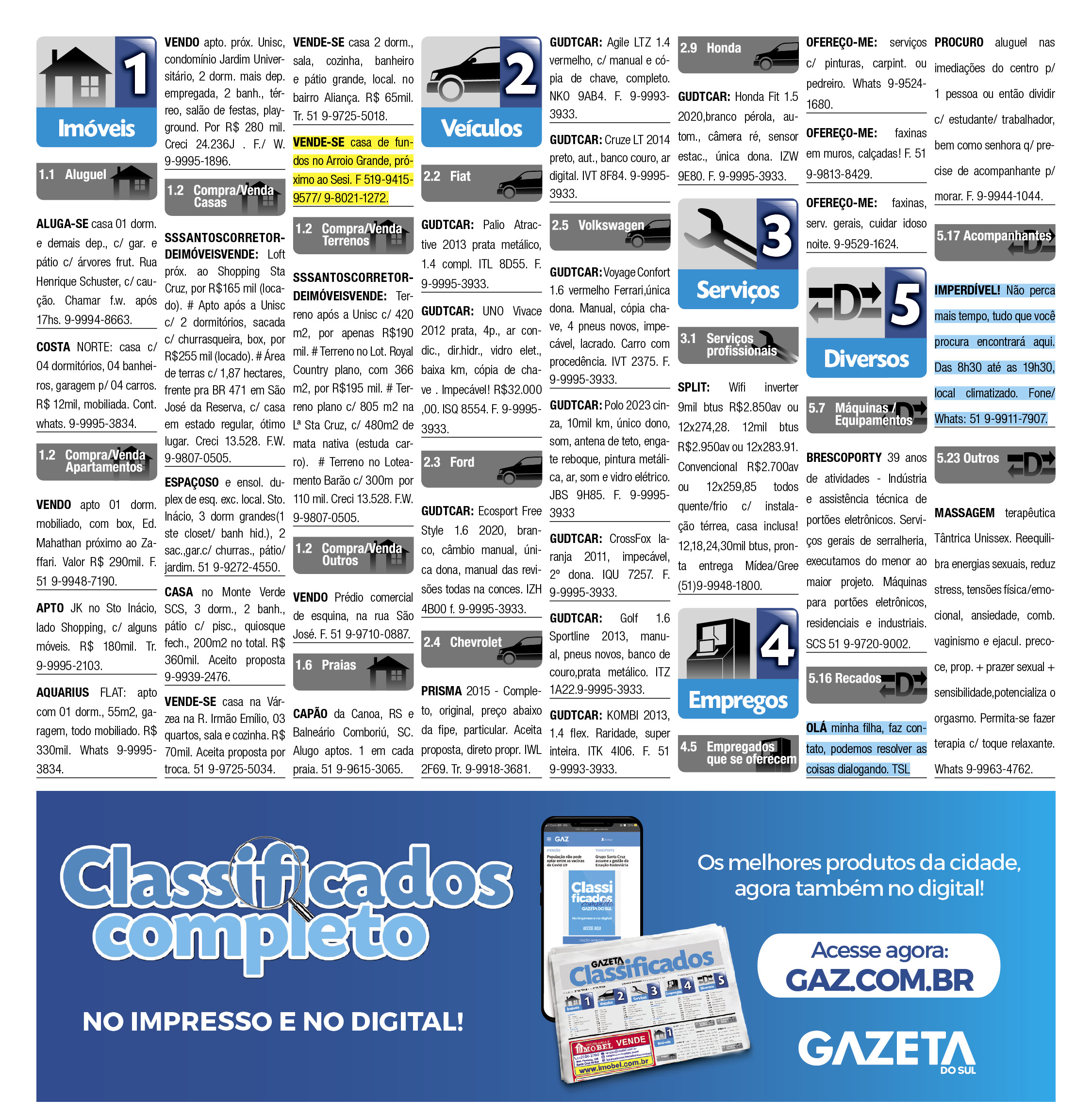 O suplemento de Classificados, que circula nas edições de terças, quintas e sábados, é um dos mais tradicionais da Gazeta do Sul, como vitrine e canal de negócios, de oferta, compra e venda em toda a região central do Rio Grande do Sul. E, para enriquecer pesquisas de produtos e serviços e possibilitar resultado ainda melhor a usuários e parceiros, nos anúncios de clientes cadastrados, o leitor tem acesso direto com link ao site do anunciante, onde poderá verificar mais detalhes sobre os itens. Confira as ofertas: