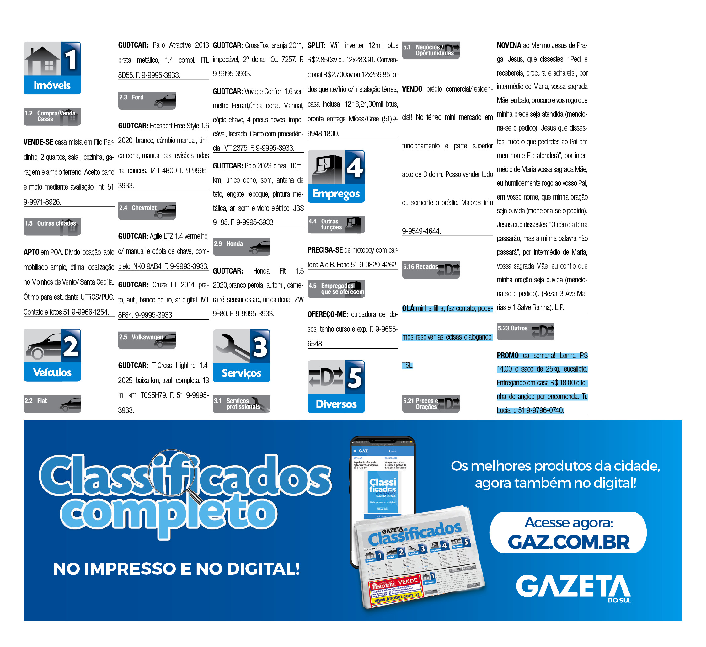 O suplemento de Classificados, que circula nas edições de terças, quintas e sábados, é um dos mais tradicionais da Gazeta do Sul, como vitrine e canal de negócios, de oferta, compra e venda em toda a região central do Rio Grande do Sul. E, para enriquecer pesquisas de produtos e serviços e possibilitar resultado ainda melhor a usuários e parceiros, nos anúncios de clientes cadastrados, o leitor tem acesso direto com link ao site do anunciante, onde poderá verificar mais detalhes sobre os itens. Confira as ofertas: