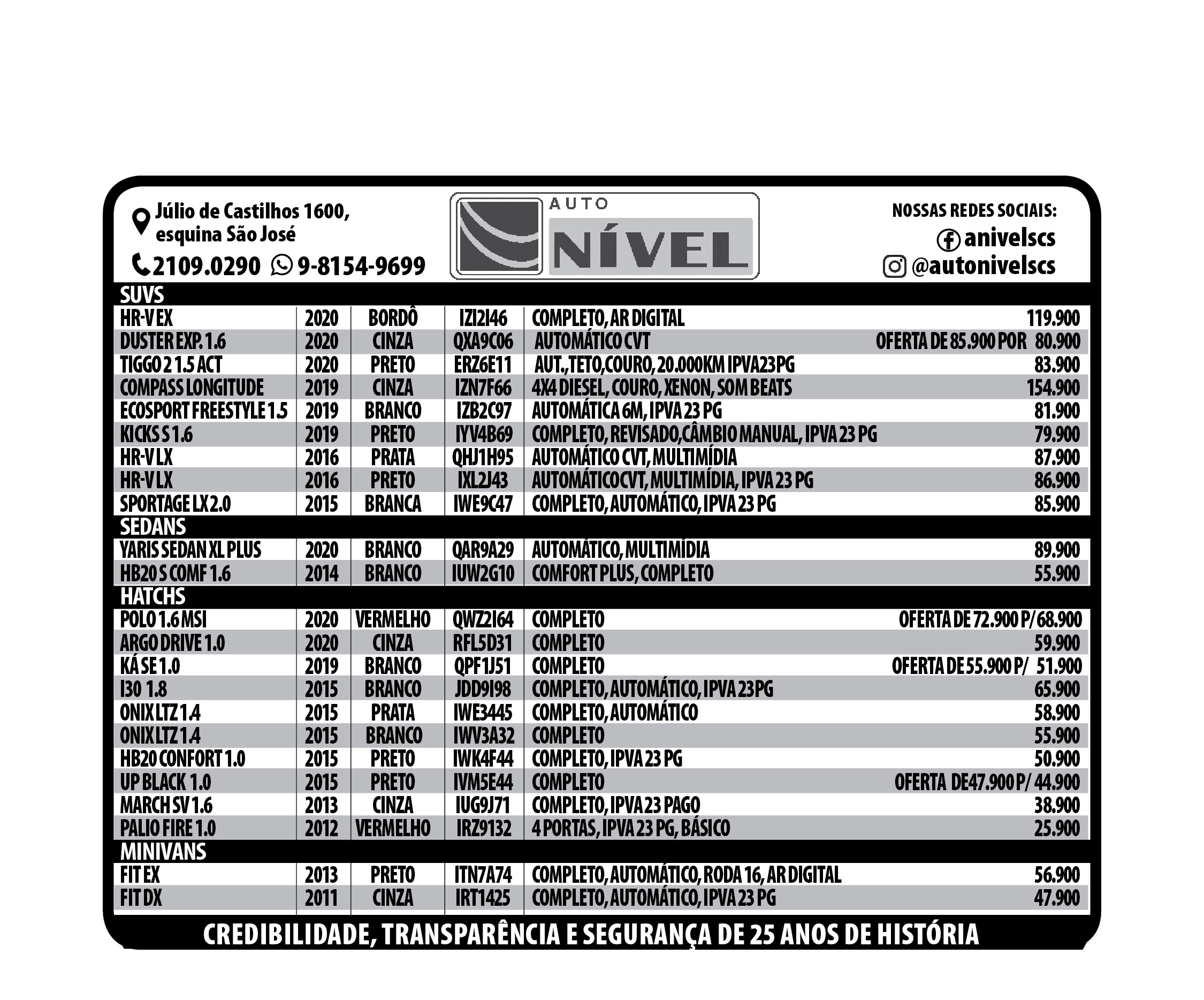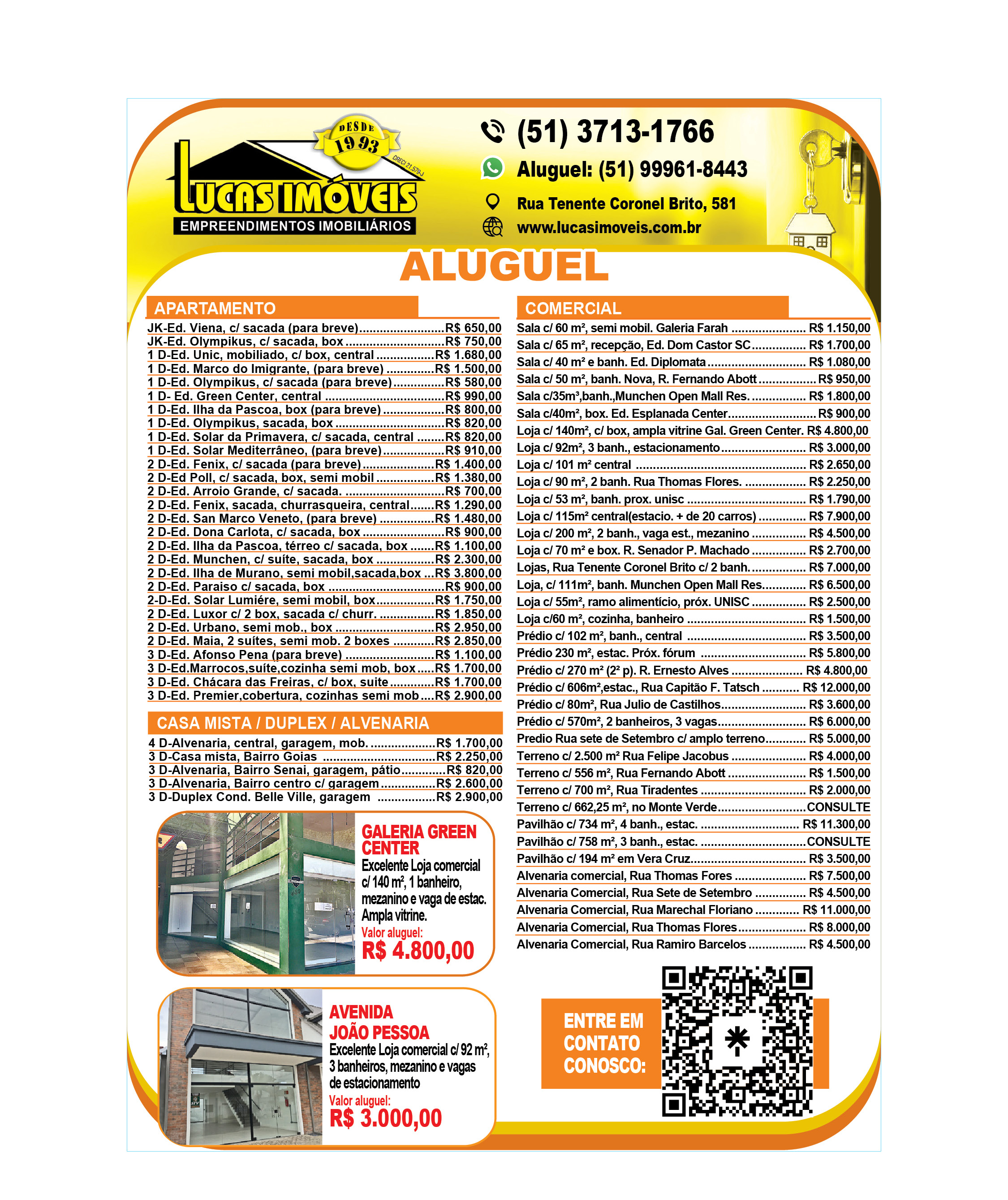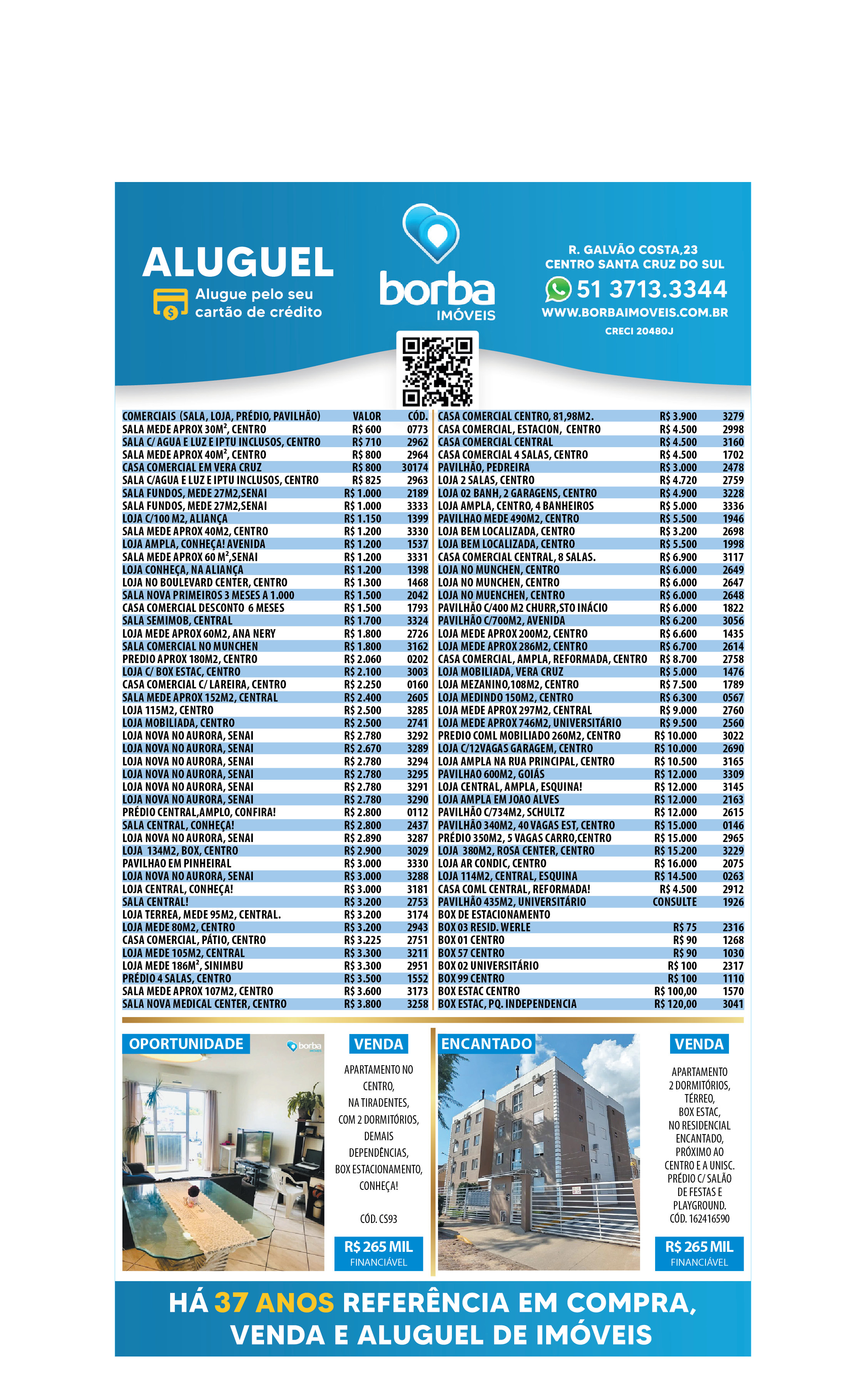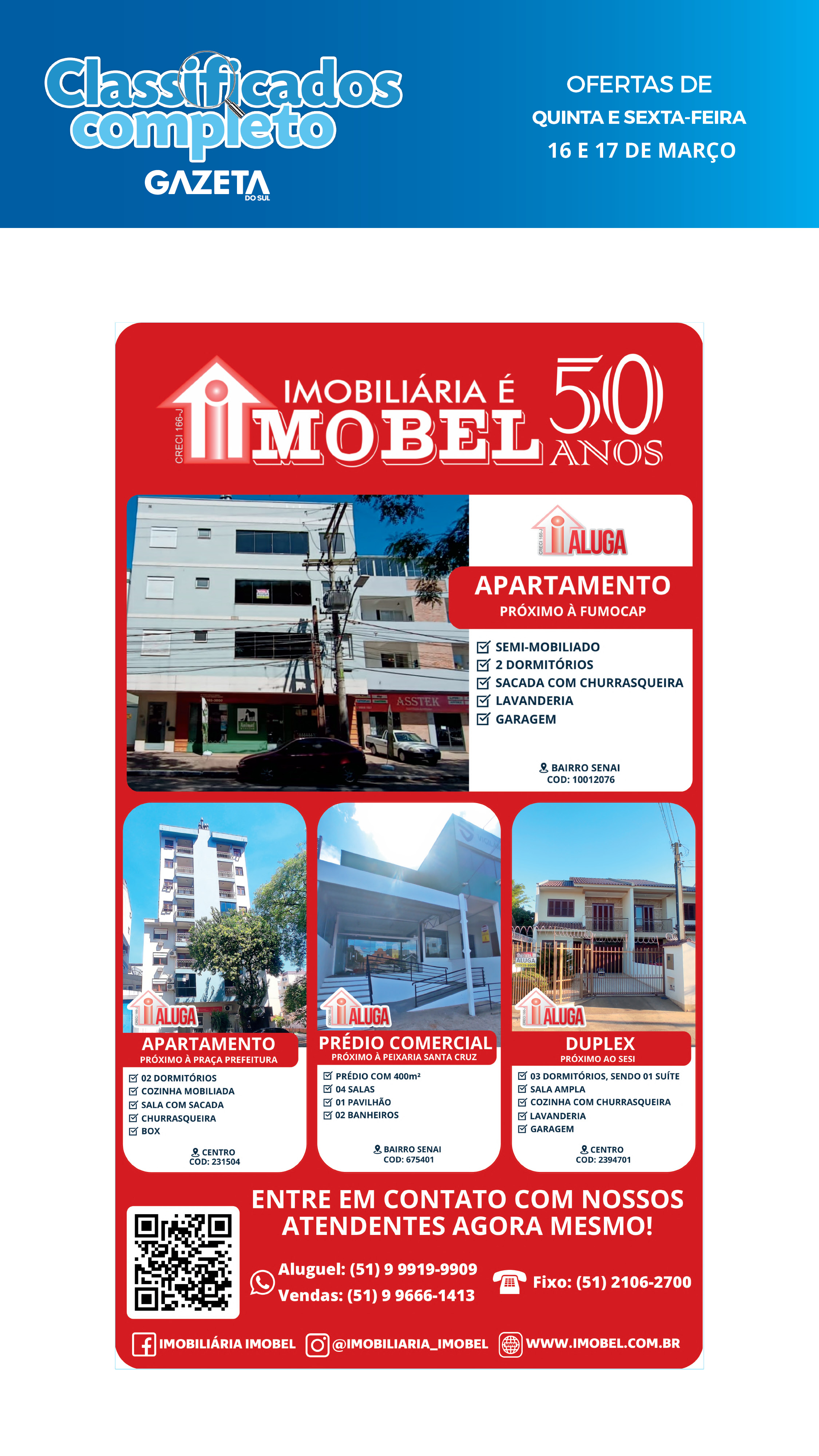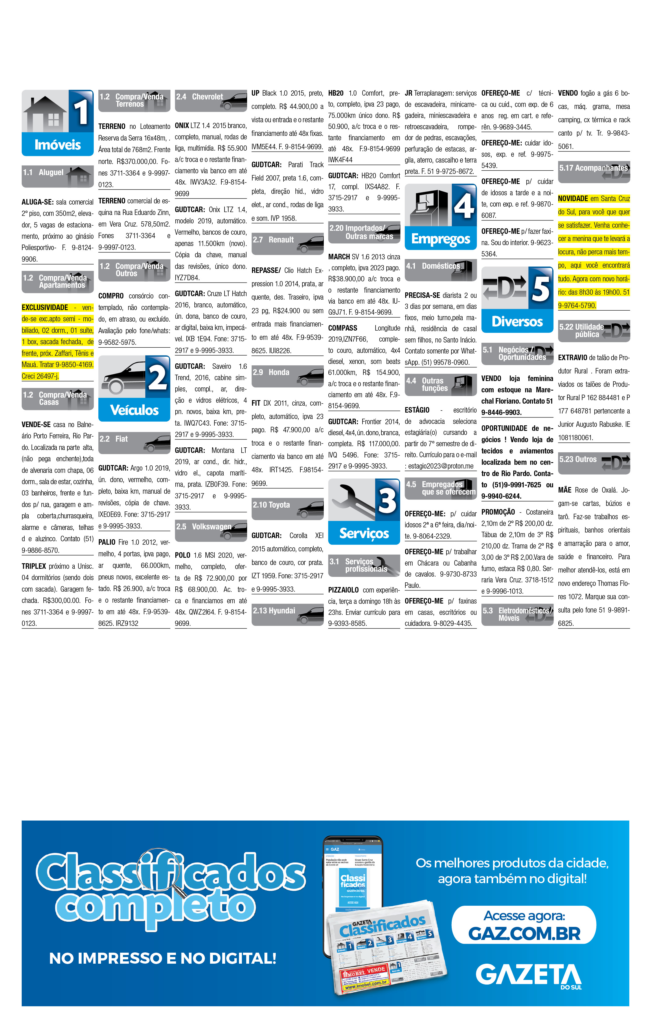 O suplemento de Classificados, que circula nas edições de terças, quintas e sábados, é um dos mais tradicionais da Gazeta do Sul, como vitrine e canal de negócios, de oferta, compra e venda em toda a região central do Rio Grande do Sul. E, para enriquecer pesquisas de produtos e serviços e possibilitar resultado ainda melhor a usuários e parceiros, nos anúncios de clientes cadastrados, o leitor tem acesso direto com link ao site do anunciante, onde poderá verificar mais detalhes sobre os itens. Confira as ofertas: