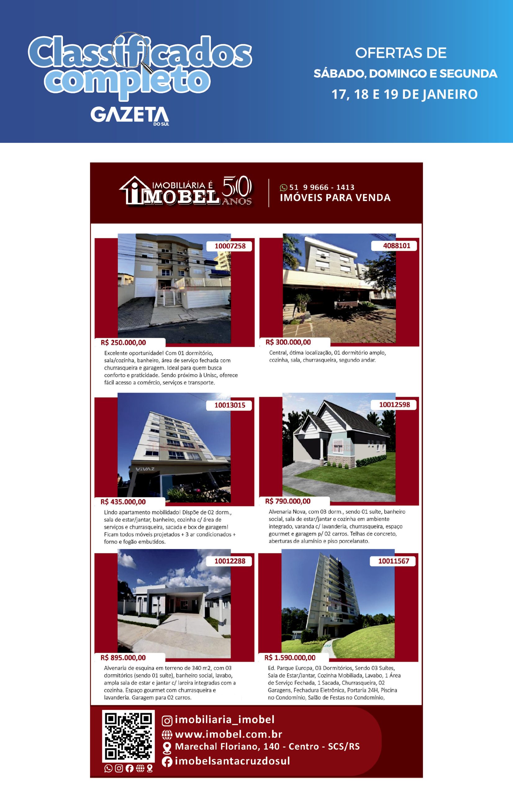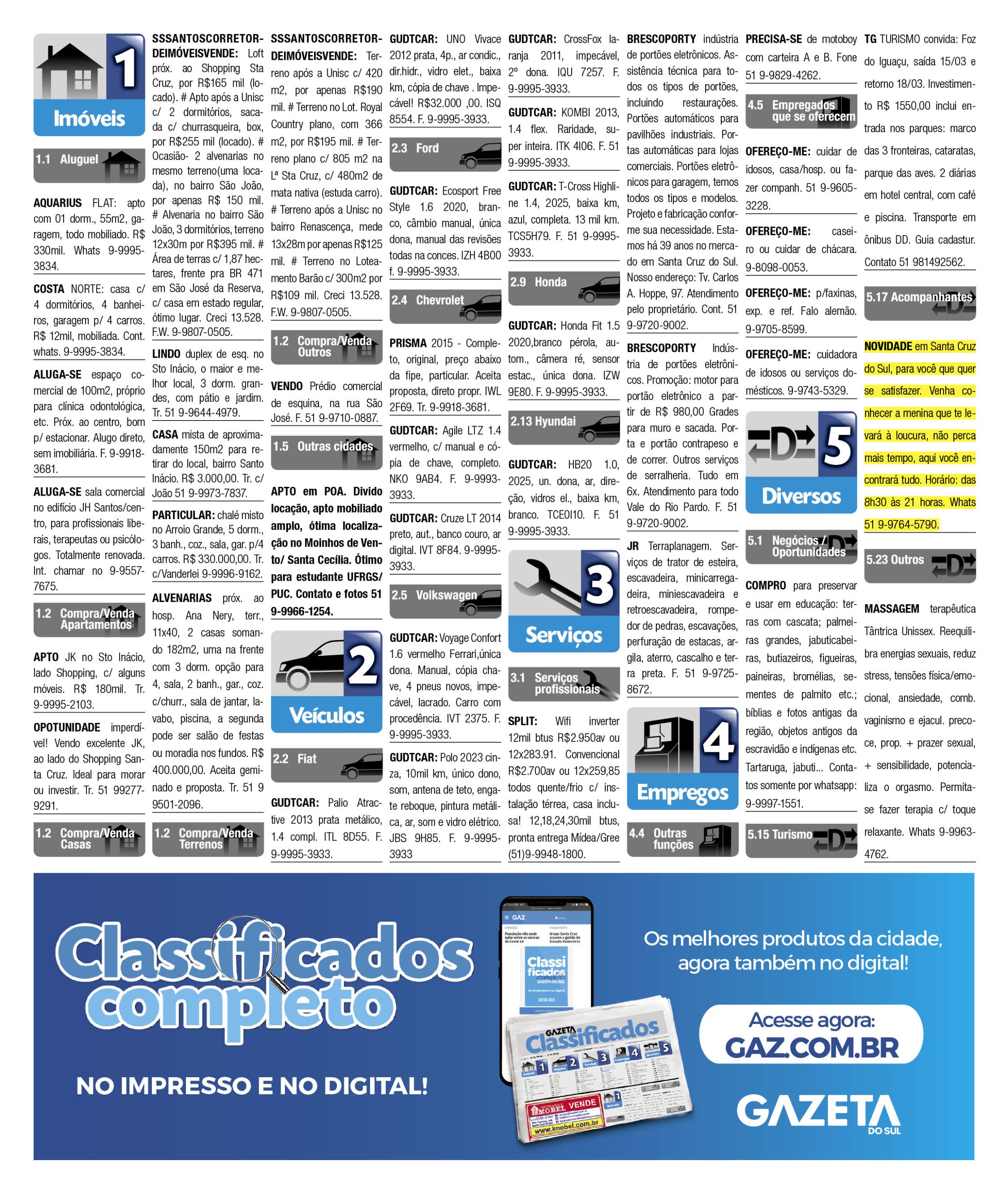 O suplemento de Classificados, que circula nas edições de terças, quintas e sábados, é um dos mais tradicionais da Gazeta do Sul, como vitrine e canal de negócios, de oferta, compra e venda em toda a região central do Rio Grande do Sul. E, para enriquecer pesquisas de produtos e serviços e possibilitar resultado ainda melhor a usuários e parceiros, nos anúncios de clientes cadastrados, o leitor tem acesso direto com link ao site do anunciante, onde poderá verificar mais detalhes sobre os itens. Confira as ofertas: