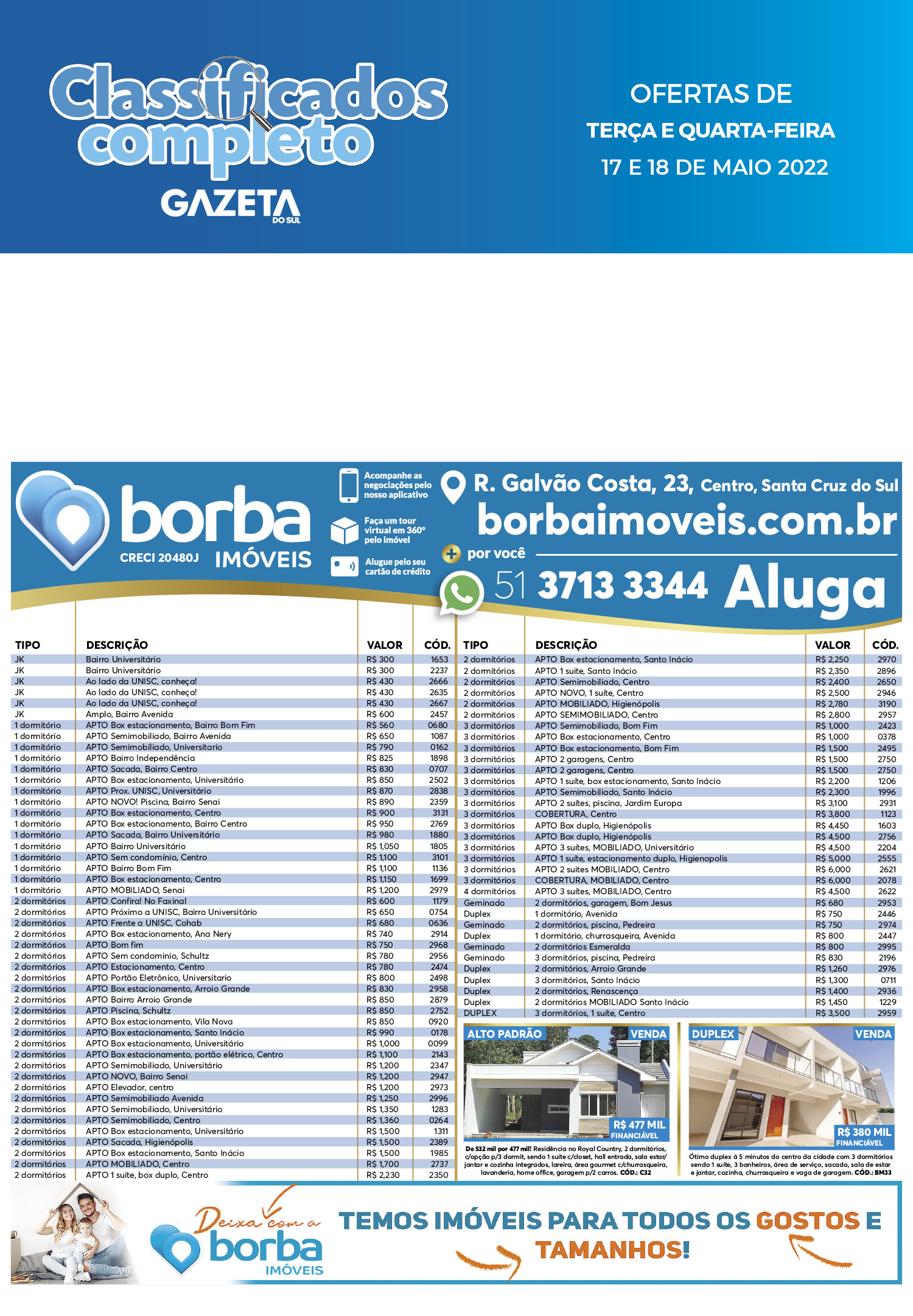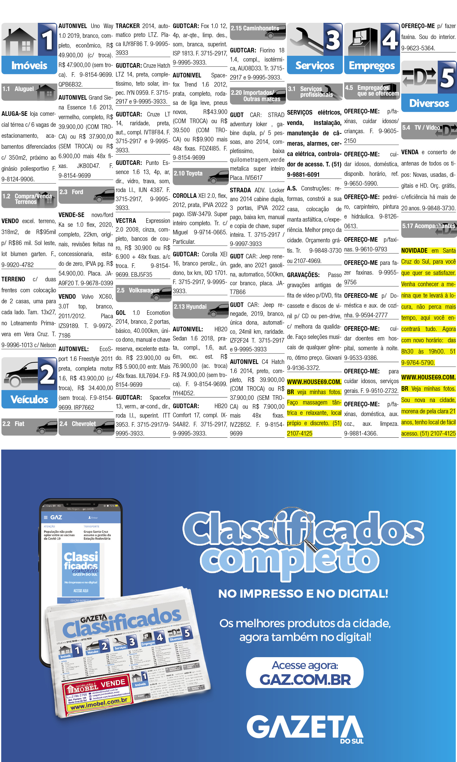 O suplemento de Classificados, que circula nas edições de terças, quintas e sábados, é um dos mais tradicionais da Gazeta do Sul, como vitrine e canal de negócios, de oferta, compra e venda em toda a região central do Rio Grande do Sul. E, para enriquecer pesquisas de produtos e serviços e possibilitar resultado ainda melhor a usuários e parceiros, nos anúncios de clientes cadastrados, o leitor tem acesso direto com link ao site do anunciante, onde poderá verificar mais detalhes sobre os itens. Confira as ofertas: