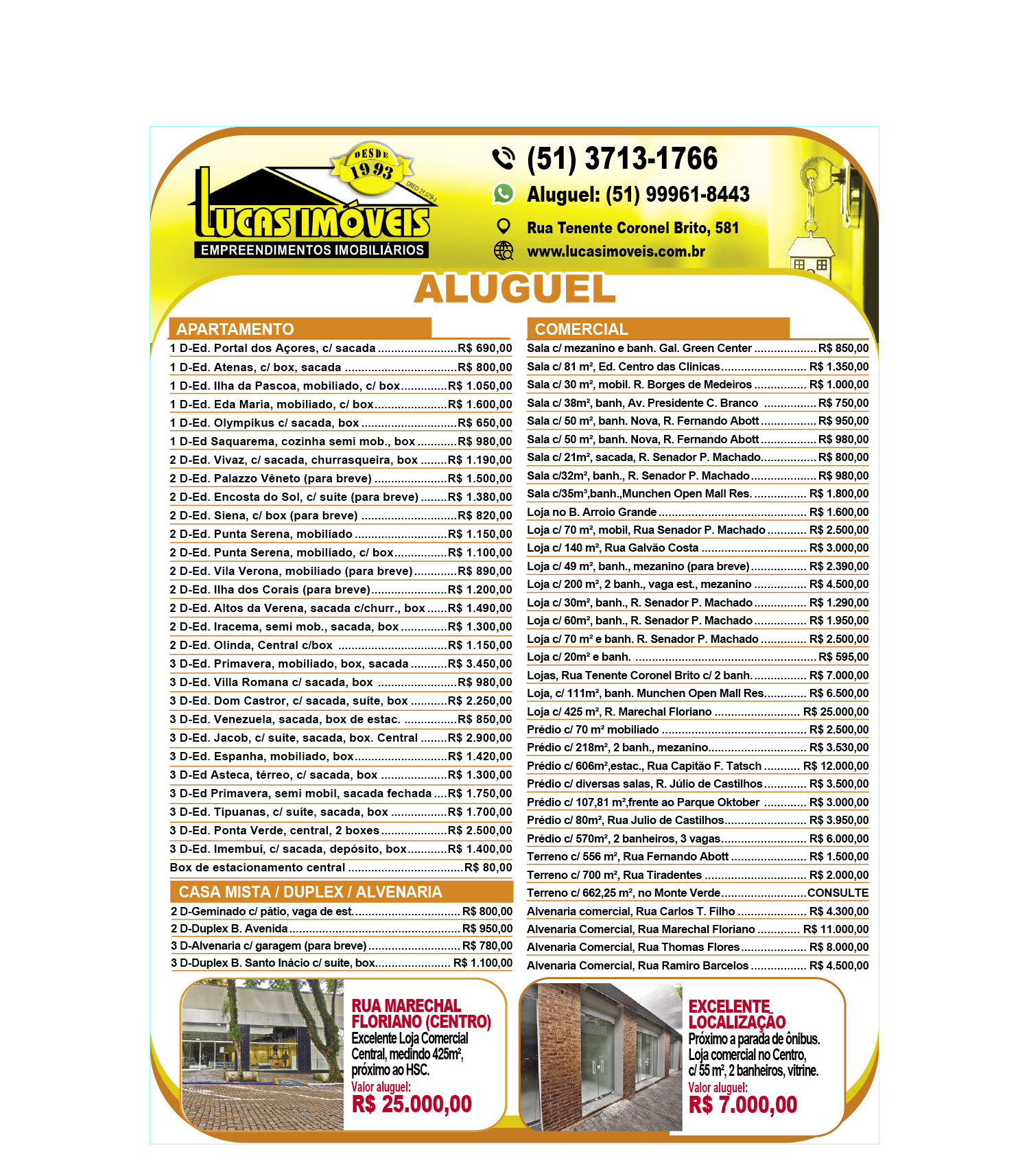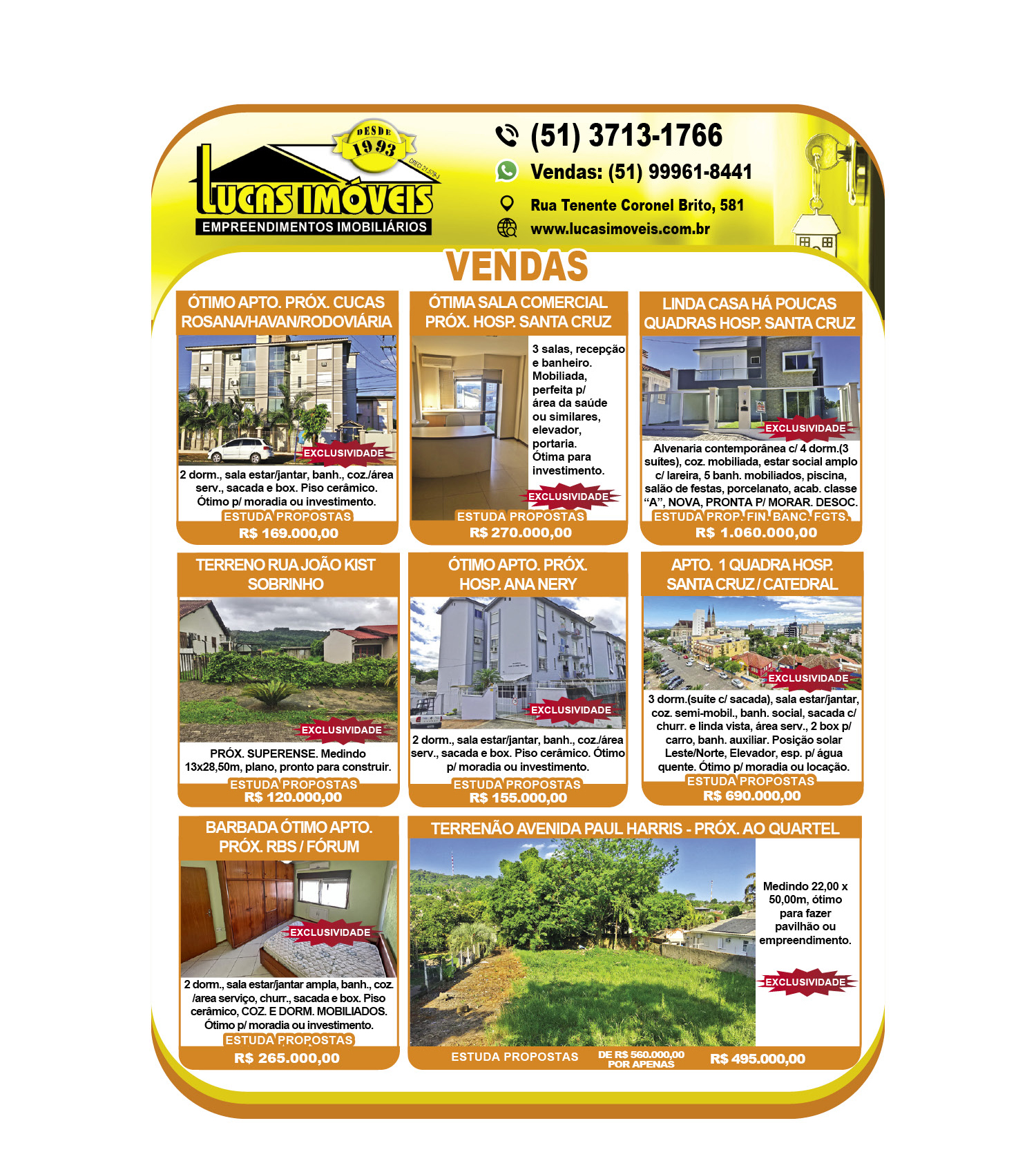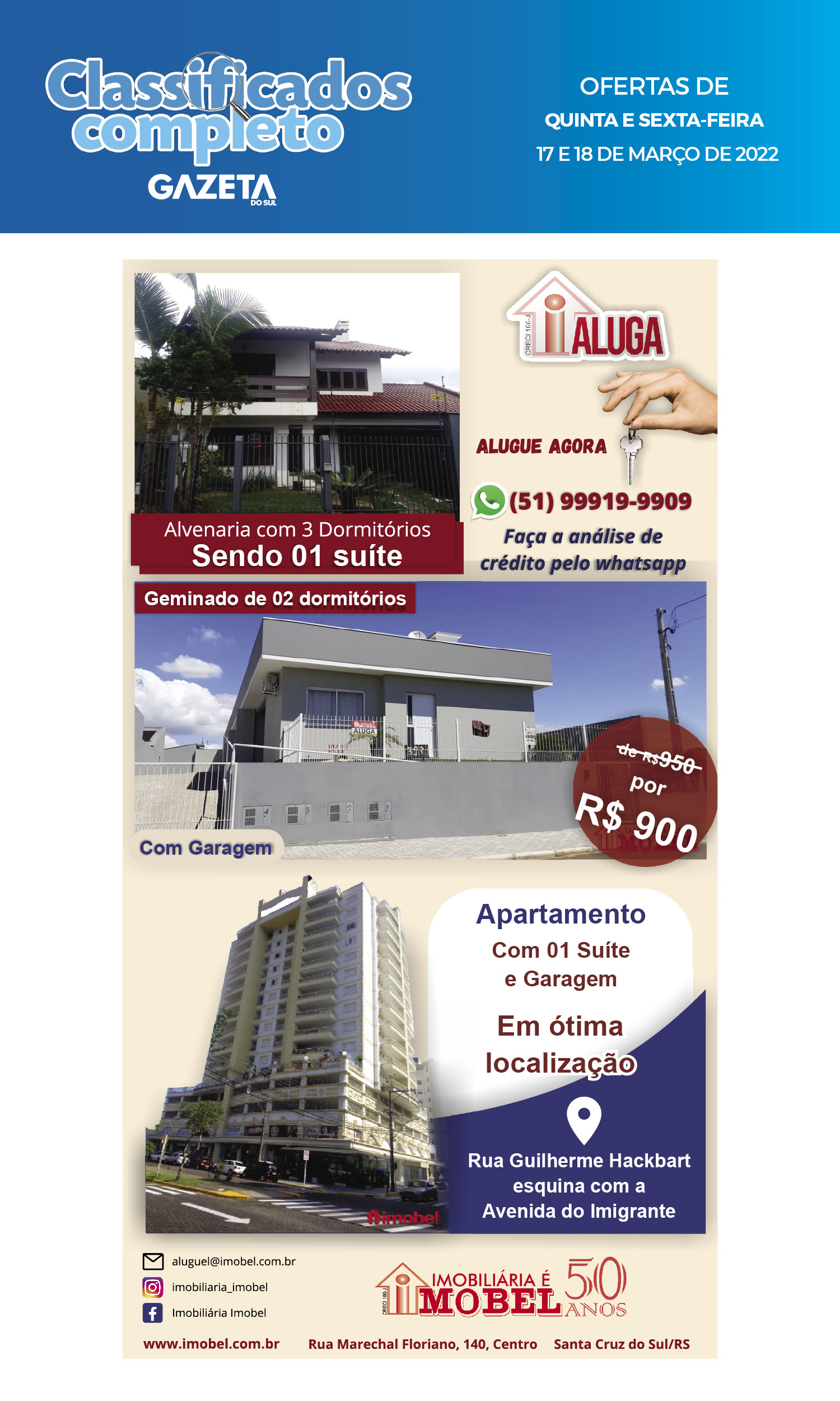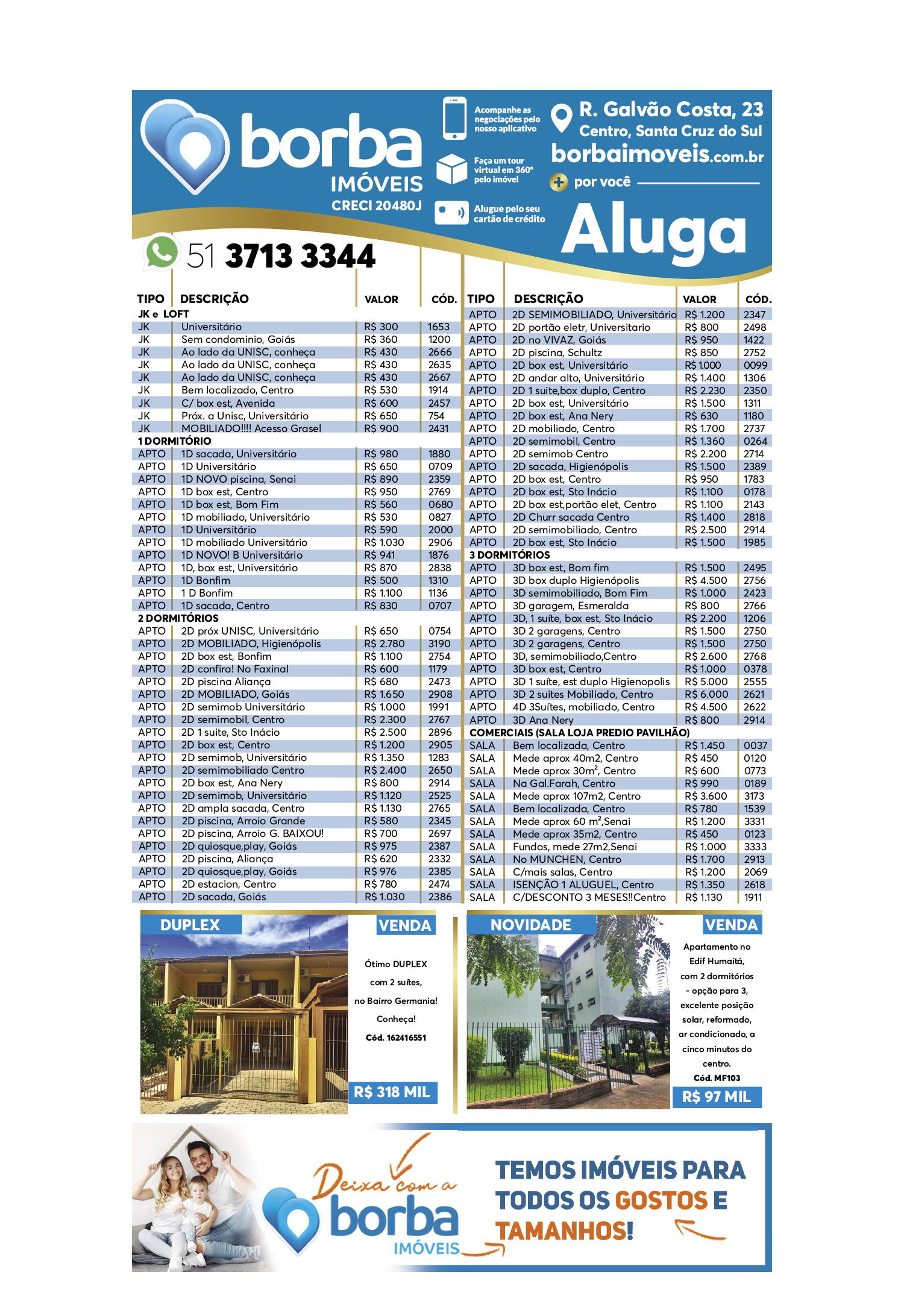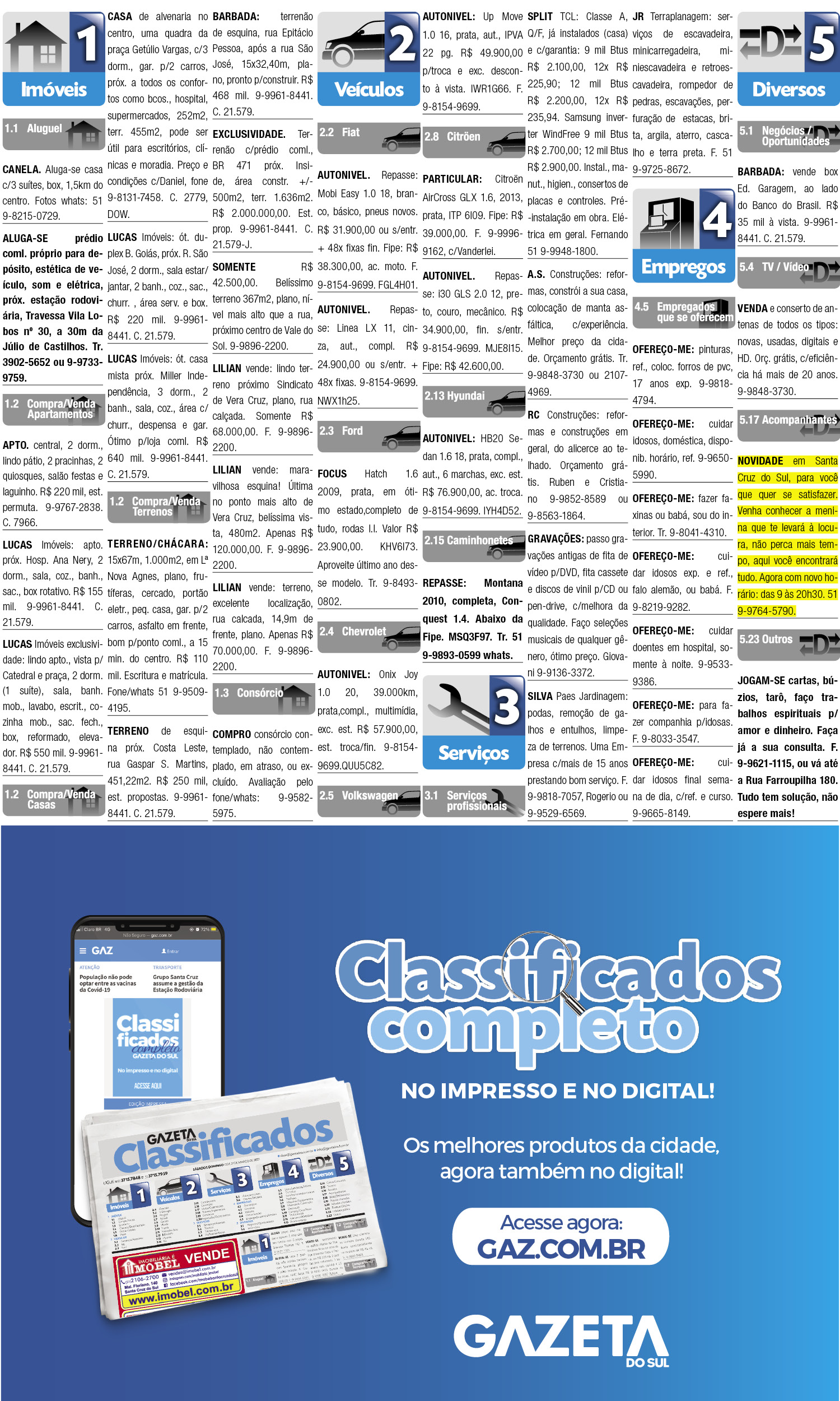 O suplemento de Classificados, que circula nas edições de terças, quintas e sábados, é um dos mais tradicionais da Gazeta do Sul, como vitrine e canal de negócios, de oferta, compra e venda em toda a região central do Rio Grande do Sul. E, para enriquecer pesquisas de produtos e serviços e possibilitar resultado ainda melhor a usuários e parceiros, nos anúncios de clientes cadastrados, o leitor tem acesso direto com link ao site do anunciante, onde poderá verificar mais detalhes sobre os itens. Confira as ofertas: