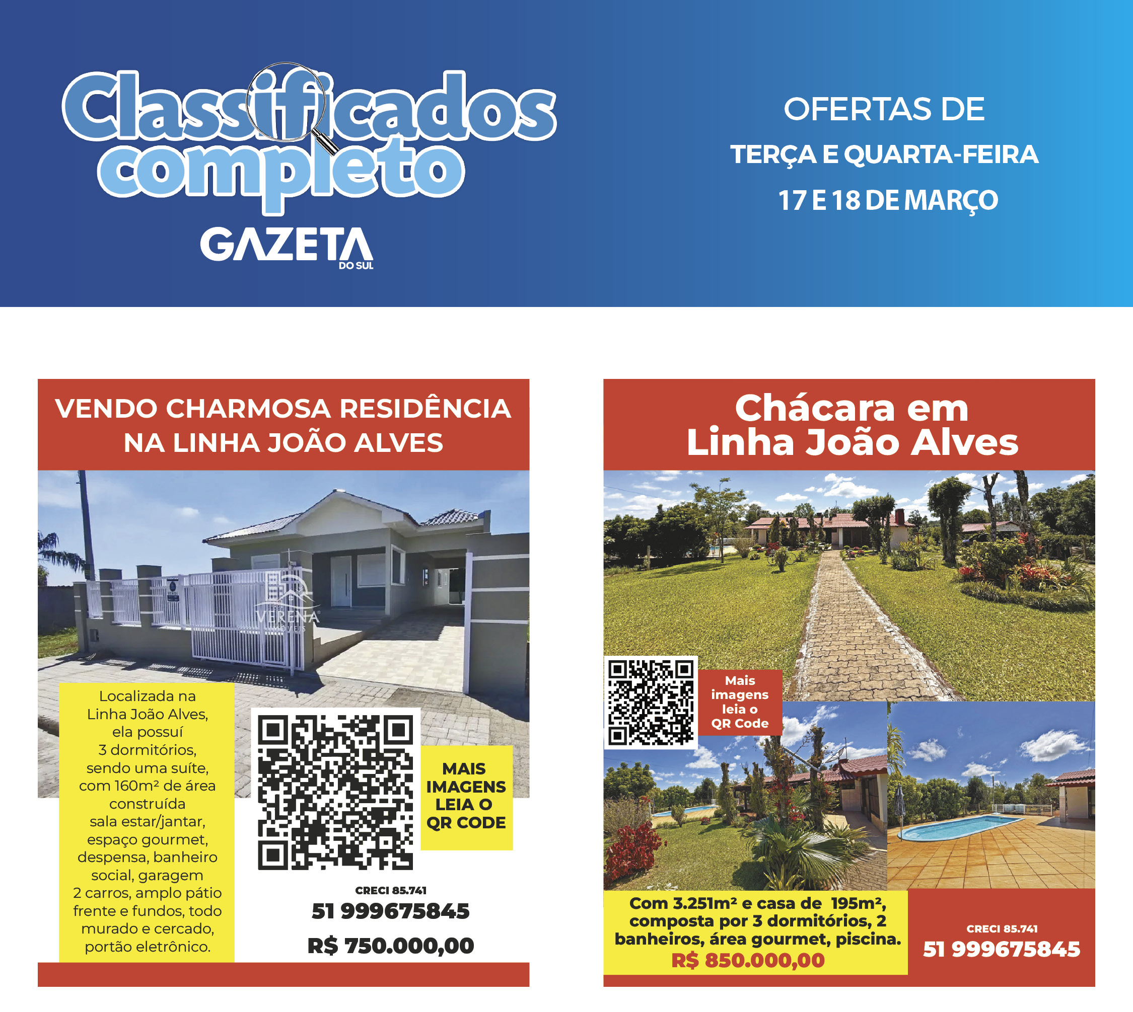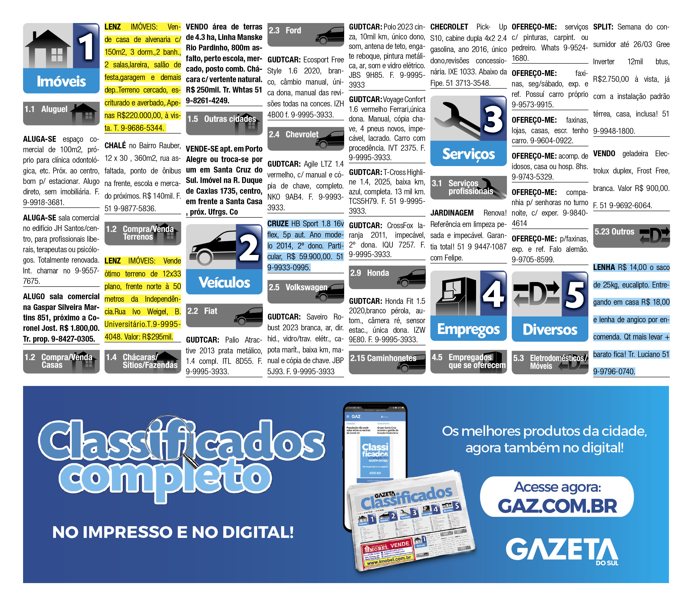 O suplemento de Classificados, que circula nas edições de terças, quintas e sábados, é um dos mais tradicionais da Gazeta do Sul, como vitrine e canal de negócios, de oferta, compra e venda em toda a região central do Rio Grande do Sul. E, para enriquecer pesquisas de produtos e serviços e possibilitar resultado ainda melhor a usuários e parceiros, nos anúncios de clientes cadastrados, o leitor tem acesso direto com link ao site do anunciante, onde poderá verificar mais detalhes sobre os itens. Confira as ofertas: