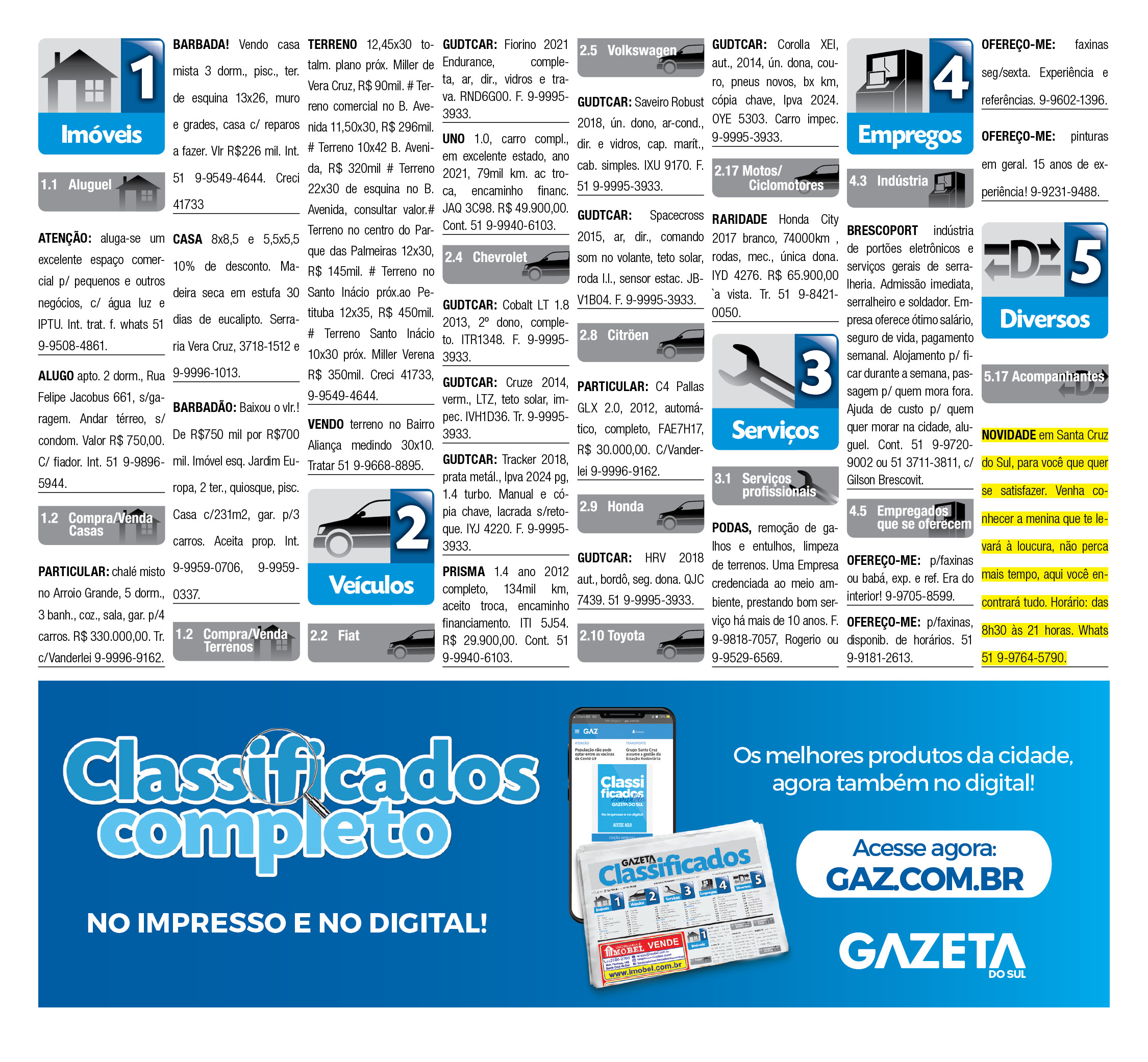 O suplemento de Classificados, que circula nas edições de terças, quintas e sábados, é um dos mais tradicionais da Gazeta do Sul, como vitrine e canal de negócios, de oferta, compra e venda em toda a região central do Rio Grande do Sul. E, para enriquecer pesquisas de produtos e serviços e possibilitar resultado ainda melhor a usuários e parceiros, nos anúncios de clientes cadastrados, o leitor tem acesso direto com link ao site do anunciante, onde poderá verificar mais detalhes sobre os itens. Confira as ofertas: