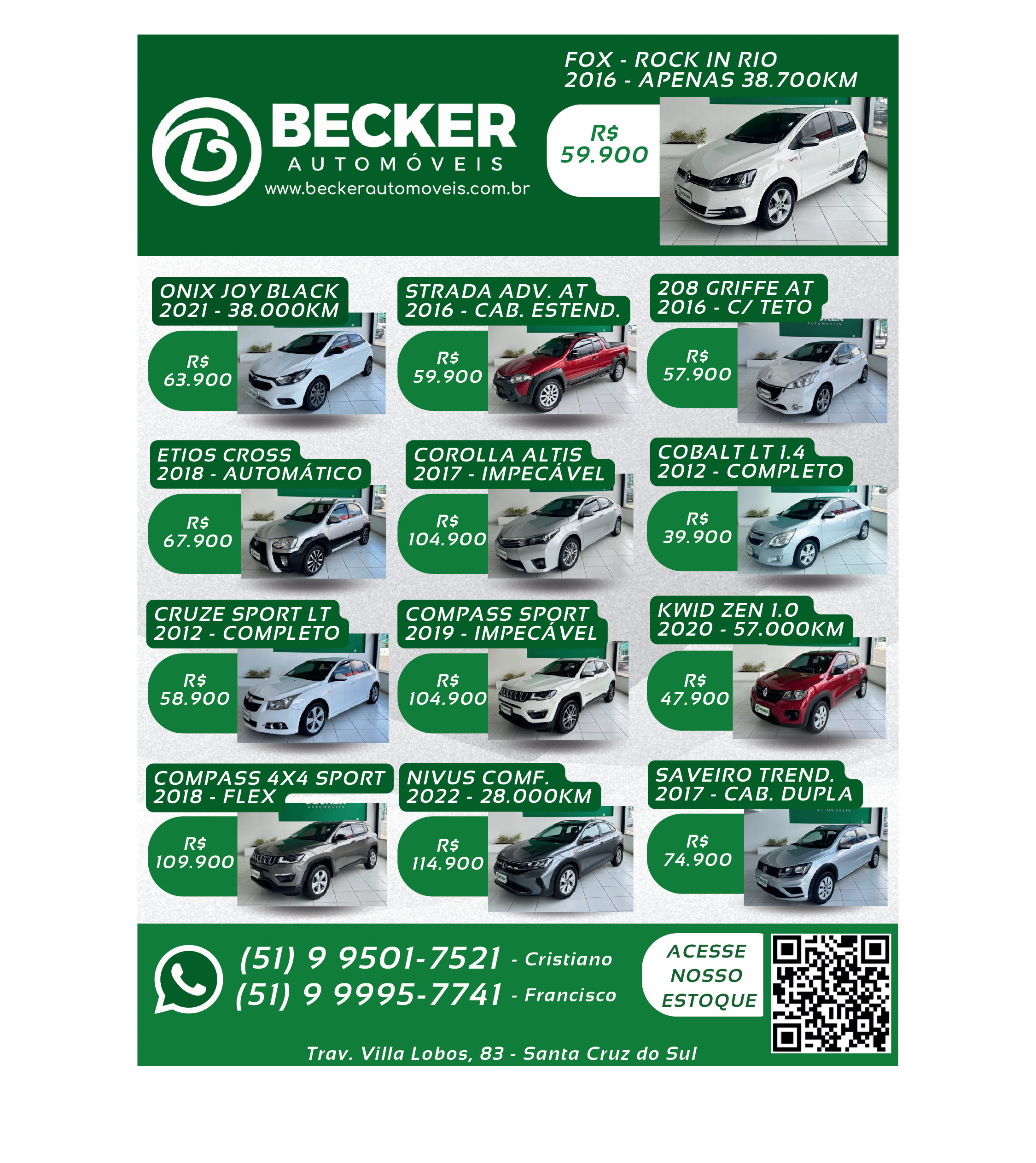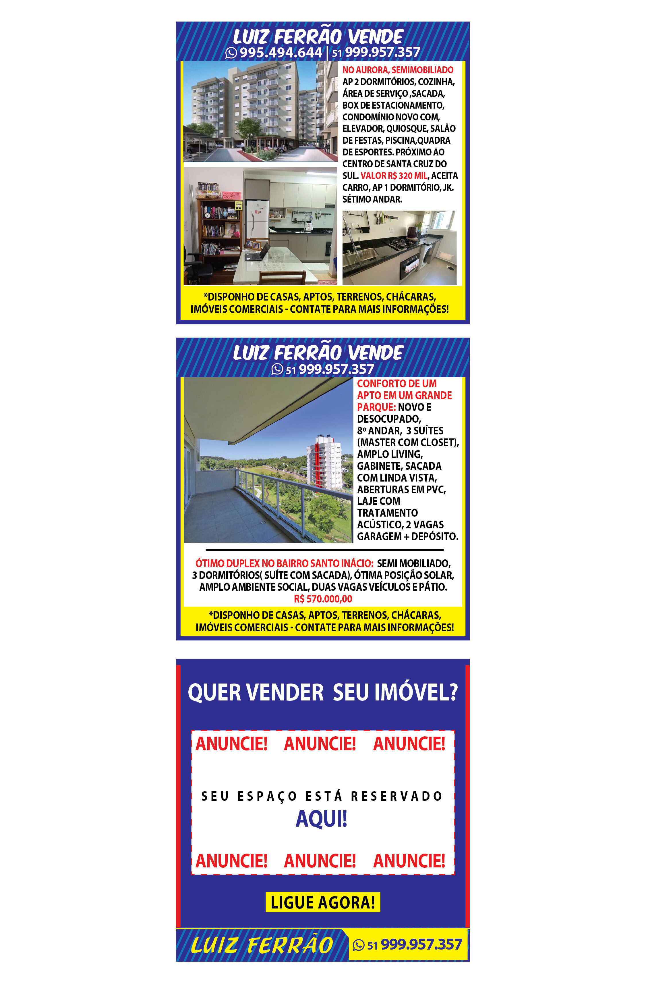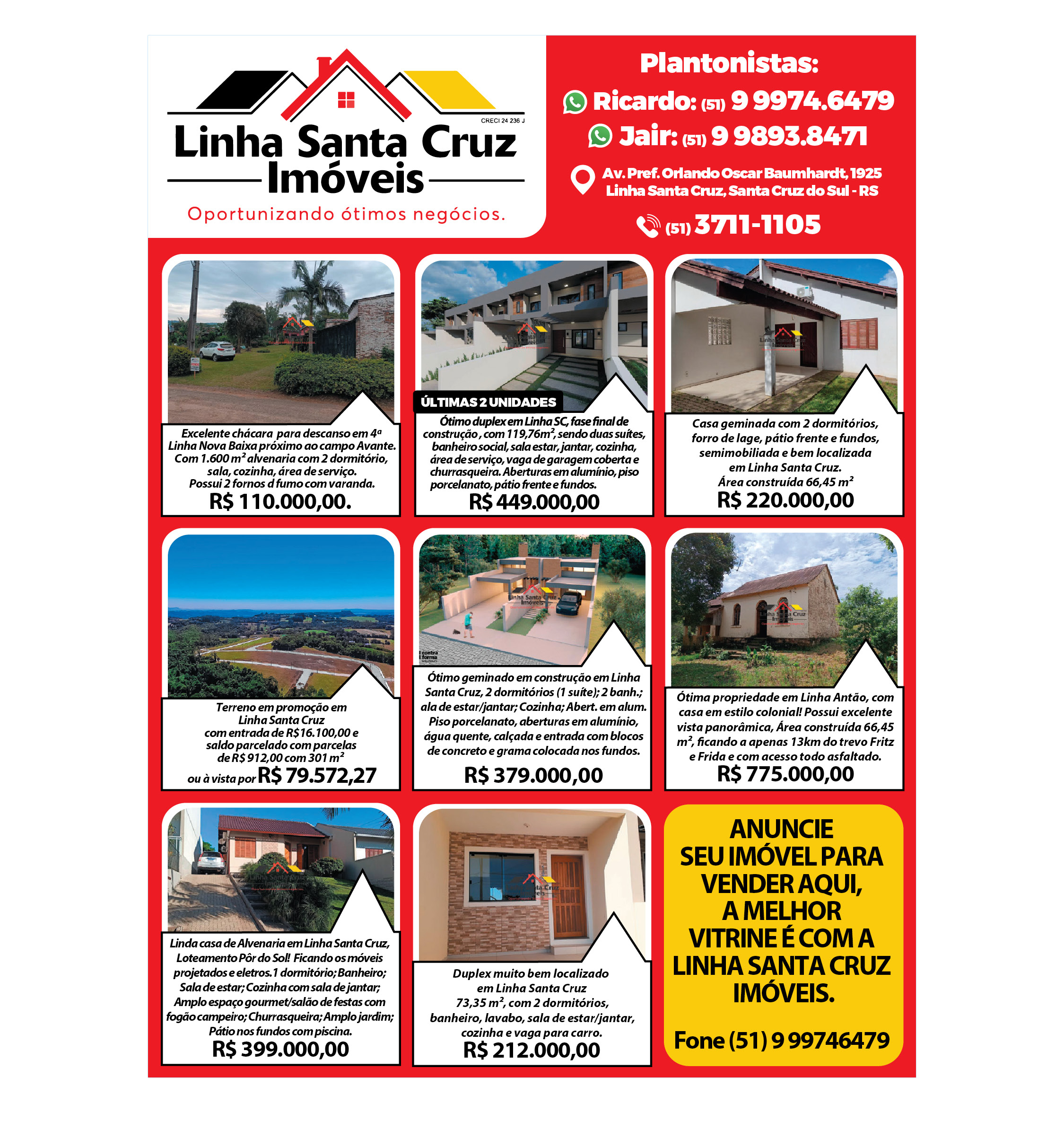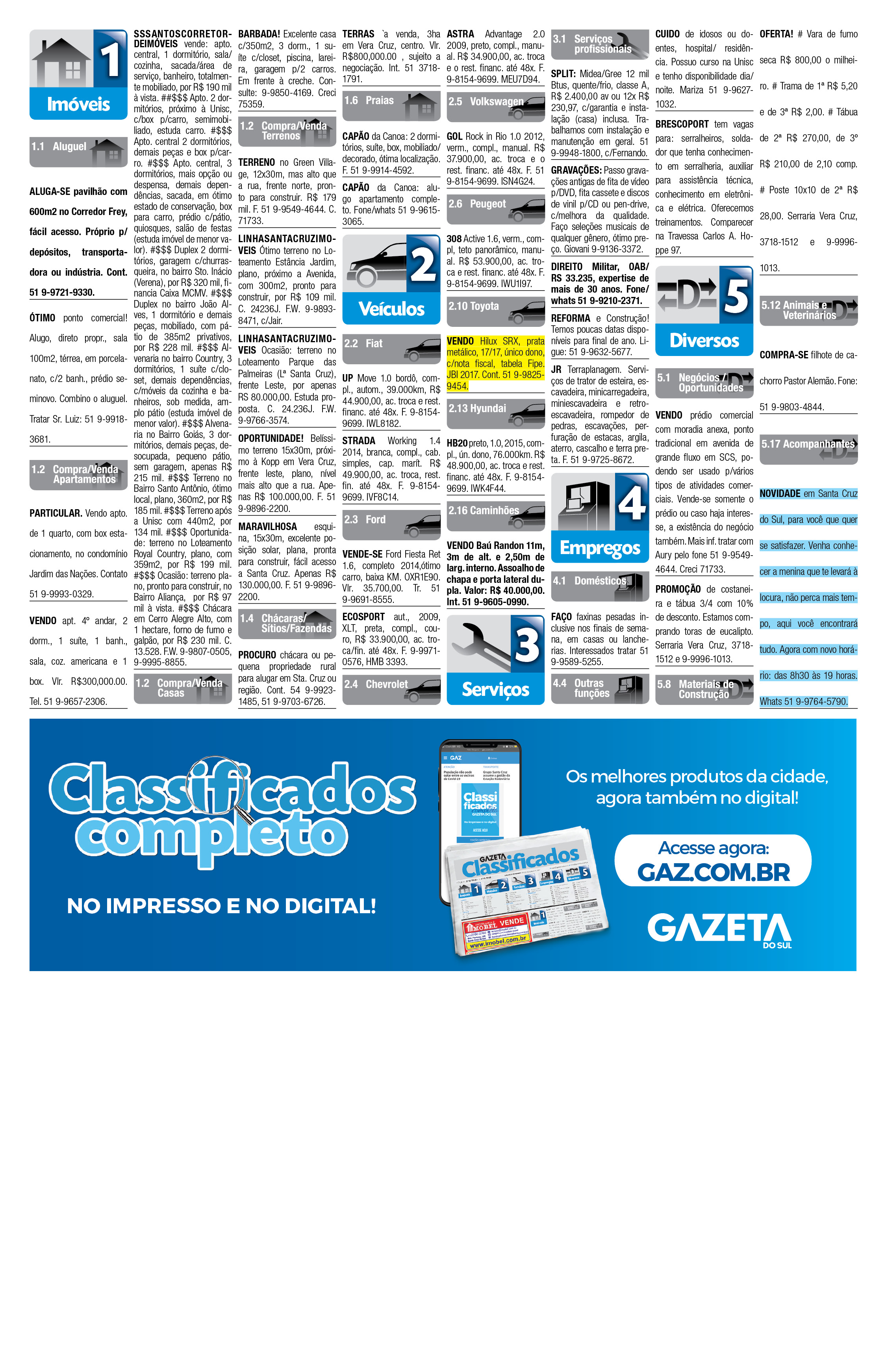 O suplemento de Classificados, que circula nas edições de terças, quintas e sábados, é um dos mais tradicionais da Gazeta do Sul, como vitrine e canal de negócios, de oferta, compra e venda em toda a região central do Rio Grande do Sul. E, para enriquecer pesquisas de produtos e serviços e possibilitar resultado ainda melhor a usuários e parceiros, nos anúncios de clientes cadastrados, o leitor tem acesso direto com link ao site do anunciante, onde poderá verificar mais detalhes sobre os itens. Confira as ofertas: