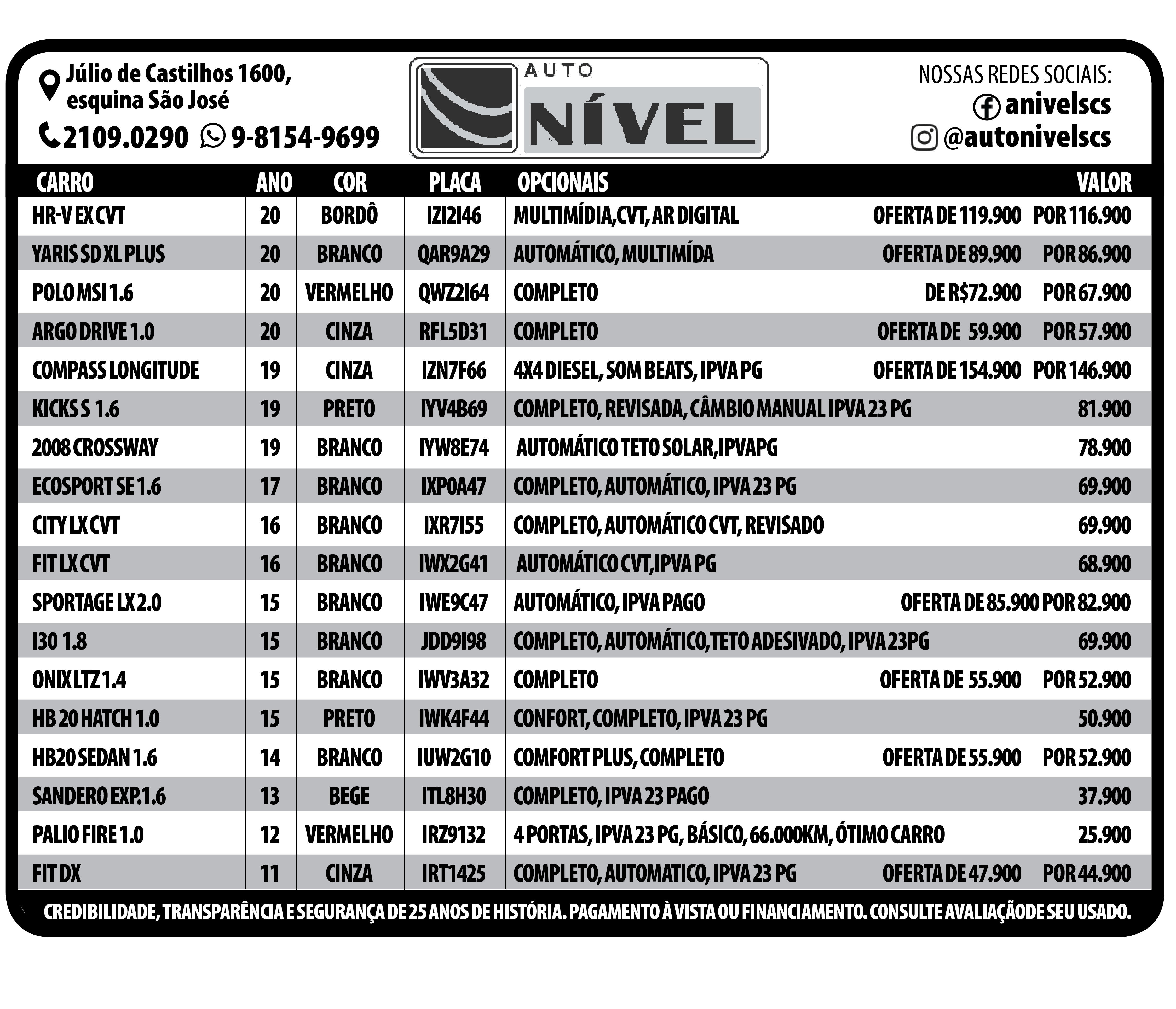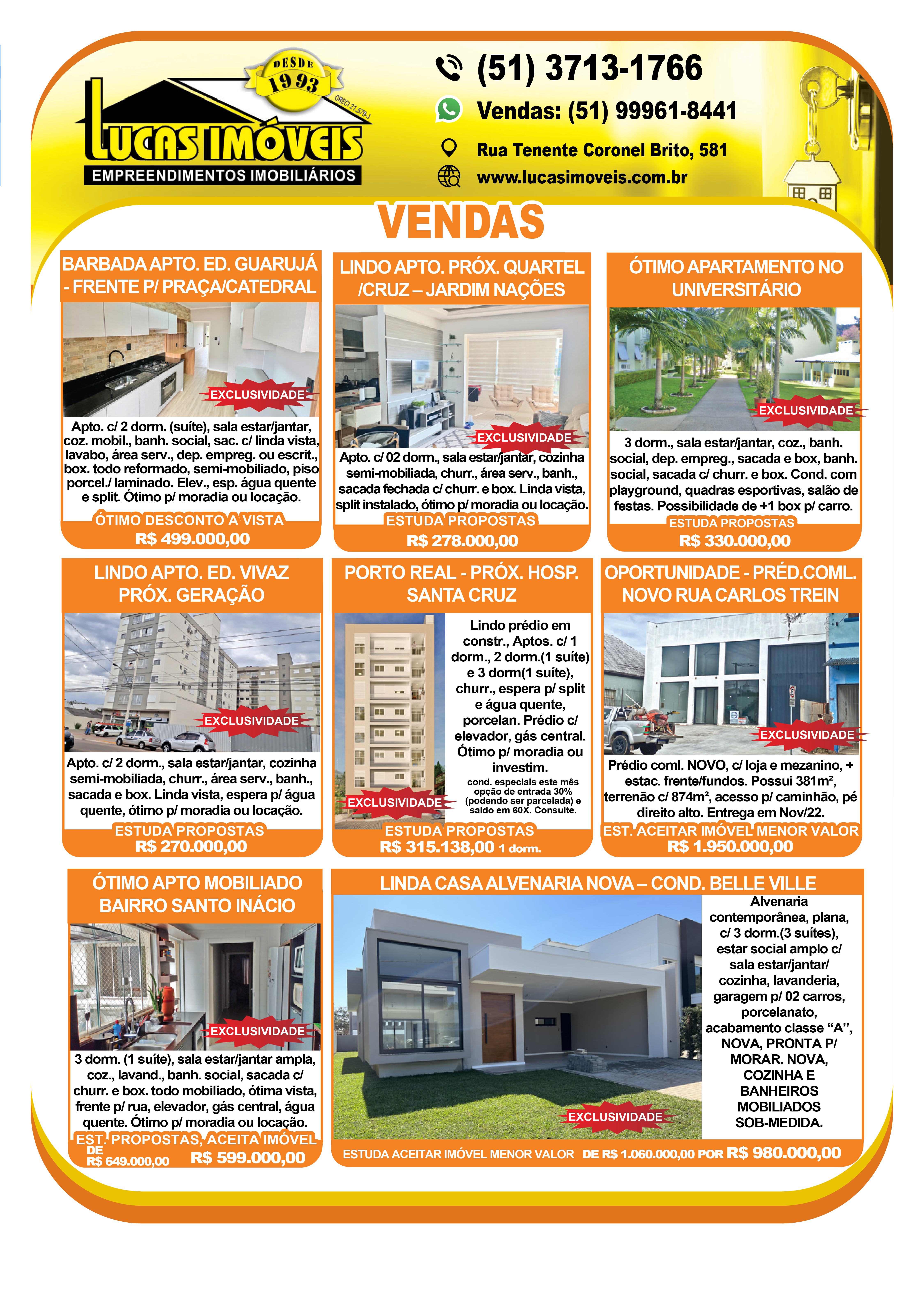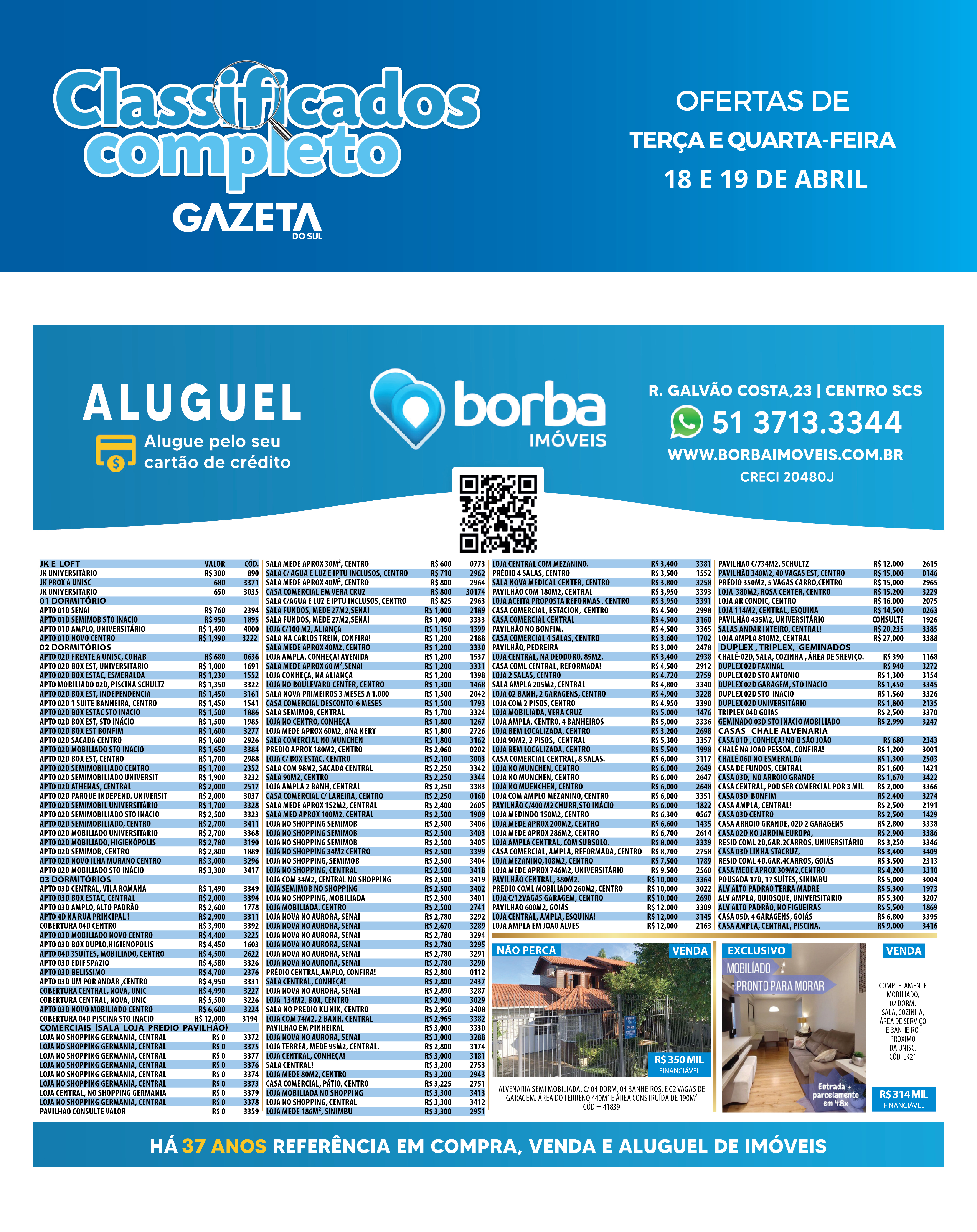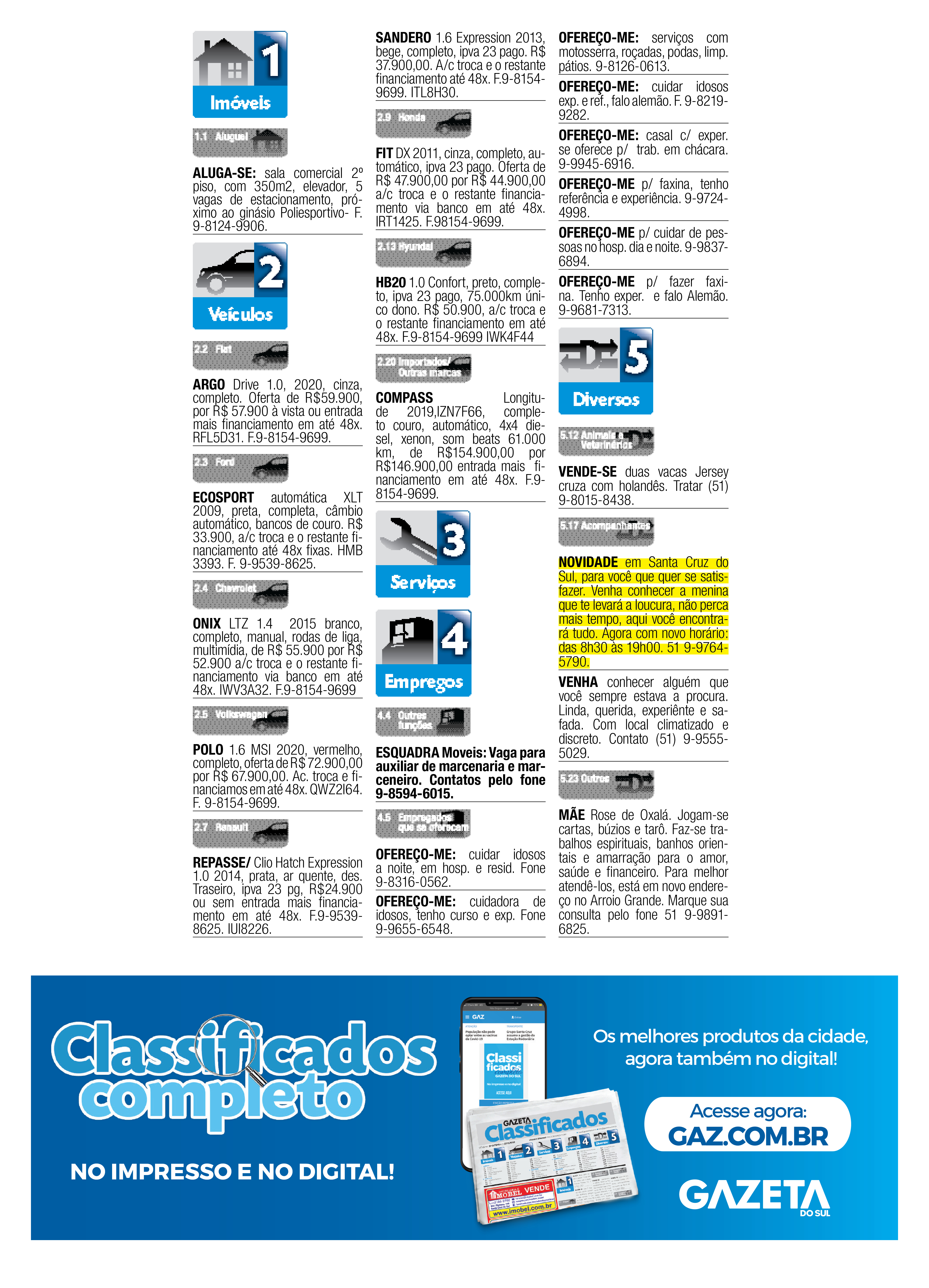 O suplemento de Classificados, que circula nas edições de terças, quintas e sábados, é um dos mais tradicionais da Gazeta do Sul, como vitrine e canal de negócios, de oferta, compra e venda em toda a região central do Rio Grande do Sul. E, para enriquecer pesquisas de produtos e serviços e possibilitar resultado ainda melhor a usuários e parceiros, nos anúncios de clientes cadastrados, o leitor tem acesso direto com link ao site do anunciante, onde poderá verificar mais detalhes sobre os itens. Confira as ofertas: