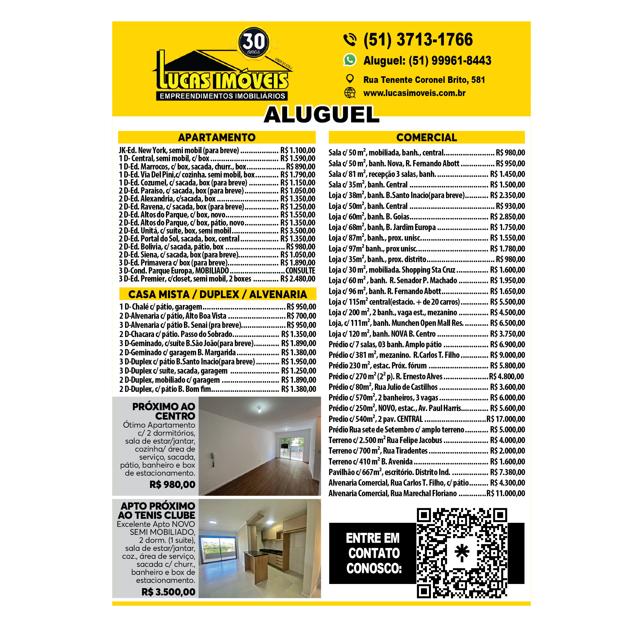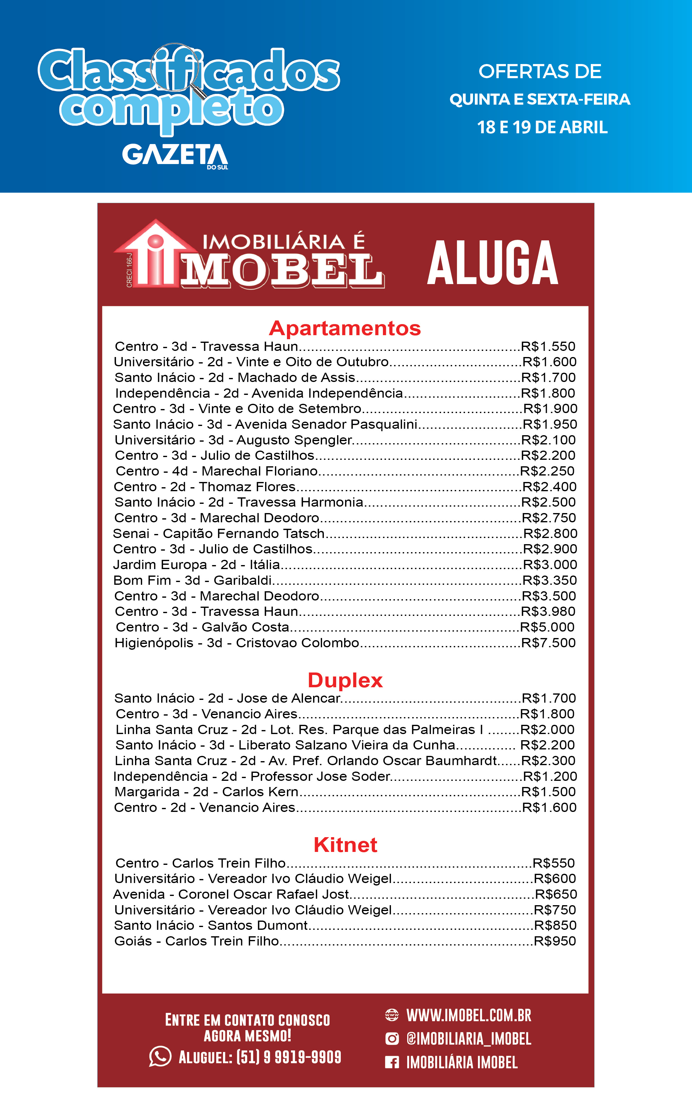 O suplemento de Classificados, que circula nas edições de terças, quintas e sábados, é um dos mais tradicionais da Gazeta do Sul, como vitrine e canal de negócios, de oferta, compra e venda em toda a região central do Rio Grande do Sul. E, para enriquecer pesquisas de produtos e serviços e possibilitar resultado ainda melhor a usuários e parceiros, nos anúncios de clientes cadastrados, o leitor tem acesso direto com link ao site do anunciante, onde poderá verificar mais detalhes sobre os itens. Confira as ofertas: