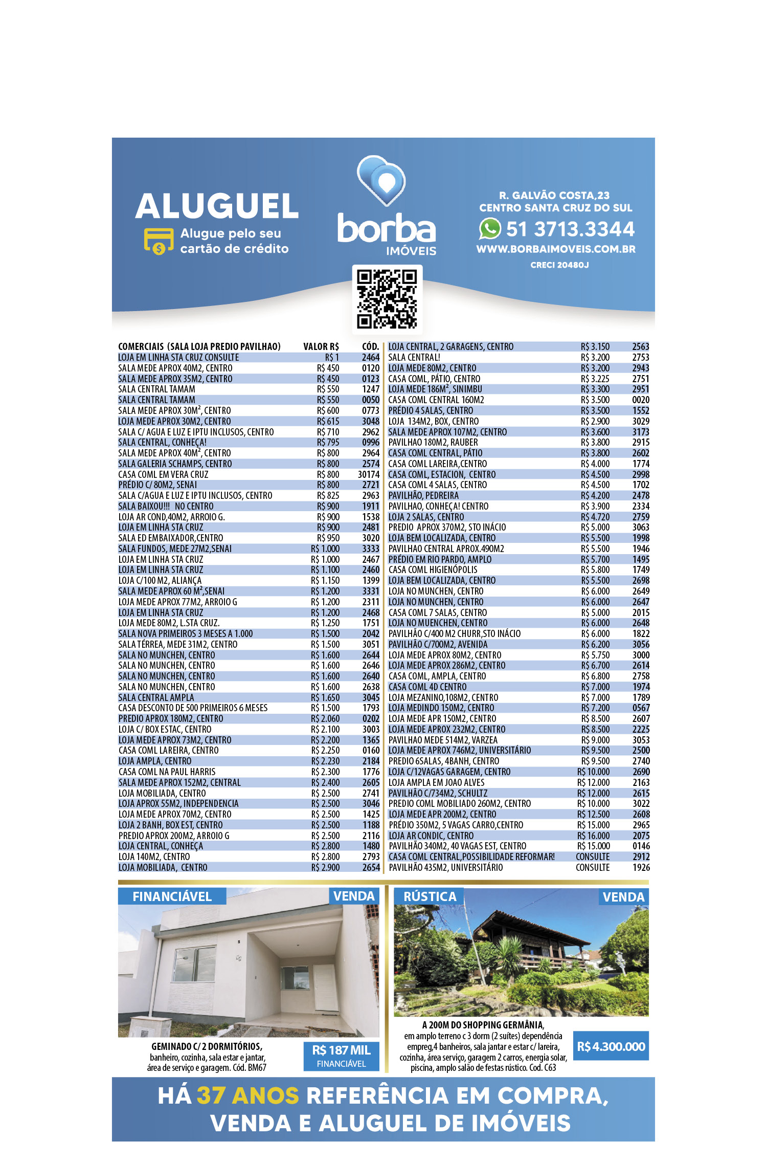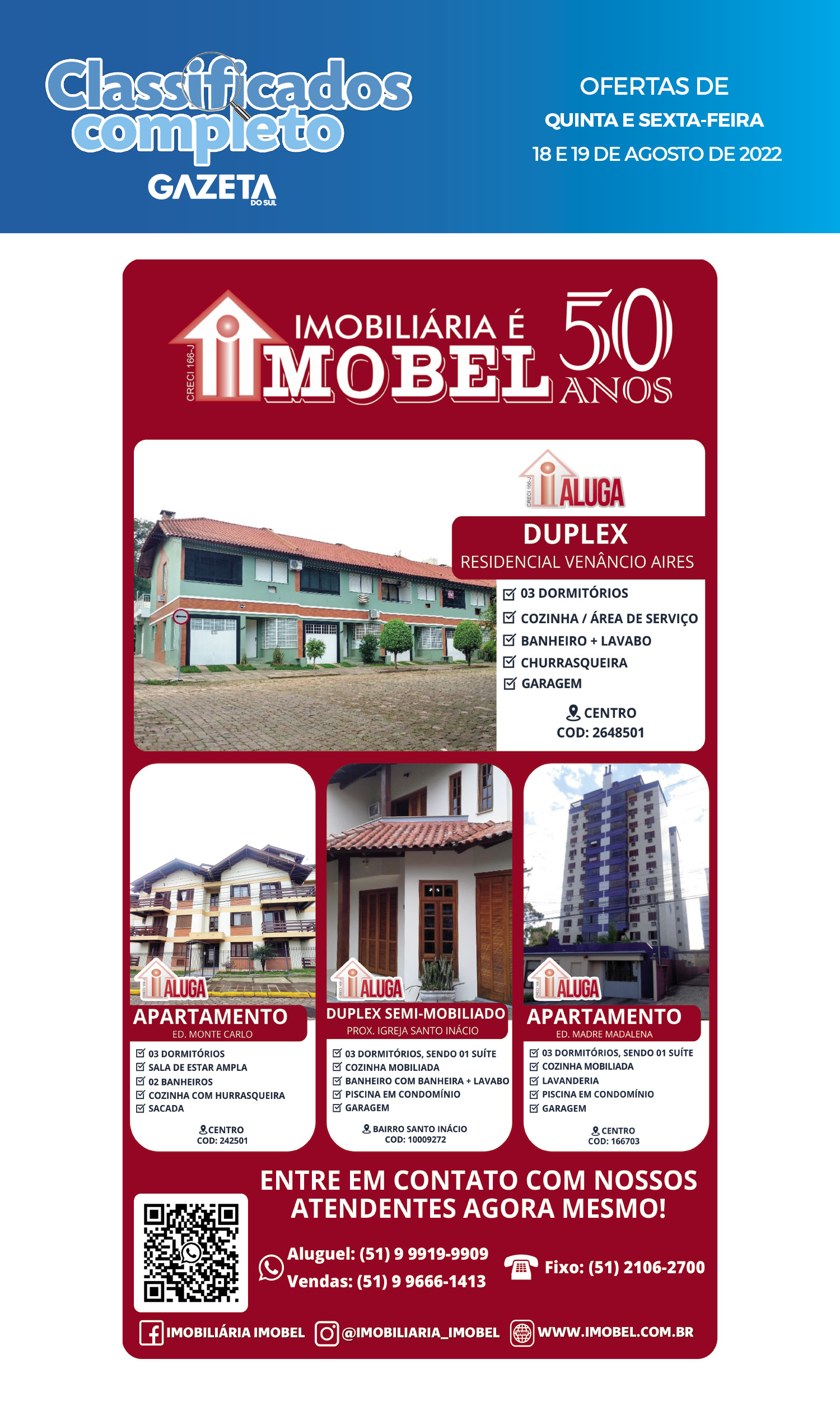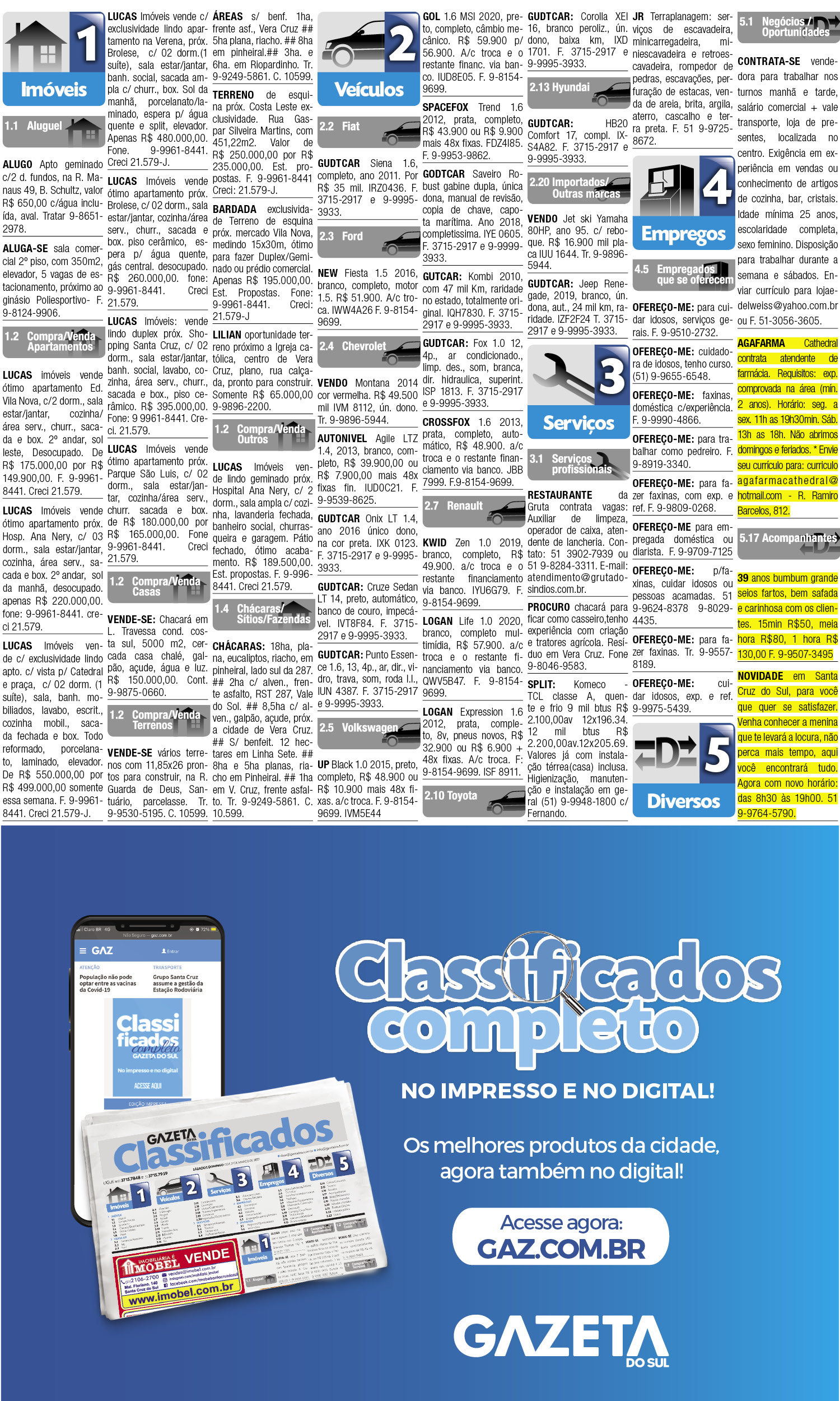 O suplemento de Classificados, que circula nas edições de terças, quintas e sábados, é um dos mais tradicionais da Gazeta do Sul, como vitrine e canal de negócios, de oferta, compra e venda em toda a região central do Rio Grande do Sul. E, para enriquecer pesquisas de produtos e serviços e possibilitar resultado ainda melhor a usuários e parceiros, nos anúncios de clientes cadastrados, o leitor tem acesso direto com link ao site do anunciante, onde poderá verificar mais detalhes sobre os itens. Confira as ofertas: