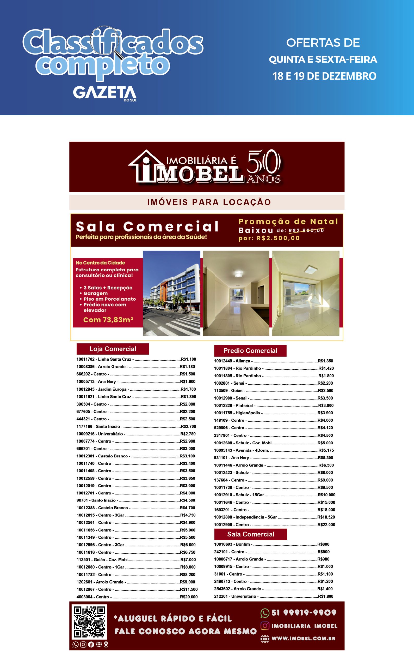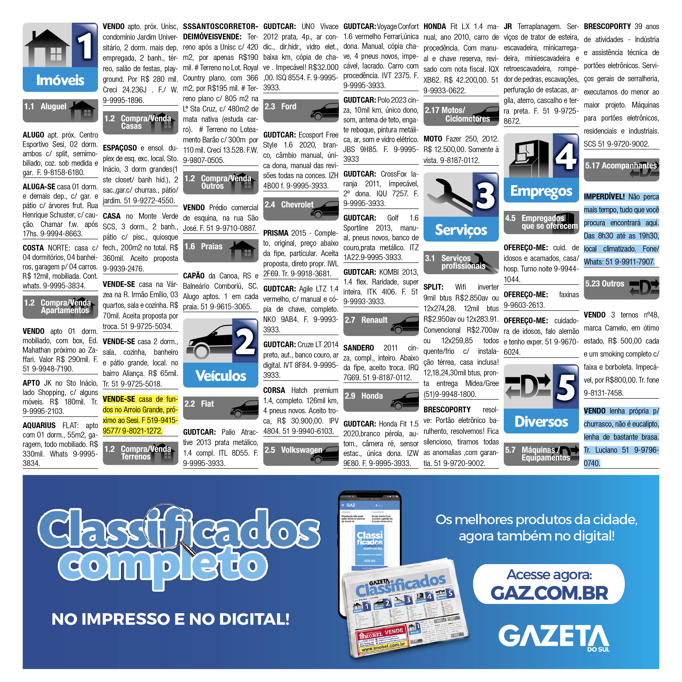 O suplemento de Classificados, que circula nas edições de terças, quintas e sábados, é um dos mais tradicionais da Gazeta do Sul, como vitrine e canal de negócios, de oferta, compra e venda em toda a região central do Rio Grande do Sul. E, para enriquecer pesquisas de produtos e serviços e possibilitar resultado ainda melhor a usuários e parceiros, nos anúncios de clientes cadastrados, o leitor tem acesso direto com link ao site do anunciante, onde poderá verificar mais detalhes sobre os itens. Confira as ofertas: