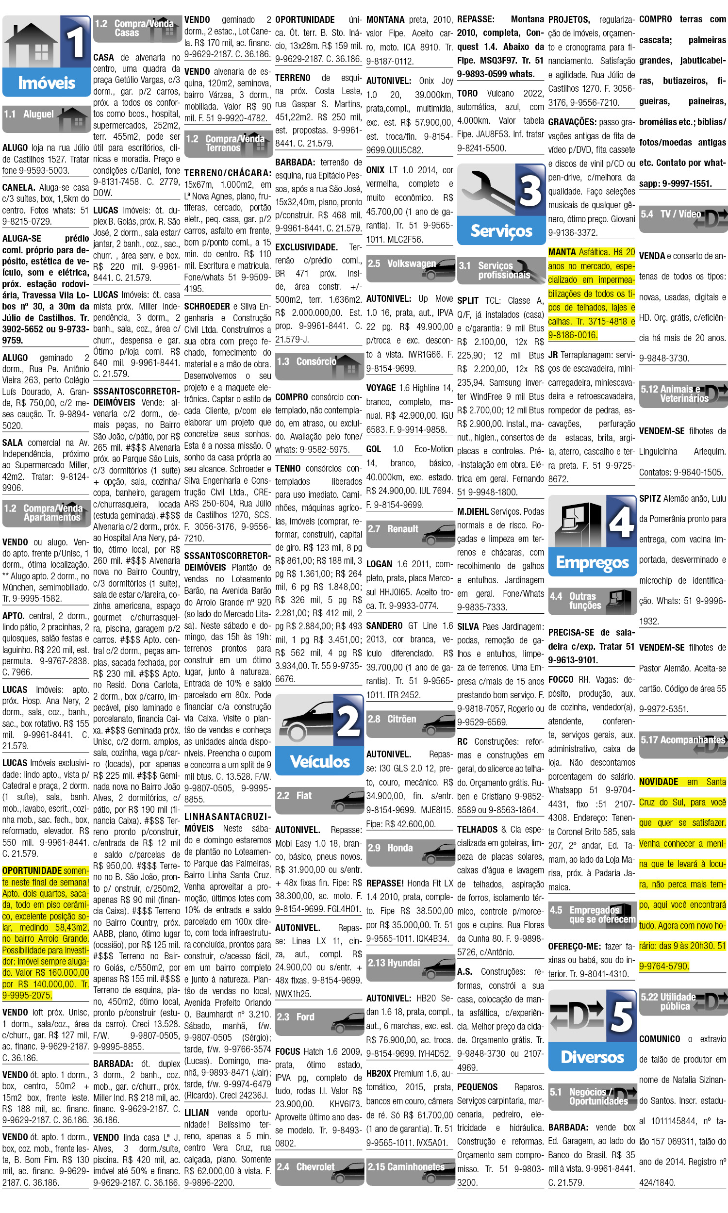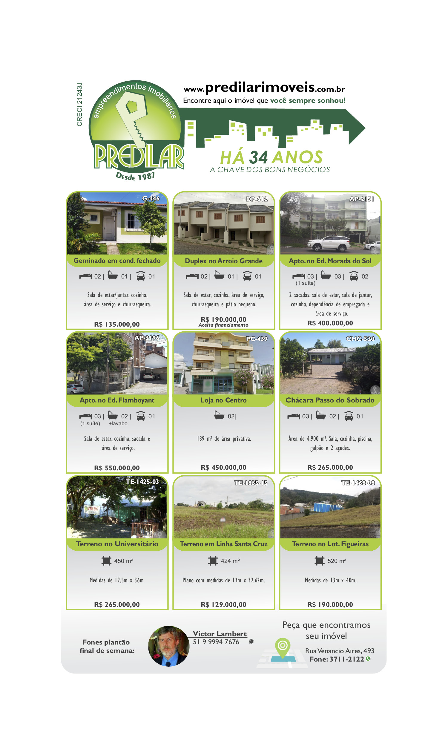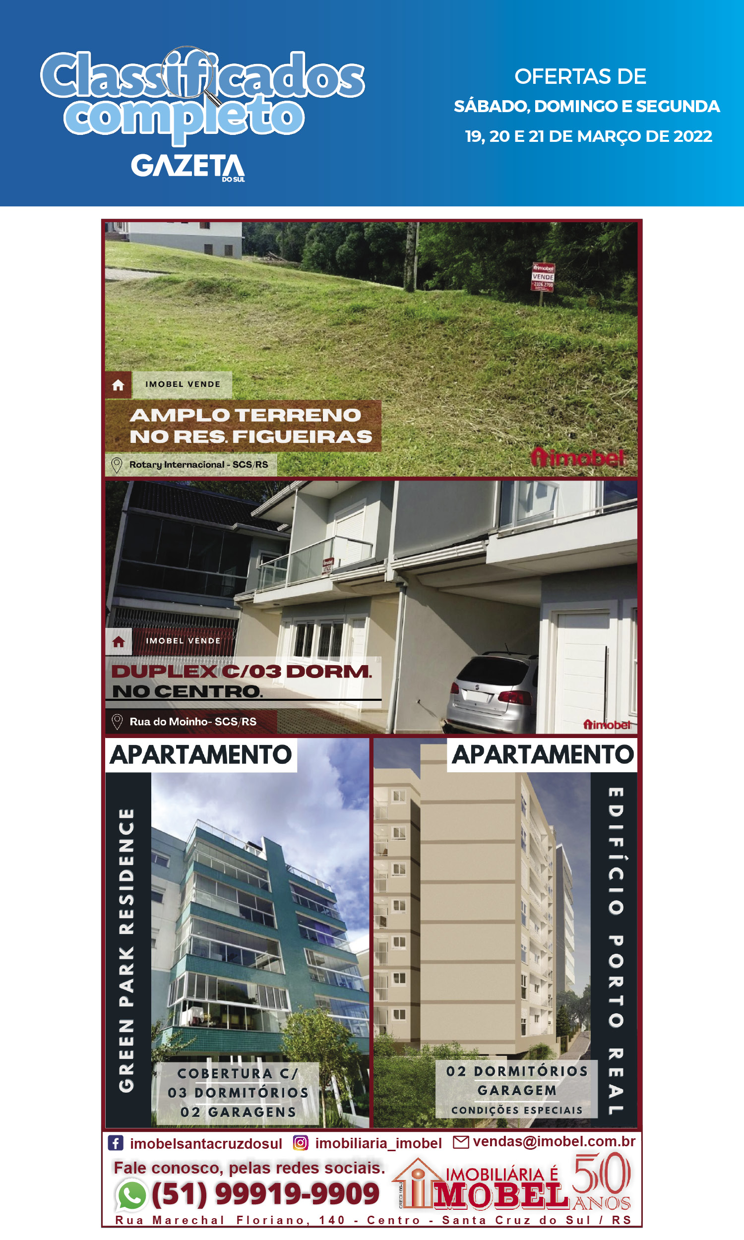 O suplemento de Classificados, que circula nas edições de terças, quintas e sábados, é um dos mais tradicionais da Gazeta do Sul, como vitrine e canal de negócios, de oferta, compra e venda em toda a região central do Rio Grande do Sul. E, para enriquecer pesquisas de produtos e serviços e possibilitar resultado ainda melhor a usuários e parceiros, nos anúncios de clientes cadastrados, o leitor tem acesso direto com link ao site do anunciante, onde poderá verificar mais detalhes sobre os itens. Confira as ofertas: