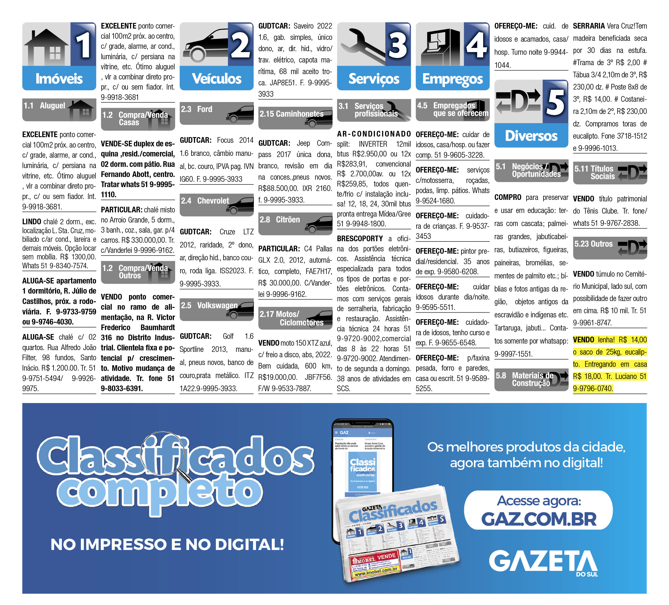 O suplemento de Classificados, que circula nas edições de terças, quintas e sábados, é um dos mais tradicionais da Gazeta do Sul, como vitrine e canal de negócios, de oferta, compra e venda em toda a região central do Rio Grande do Sul. E, para enriquecer pesquisas de produtos e serviços e possibilitar resultado ainda melhor a usuários e parceiros, nos anúncios de clientes cadastrados, o leitor tem acesso direto com link ao site do anunciante, onde poderá verificar mais detalhes sobre os itens. Confira as ofertas: