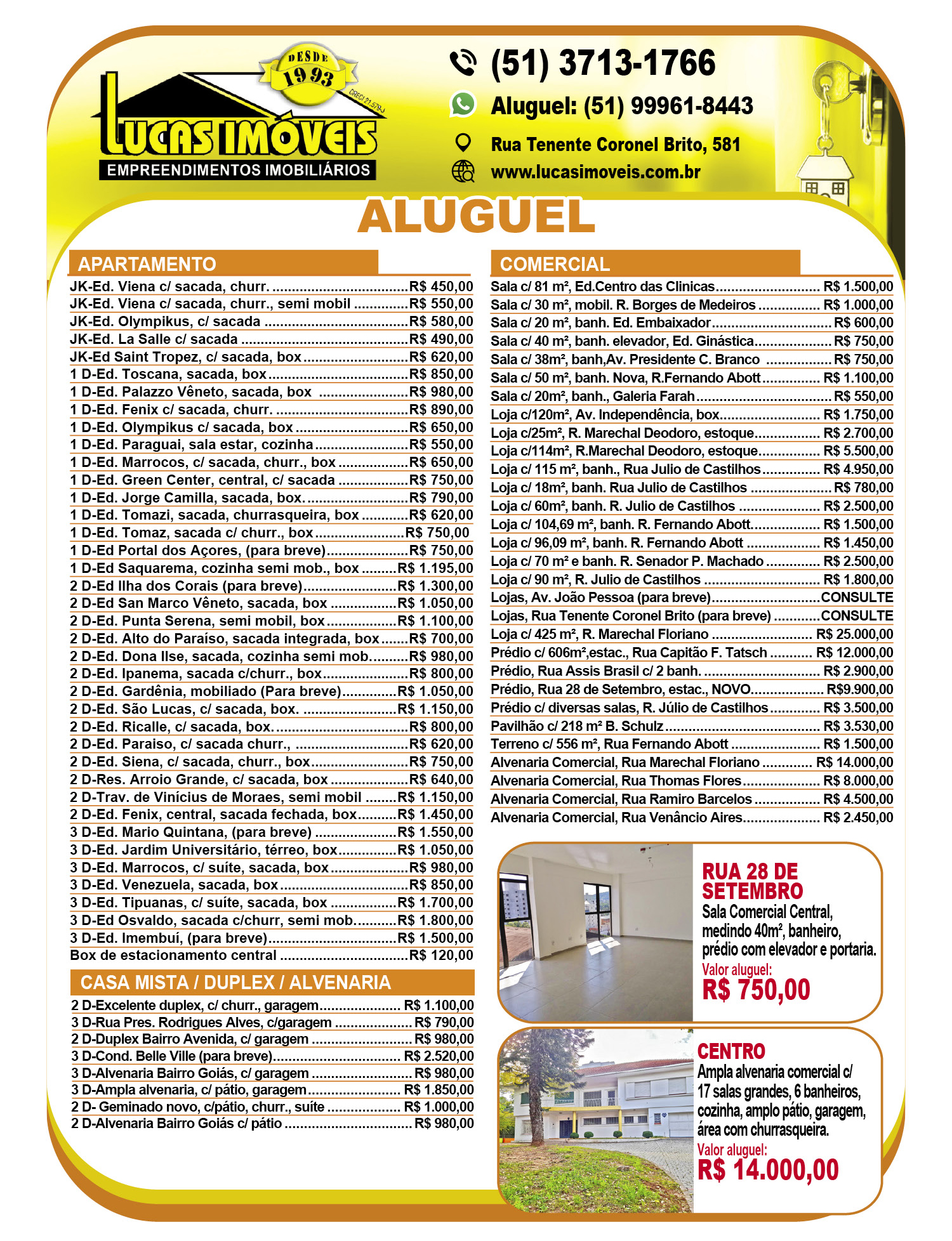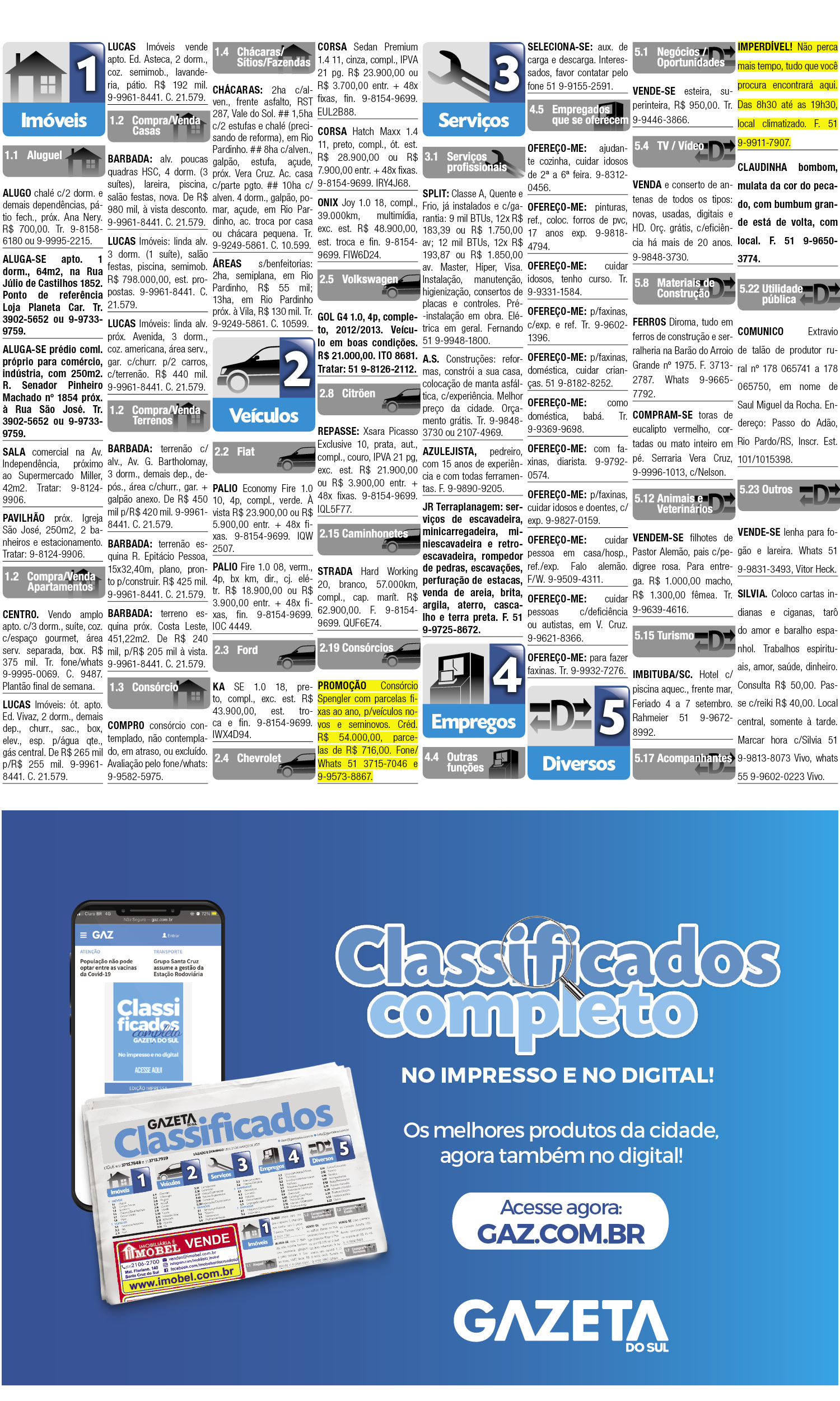 O suplemento de Classificados, que circula nas edições de terças, quintas e sábados, é um dos mais tradicionais da Gazeta do Sul, como vitrine e canal de negócios, de oferta, compra e venda em toda a região central do Rio Grande do Sul. E, para enriquecer pesquisas de produtos e serviços e possibilitar resultado ainda melhor a usuários e parceiros, nos anúncios de clientes cadastrados, o leitor tem acesso direto com link ao site do anunciante, onde poderá verificar mais detalhes sobre os itens. Confira: