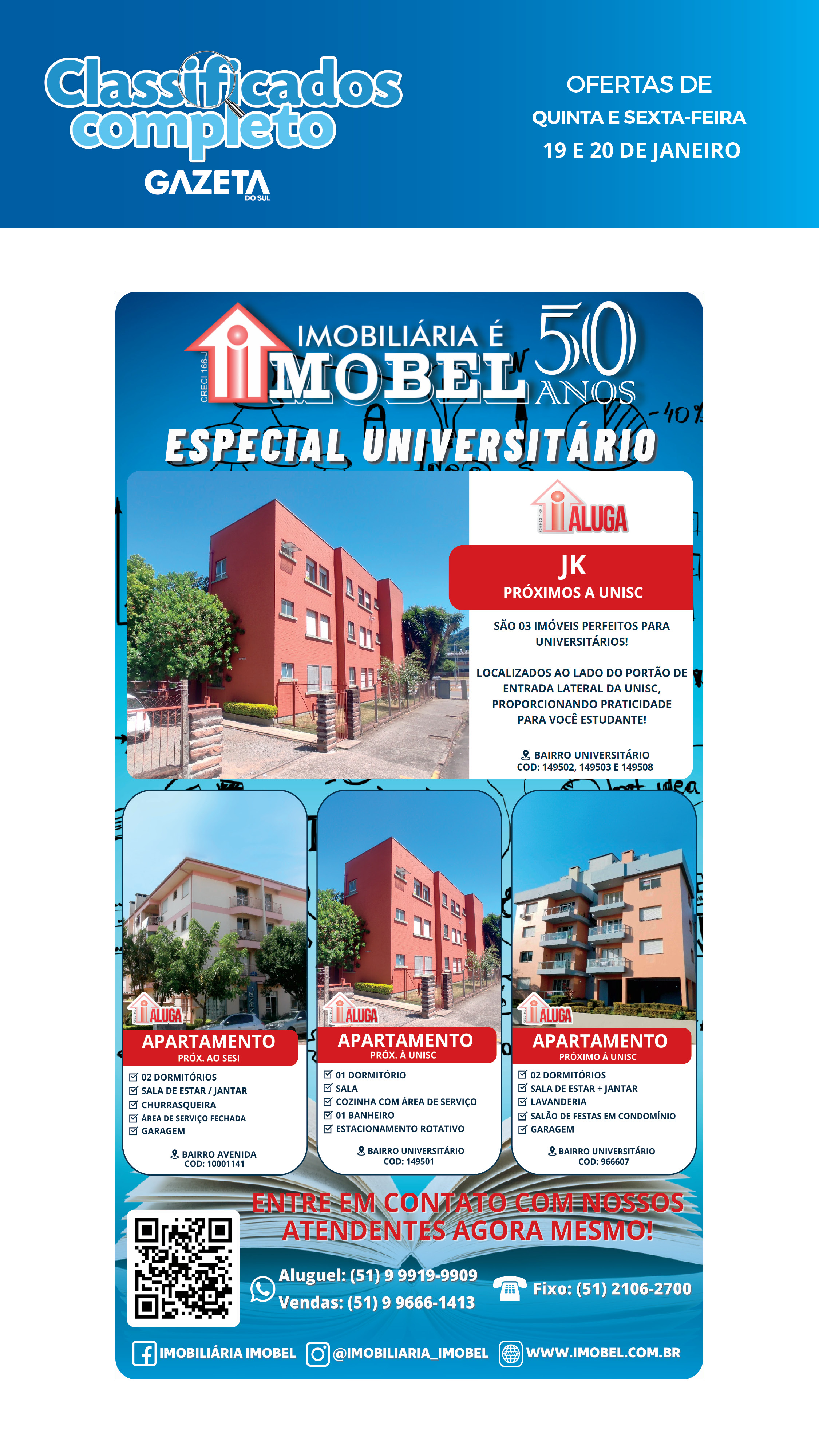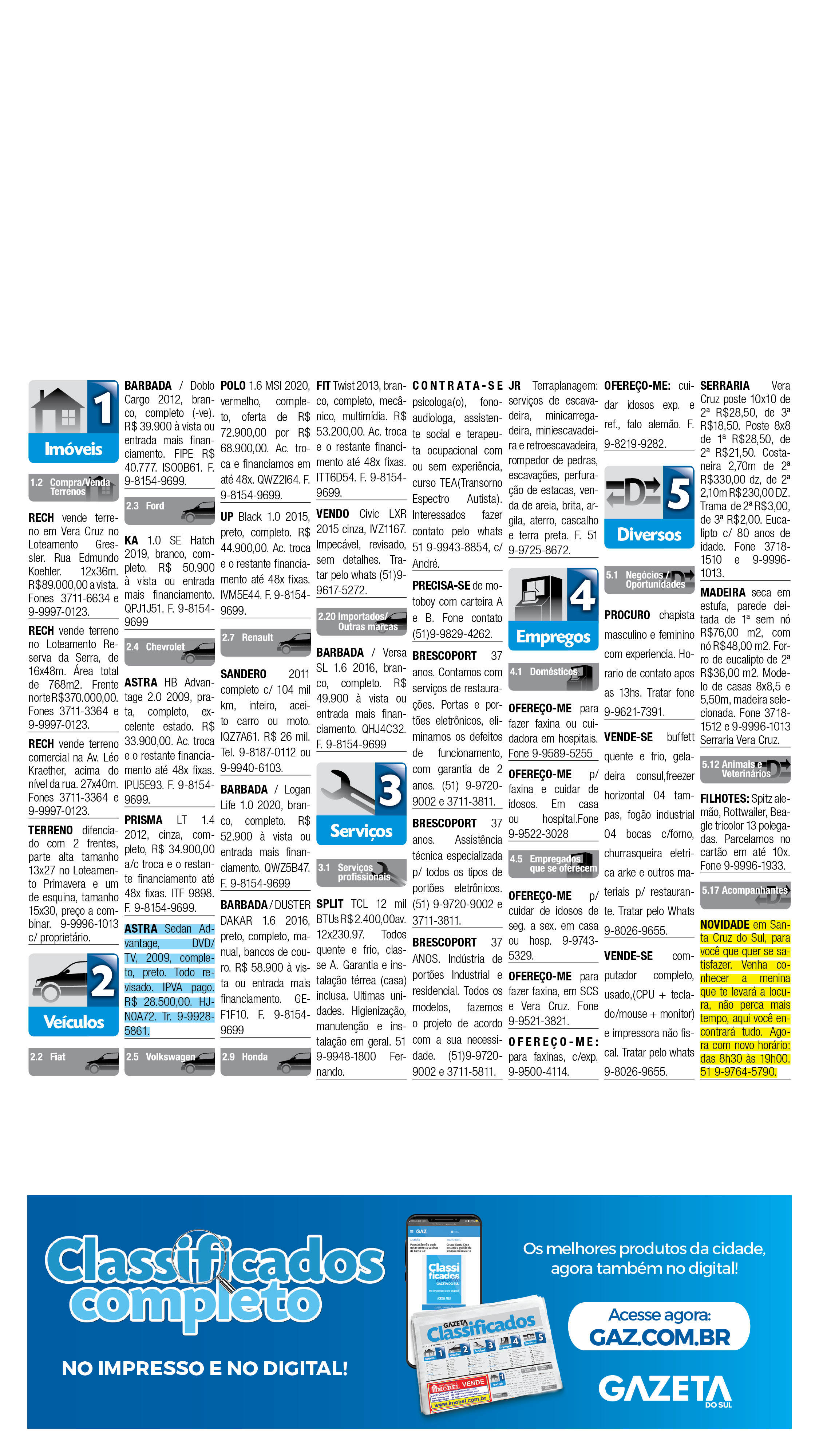 O suplemento de Classificados, que circula nas edições de terças, quintas e sábados, é um dos mais tradicionais da Gazeta do Sul, como vitrine e canal de negócios, de oferta, compra e venda em toda a região central do Rio Grande do Sul. E, para enriquecer pesquisas de produtos e serviços e possibilitar resultado ainda melhor a usuários e parceiros, nos anúncios de clientes cadastrados, o leitor tem acesso direto com link ao site do anunciante, onde poderá verificar mais detalhes sobre os itens. Confira as ofertas: