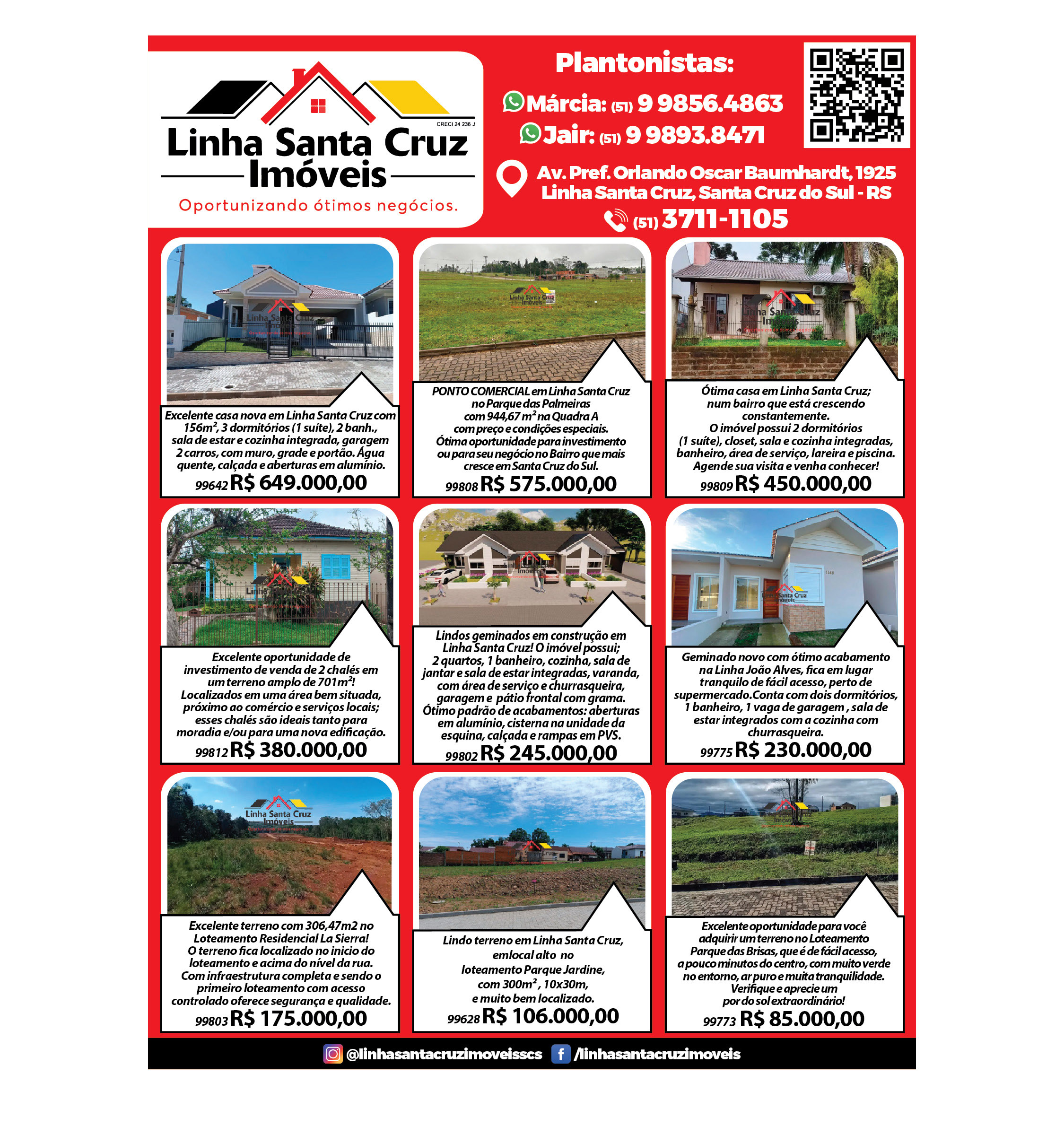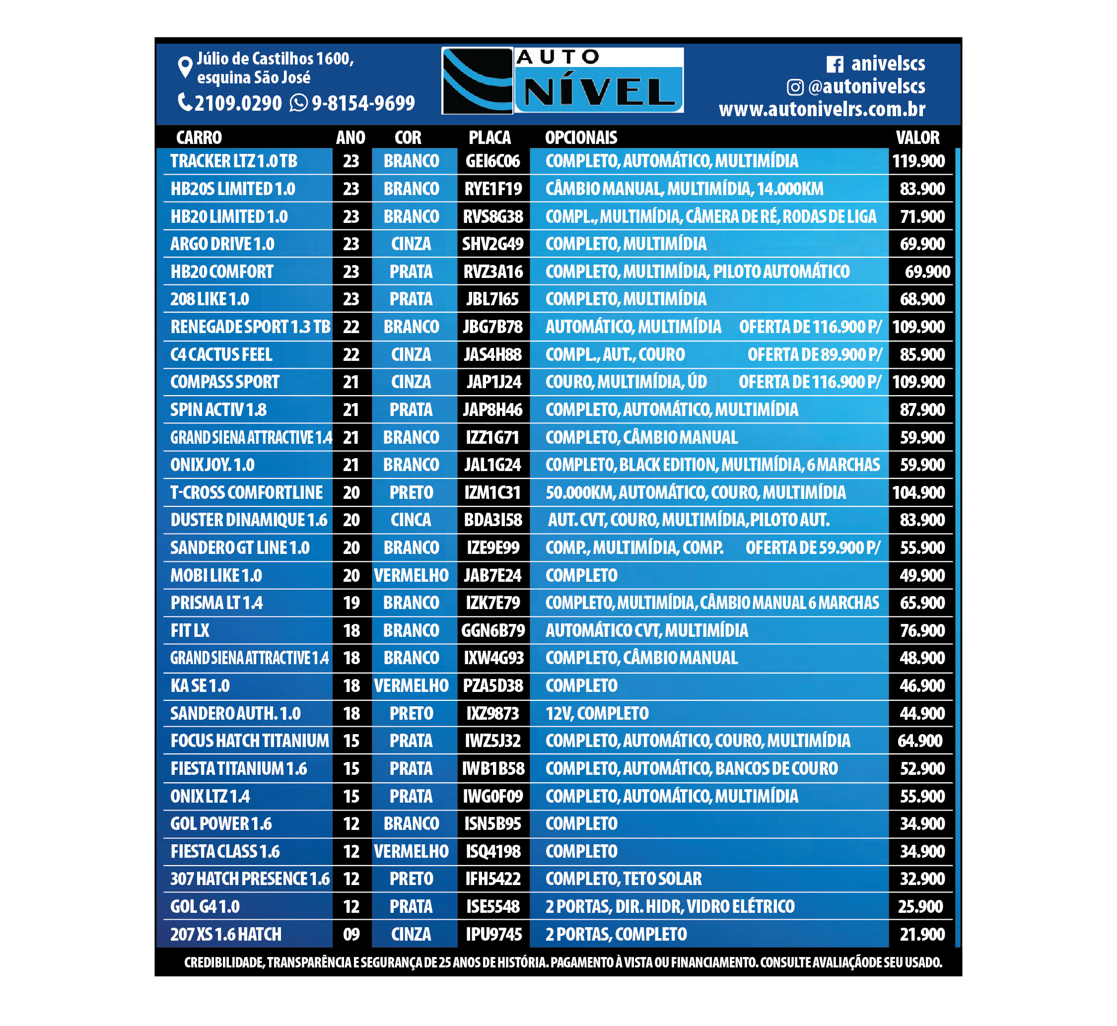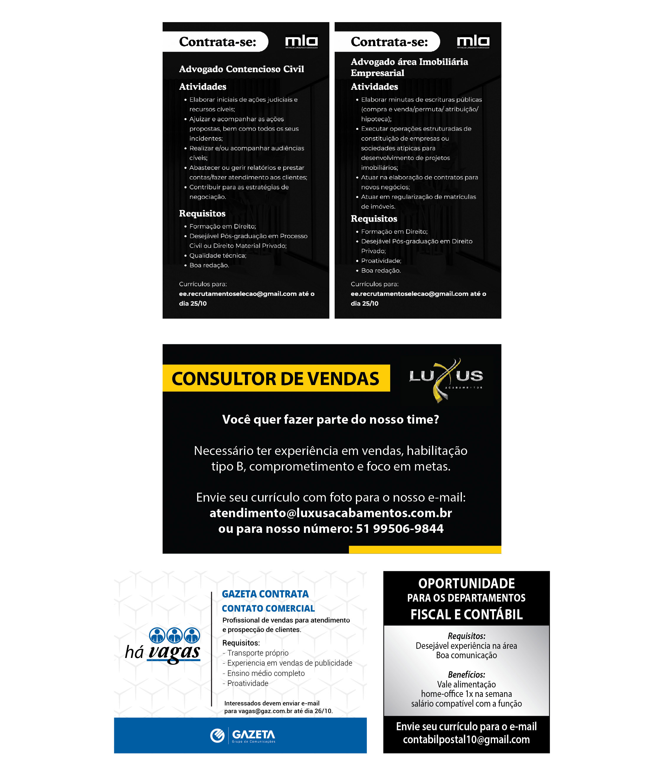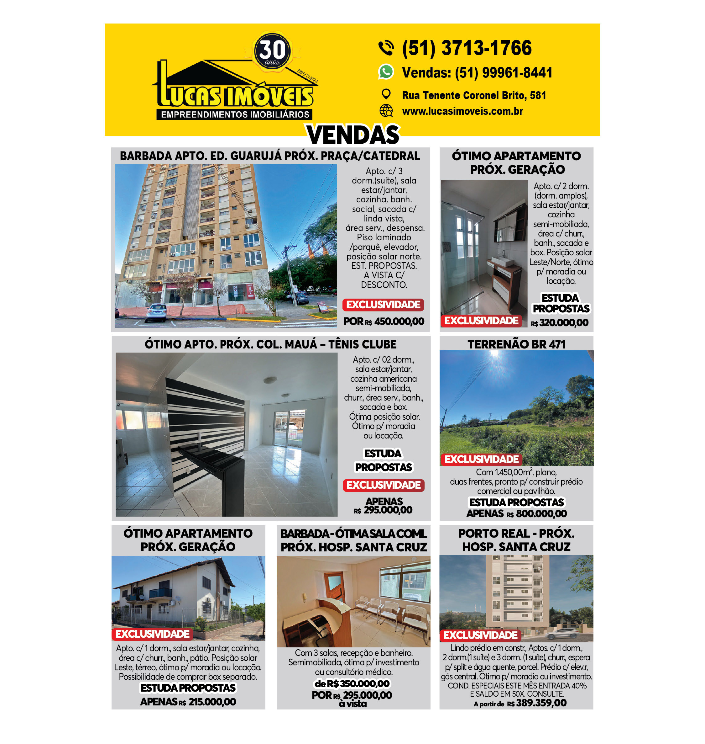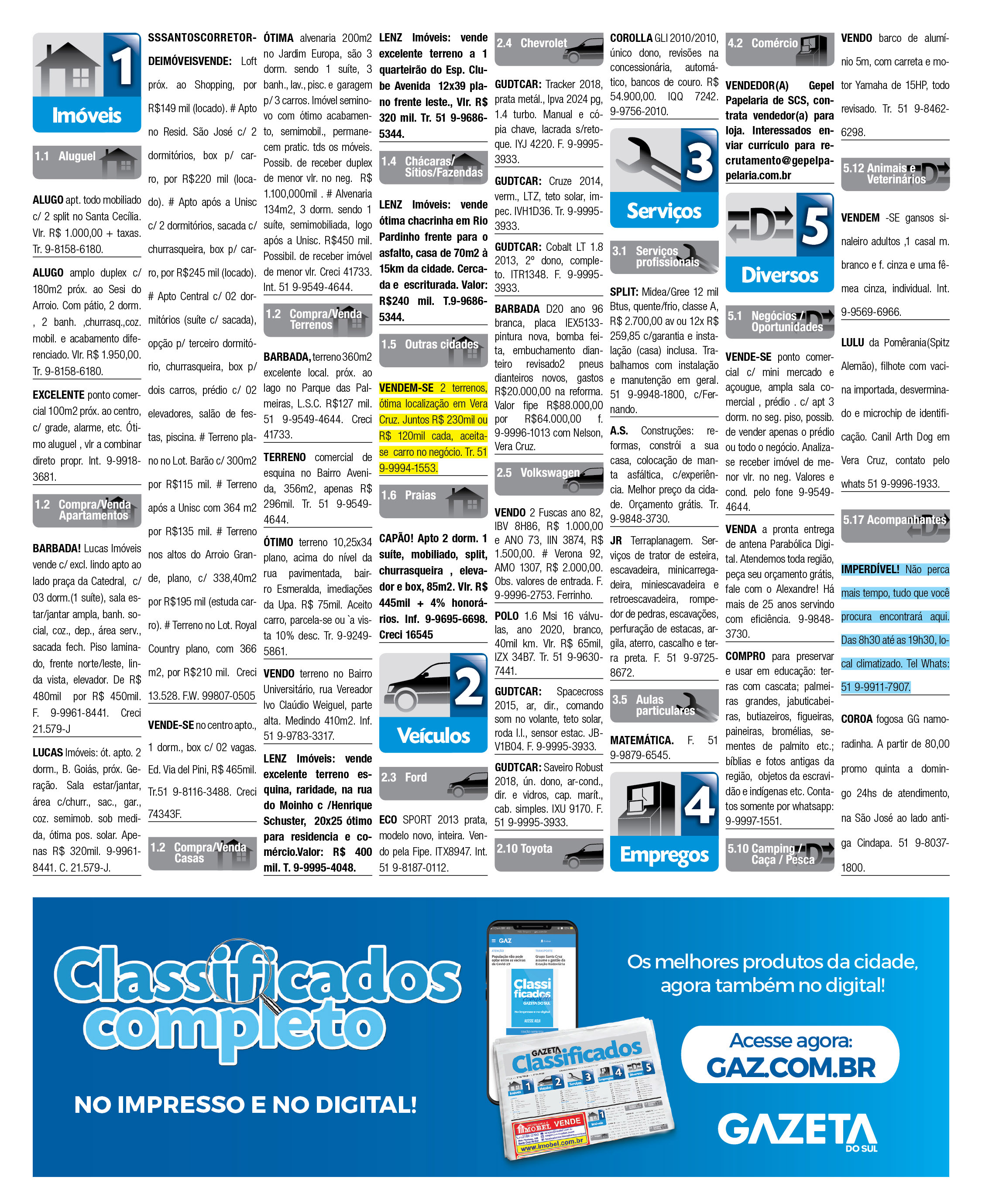 O suplemento de Classificados, que circula nas edições de terças, quintas e sábados, é um dos mais tradicionais da Gazeta do Sul, como vitrine e canal de negócios, de oferta, compra e venda em toda a região central do Rio Grande do Sul. E, para enriquecer pesquisas de produtos e serviços e possibilitar resultado ainda melhor a usuários e parceiros, nos anúncios de clientes cadastrados, o leitor tem acesso direto com link ao site do anunciante, onde poderá verificar mais detalhes sobre os itens. Confira as ofertas: