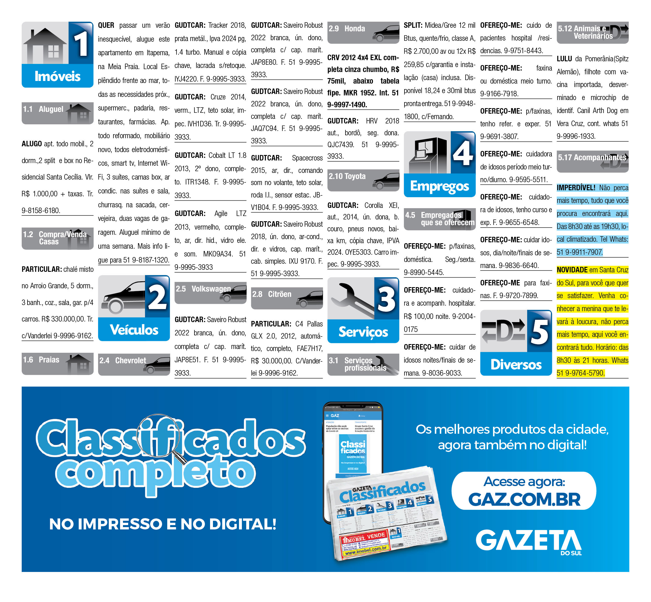 O suplemento de Classificados, que circula nas edições de terças, quintas e sábados, é um dos mais tradicionais da Gazeta do Sul, como vitrine e canal de negócios, de oferta, compra e venda em toda a região central do Rio Grande do Sul. E, para enriquecer pesquisas de produtos e serviços e possibilitar resultado ainda melhor a usuários e parceiros, nos anúncios de clientes cadastrados, o leitor tem acesso direto com link ao site do anunciante, onde poderá verificar mais detalhes sobre os itens. Confira as ofertas: