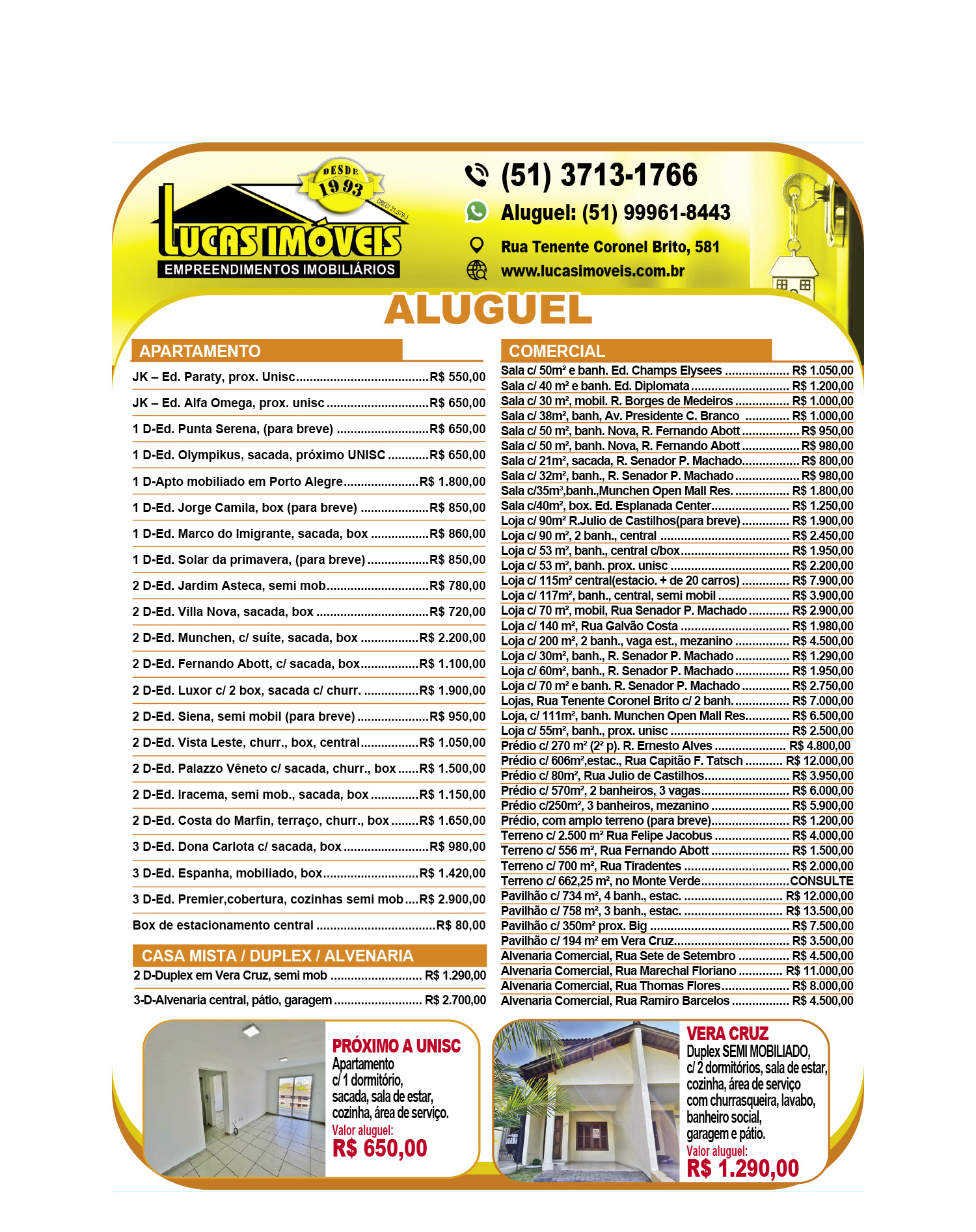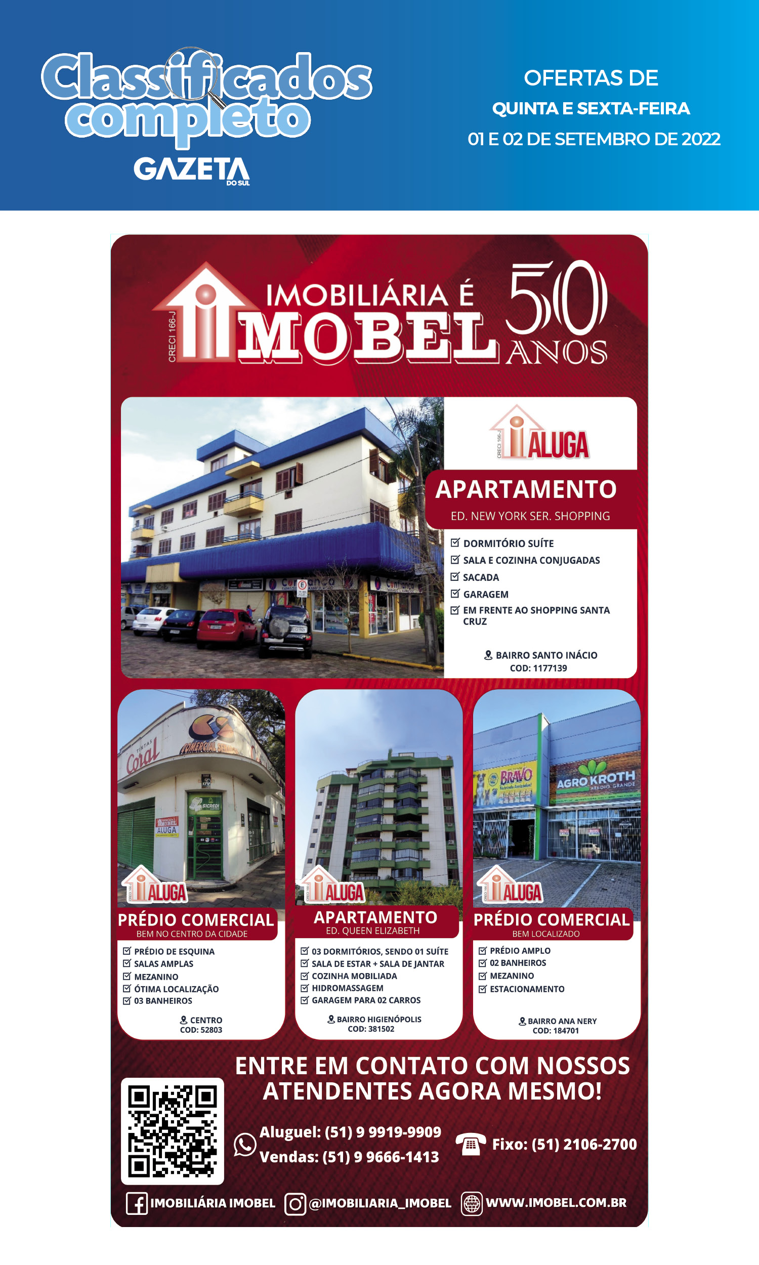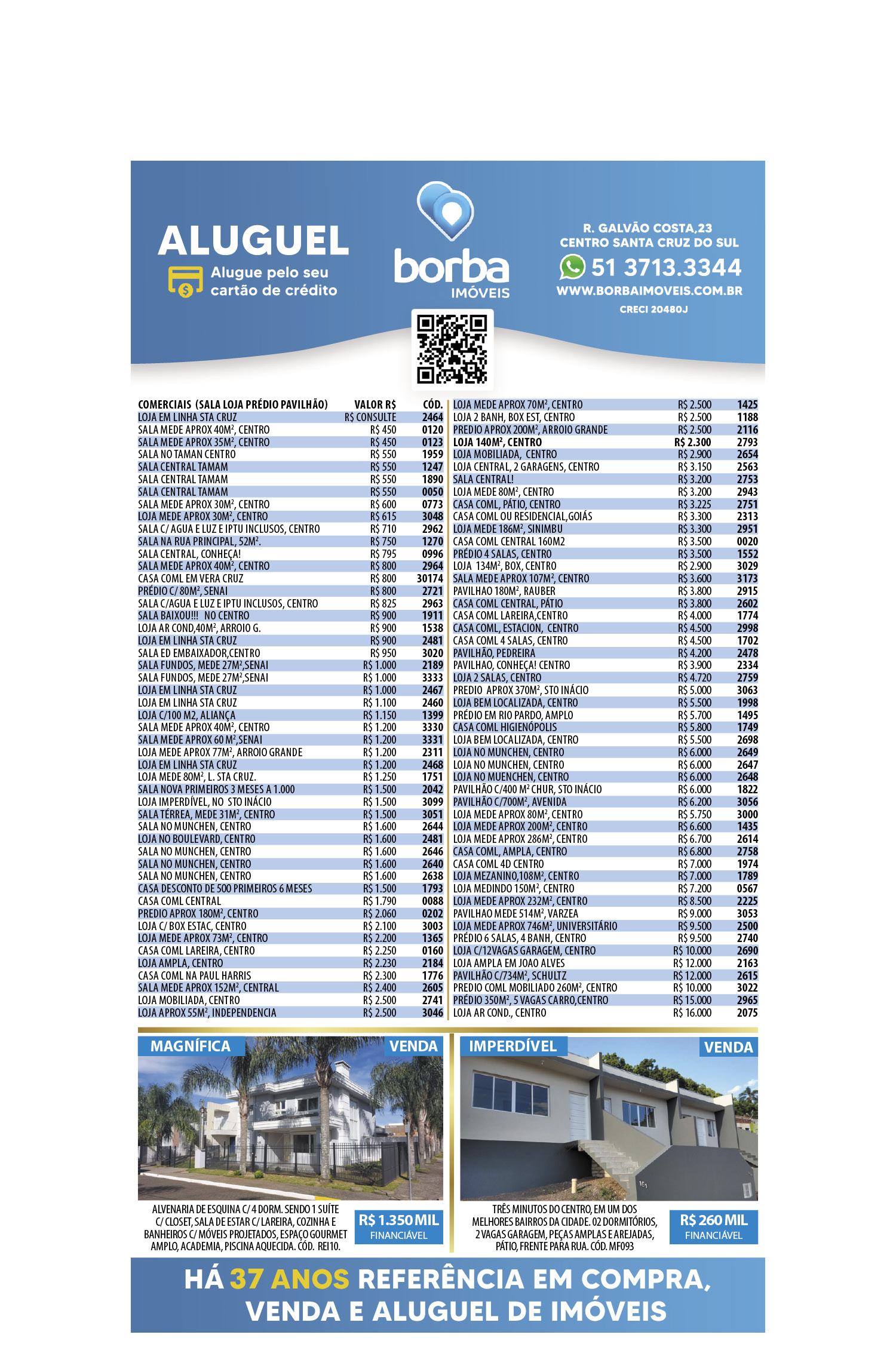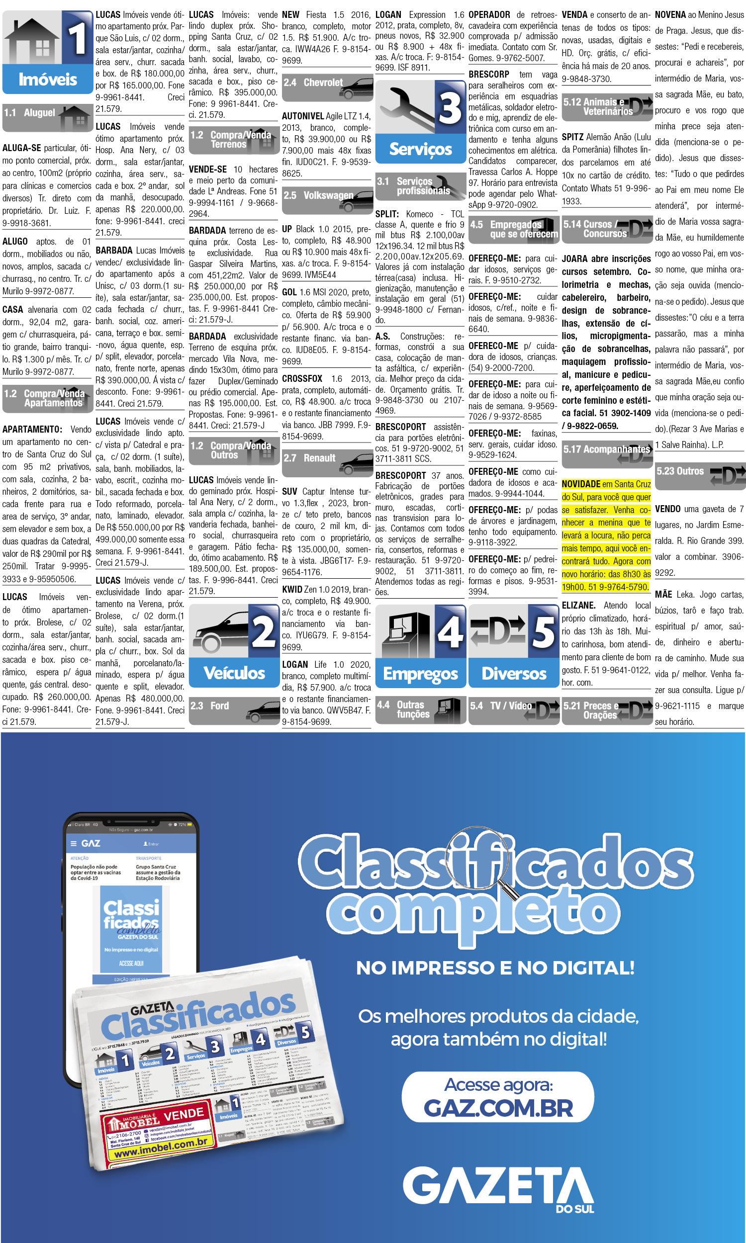 O suplemento de Classificados, que circula nas edições de terças, quintas e sábados, é um dos mais tradicionais da Gazeta do Sul, como vitrine e canal de negócios, de oferta, compra e venda em toda a região central do Rio Grande do Sul. E, para enriquecer pesquisas de produtos e serviços e possibilitar resultado ainda melhor a usuários e parceiros, nos anúncios de clientes cadastrados, o leitor tem acesso direto com link ao site do anunciante, onde poderá verificar mais detalhes sobre os itens. Confira as ofertas:
