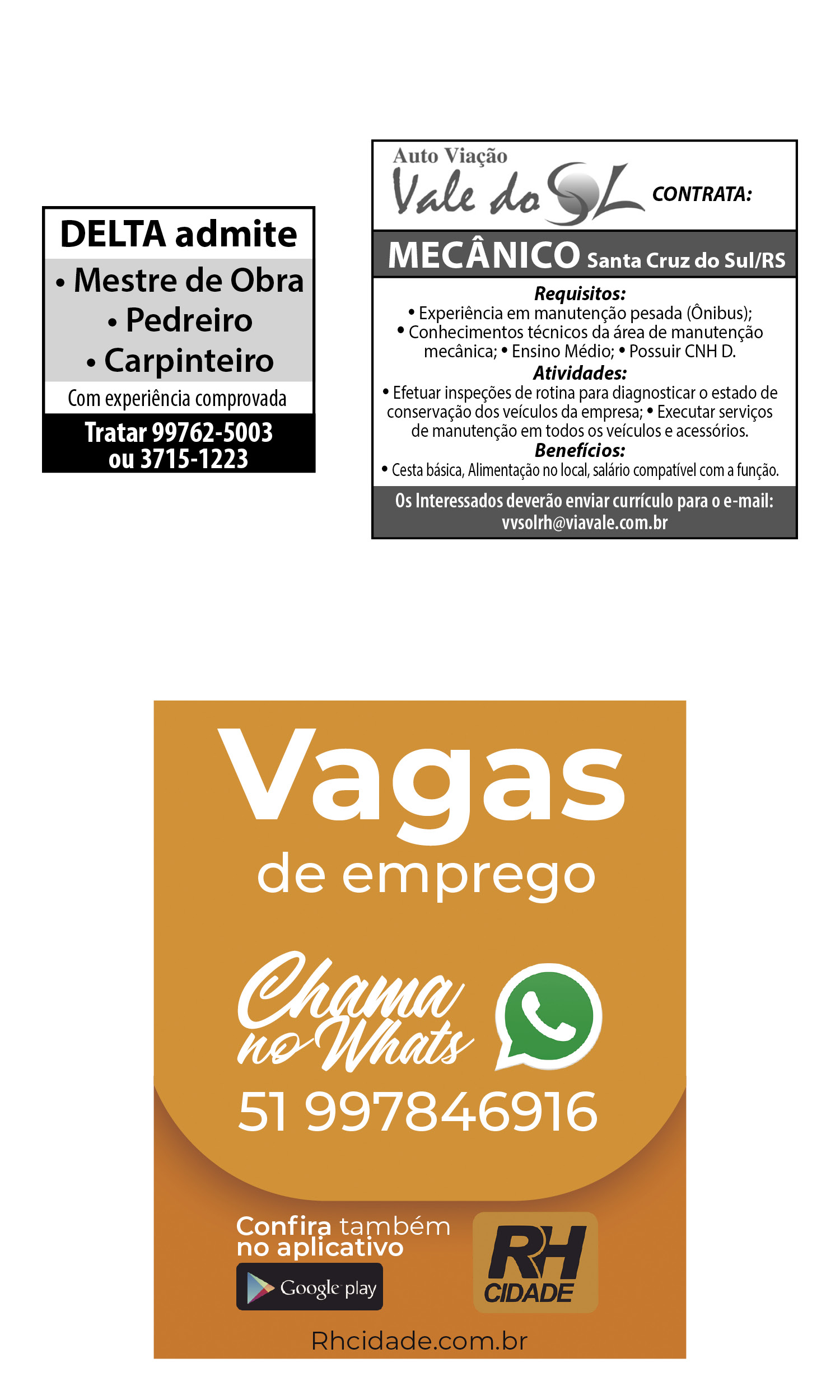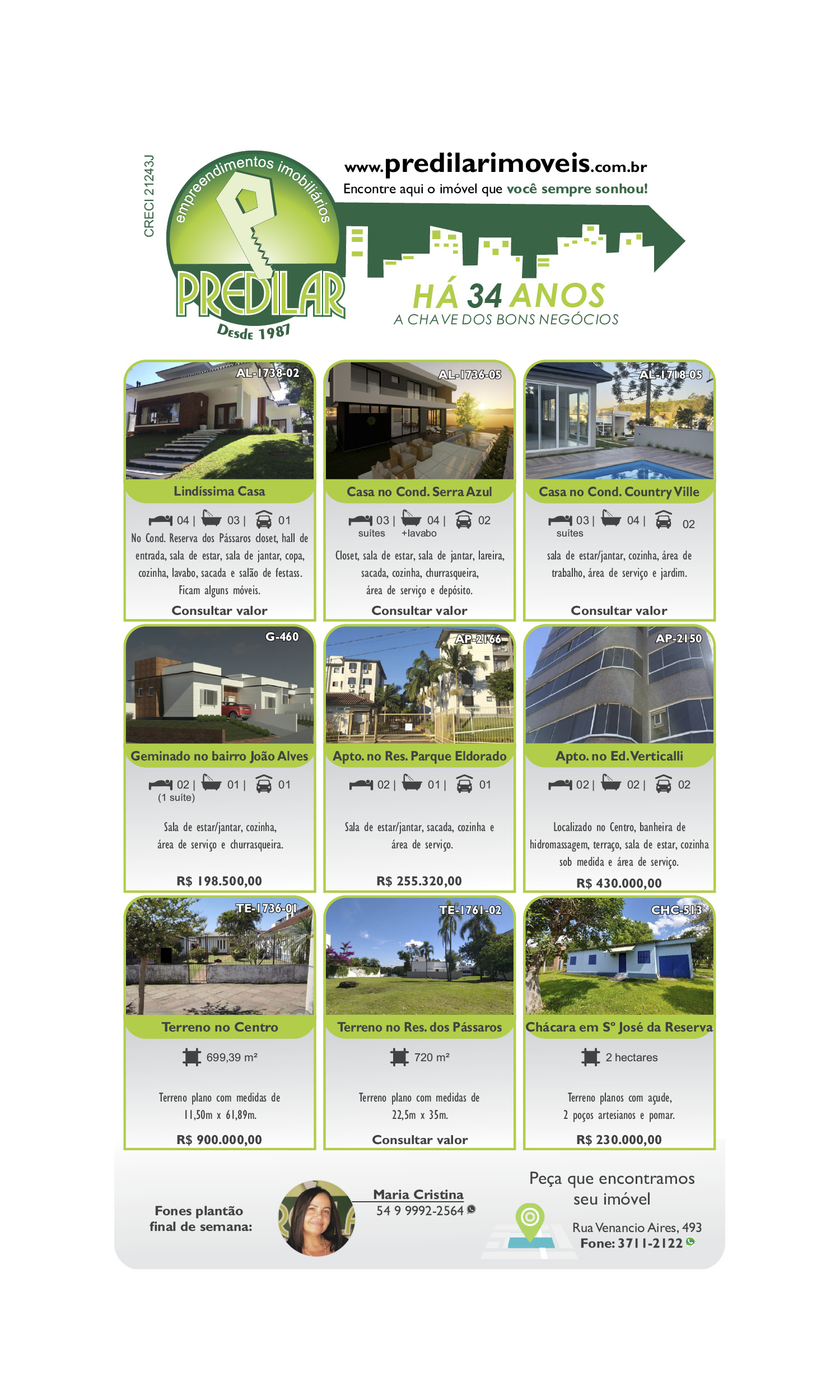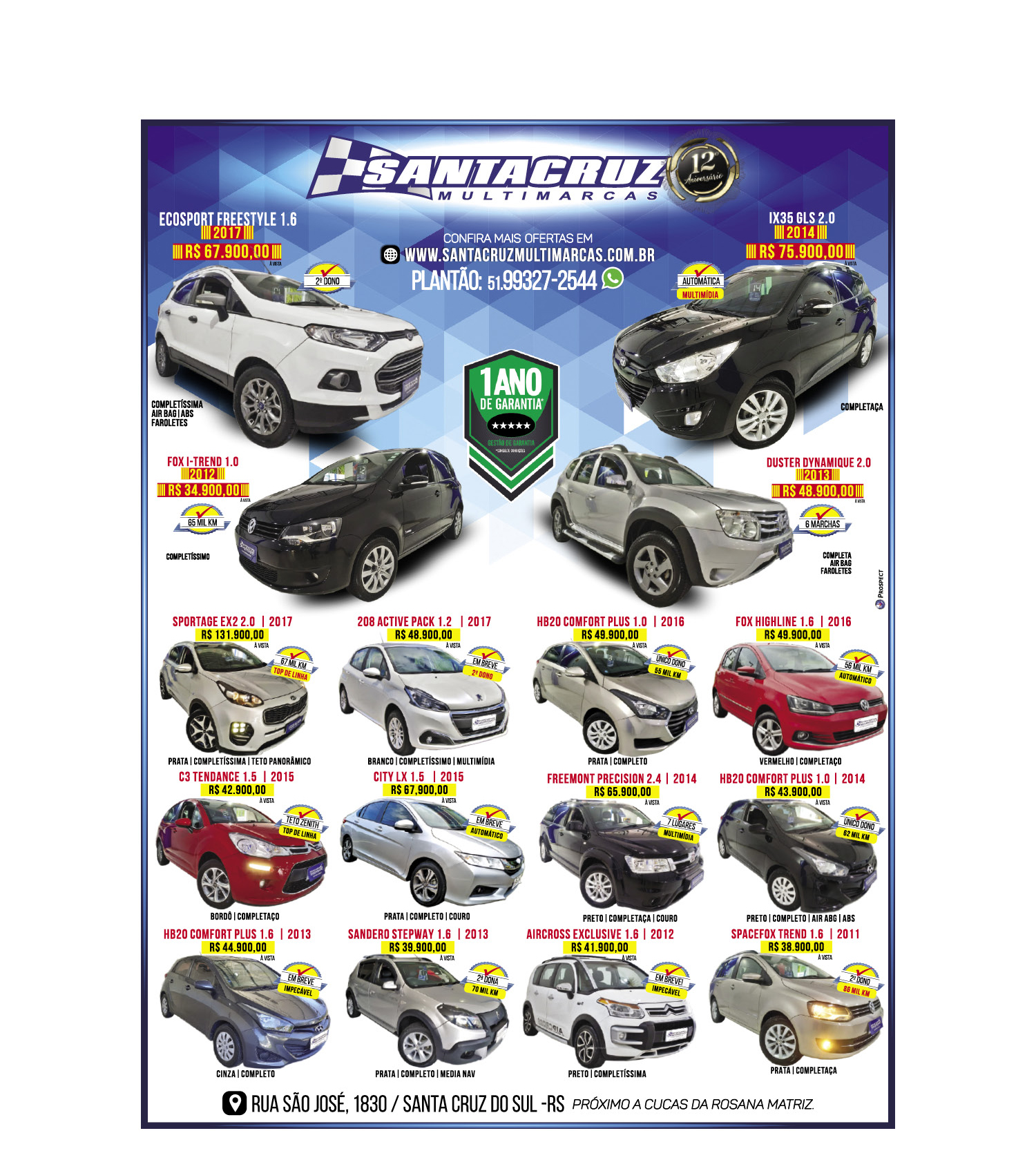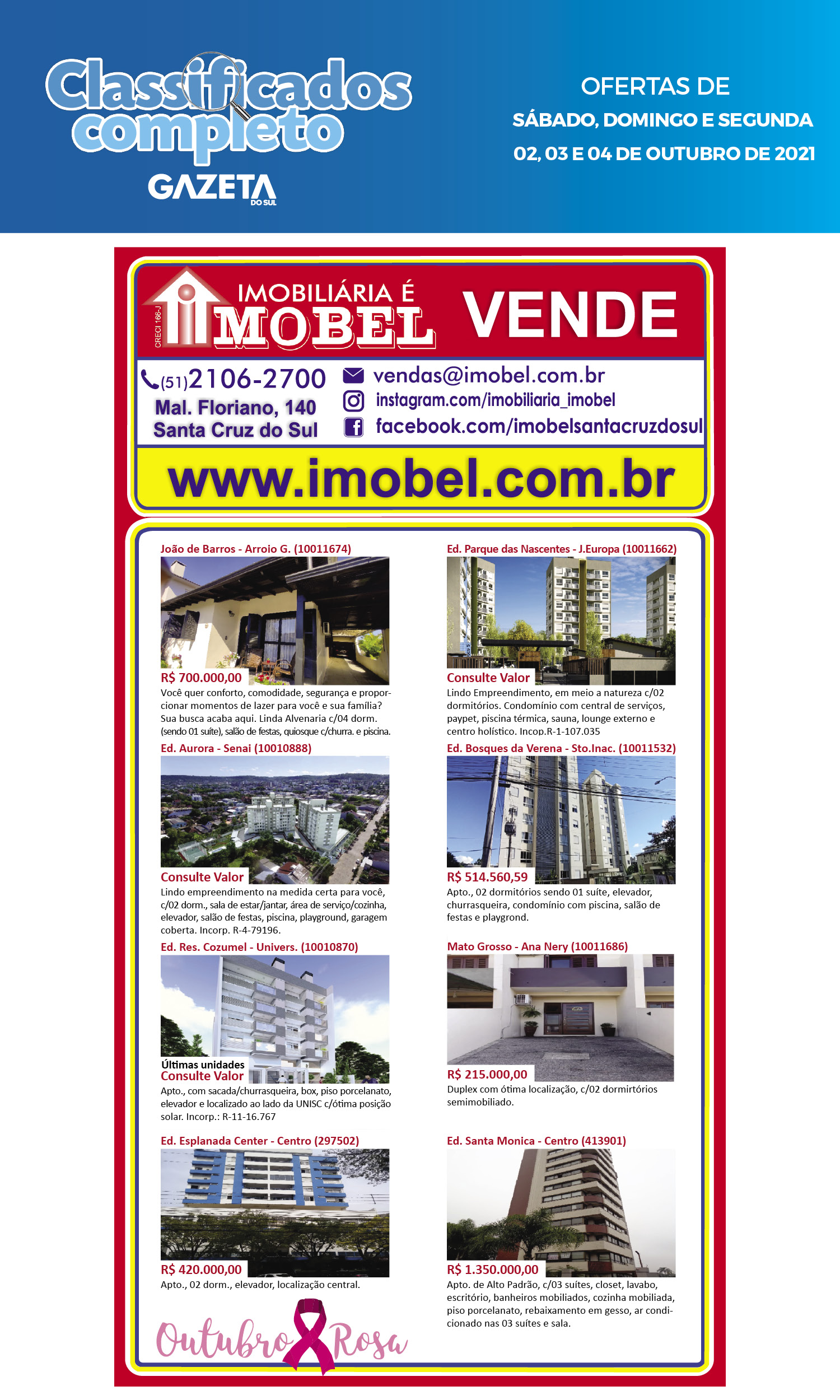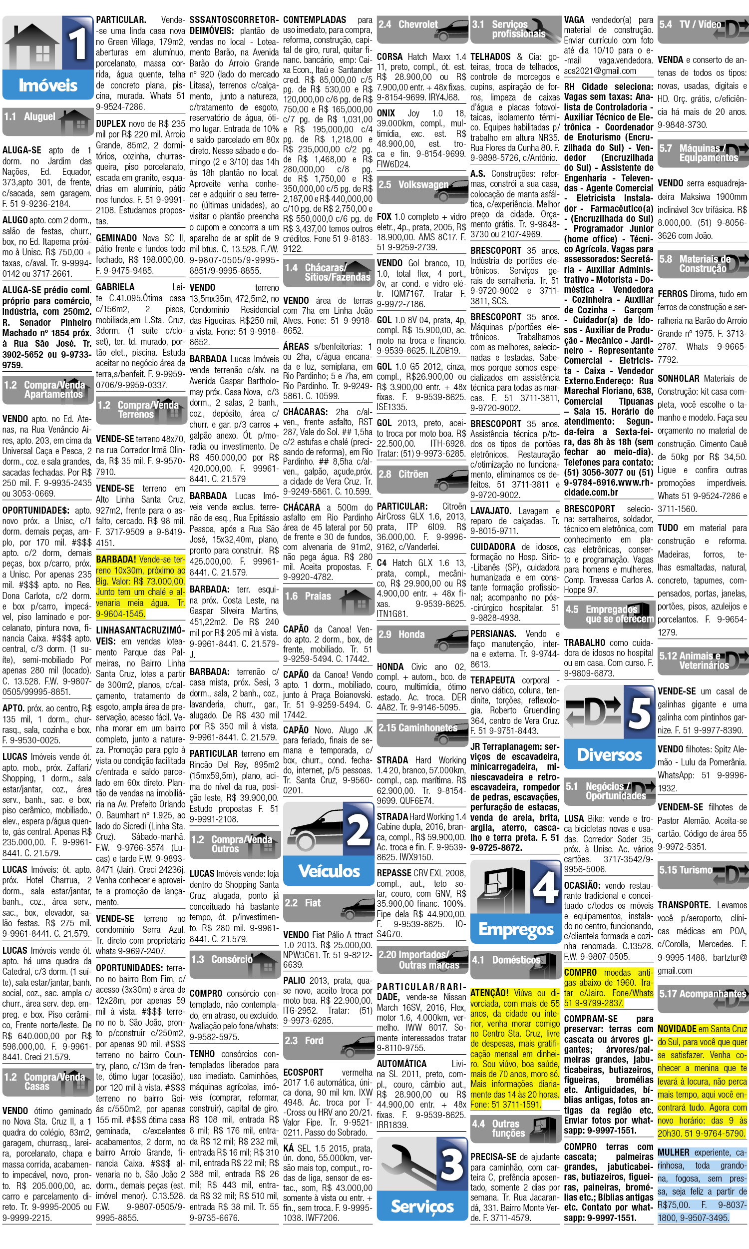 O suplemento de Classificados, que circula nas edições de terças, quintas e sábados, é um dos mais tradicionais da Gazeta do Sul, como vitrine e canal de negócios, de oferta, compra e venda em toda a região central do Rio Grande do Sul. E, para enriquecer pesquisas de produtos e serviços e possibilitar resultado ainda melhor a usuários e parceiros, nos anúncios de clientes cadastrados, o leitor tem acesso direto com link ao site do anunciante, onde poderá verificar mais detalhes sobre os itens. Confira as ofertas:
